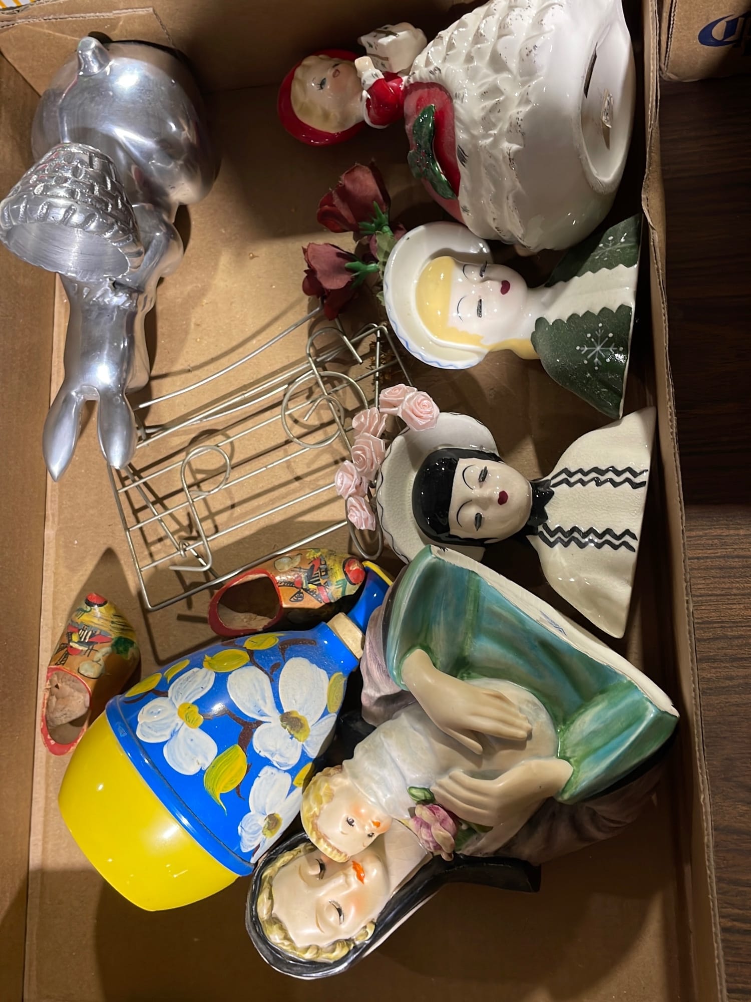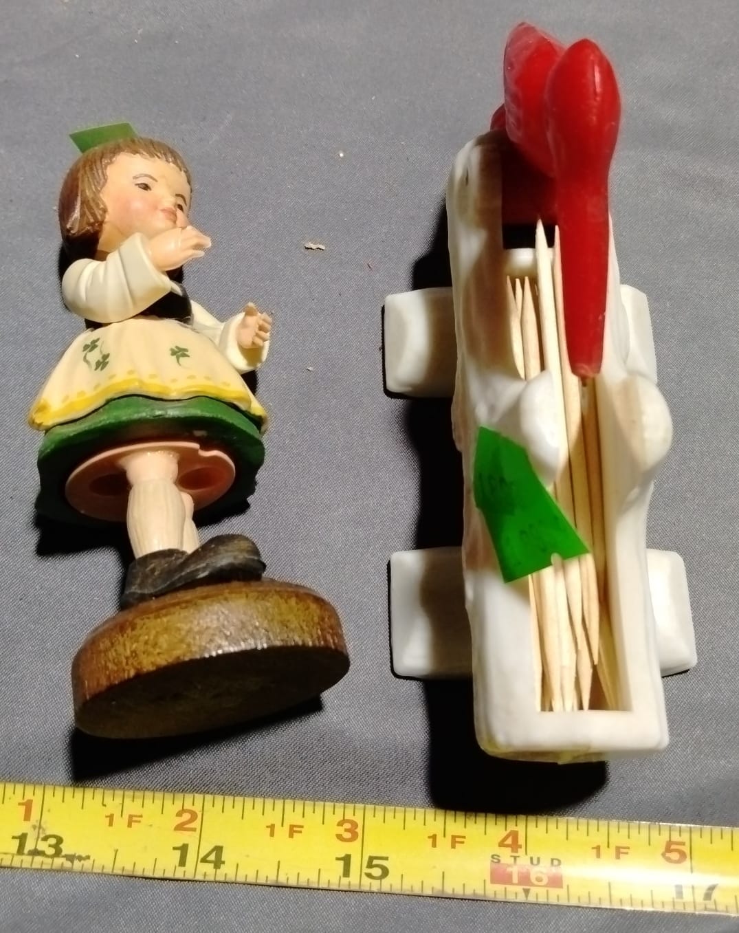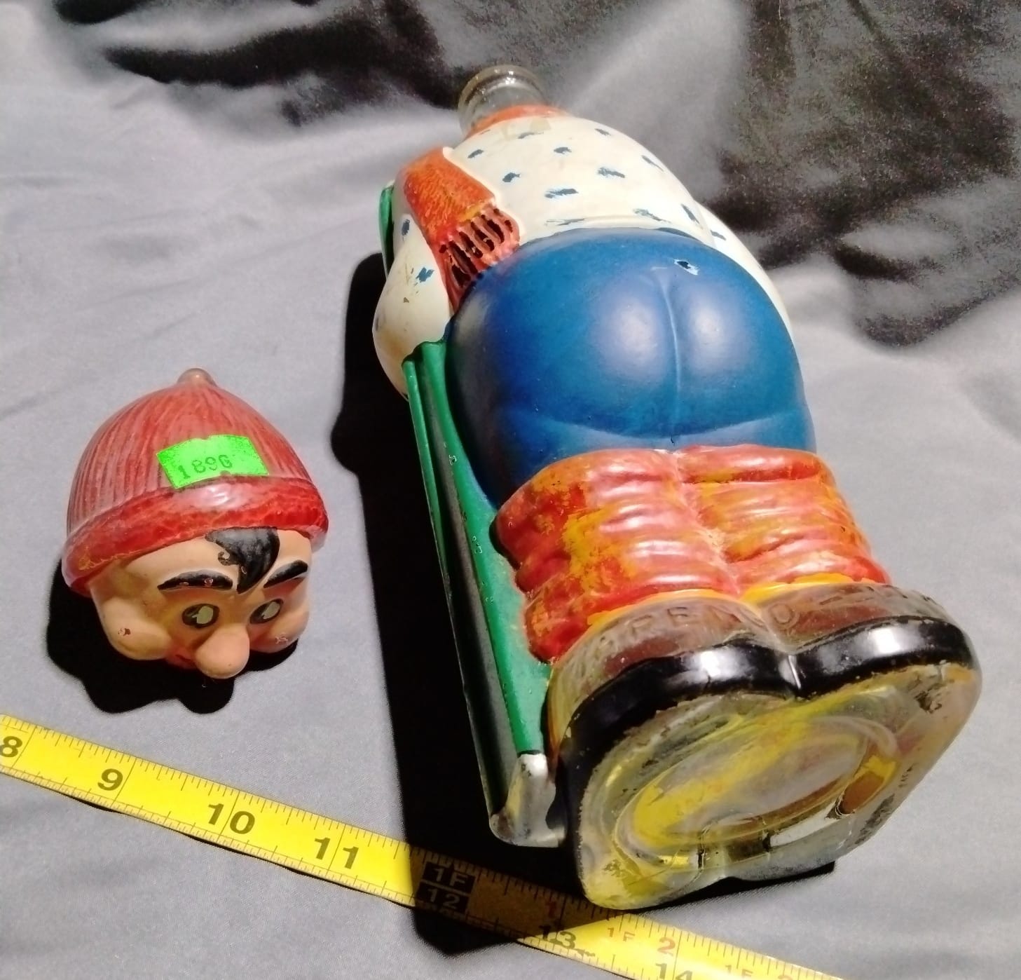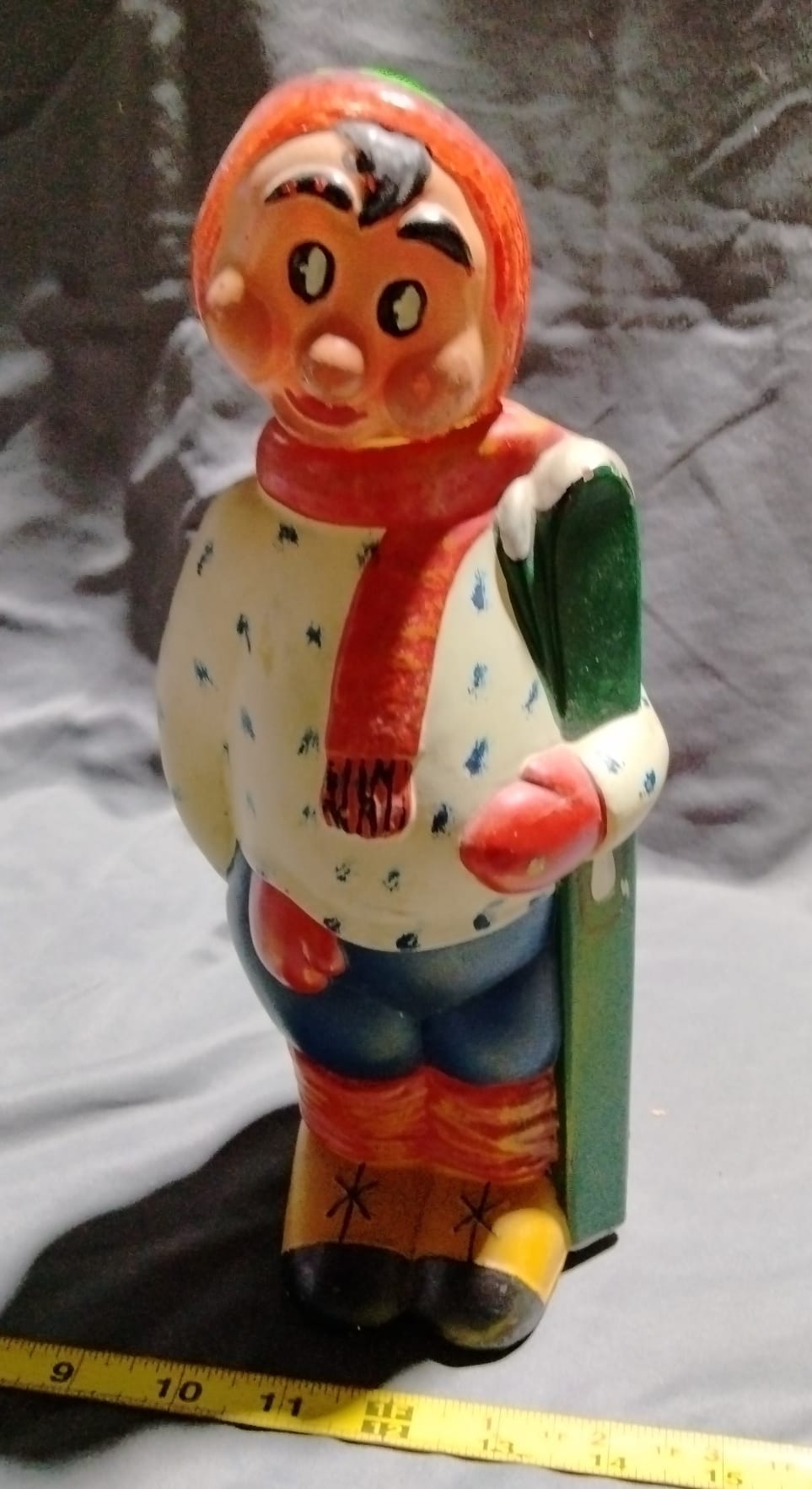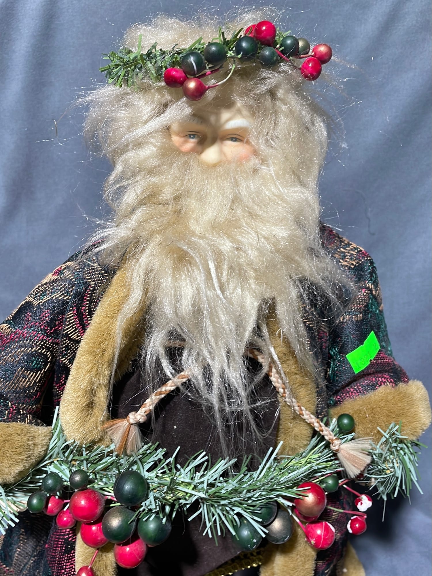 2019 Sking Santa, 17”, Indian doll on stand, 17”, bull decanter, novelty door