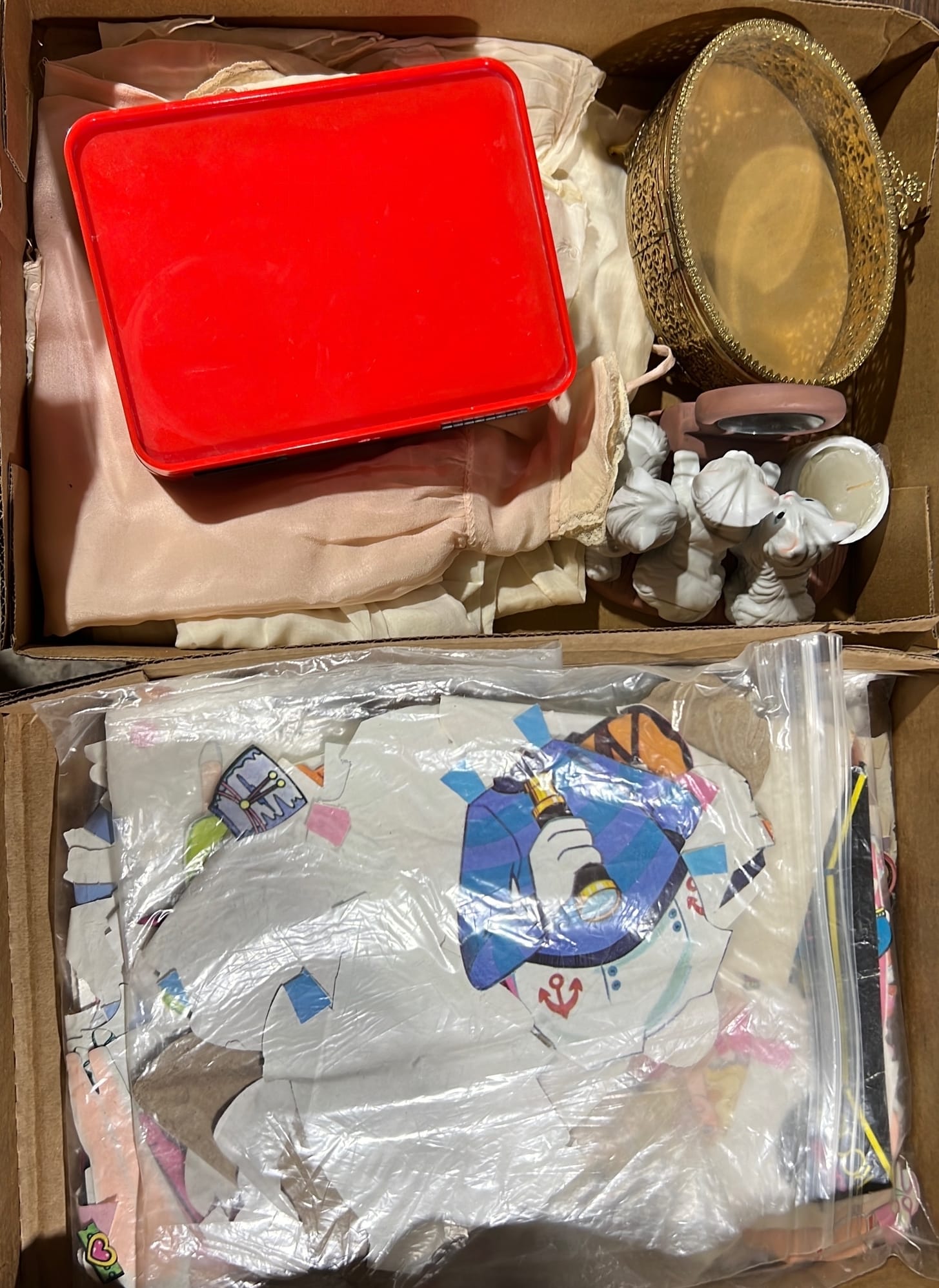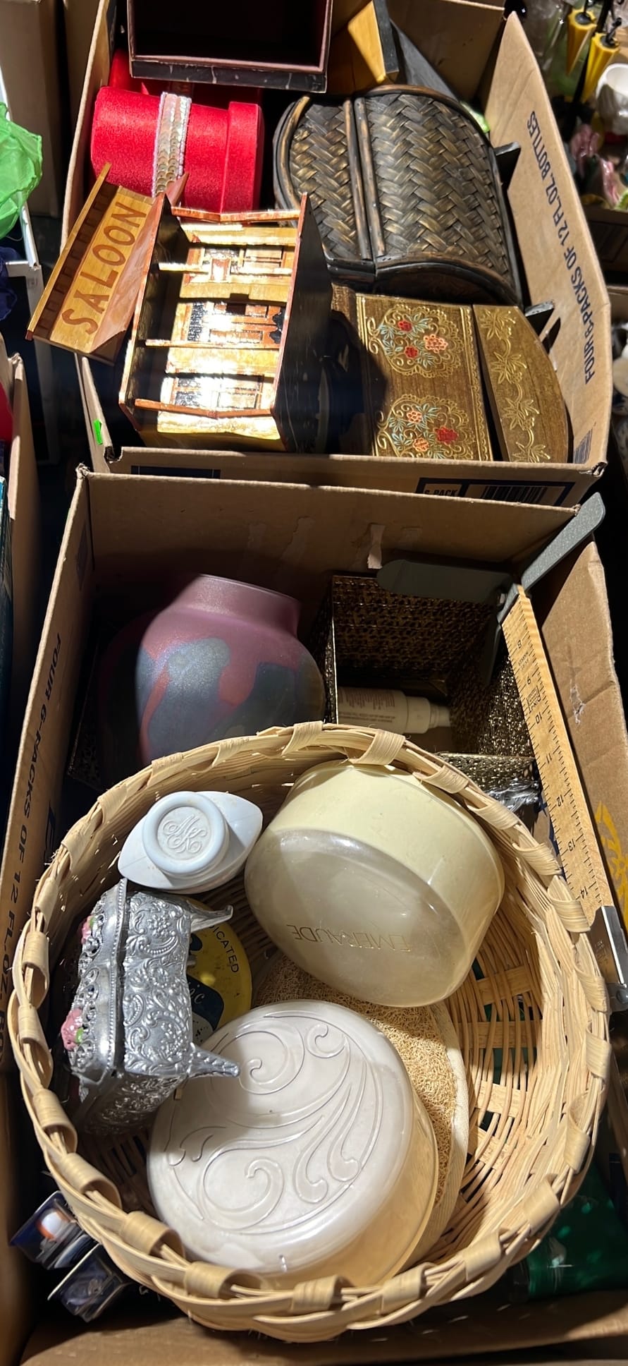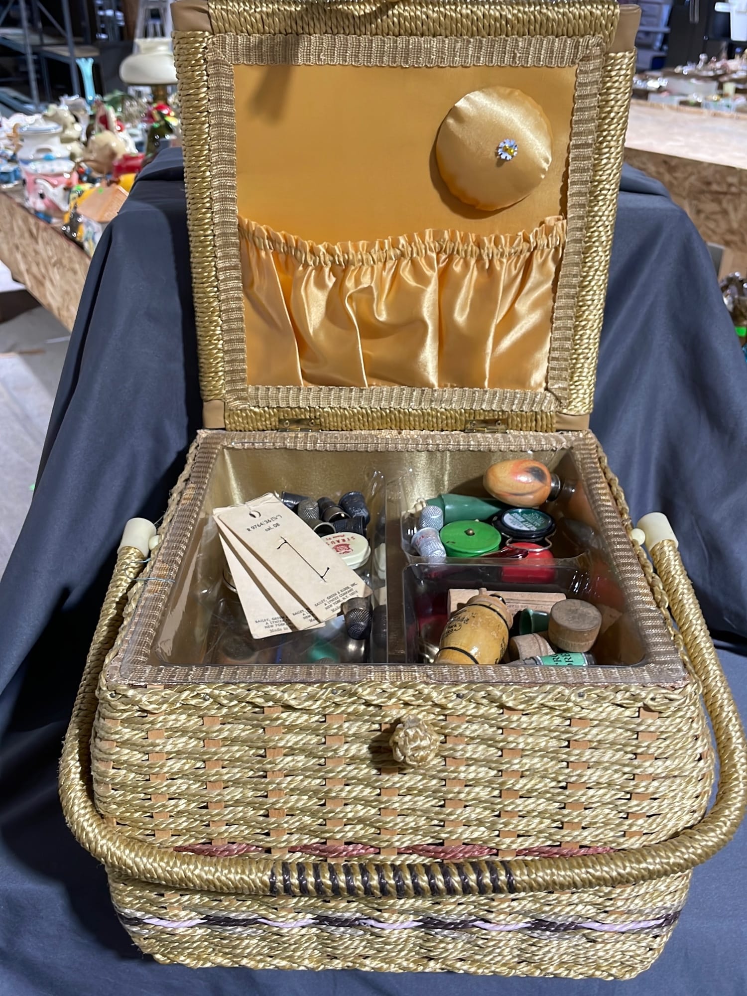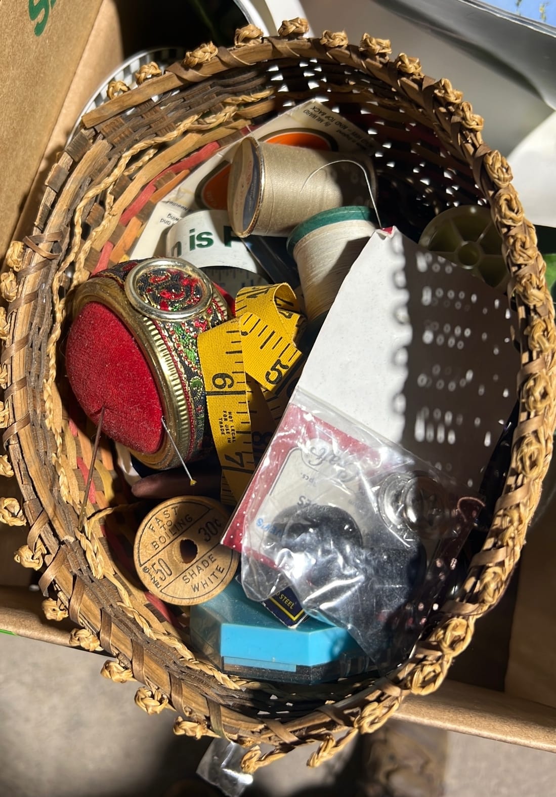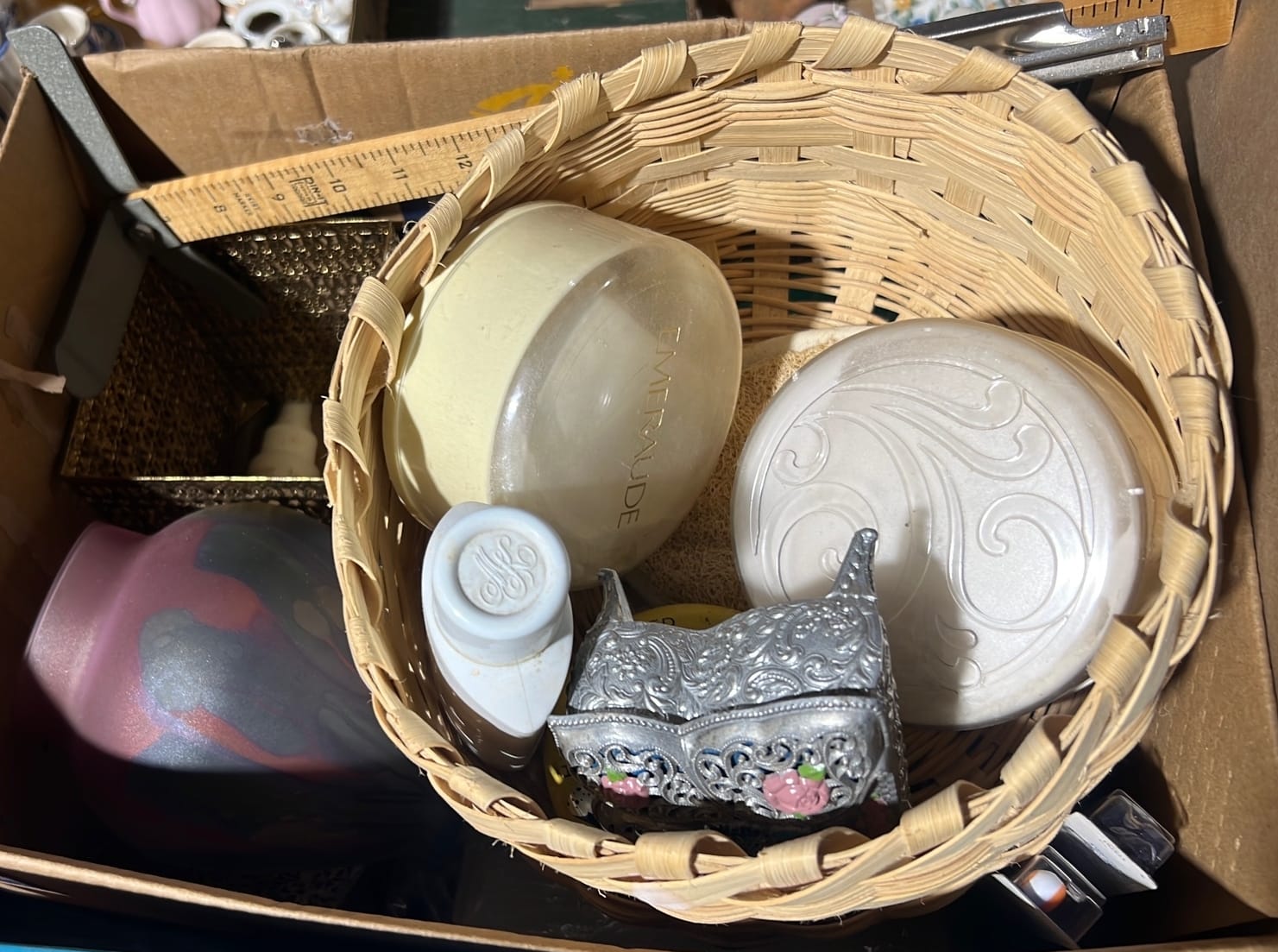 2015 Basket, ornate storage boxes various sizes, skirt marker ruler, miscellaneous
