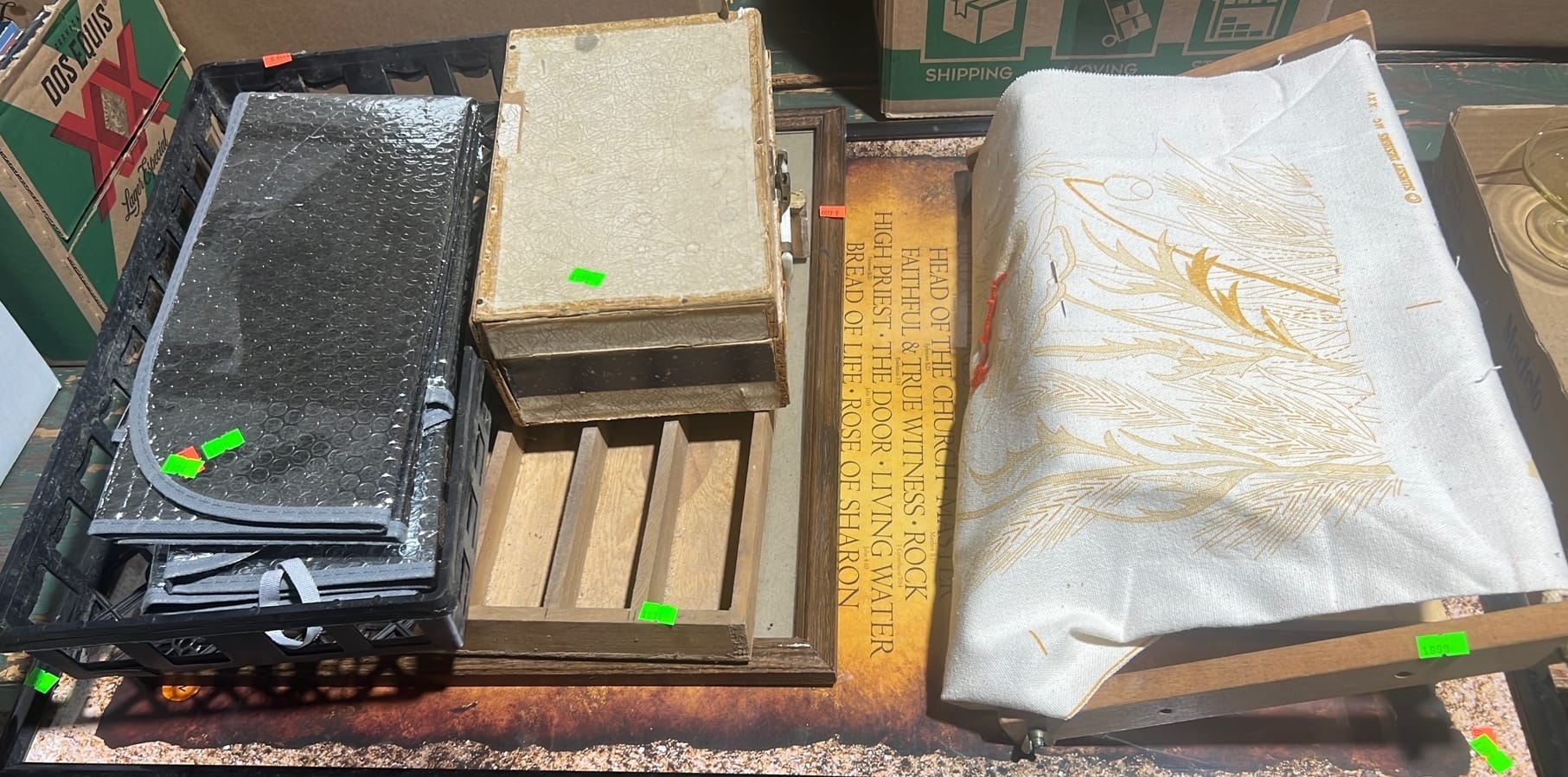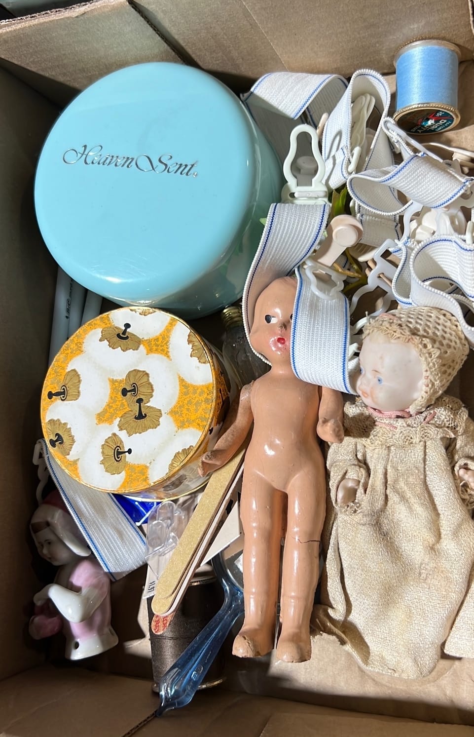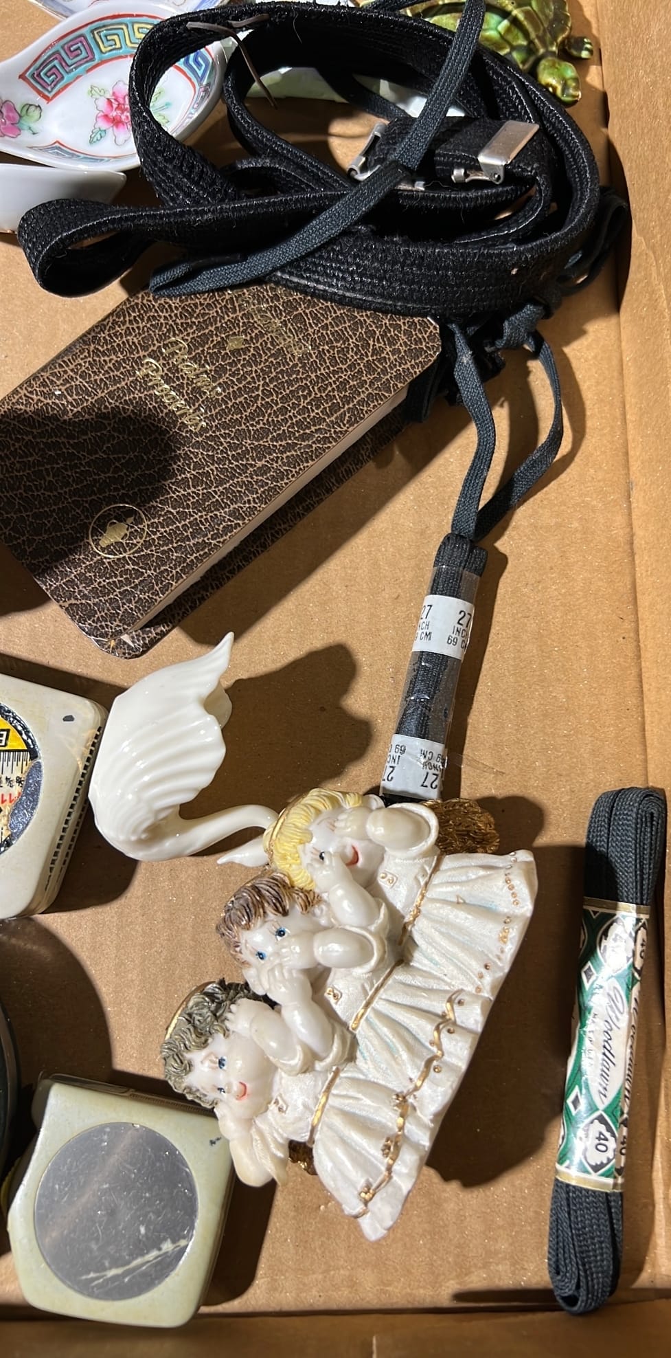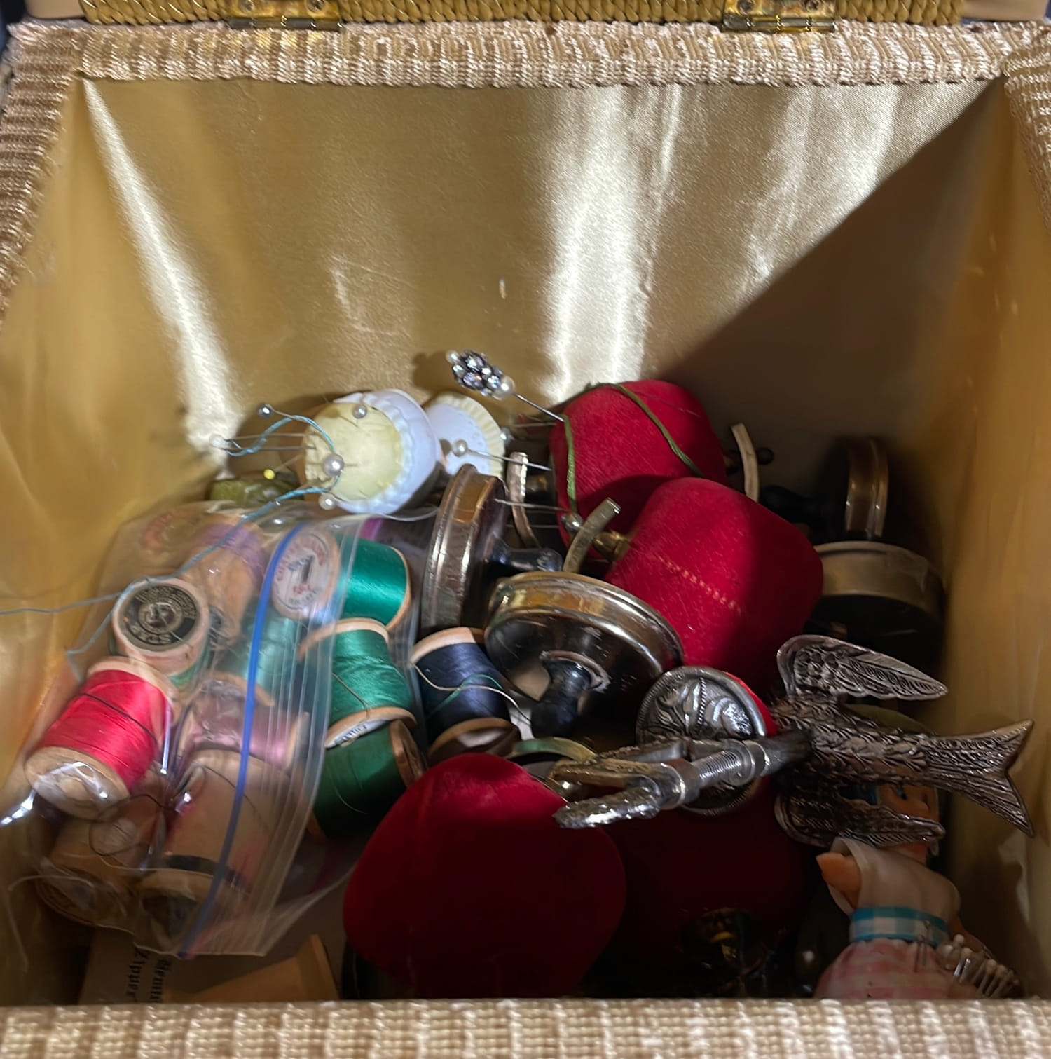 2015 Basket, ornate storage boxes various sizes, skirt marker ruler, miscellaneous