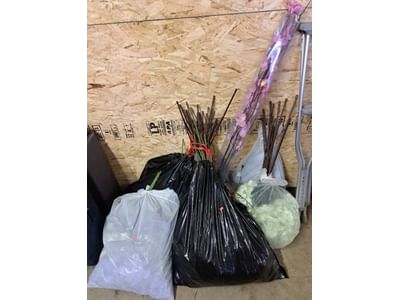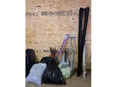 6213 Canes, shovels, PVC fence sections, garden tools