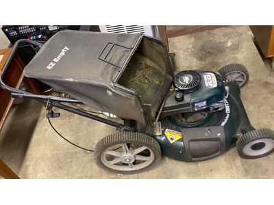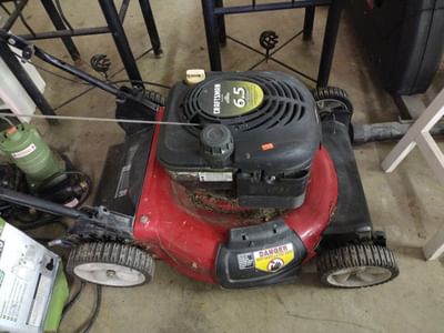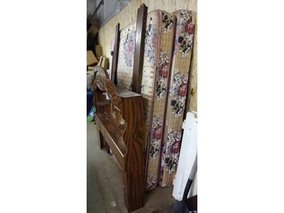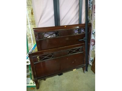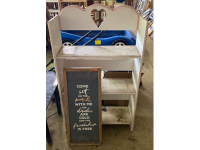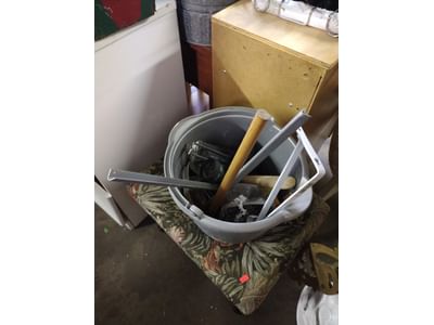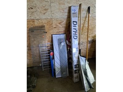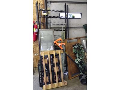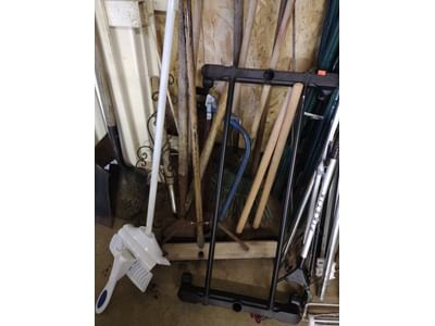 6223 2 Classic Rails, edger-will not turn on, snow shovel, rakes, twin size headboard, decor, mirror, misc.
