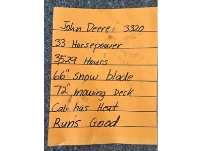 6 John Deere 3320 Tractor with Auto Connect 72D Mower Deck and 66” John Deere Blade Runs Good - PICK UP AT ALTERNATE WARSAW LOCATION