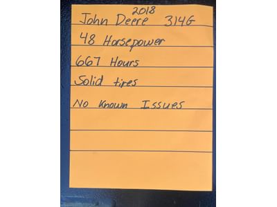 9 2018 John Deere 314G 48 HP 667 Hours, Solid Tires with 67” Bucket Runs Good - PICK UP AT ALTERNATE WARSAW LOCATION