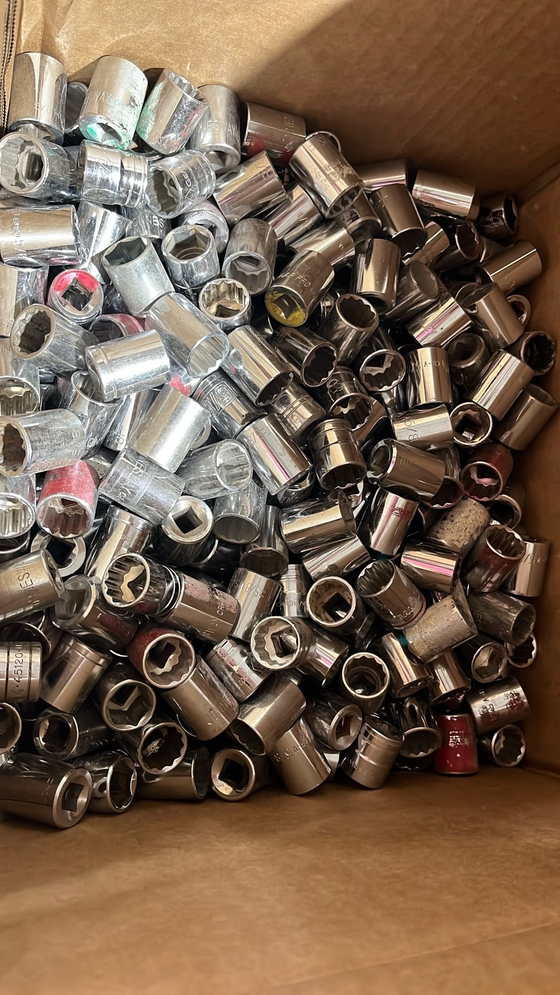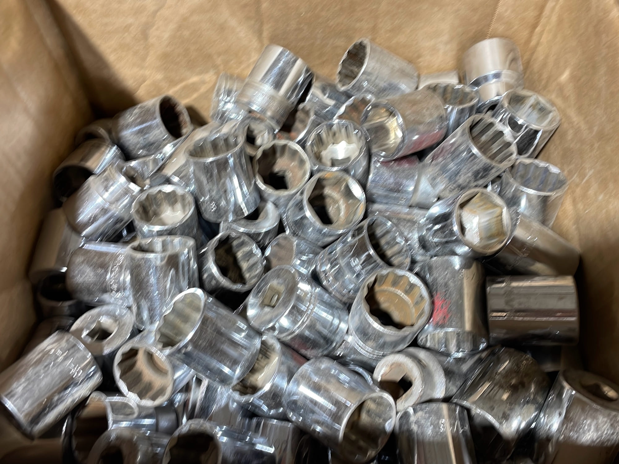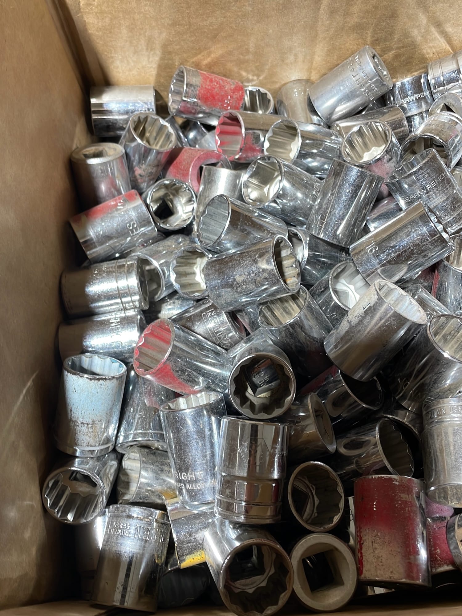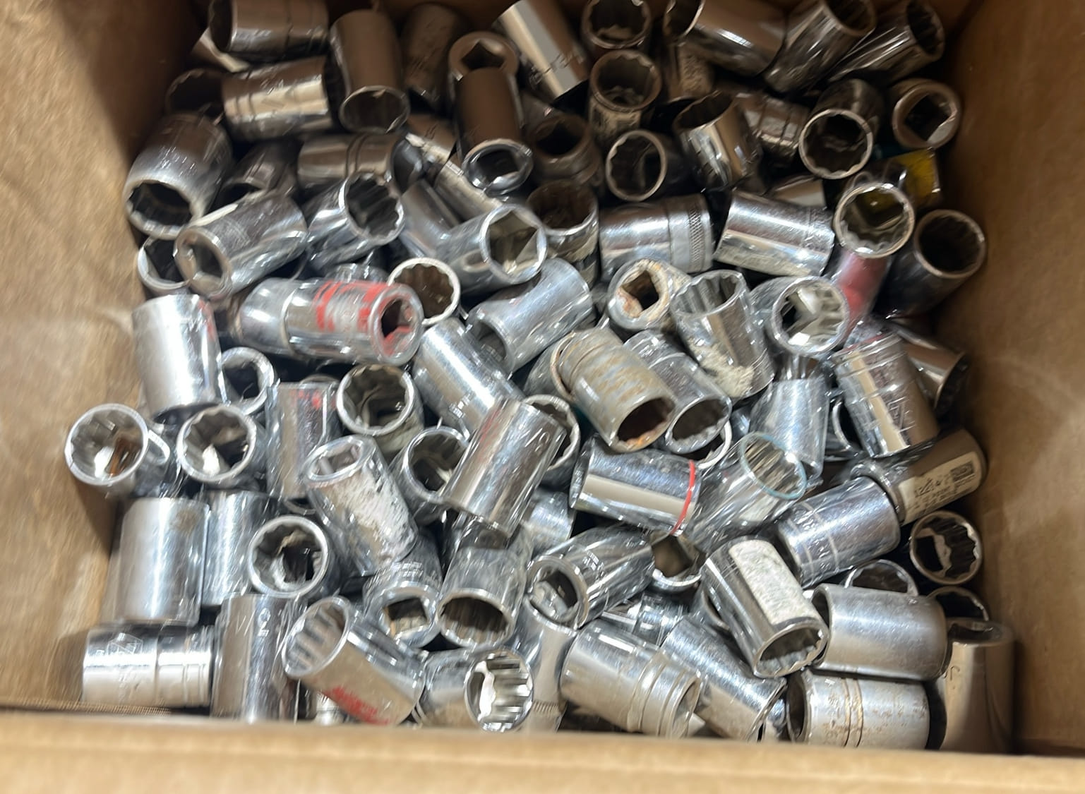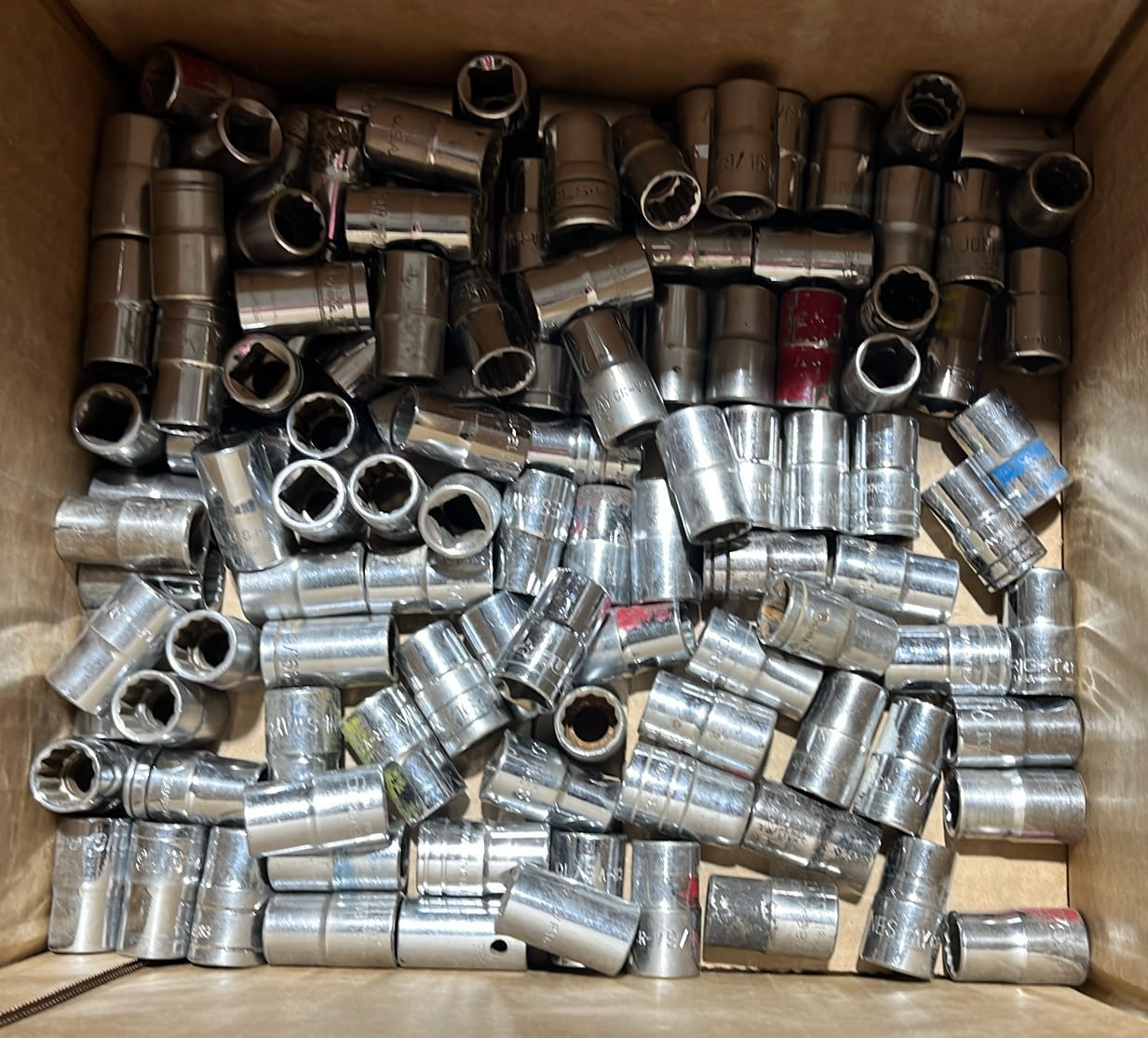 692 Socket assortment in plastic bin including Powerbuilt 7/16”, craftsman 1/4” 12mm, craftsman 1/4” 7/16”