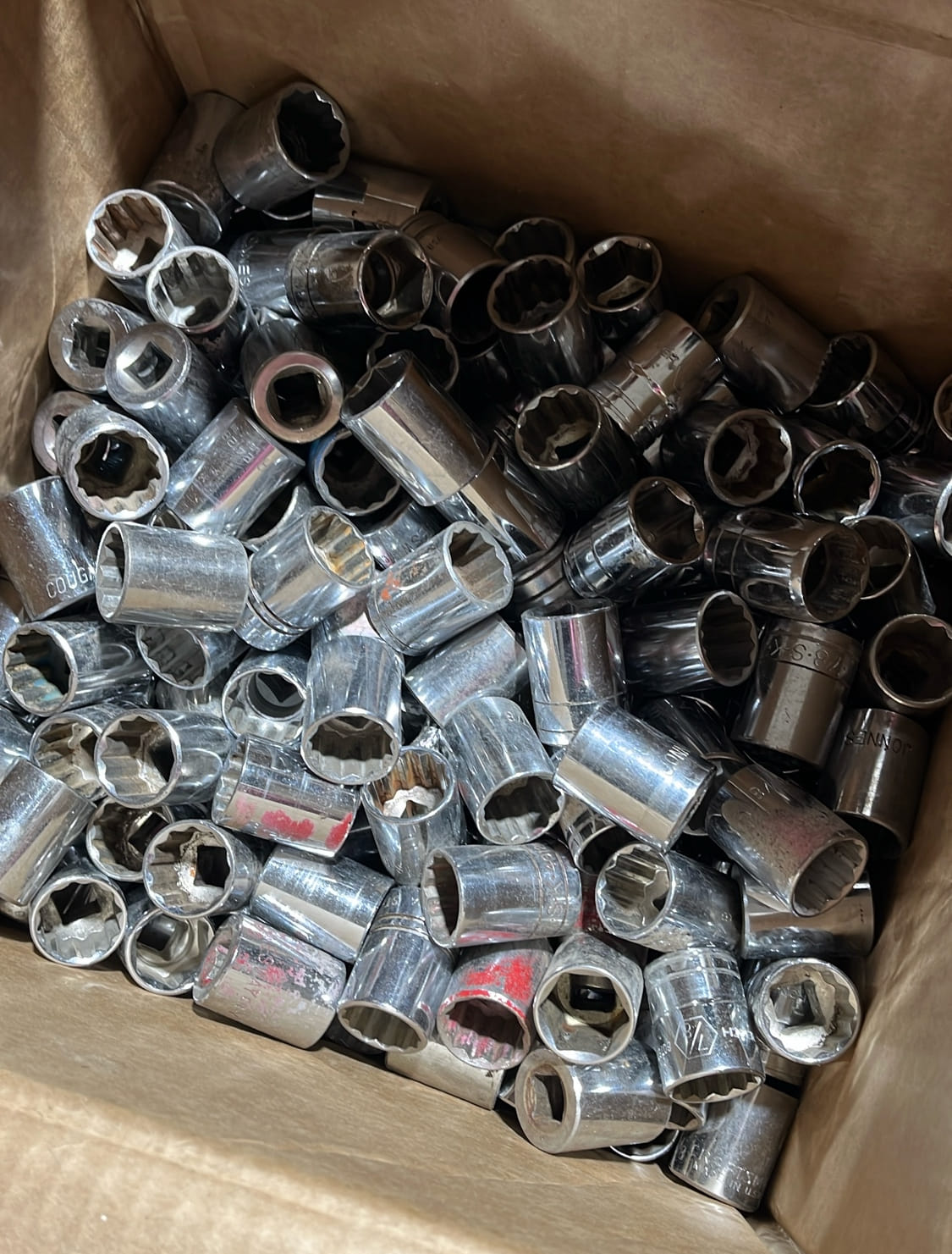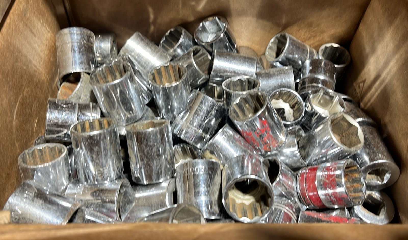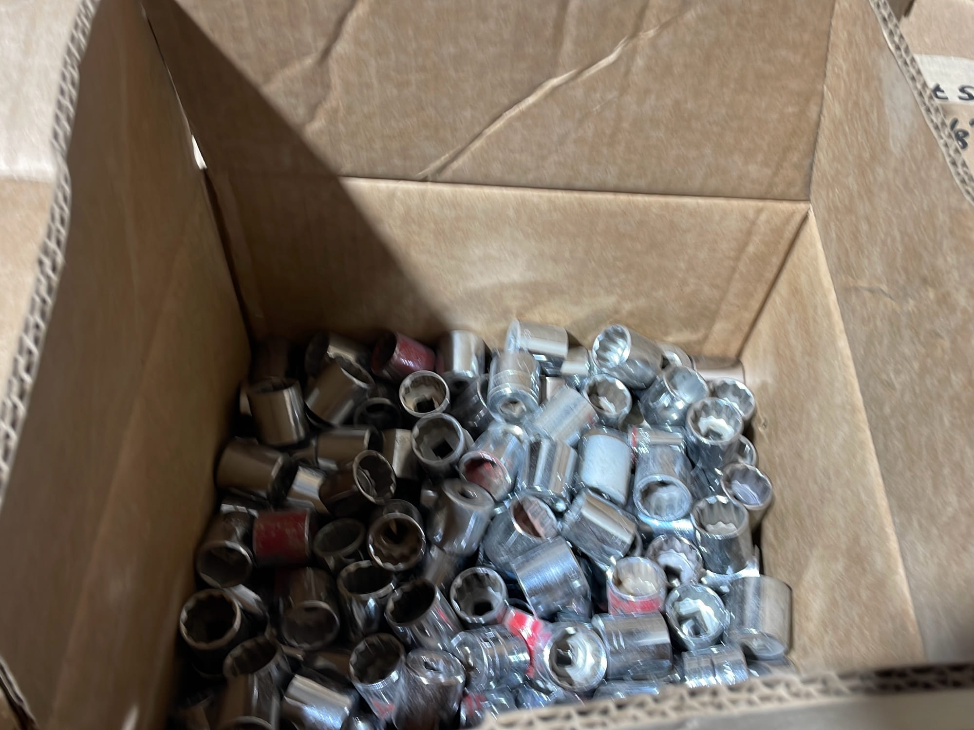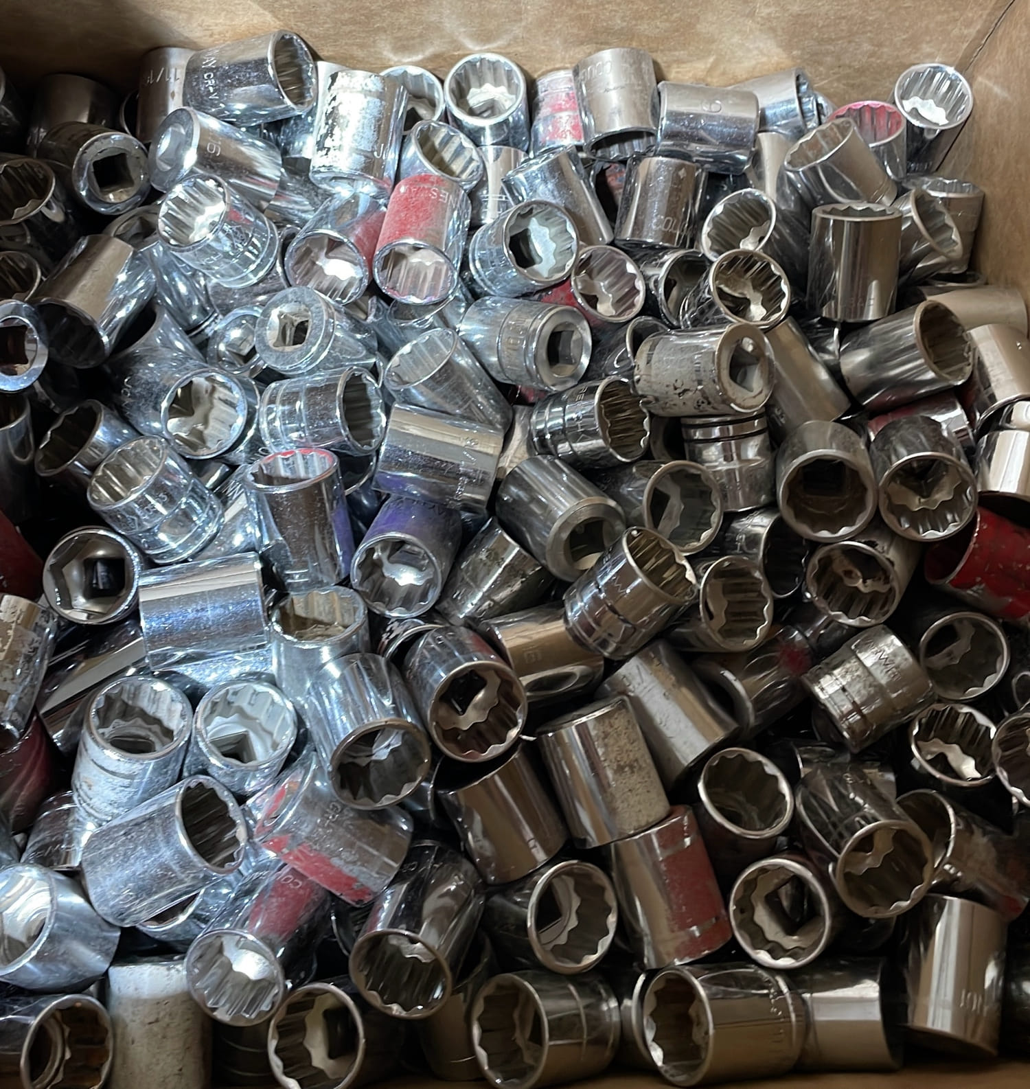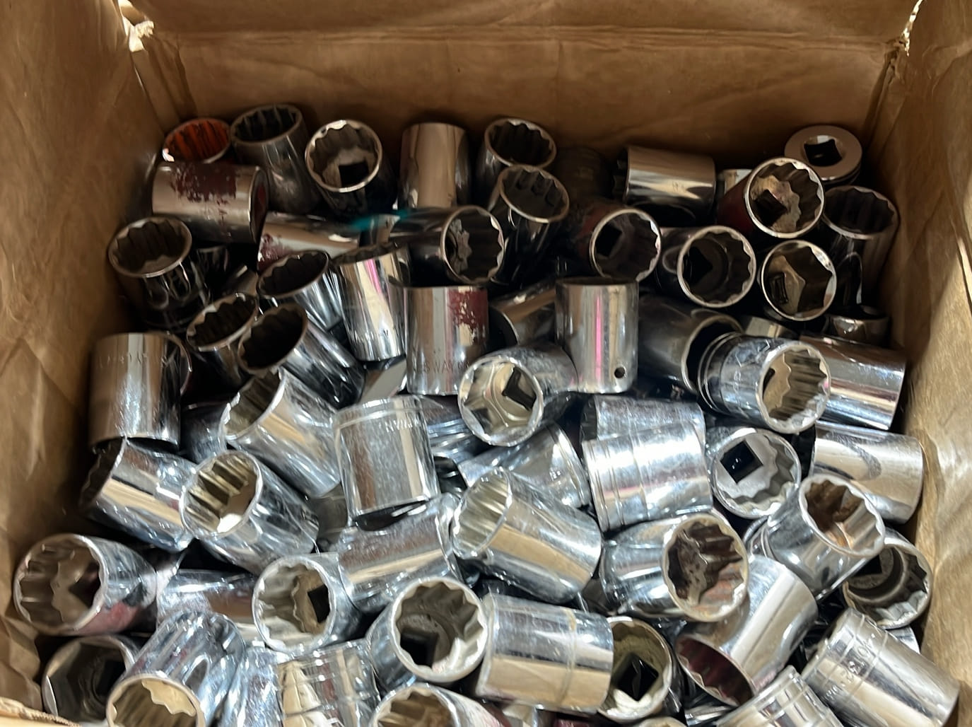 692 Socket assortment in plastic bin including Powerbuilt 7/16”, craftsman 1/4” 12mm, craftsman 1/4” 7/16”