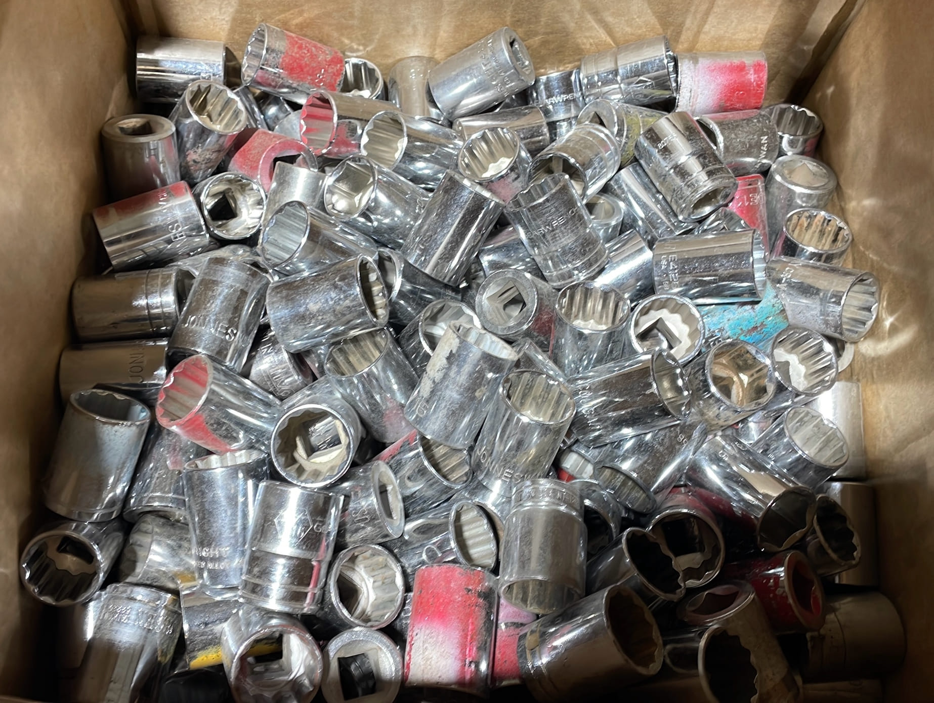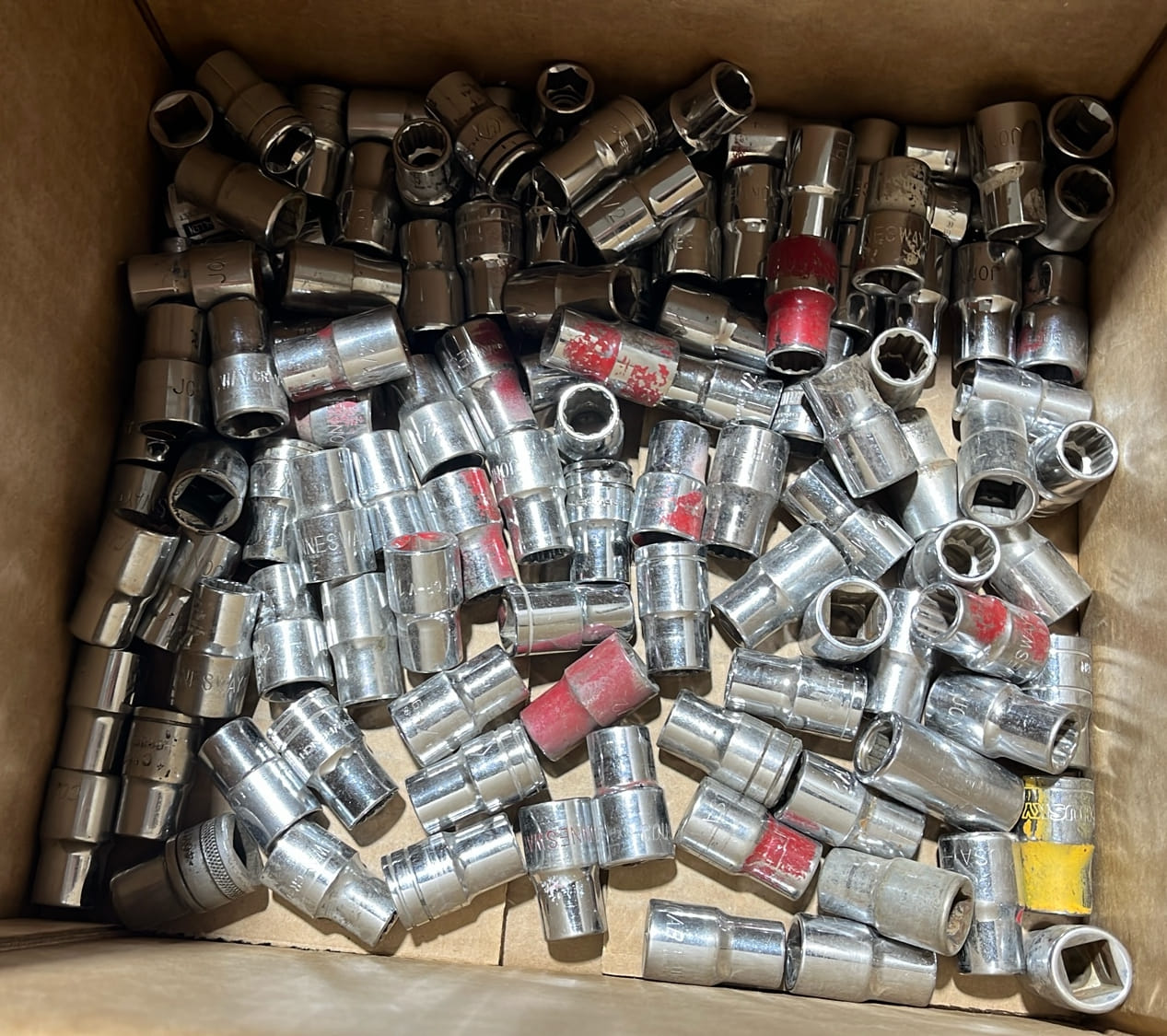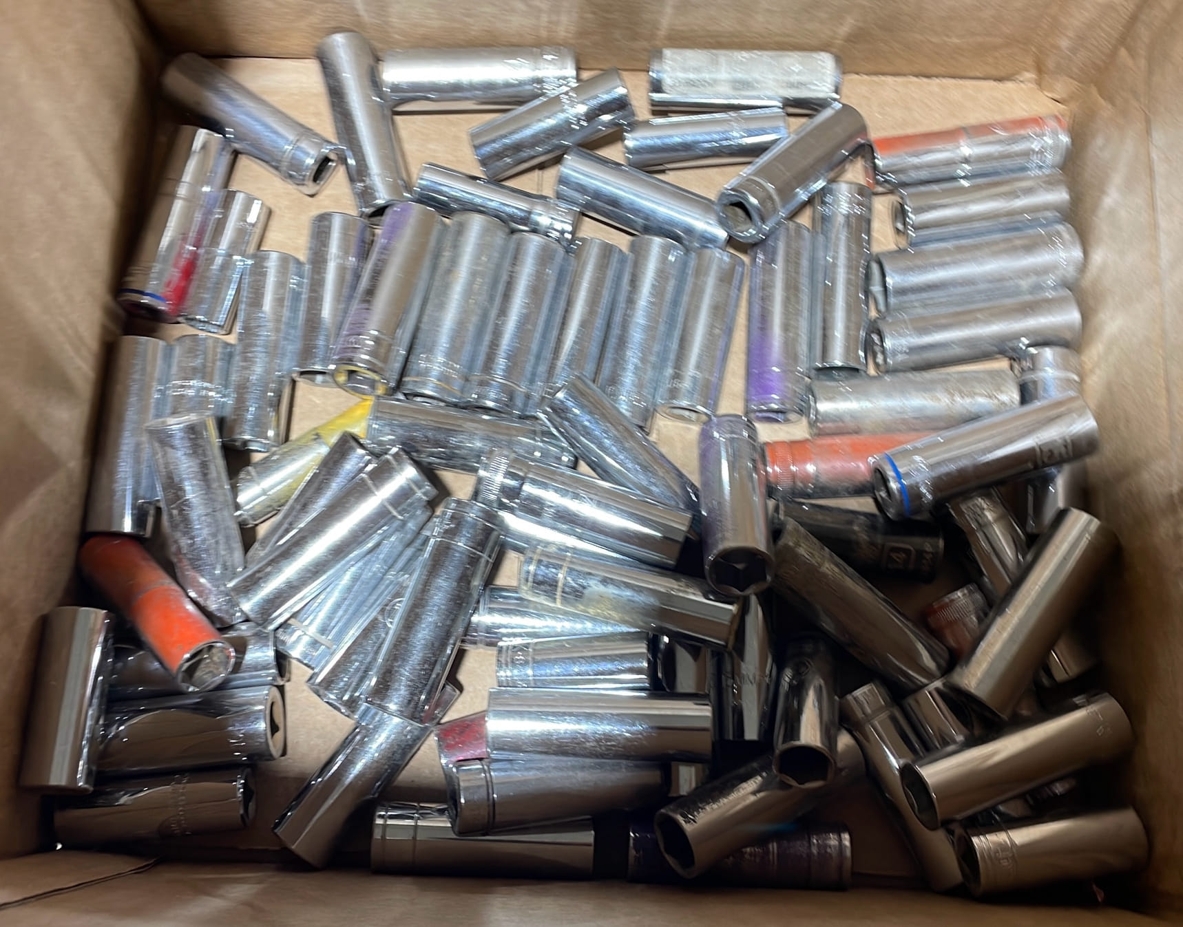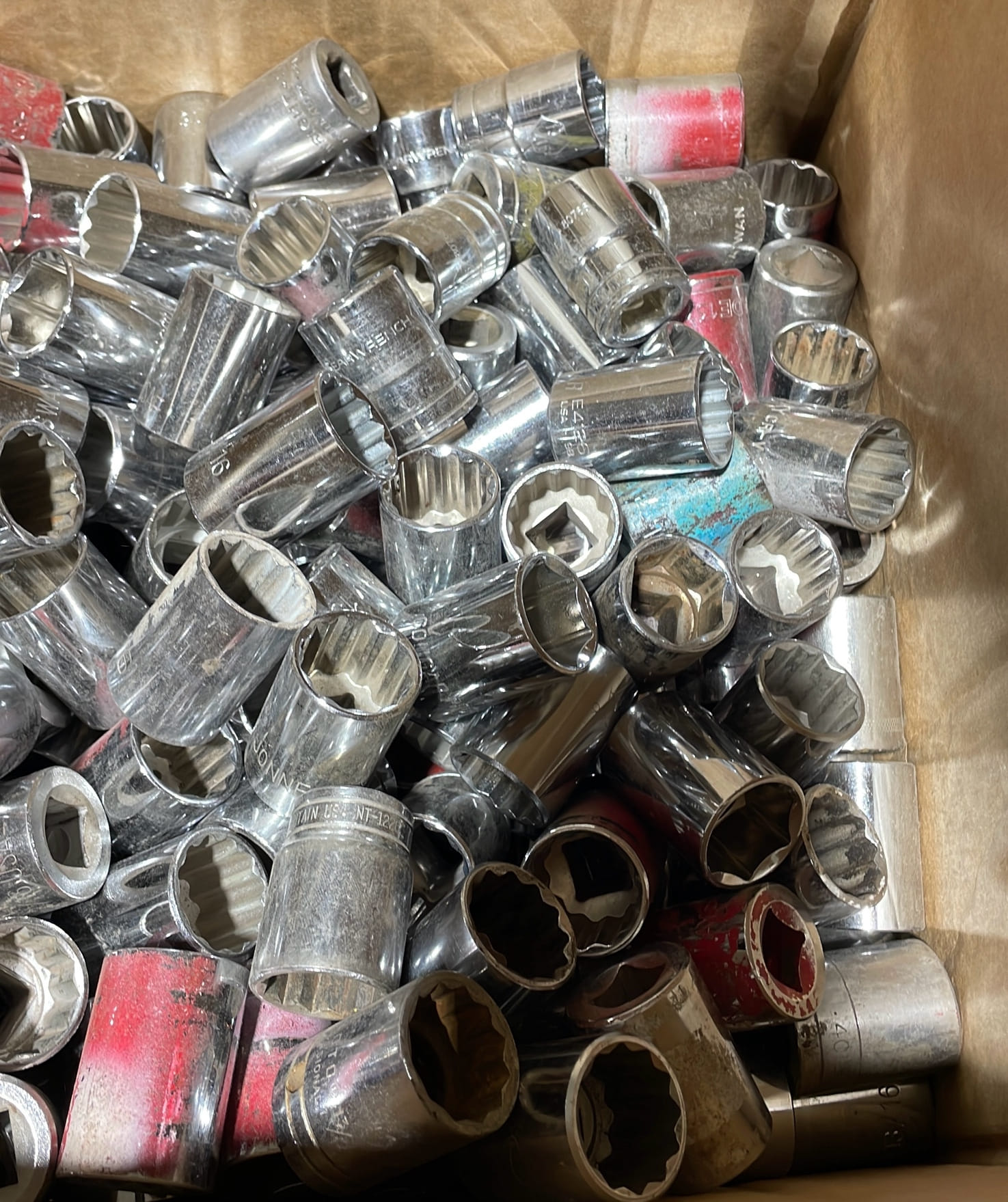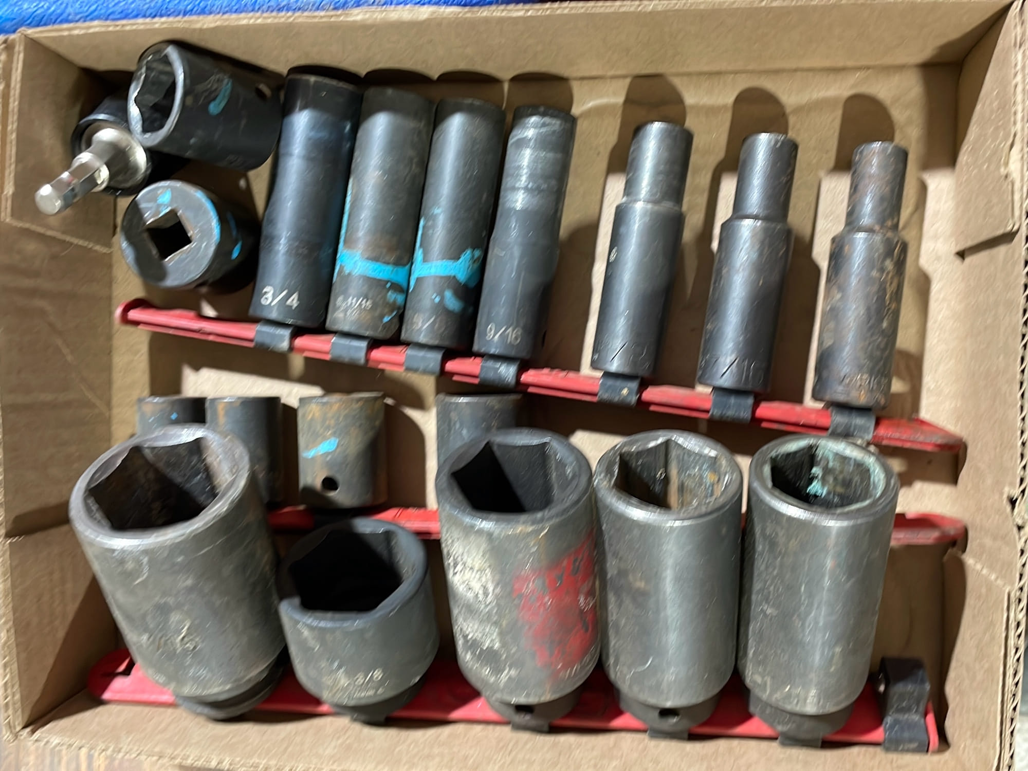 692 Socket assortment in plastic bin including Powerbuilt 7/16”, craftsman 1/4” 12mm, craftsman 1/4” 7/16”