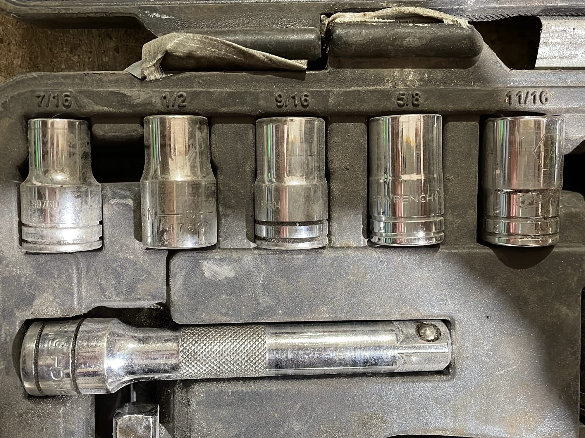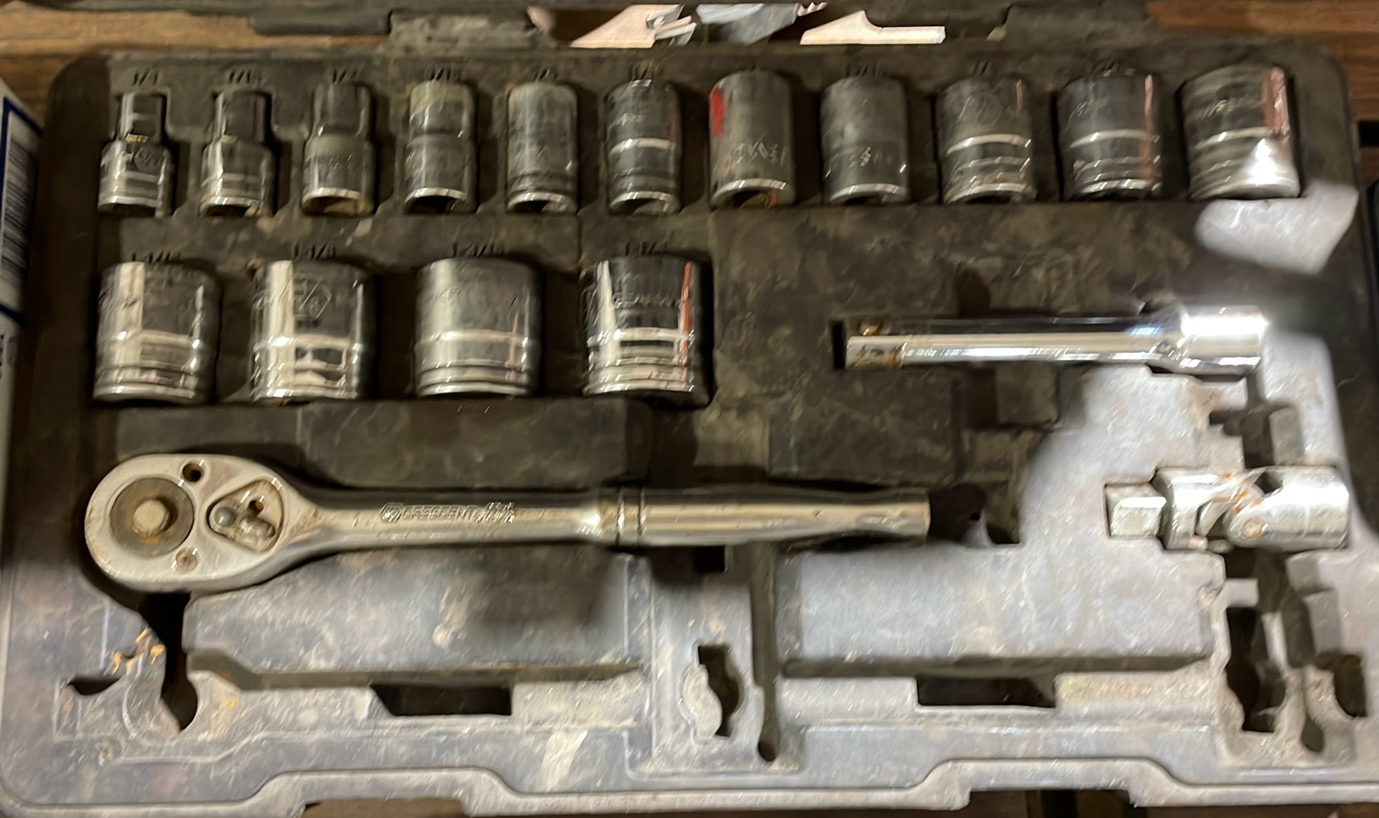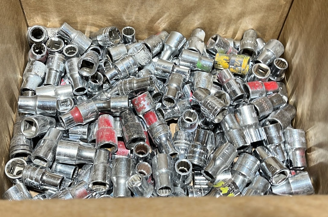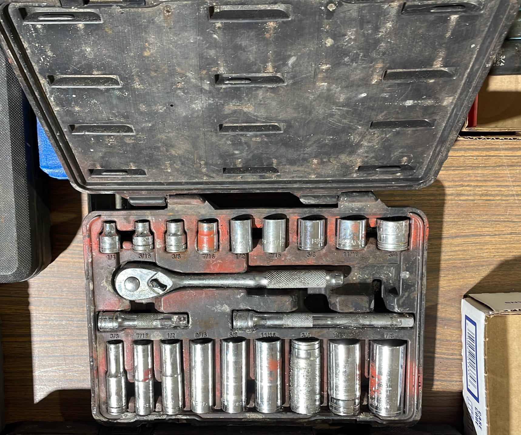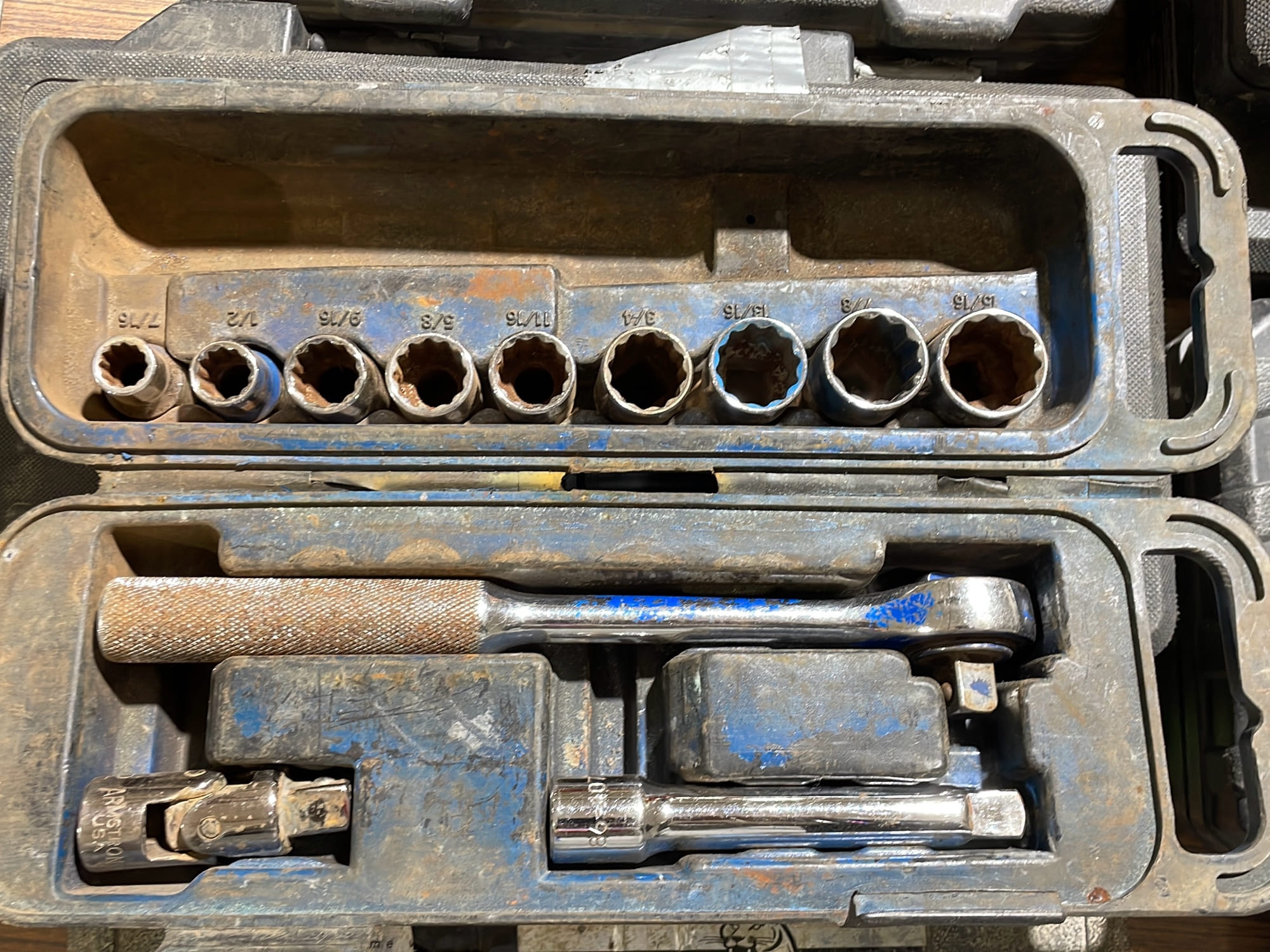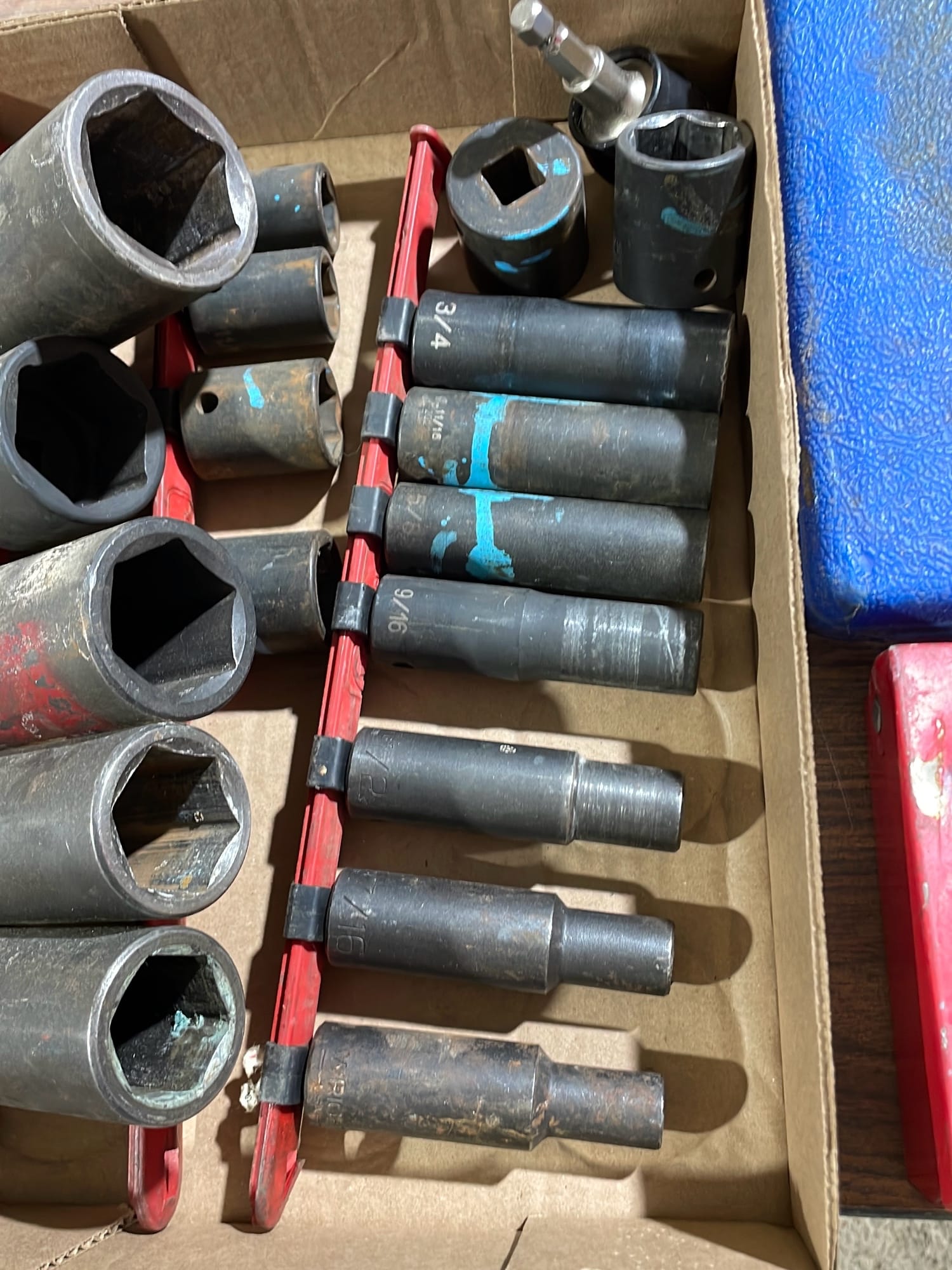 692 Socket assortment in plastic bin including Powerbuilt 7/16”, craftsman 1/4” 12mm, craftsman 1/4” 7/16”