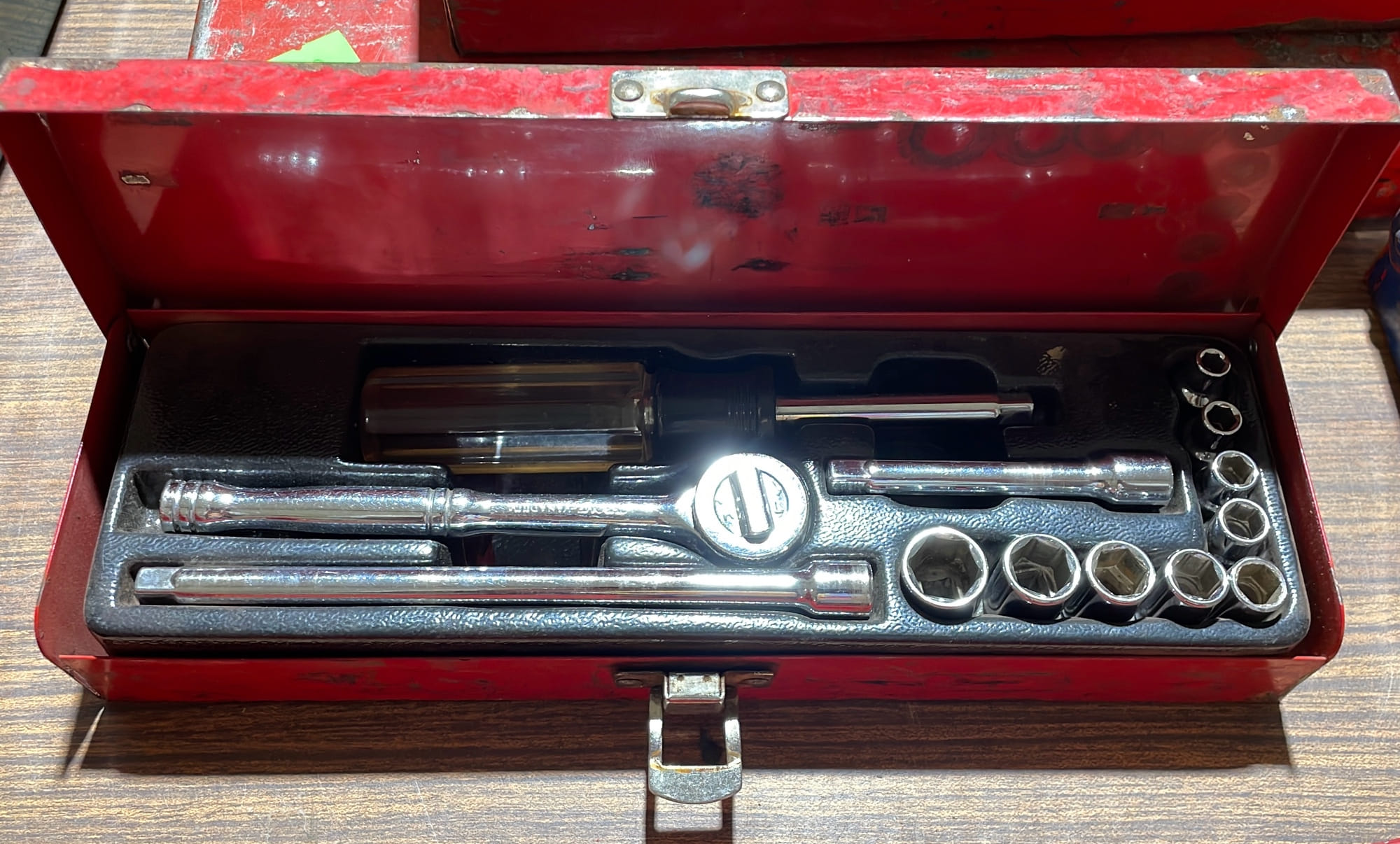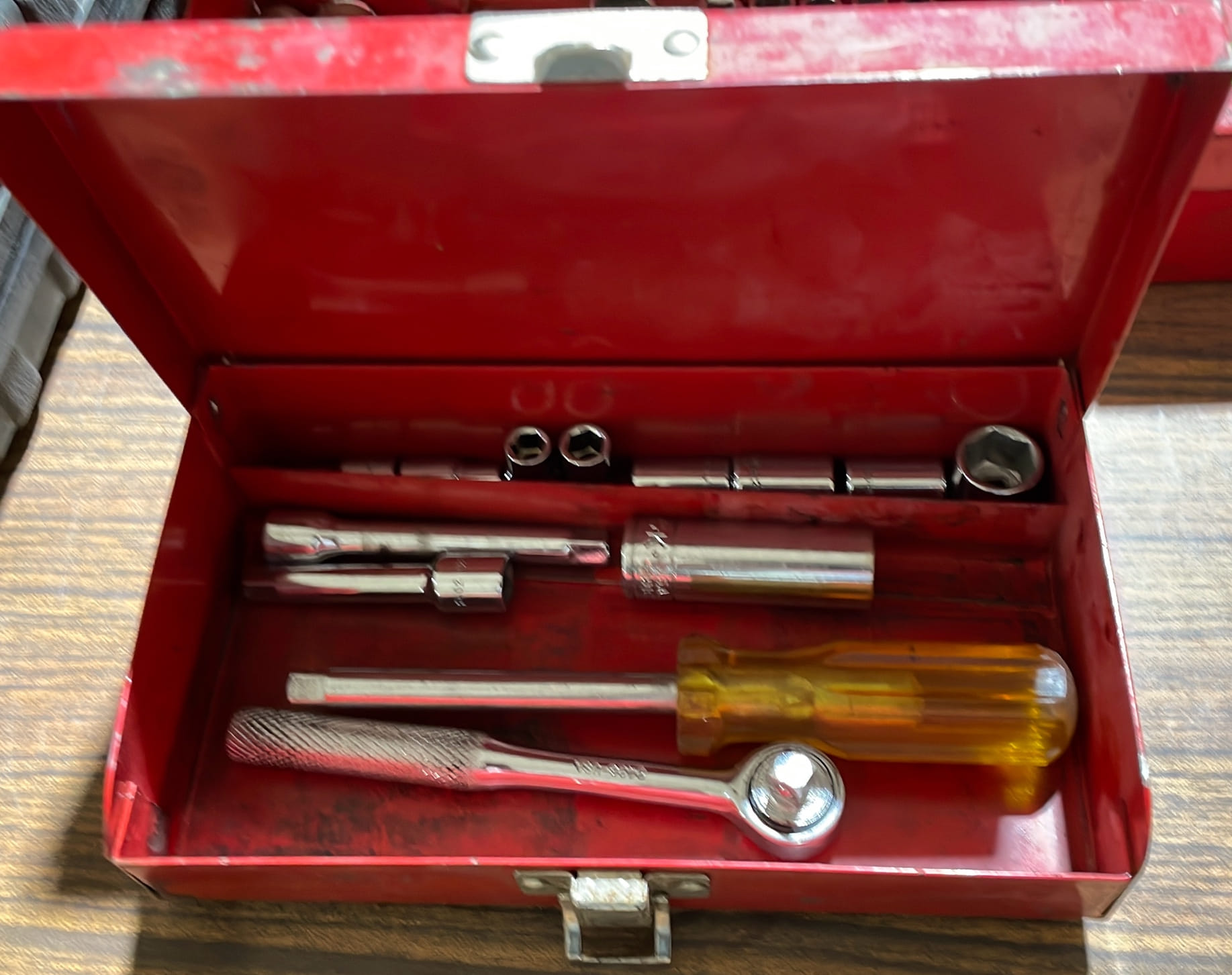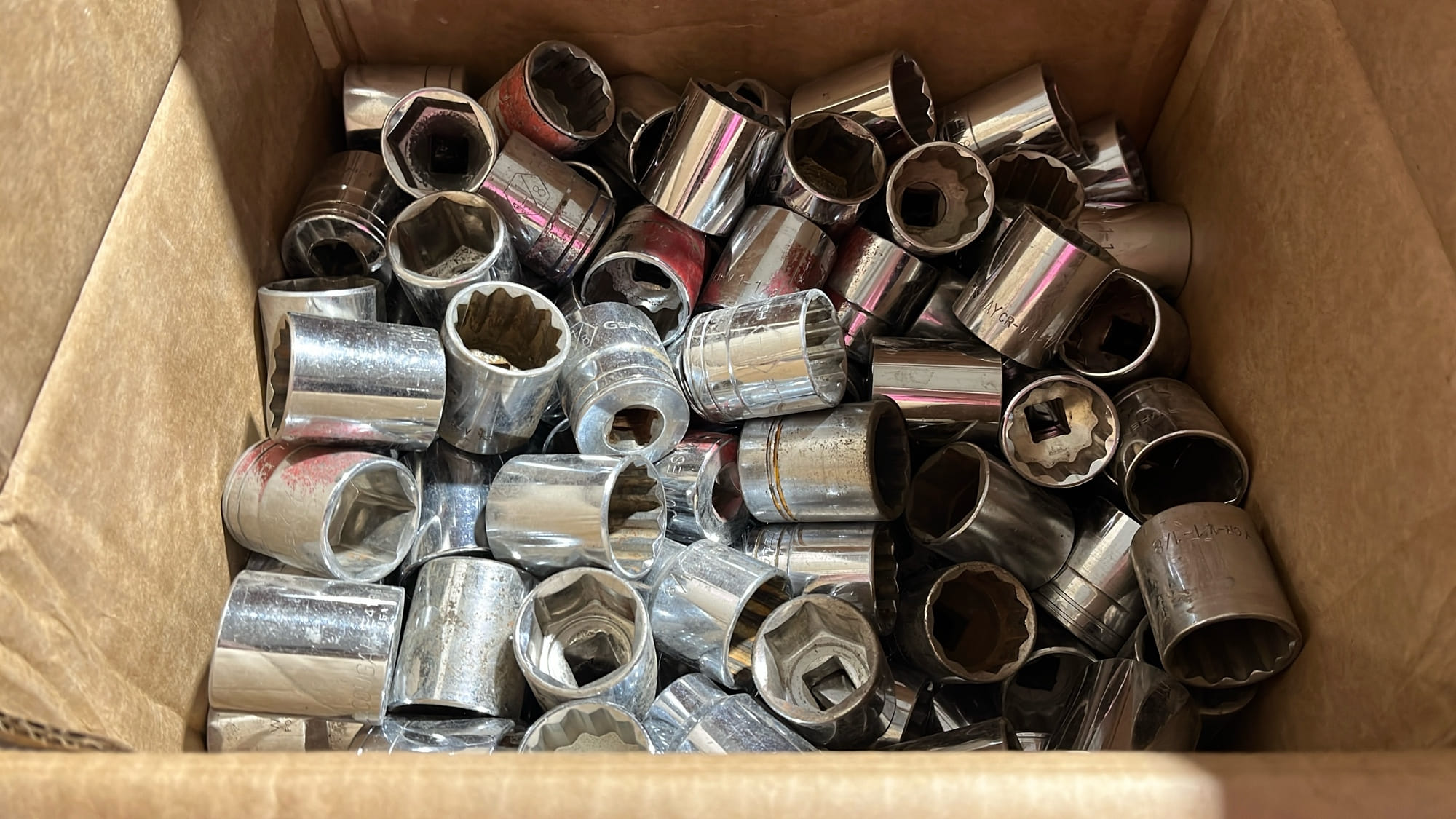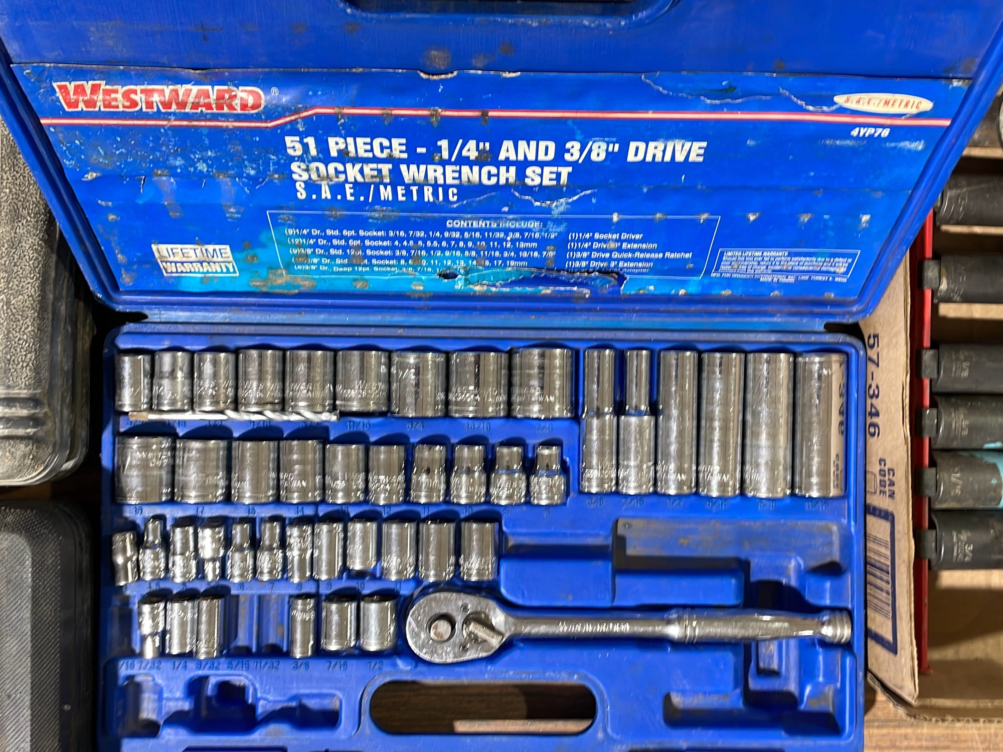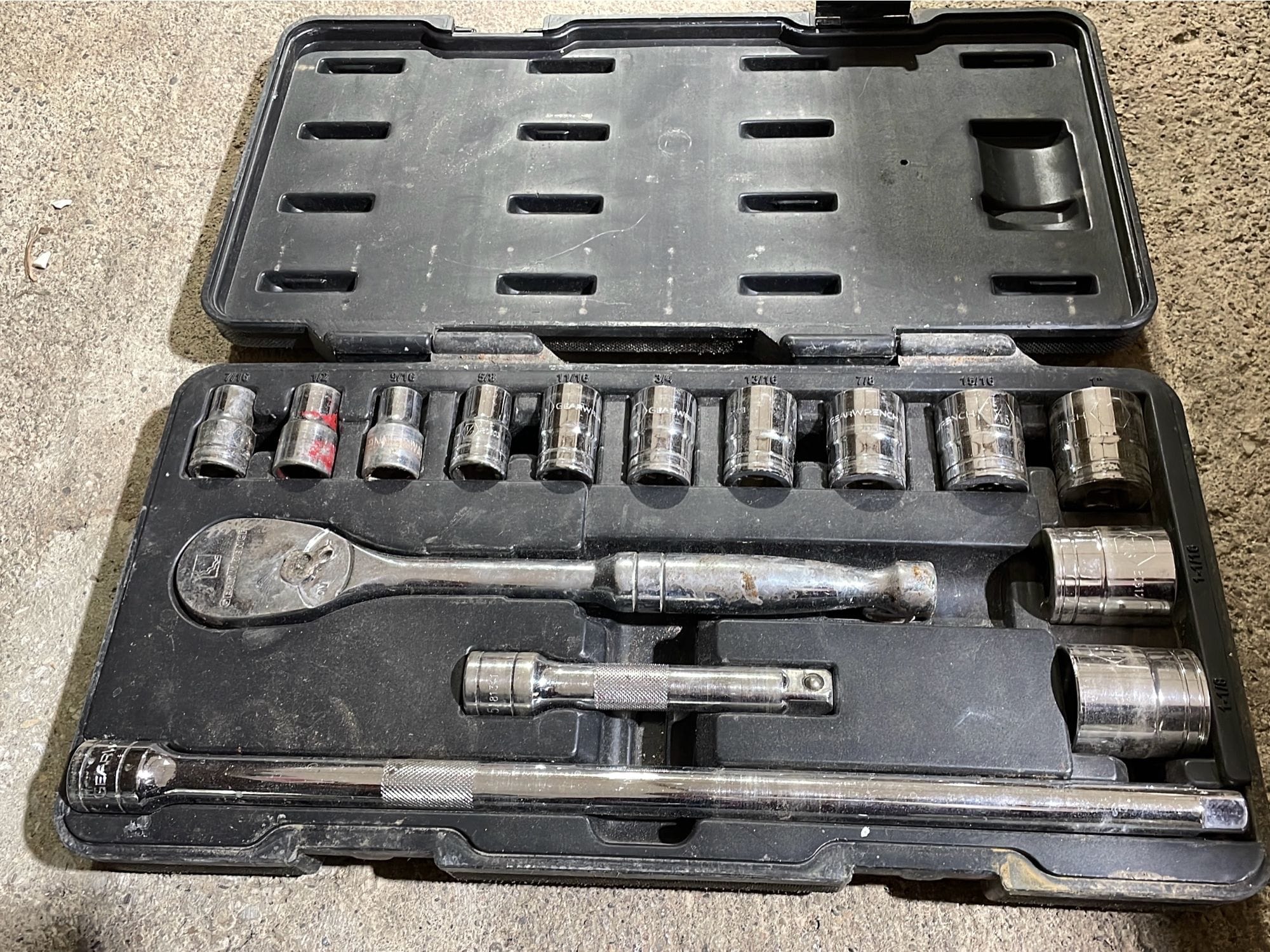 692 Socket assortment in plastic bin including Powerbuilt 7/16”, craftsman 1/4” 12mm, craftsman 1/4” 7/16”