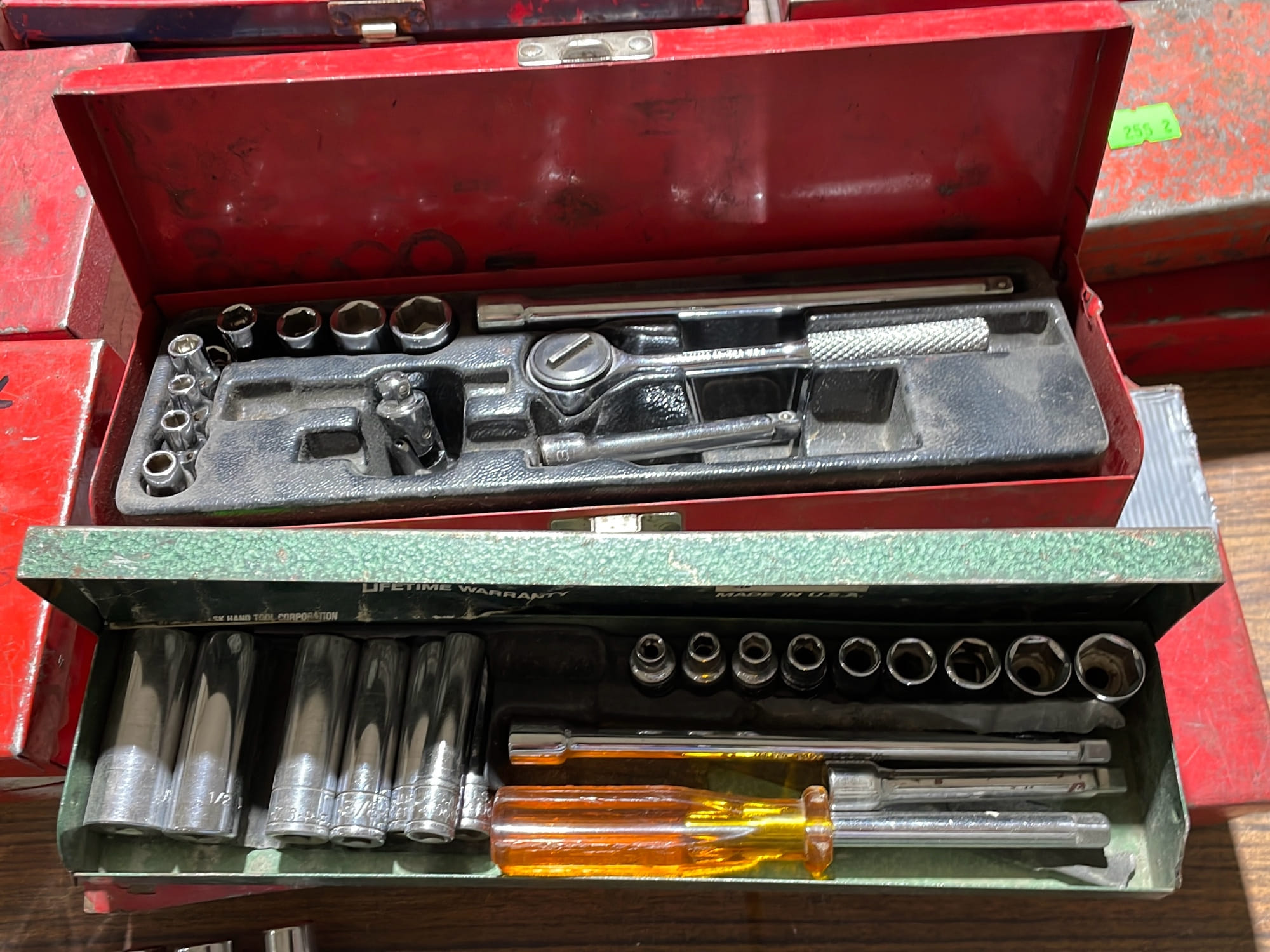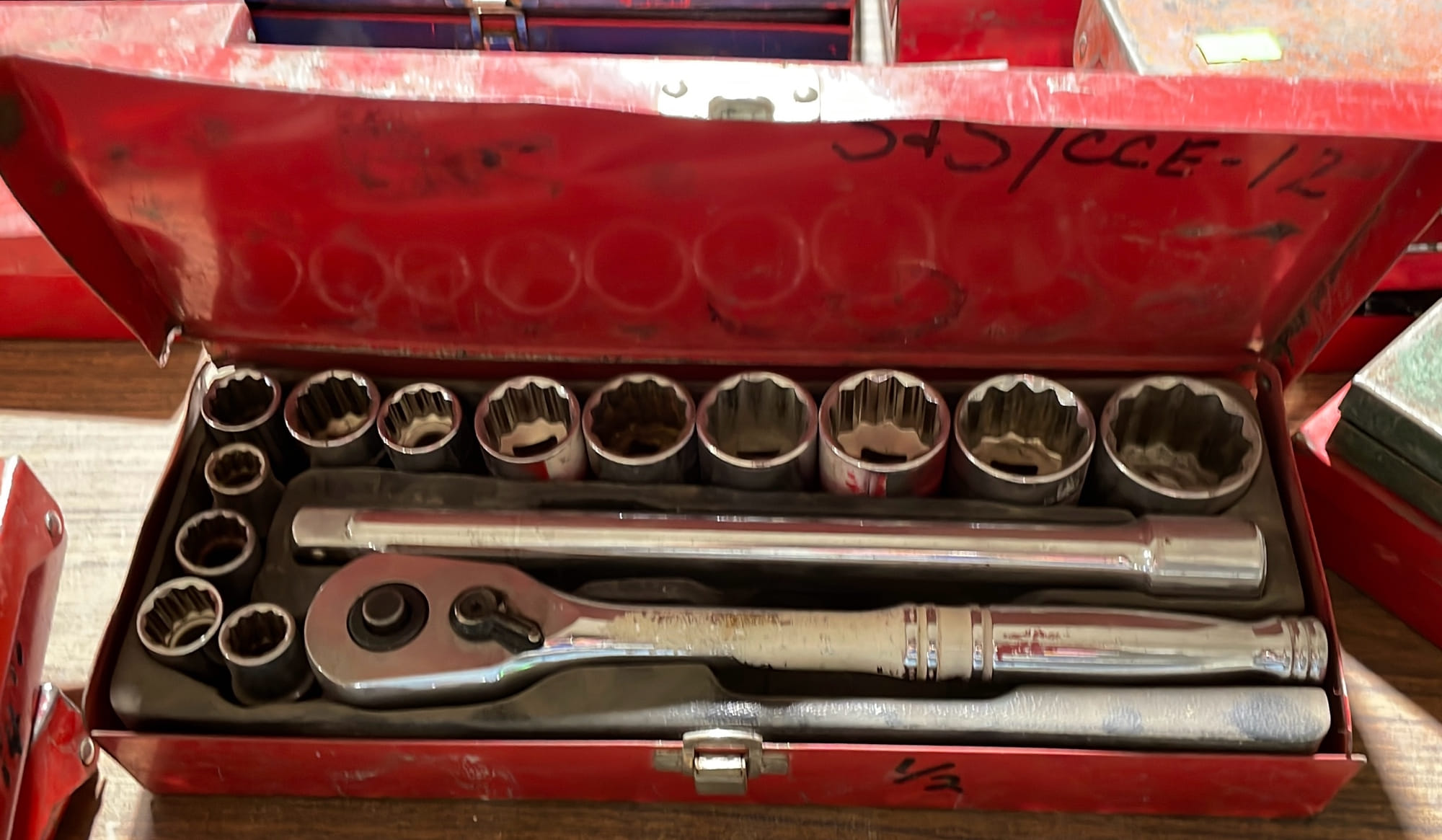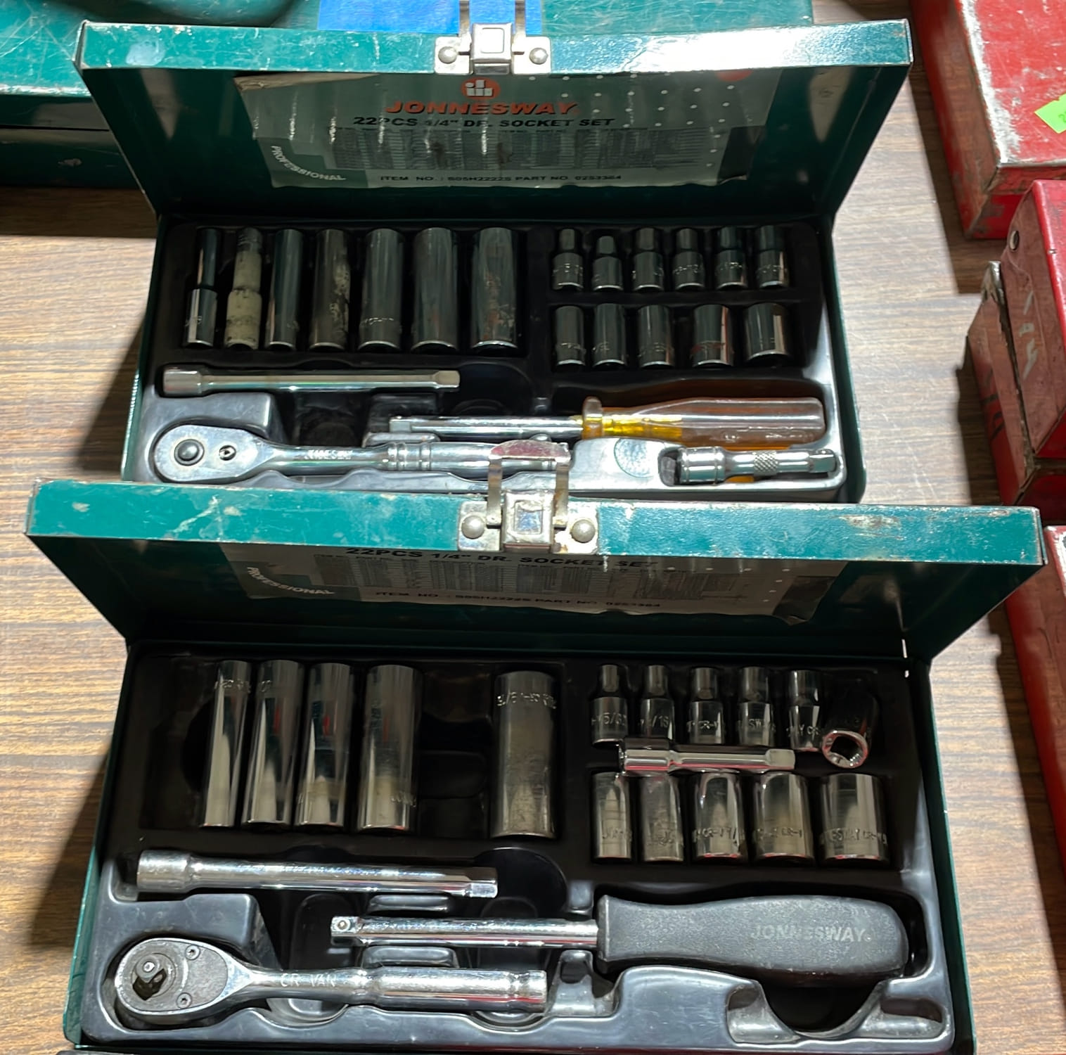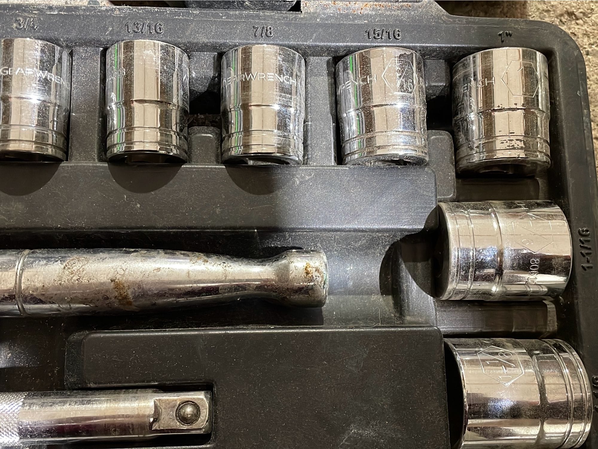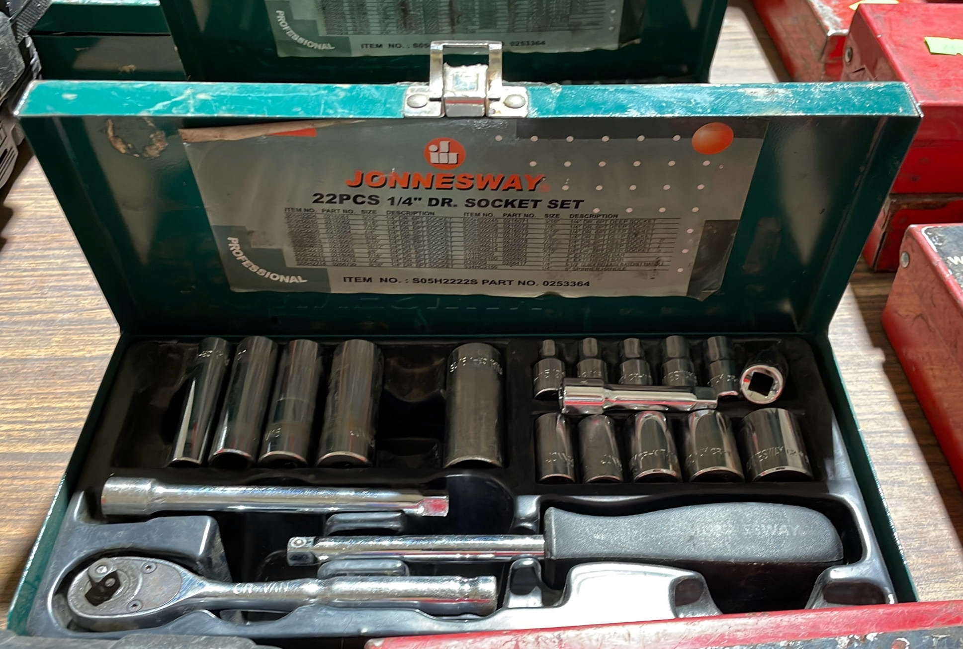 692 Socket assortment in plastic bin including Powerbuilt 7/16”, craftsman 1/4” 12mm, craftsman 1/4” 7/16”