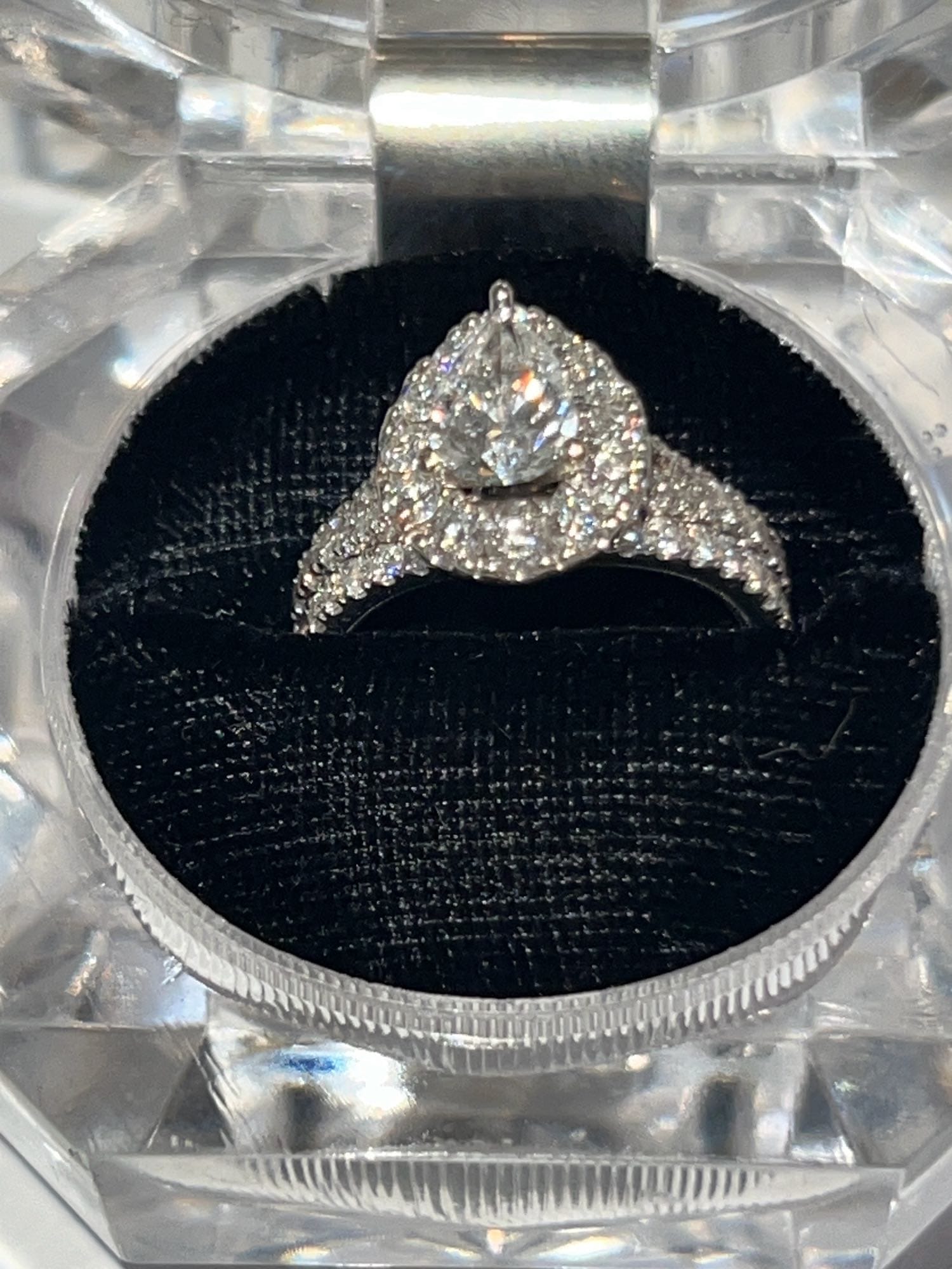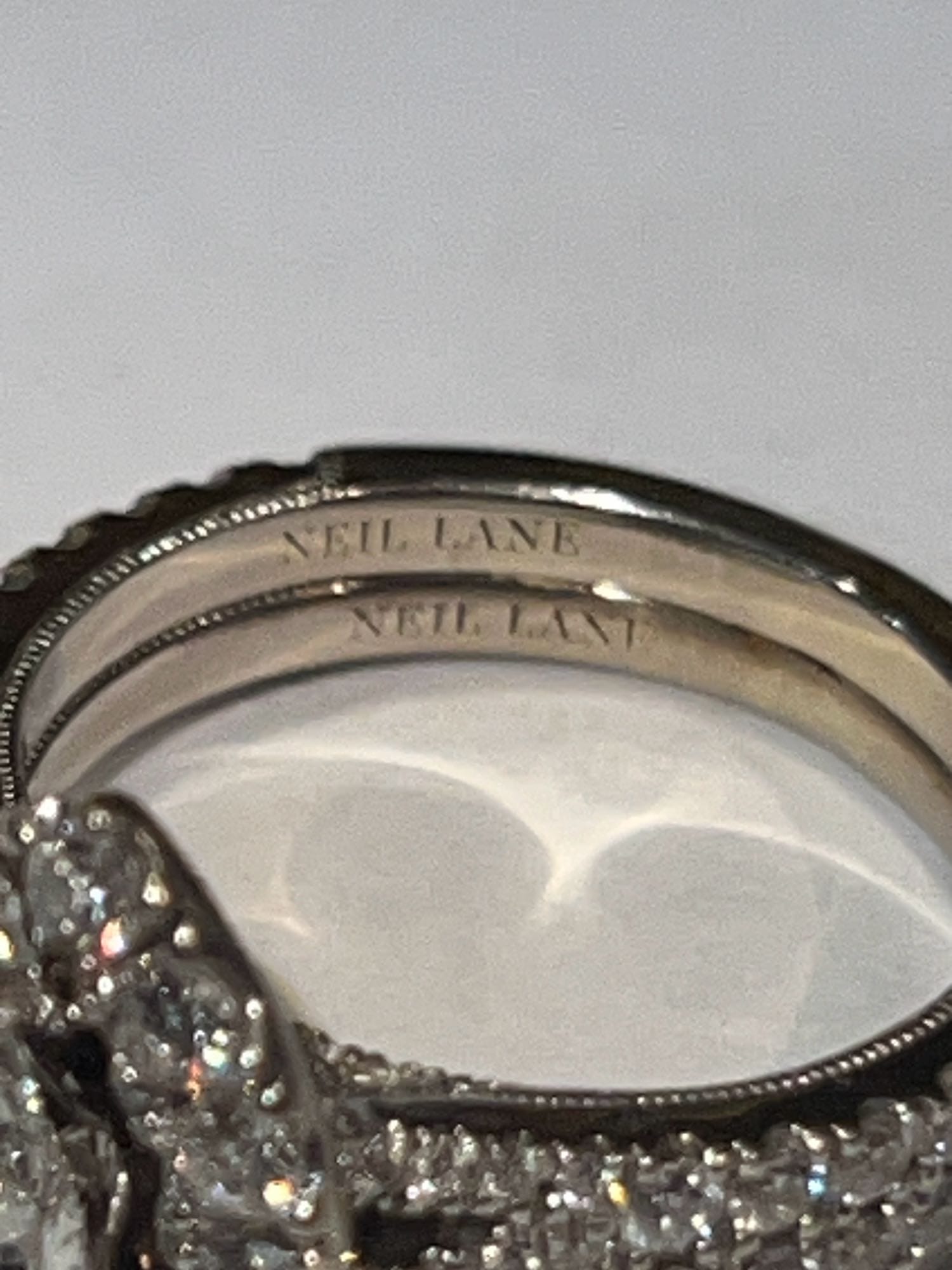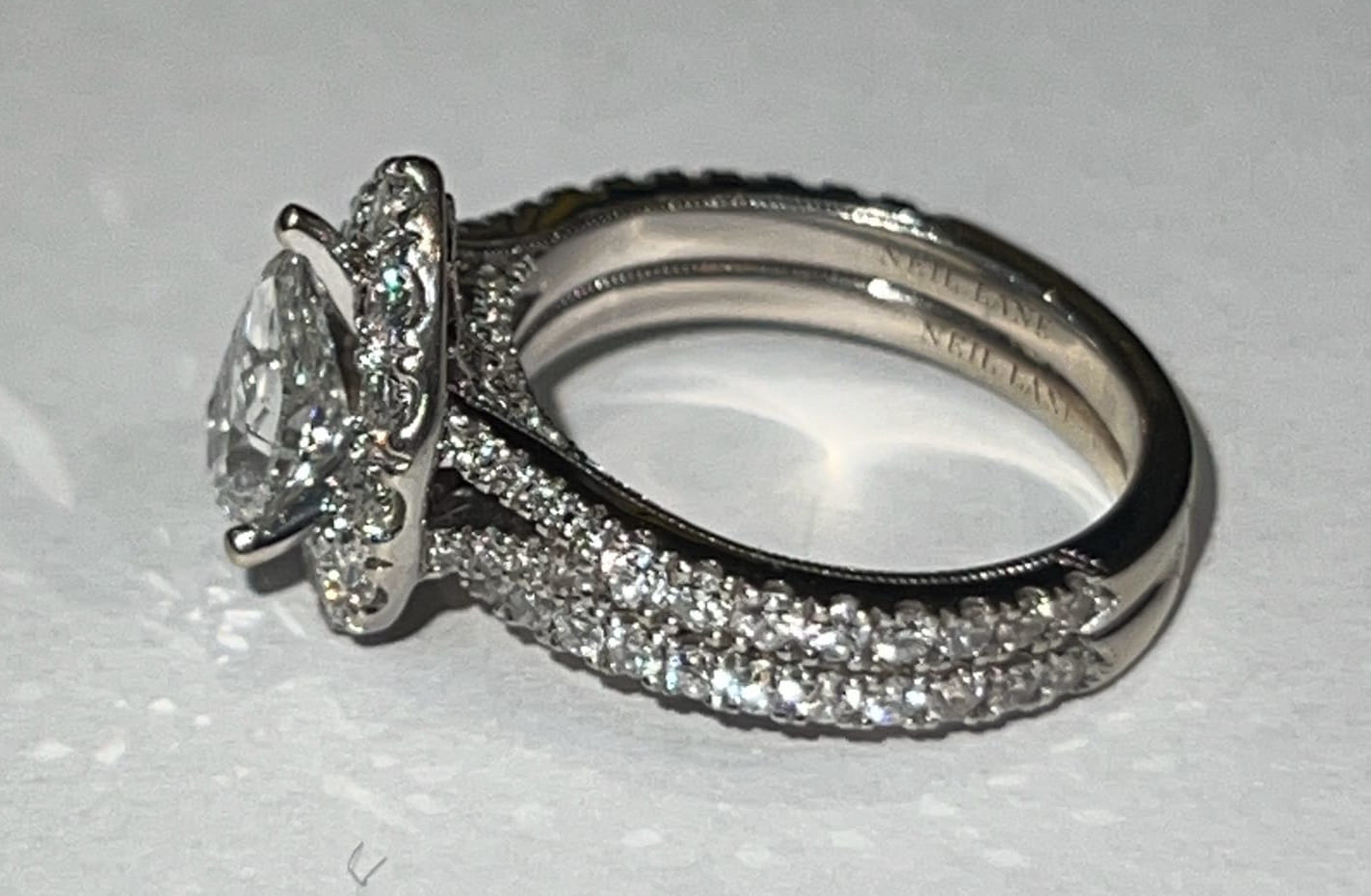 1 Lady’s 14kt white gold Neil Lane diamond bridal set, soldered together, approximately 1ct center pear cut diamond, clarity S12, body color H-1, with approximately 1.37 ct of diamonds surrounding the center diamond and on the wedding band