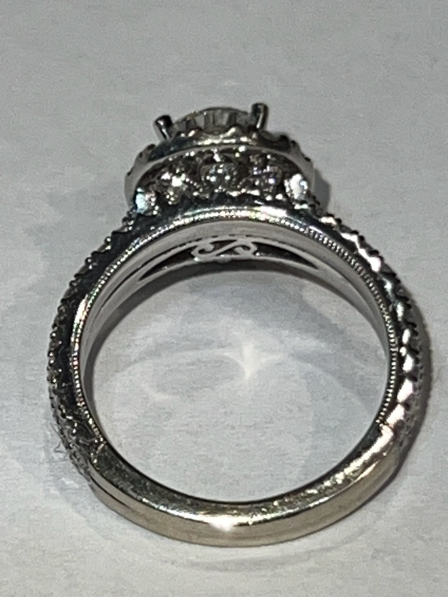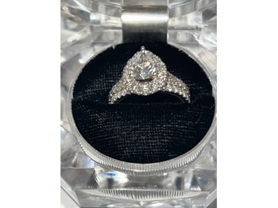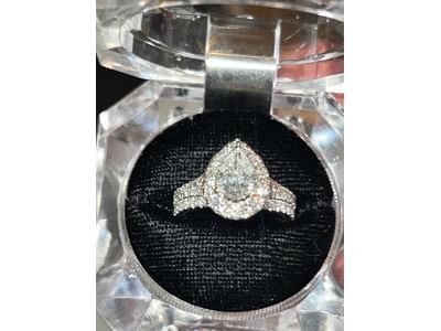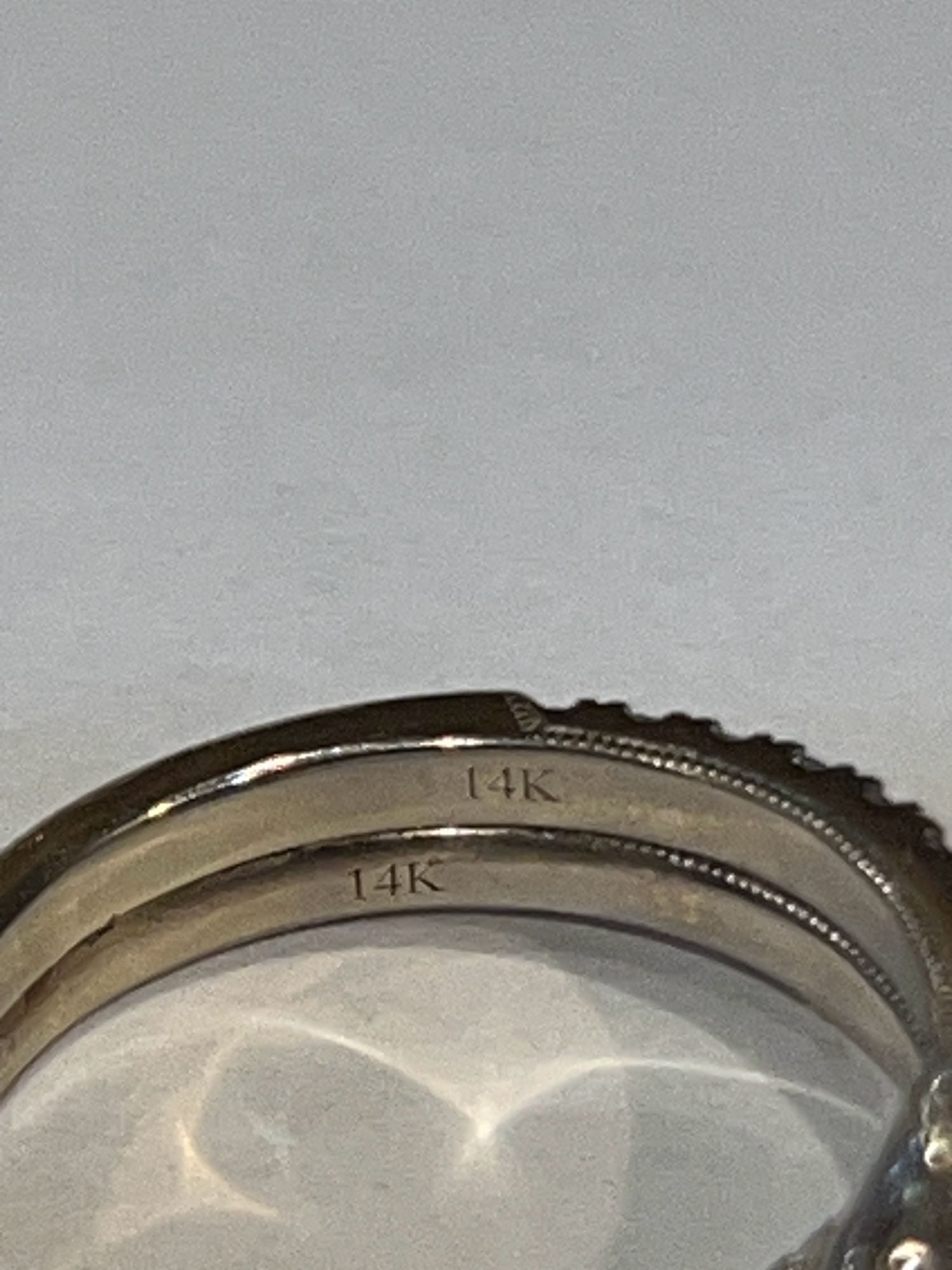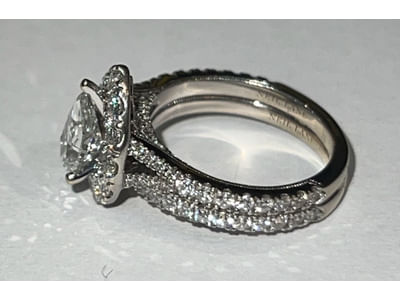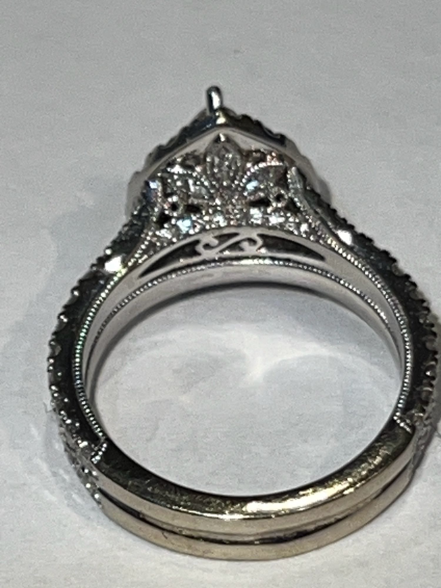 1 Lady’s 14kt white gold Neil Lane diamond bridal set, soldered together, approximately 1ct center pear cut diamond, clarity S12, body color H-1, with approximately 1.37 ct of diamonds surrounding the center diamond and on the wedding band
