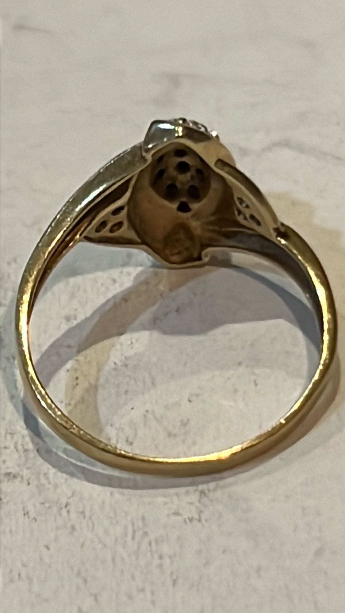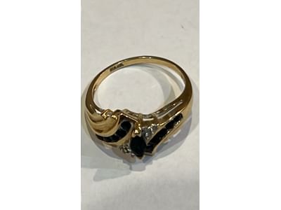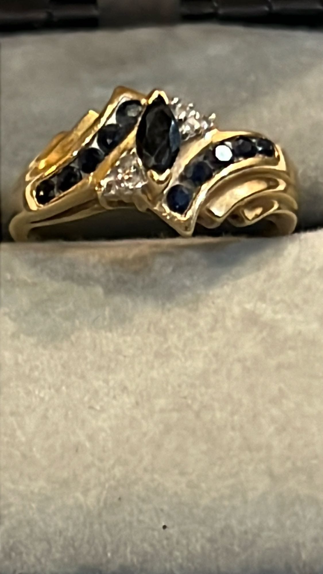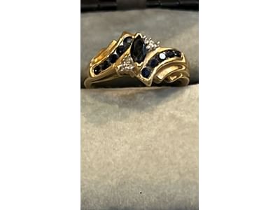 5 10K Gold Marquis Blue Sapphire Ring,10 round sapphires and 6 diamond chips ,size 7.5