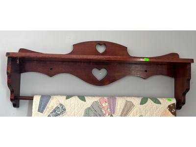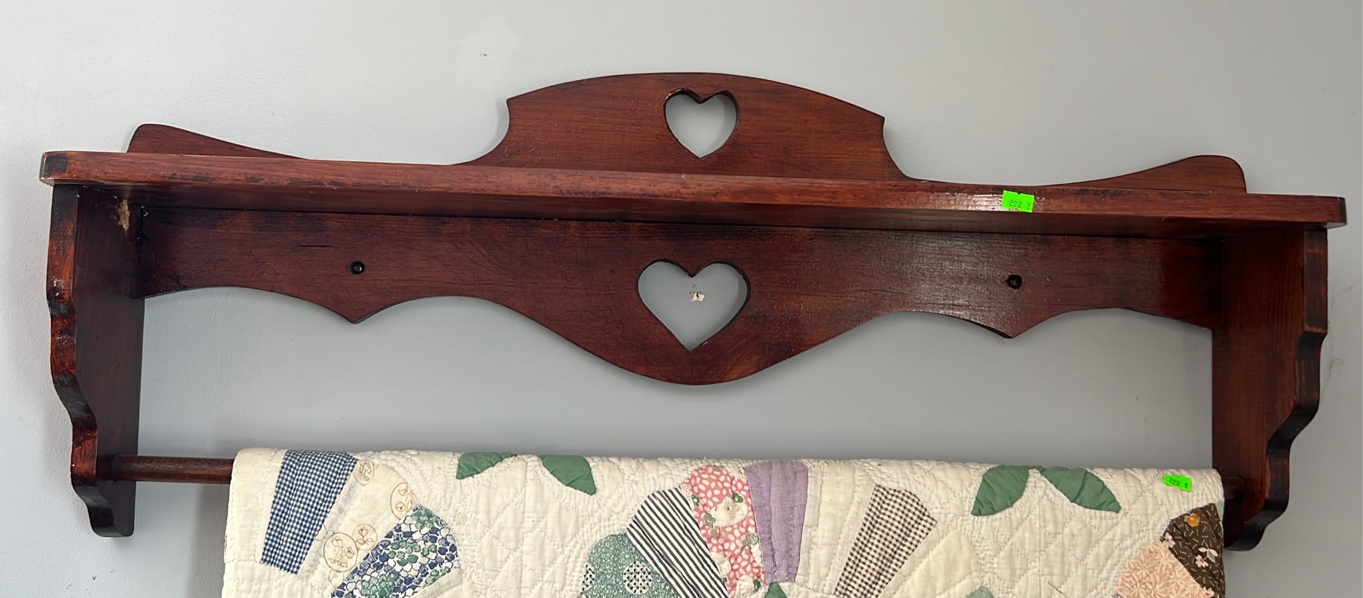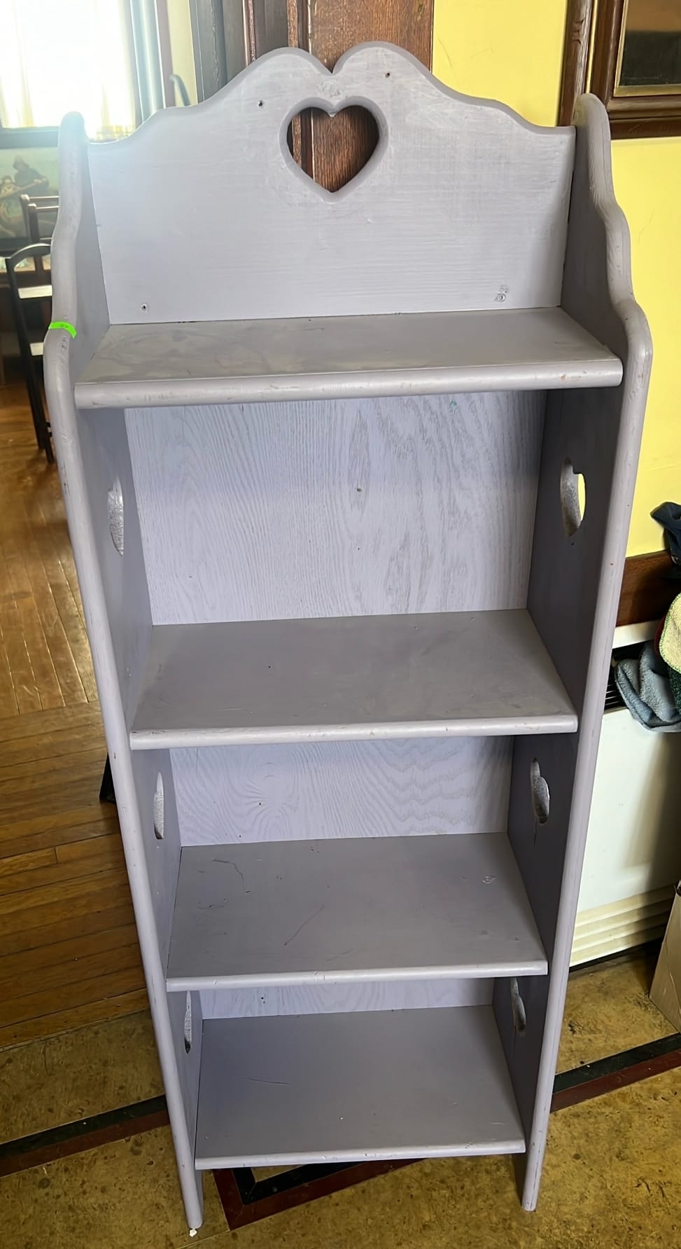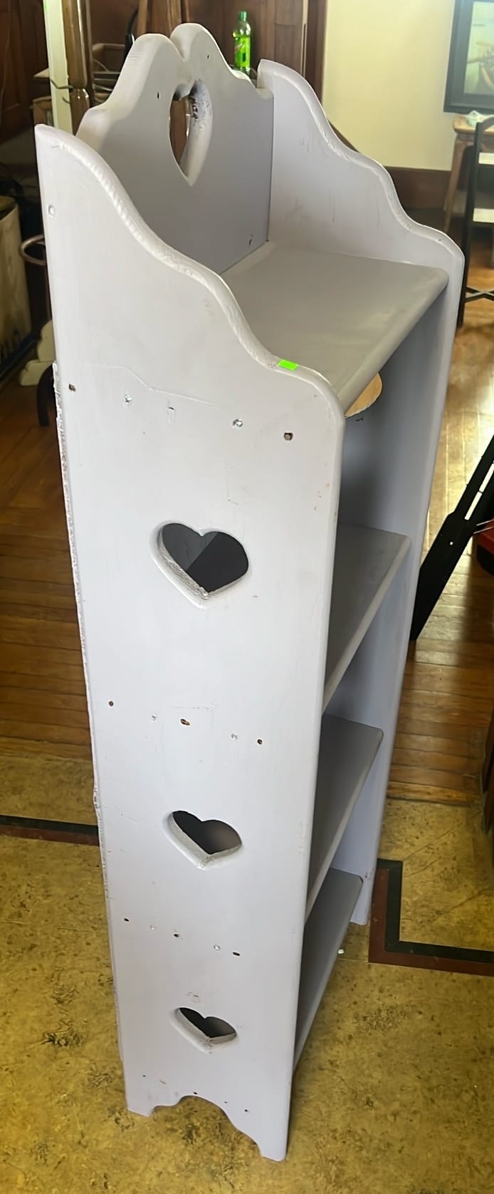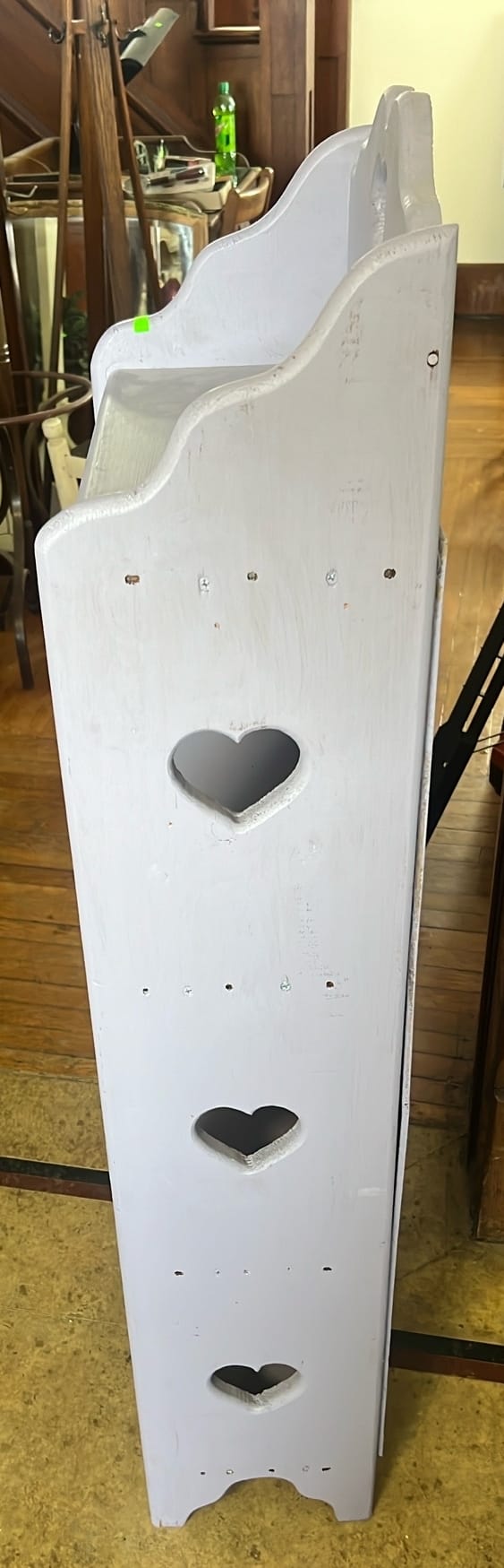 27 Painted wood shelf with heart cut outs 9.25”x 17.5”x 49”