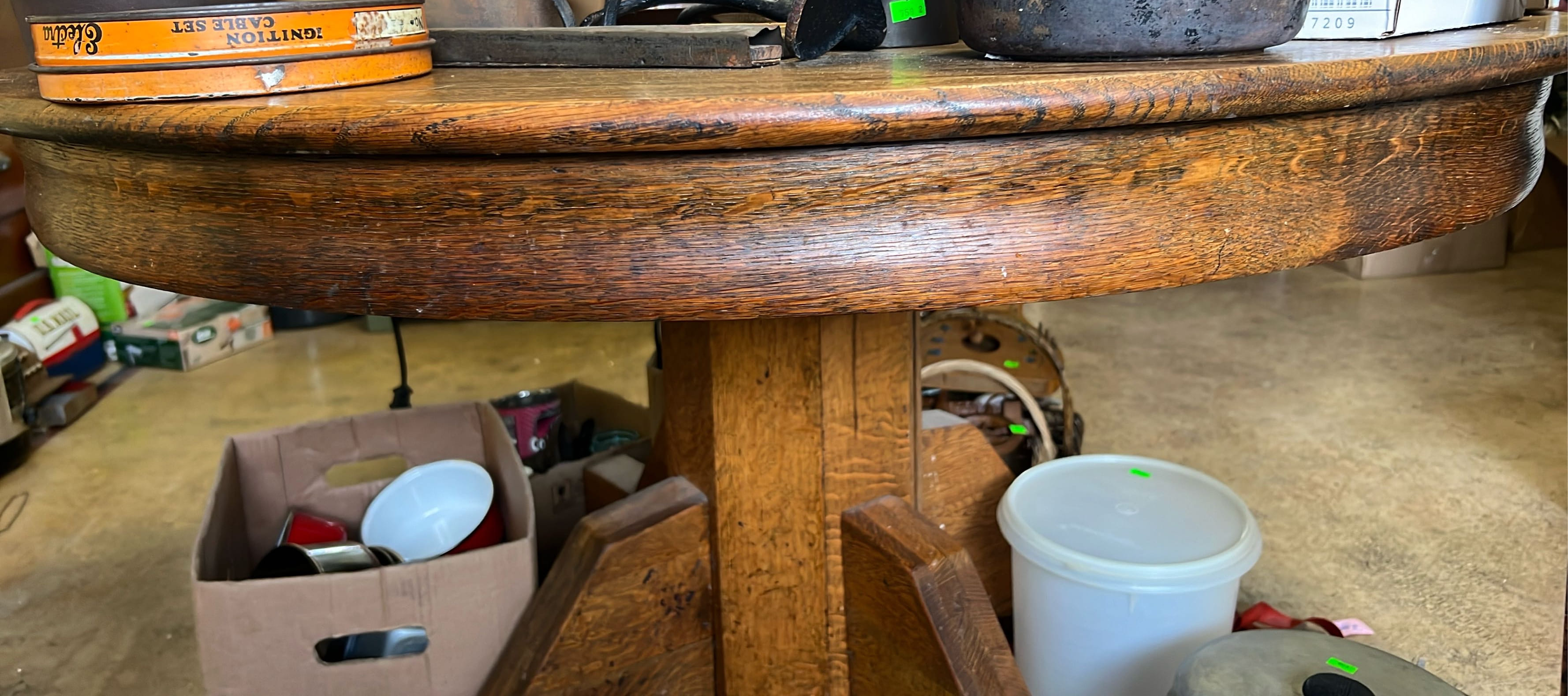 28 Oak Pedestal Kitchen Table on rollers 48” (contents not included)