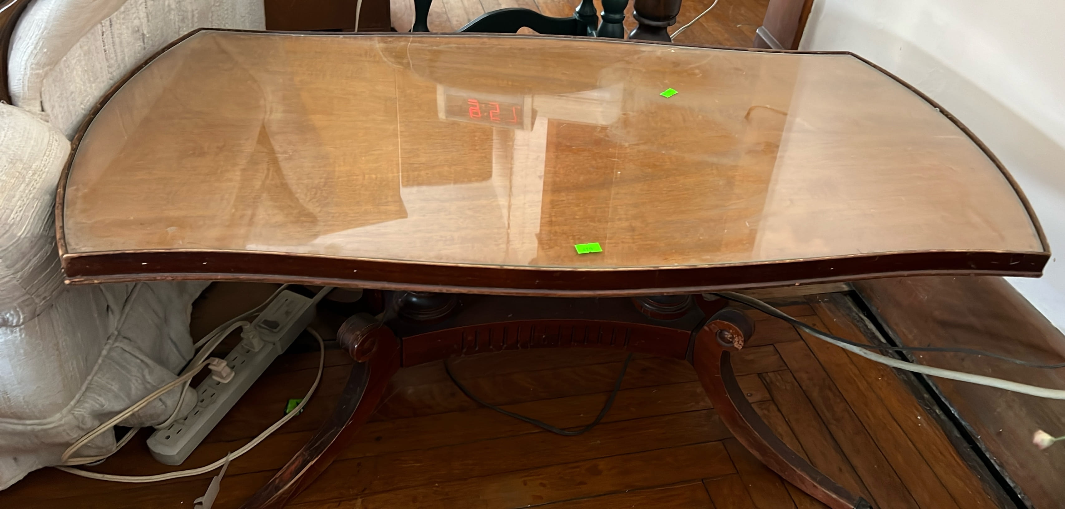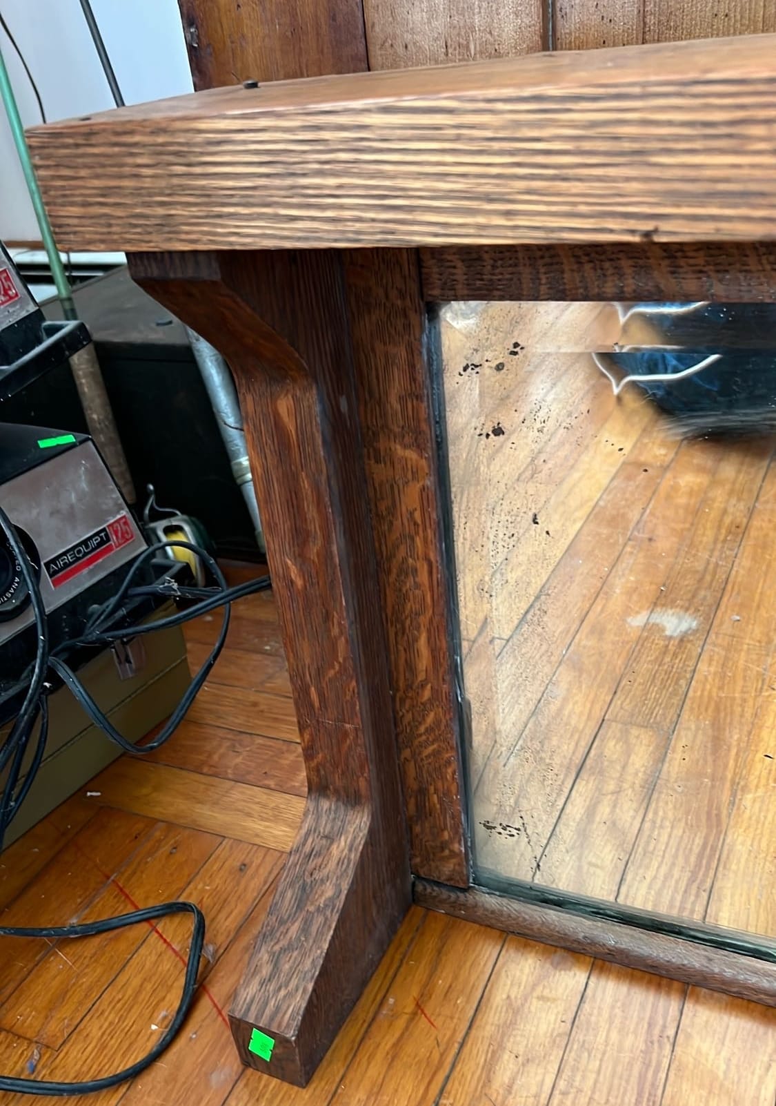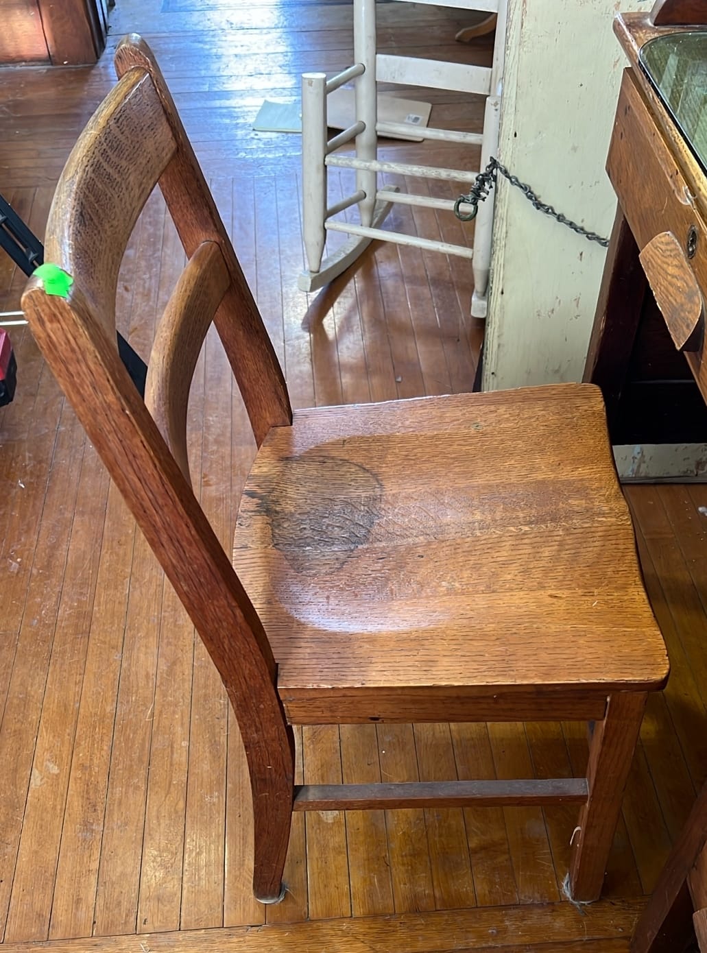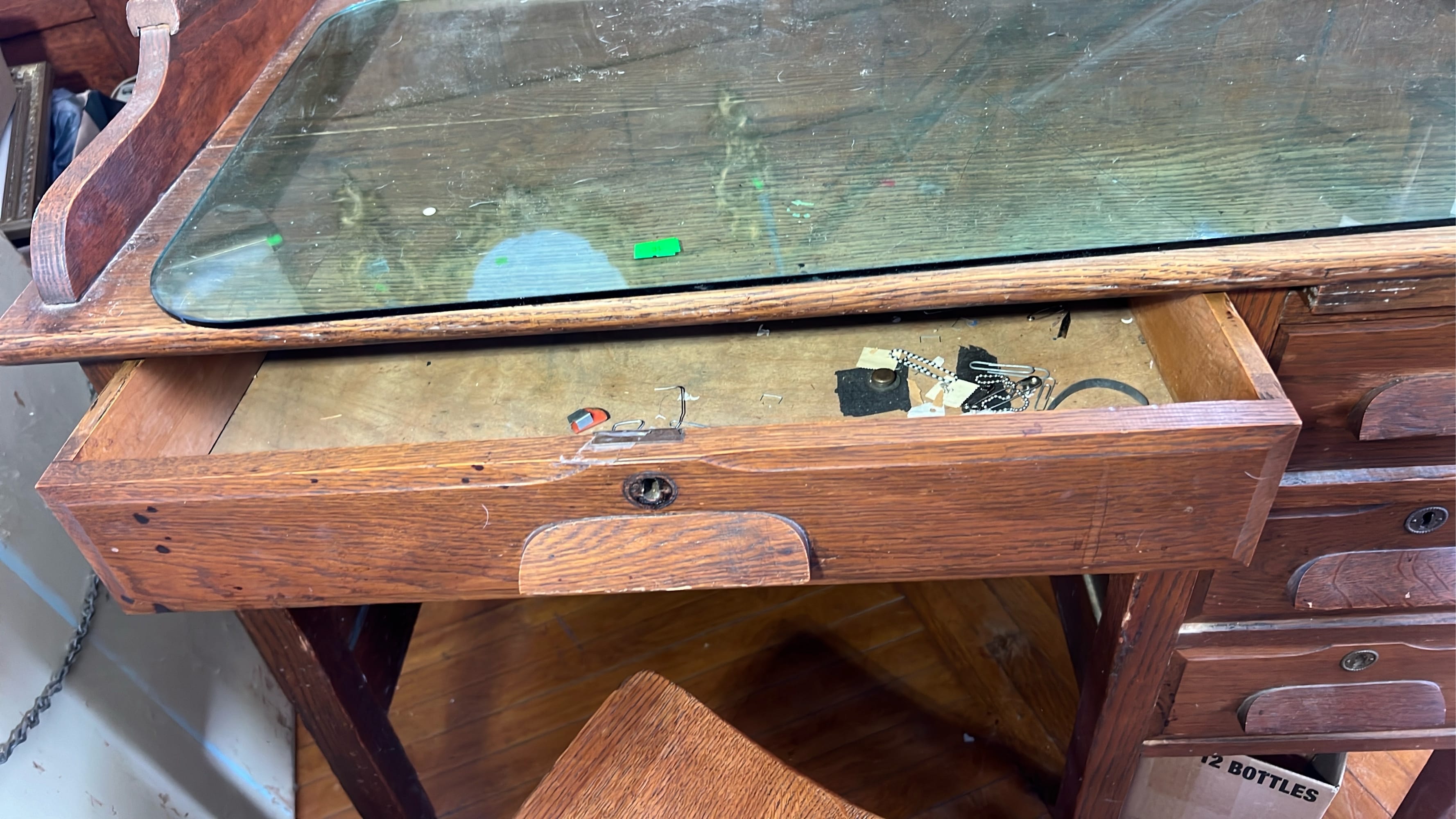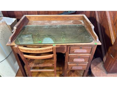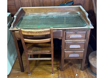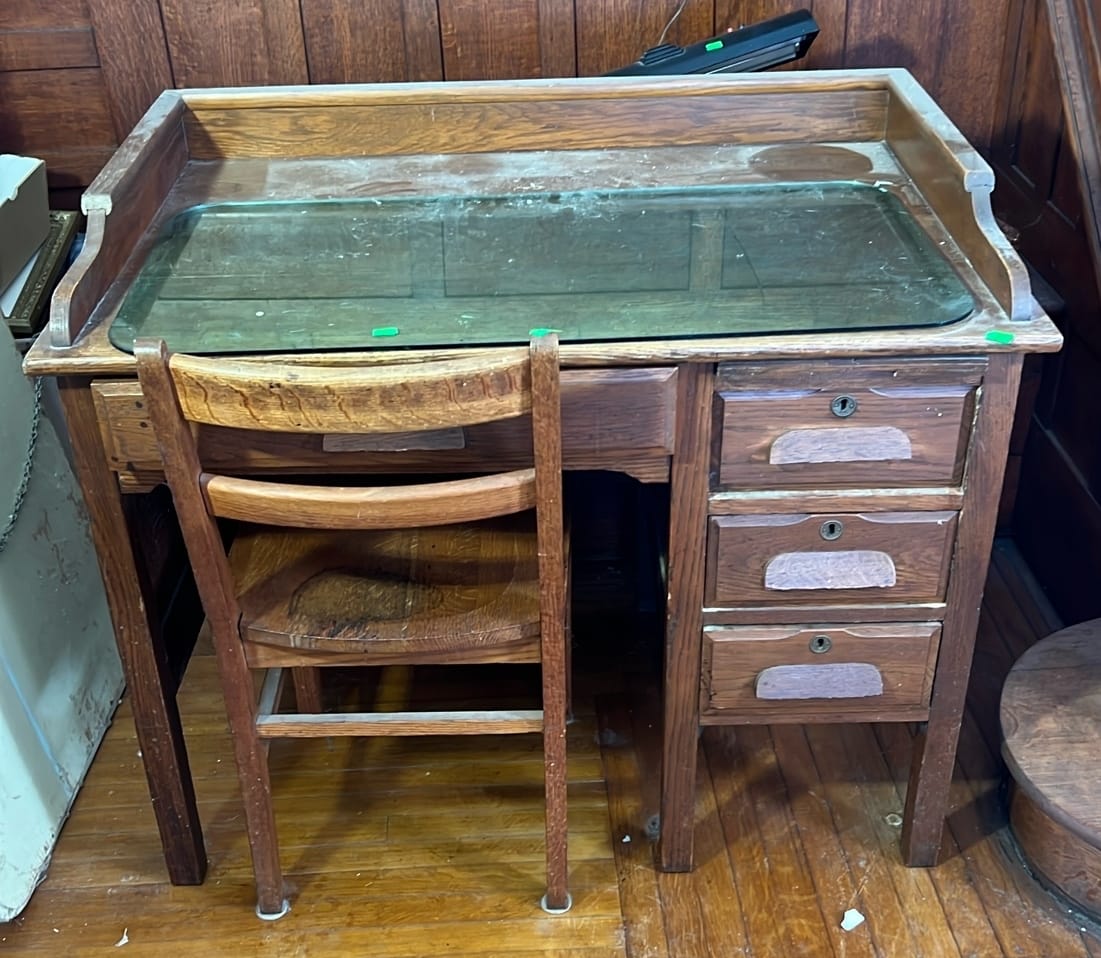 31 Oak Office Desk 41.25” x33.5”x27.25”• Oak Chair 16.75”W Seat ht. 18” • & Protective Glass 35.5”x18.5”