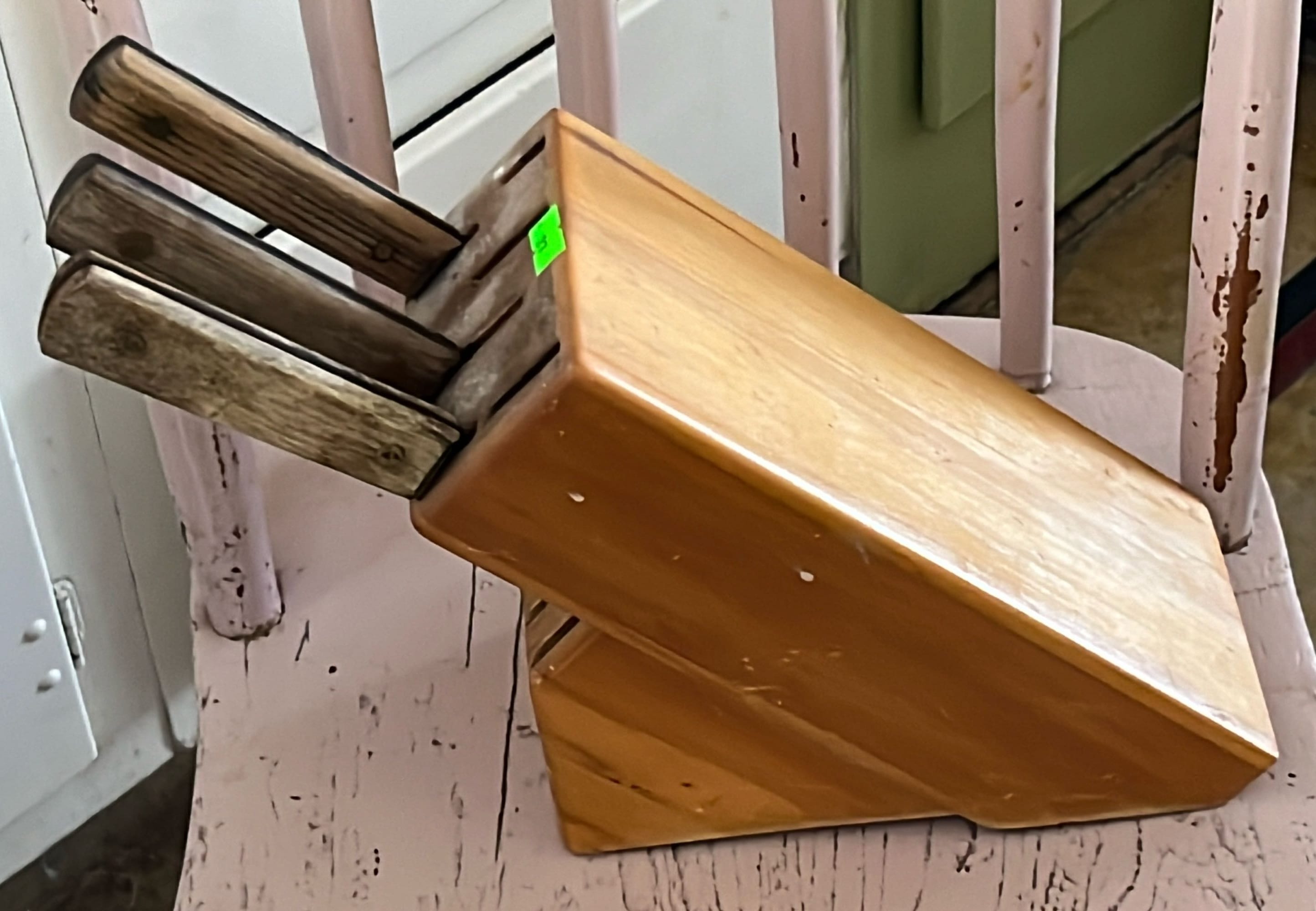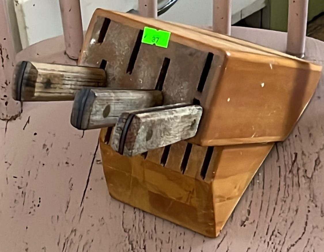 37 Wood Knife Block with three knives 4.75”x8”x11”