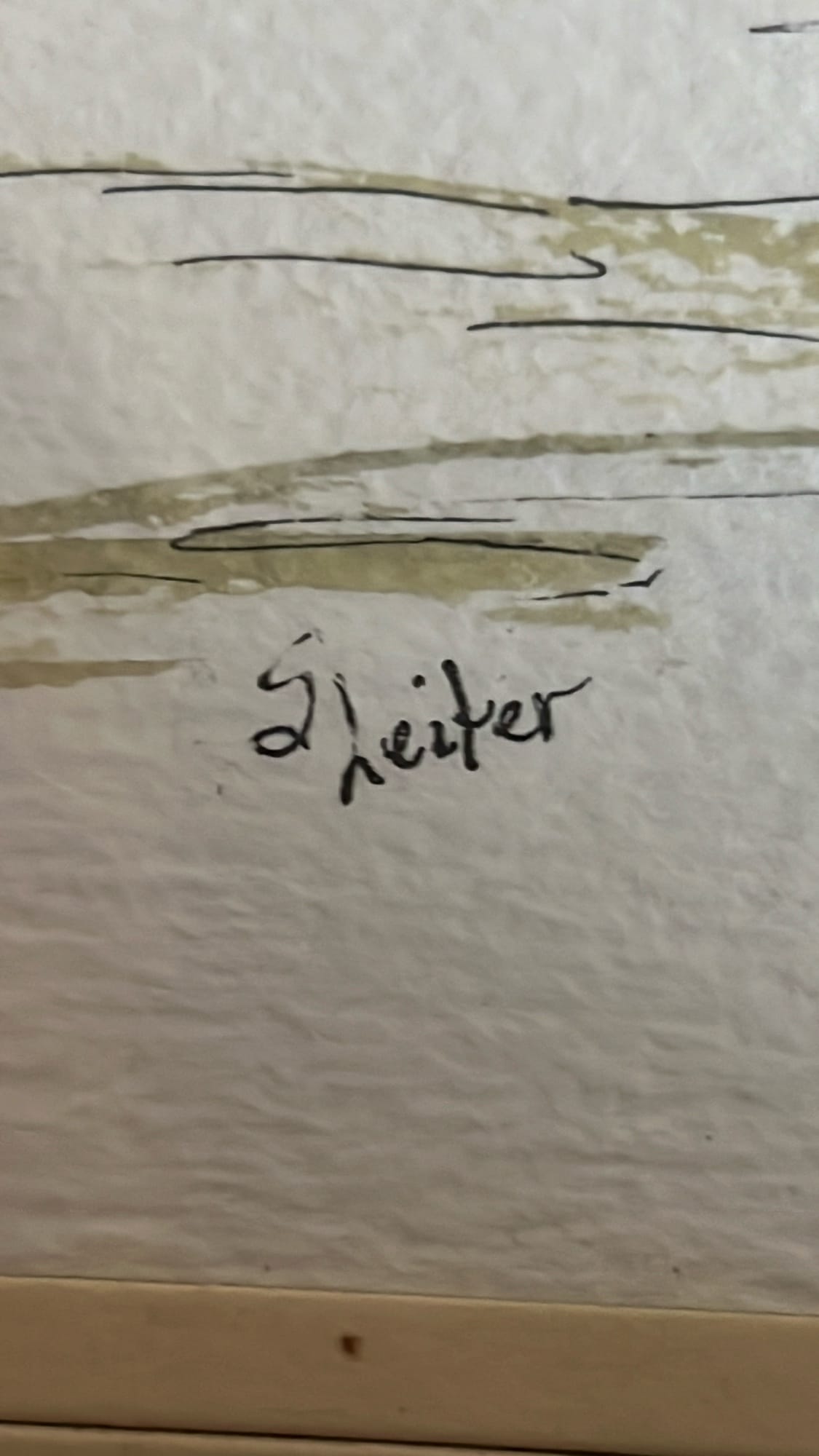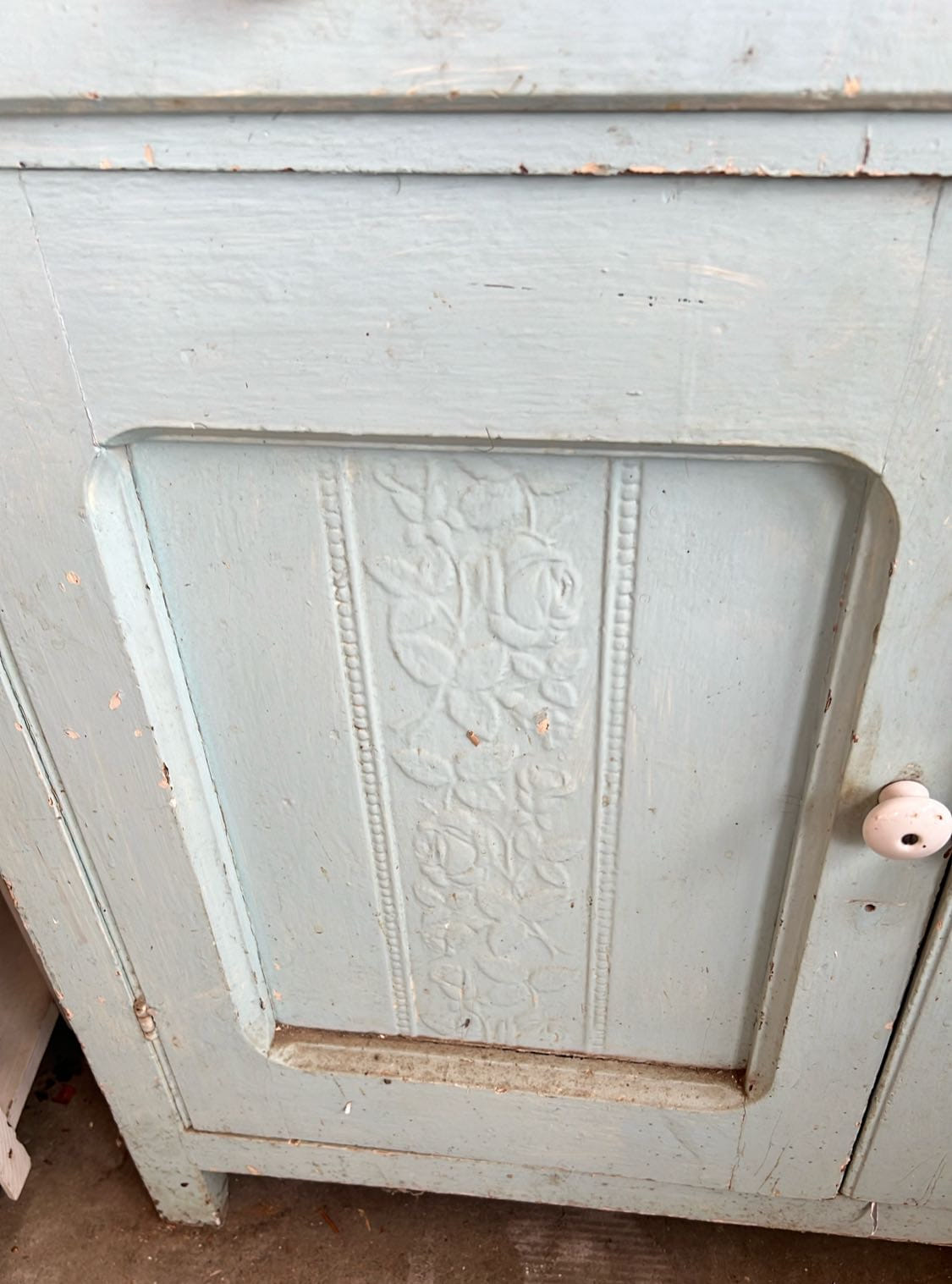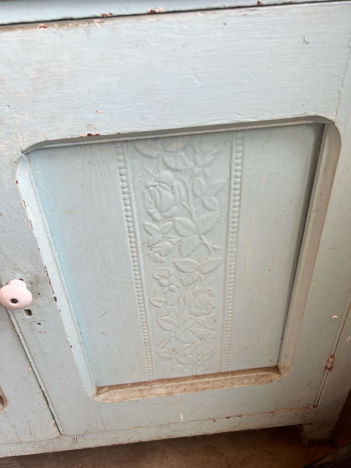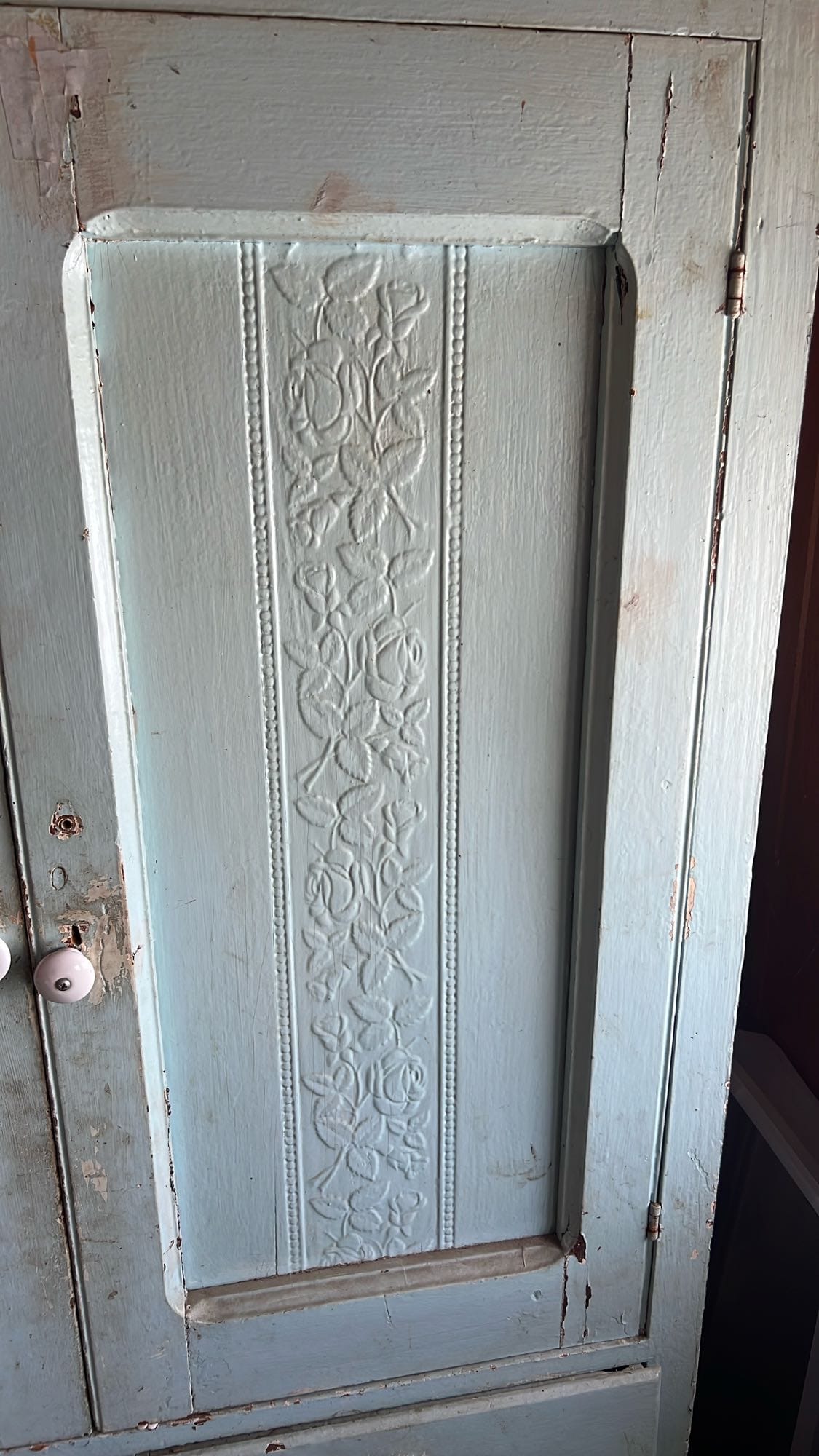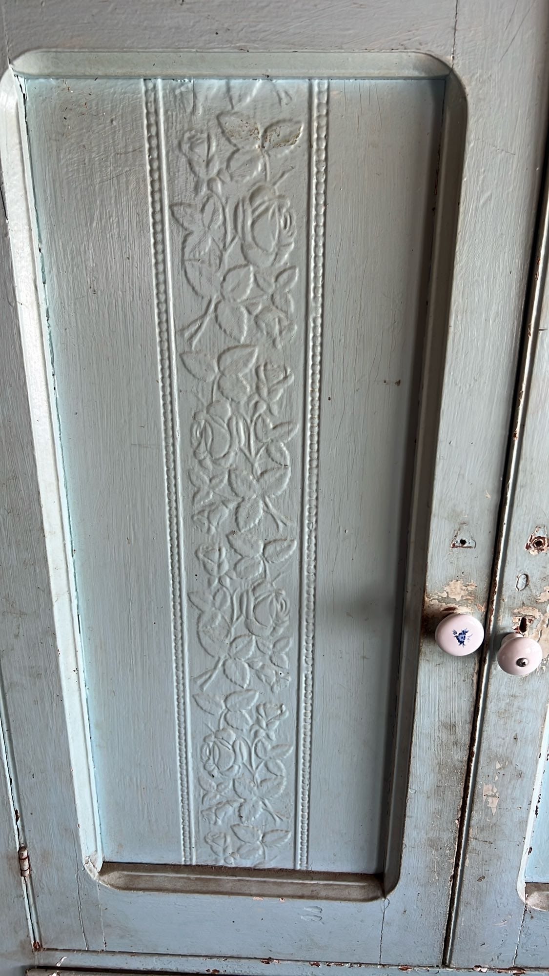 41 Painted kitchen Cabinet with stamped patterns on doors, 16.5”x38.5”x72”, contents not included
