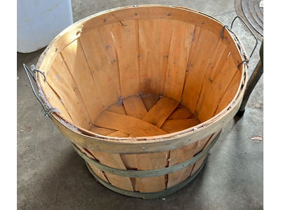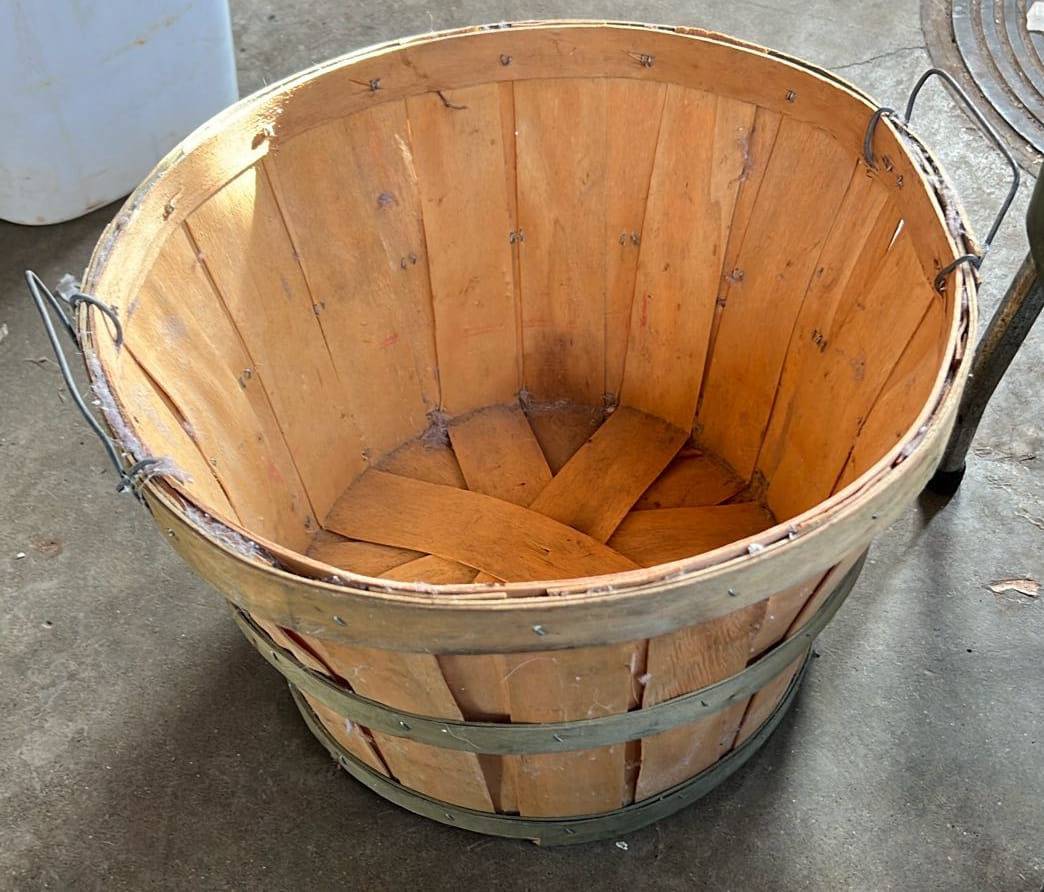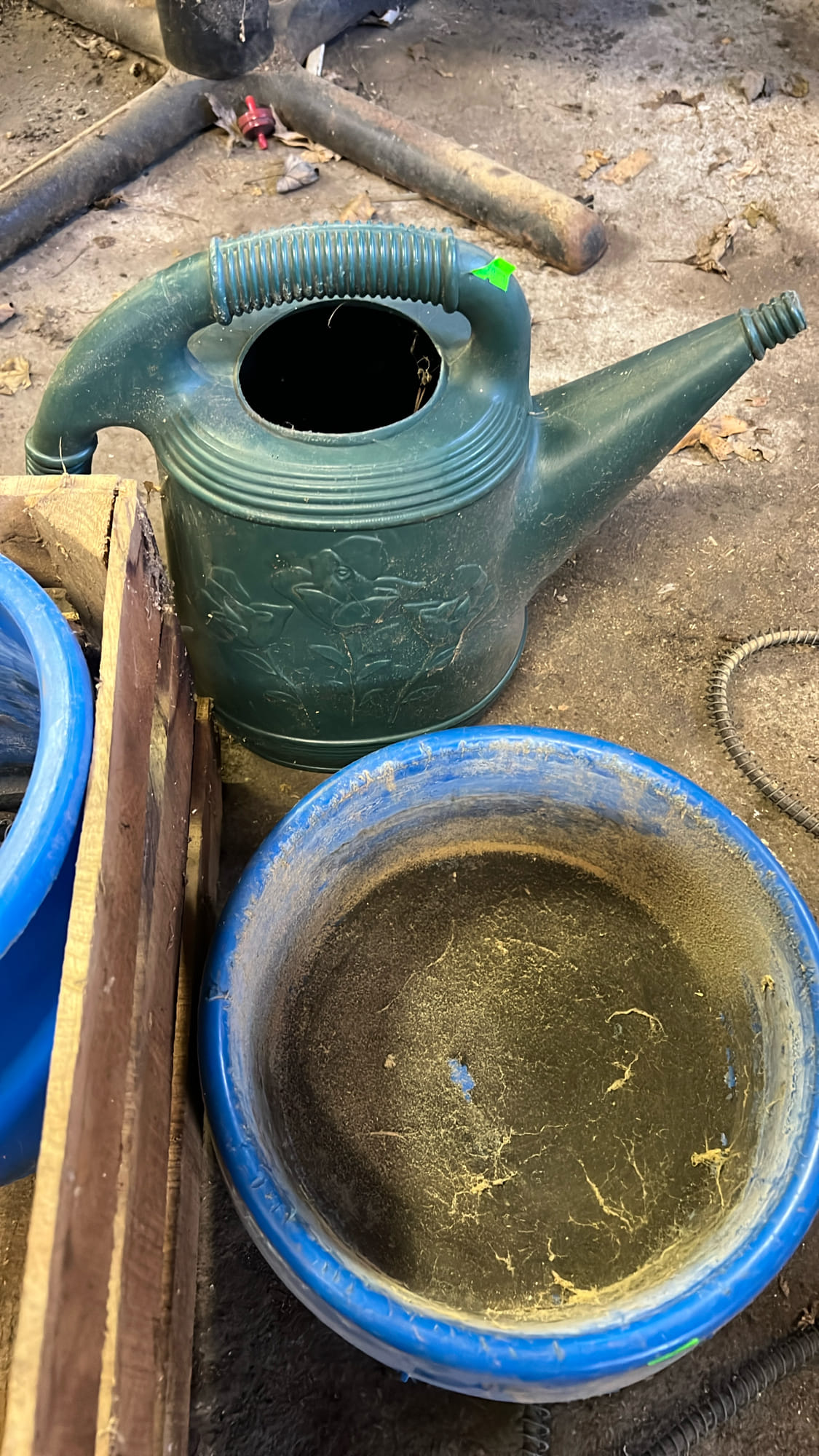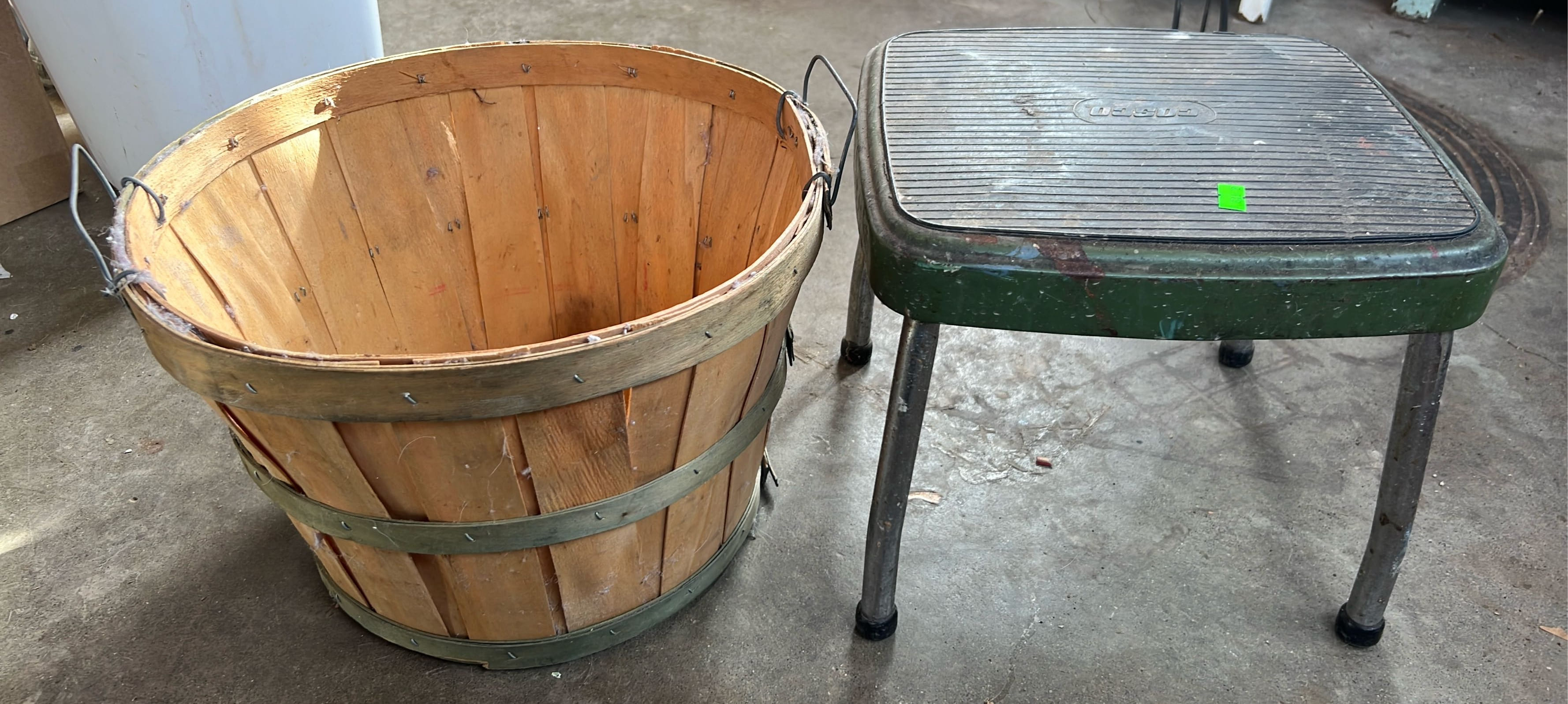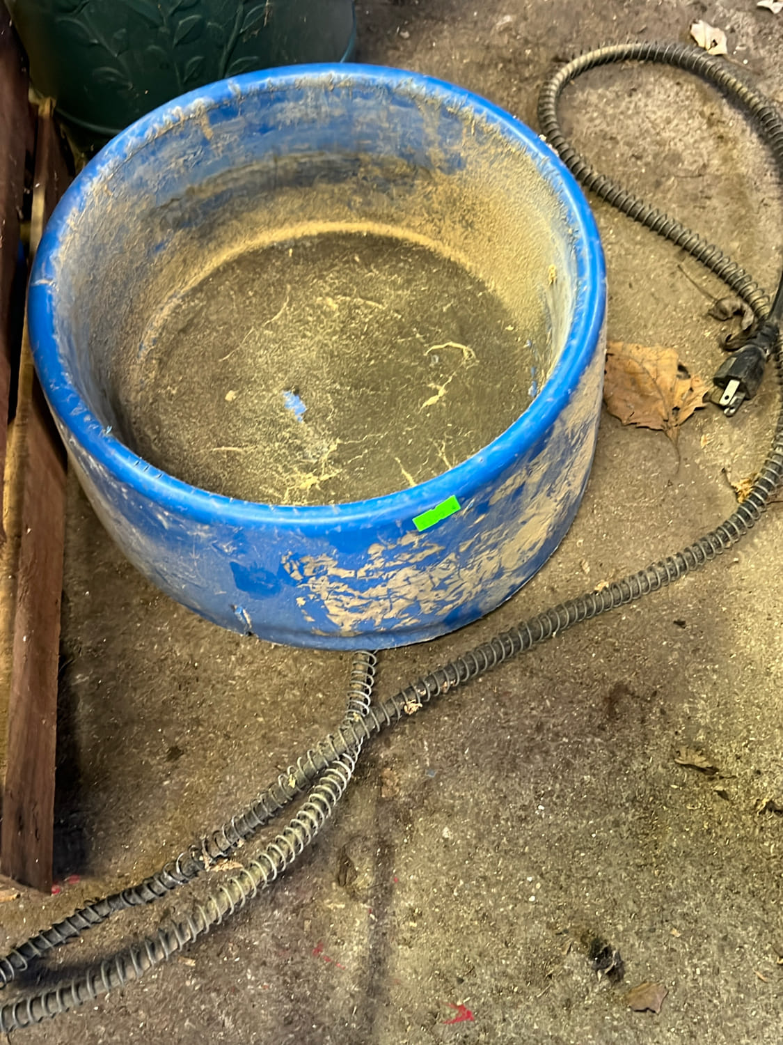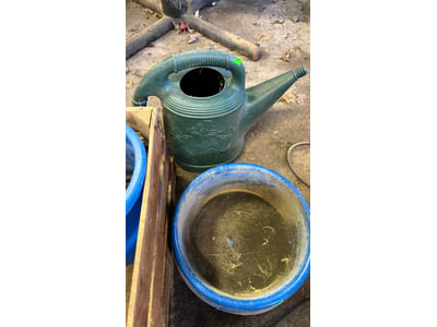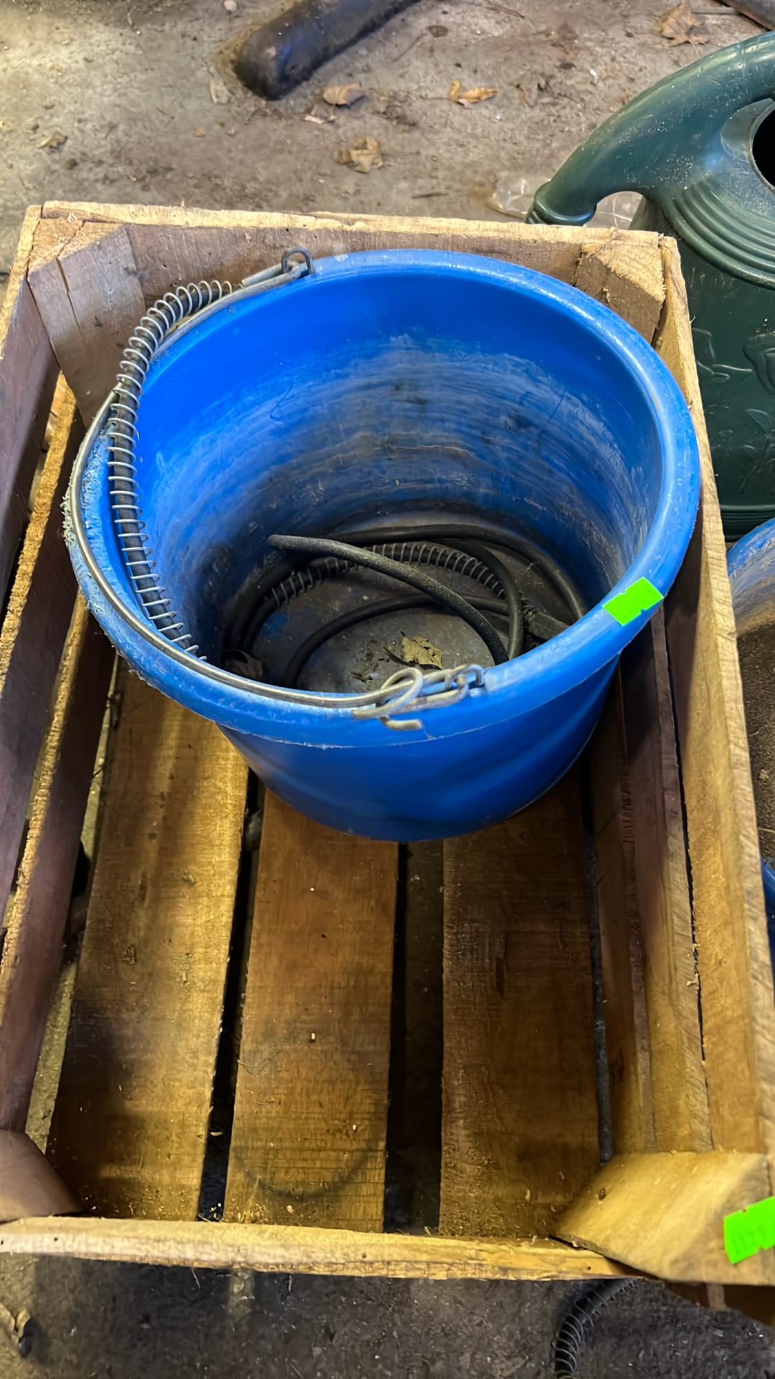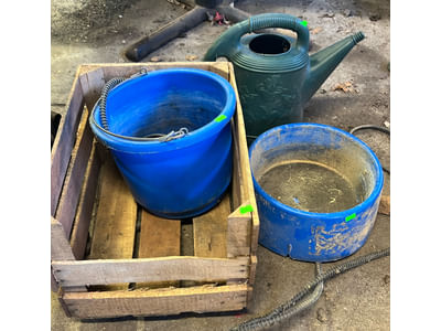 1129 Electric Water Bucket 10” • Electric Animal Pan 11” • Plastic Watering Can • Wood Fruit Crate missing one slat 19.5”x10”x13.25”