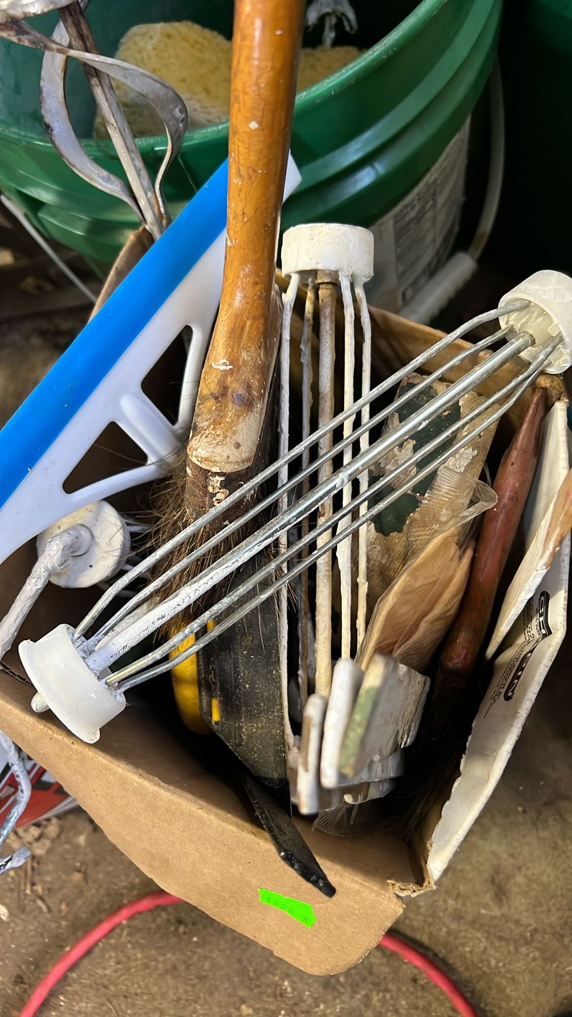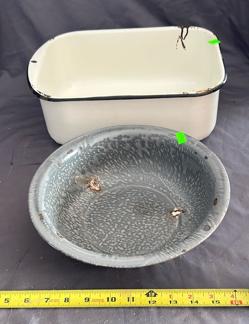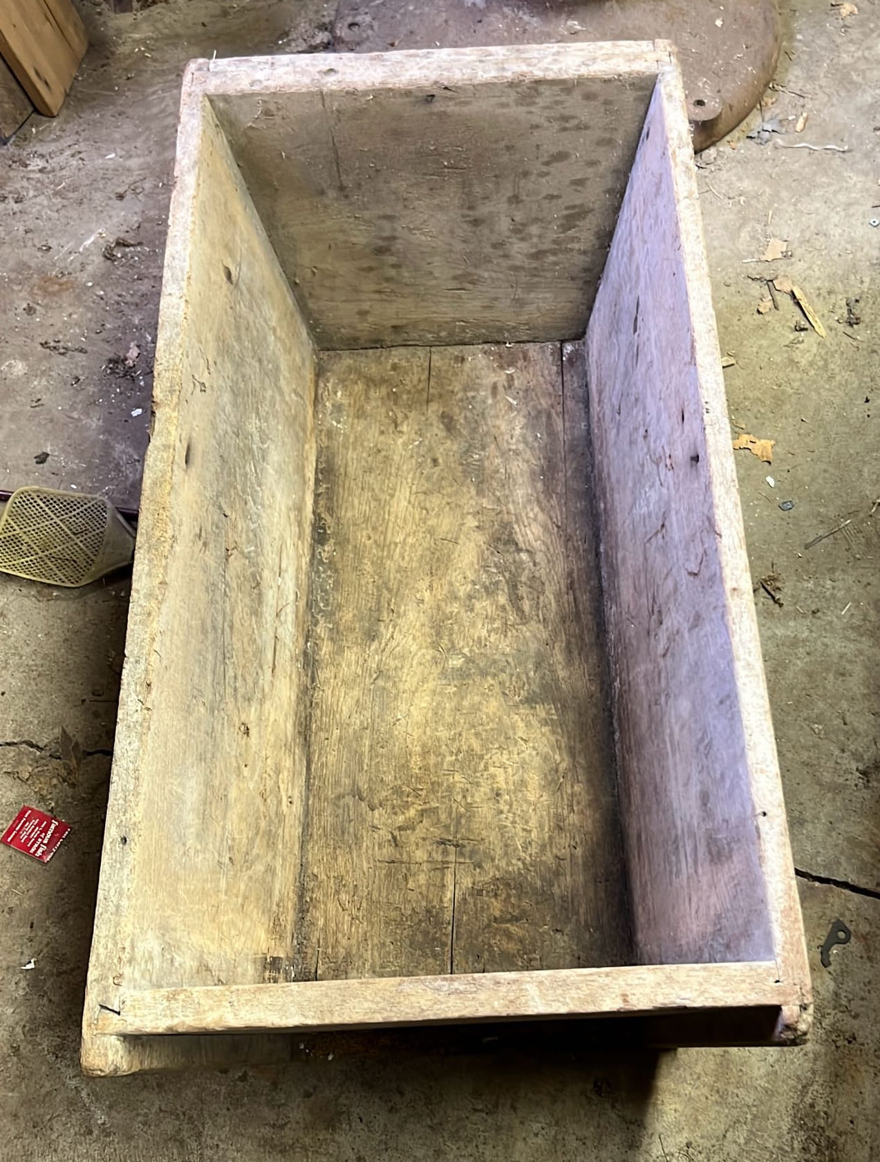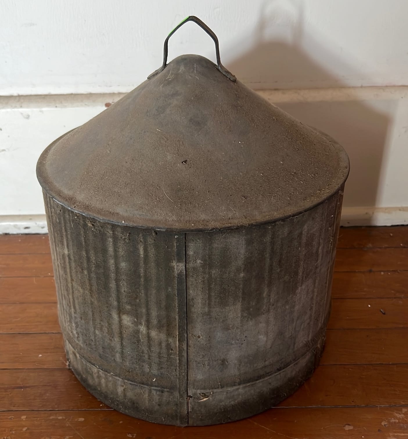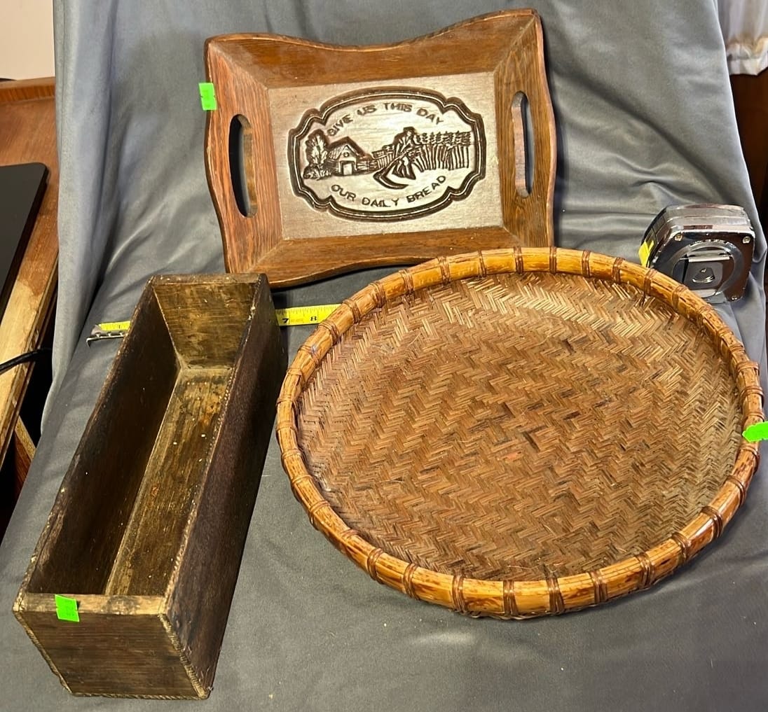 1129 Electric Water Bucket 10” • Electric Animal Pan 11” • Plastic Watering Can • Wood Fruit Crate missing one slat 19.5”x10”x13.25”