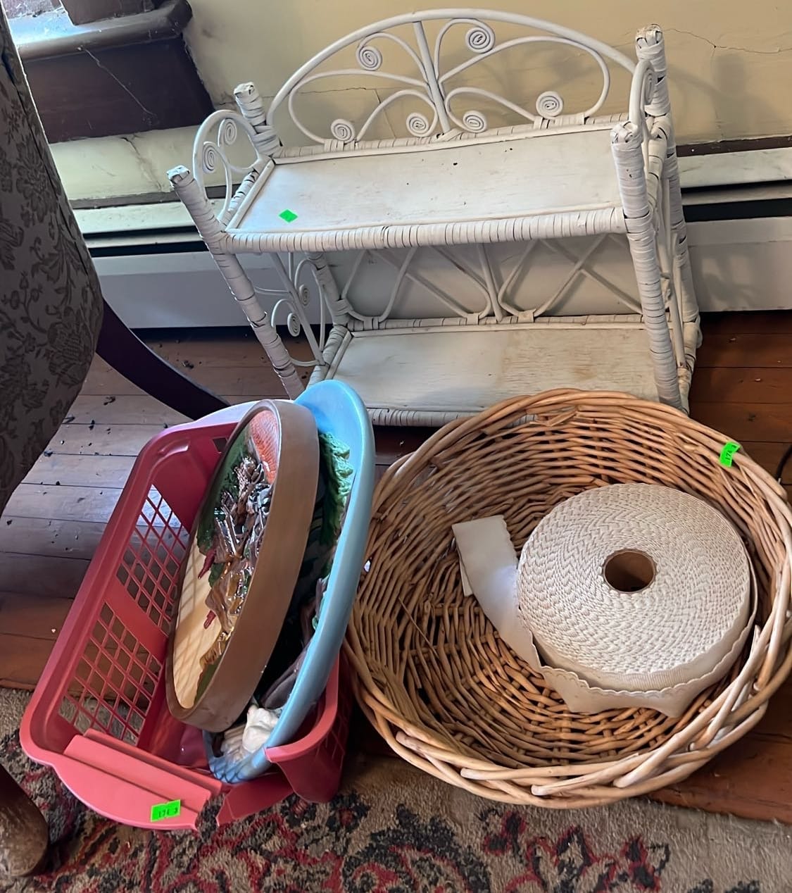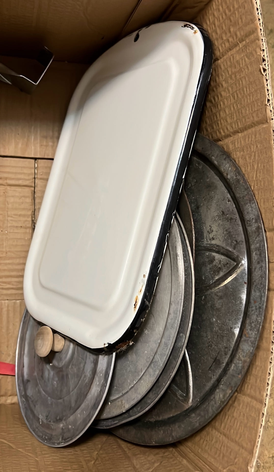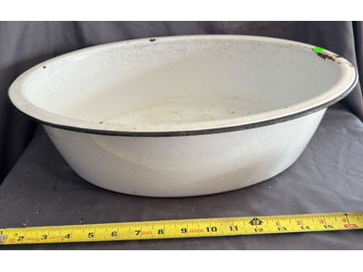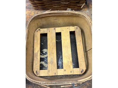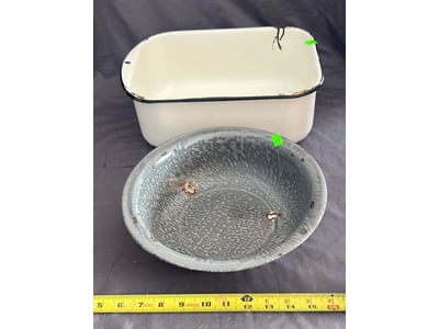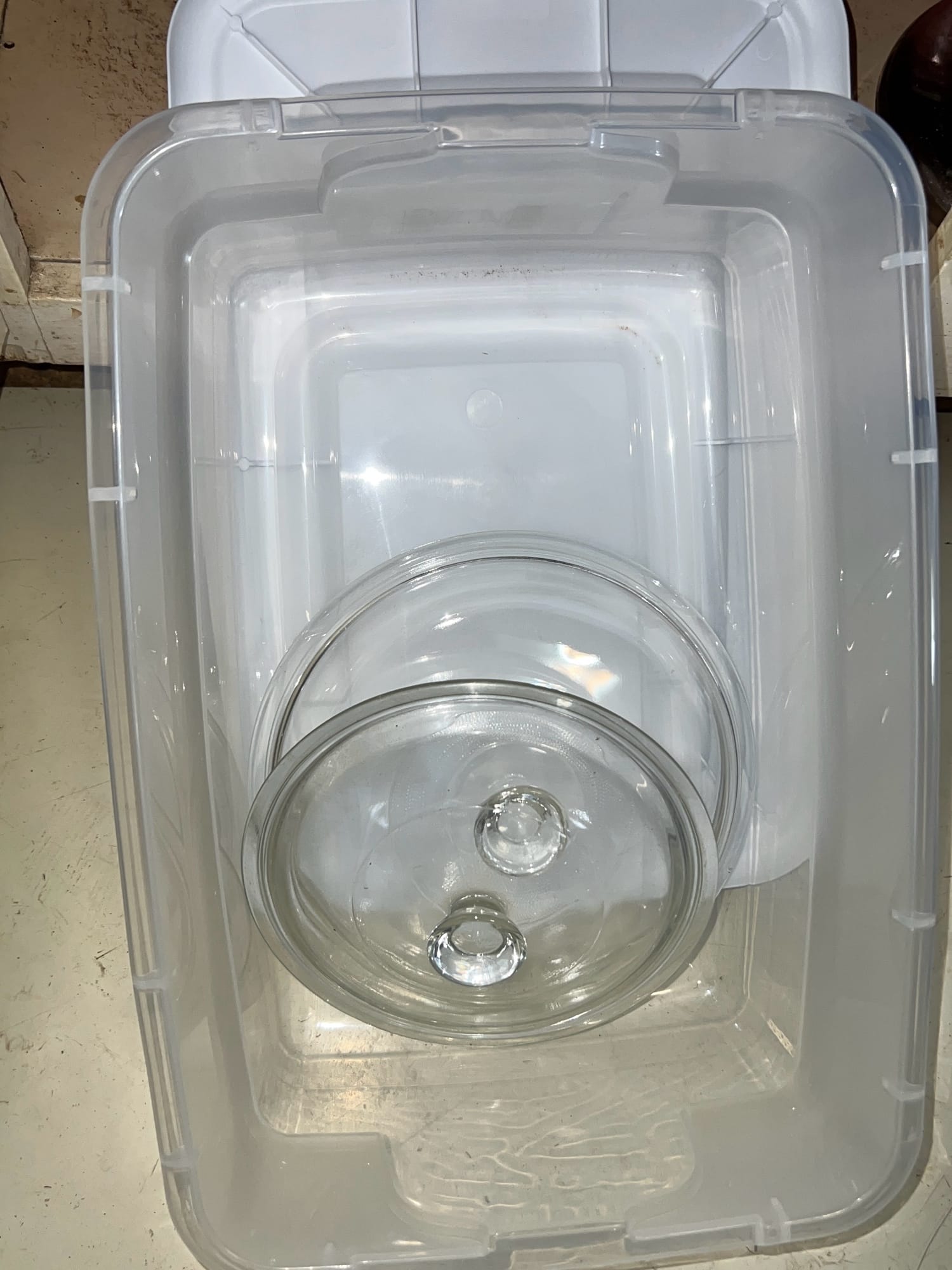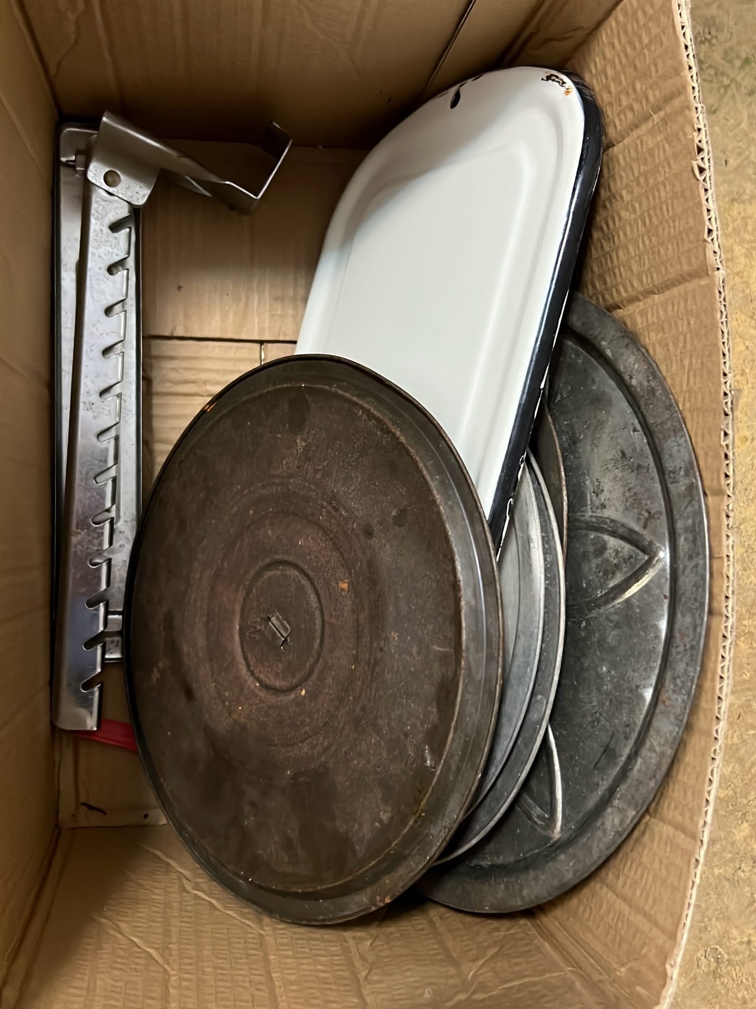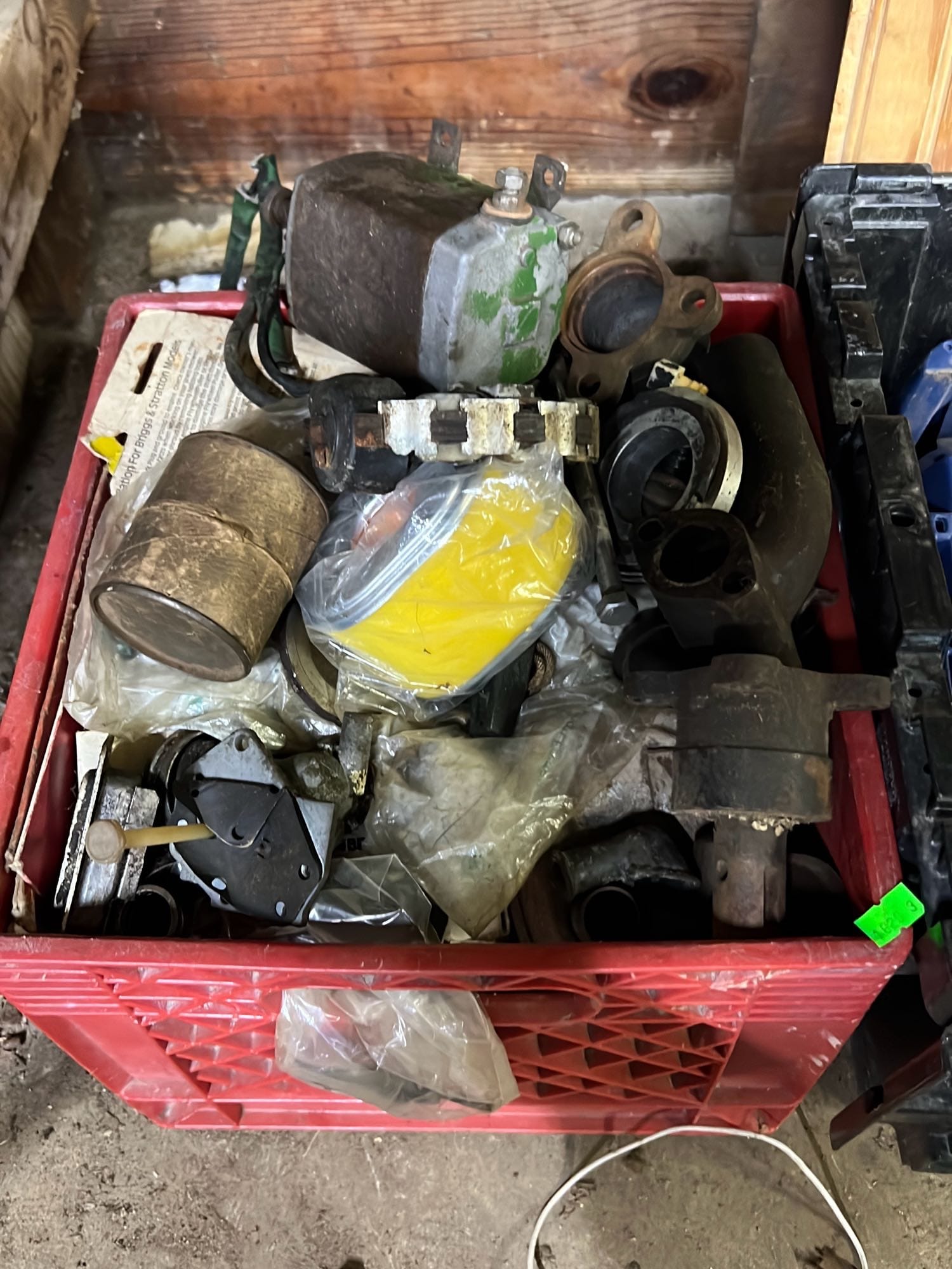 1129 Electric Water Bucket 10” • Electric Animal Pan 11” • Plastic Watering Can • Wood Fruit Crate missing one slat 19.5”x10”x13.25”