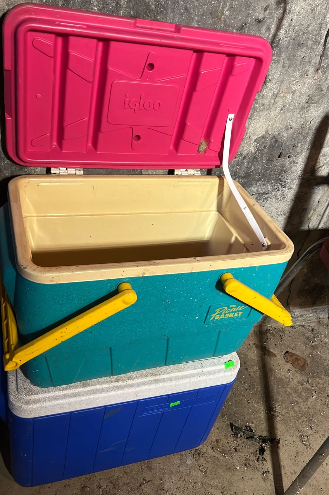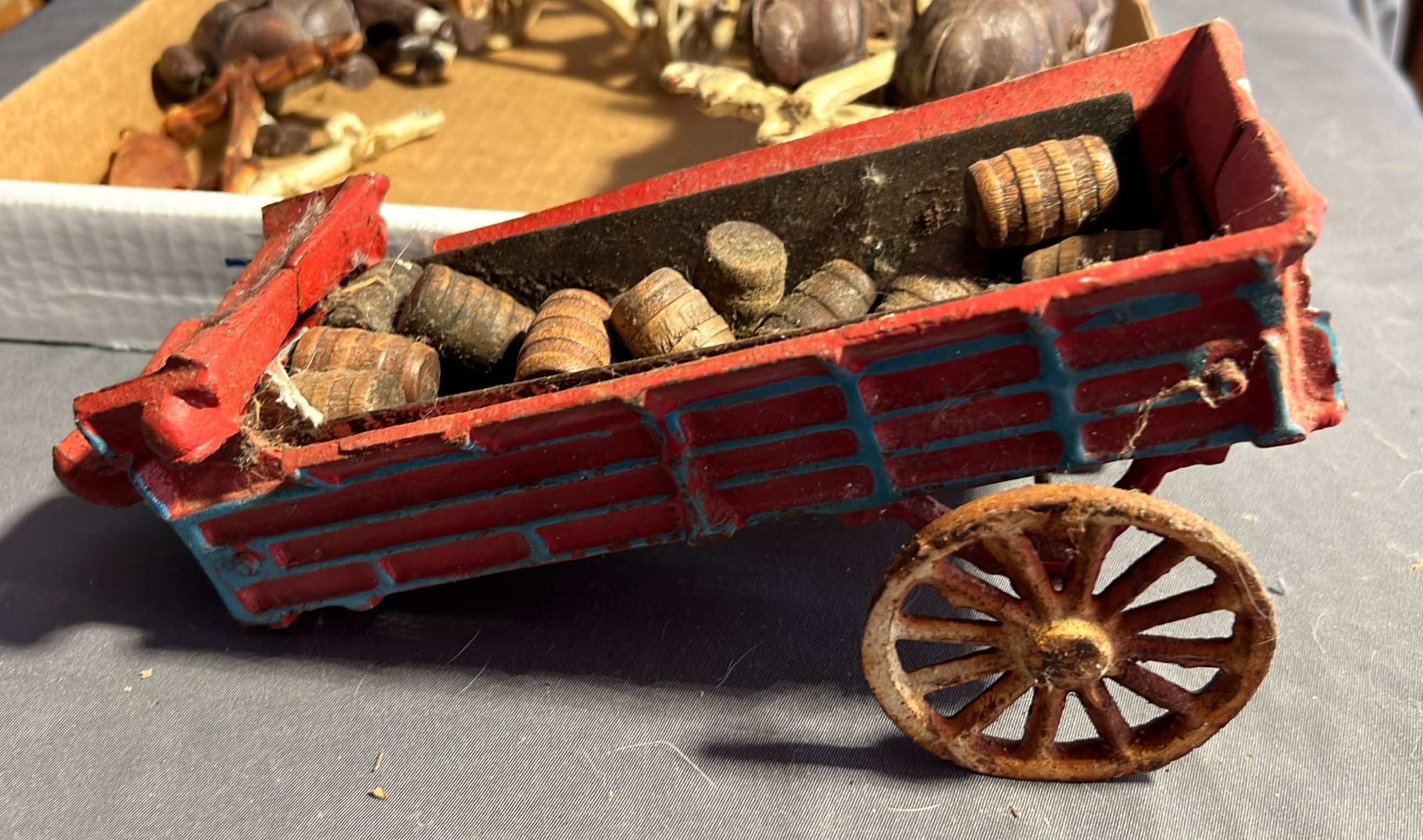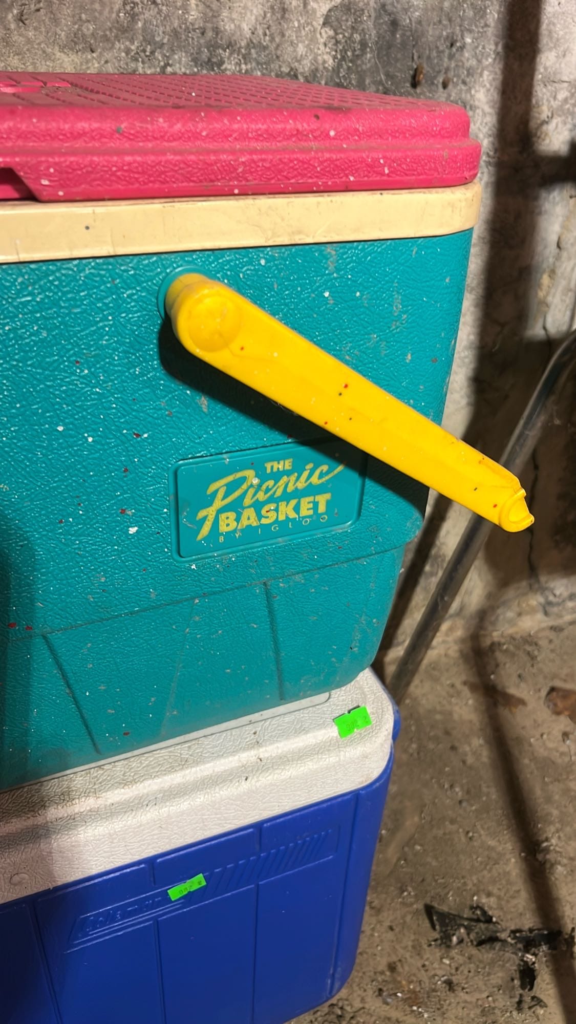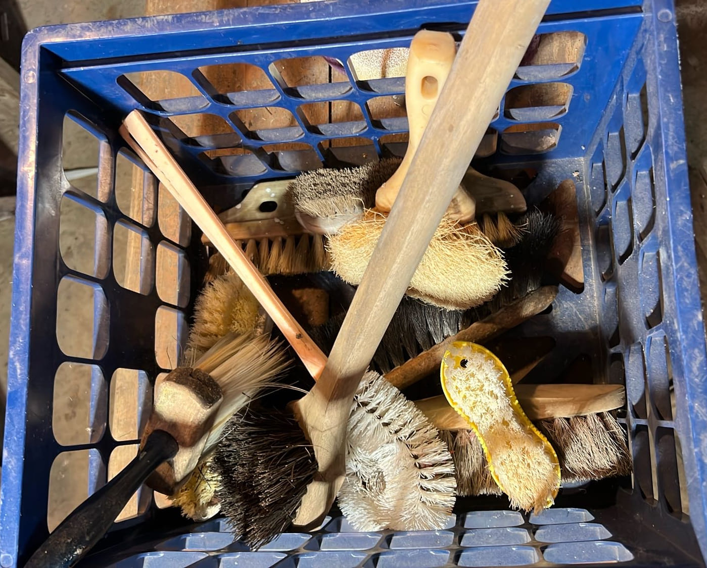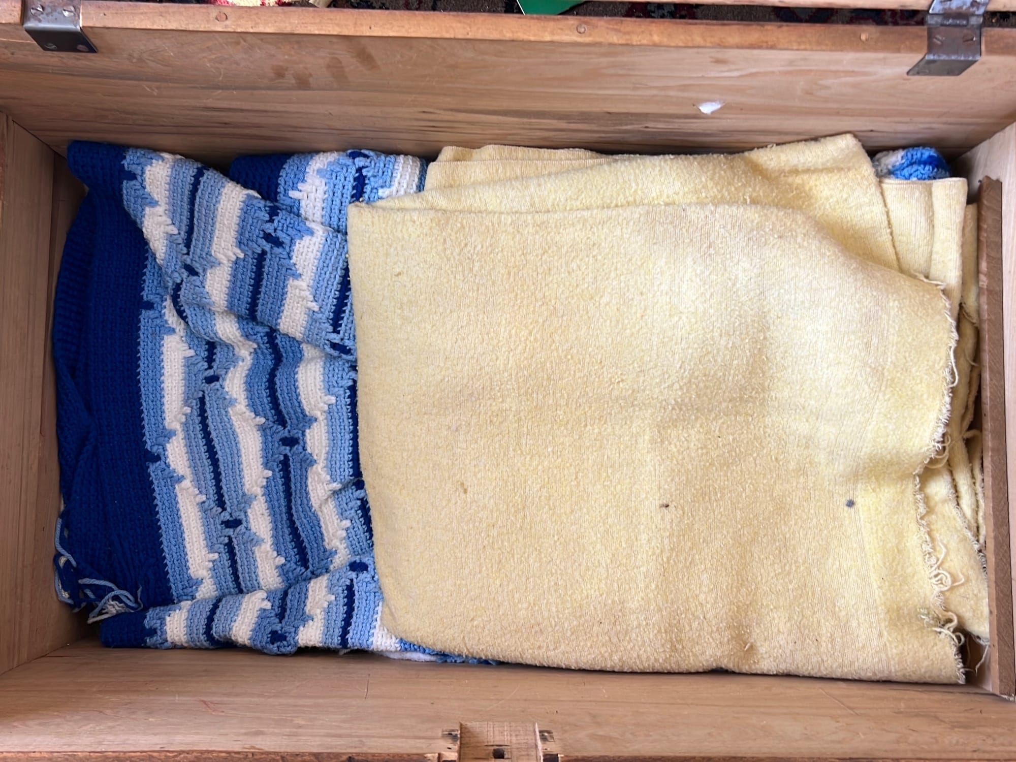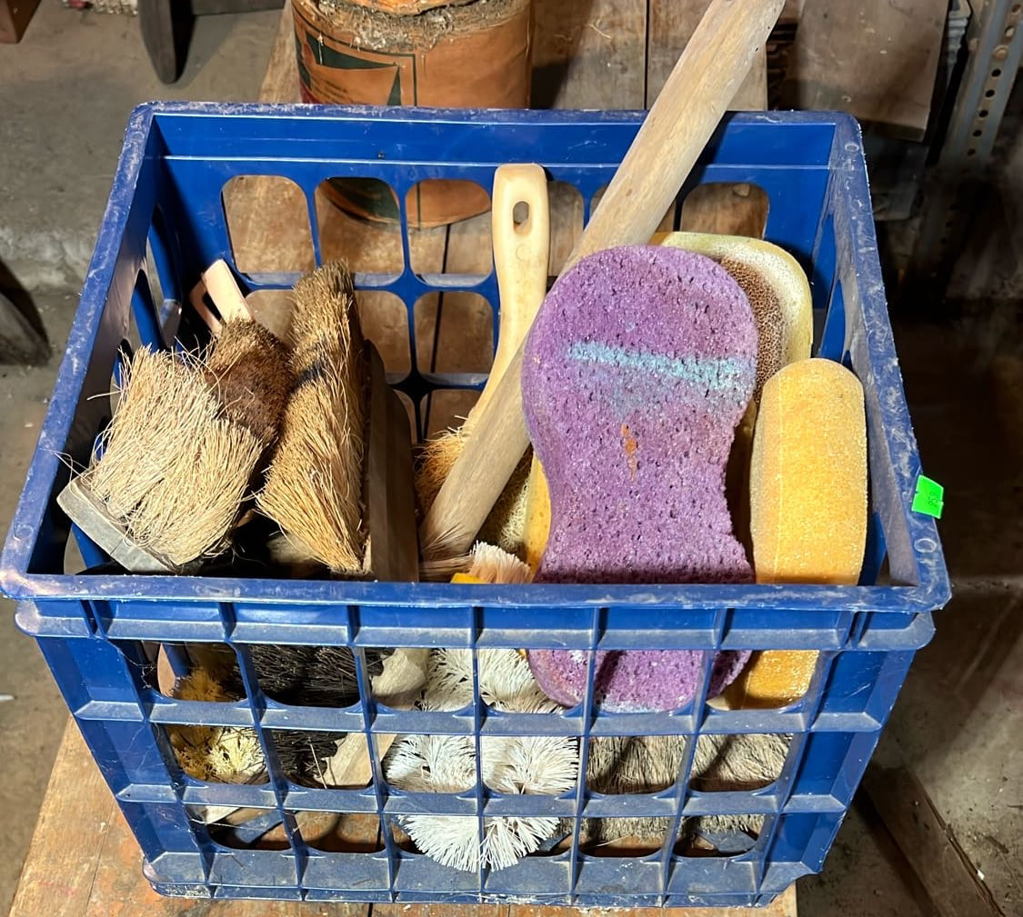 1129 Electric Water Bucket 10” • Electric Animal Pan 11” • Plastic Watering Can • Wood Fruit Crate missing one slat 19.5”x10”x13.25”