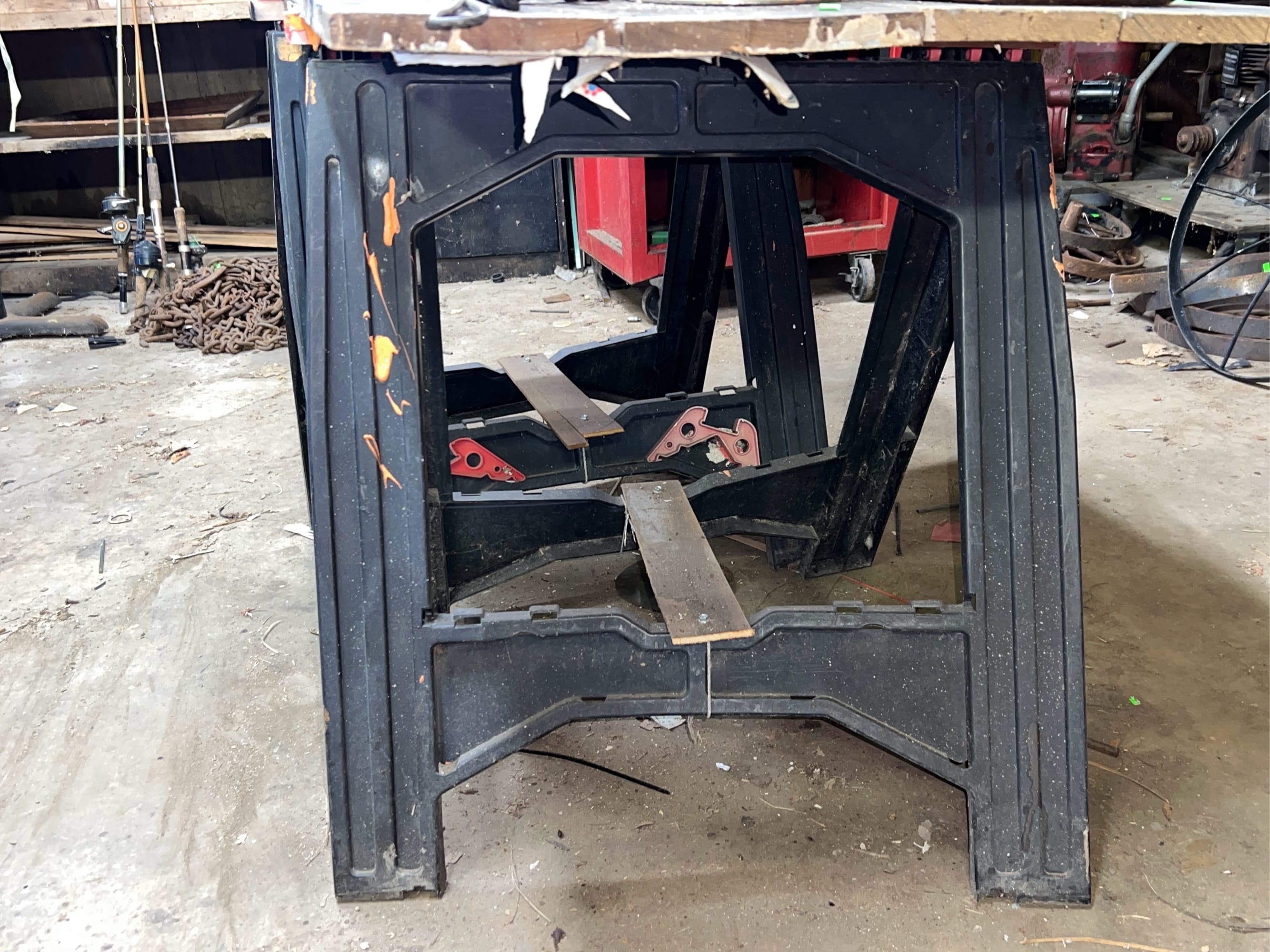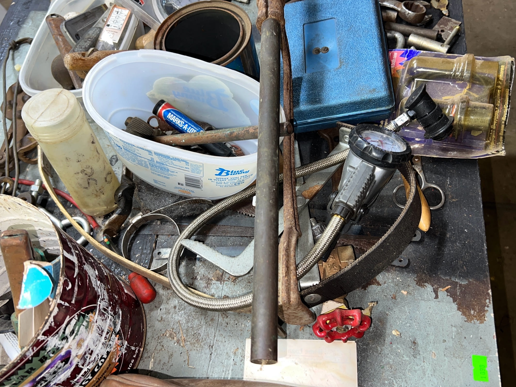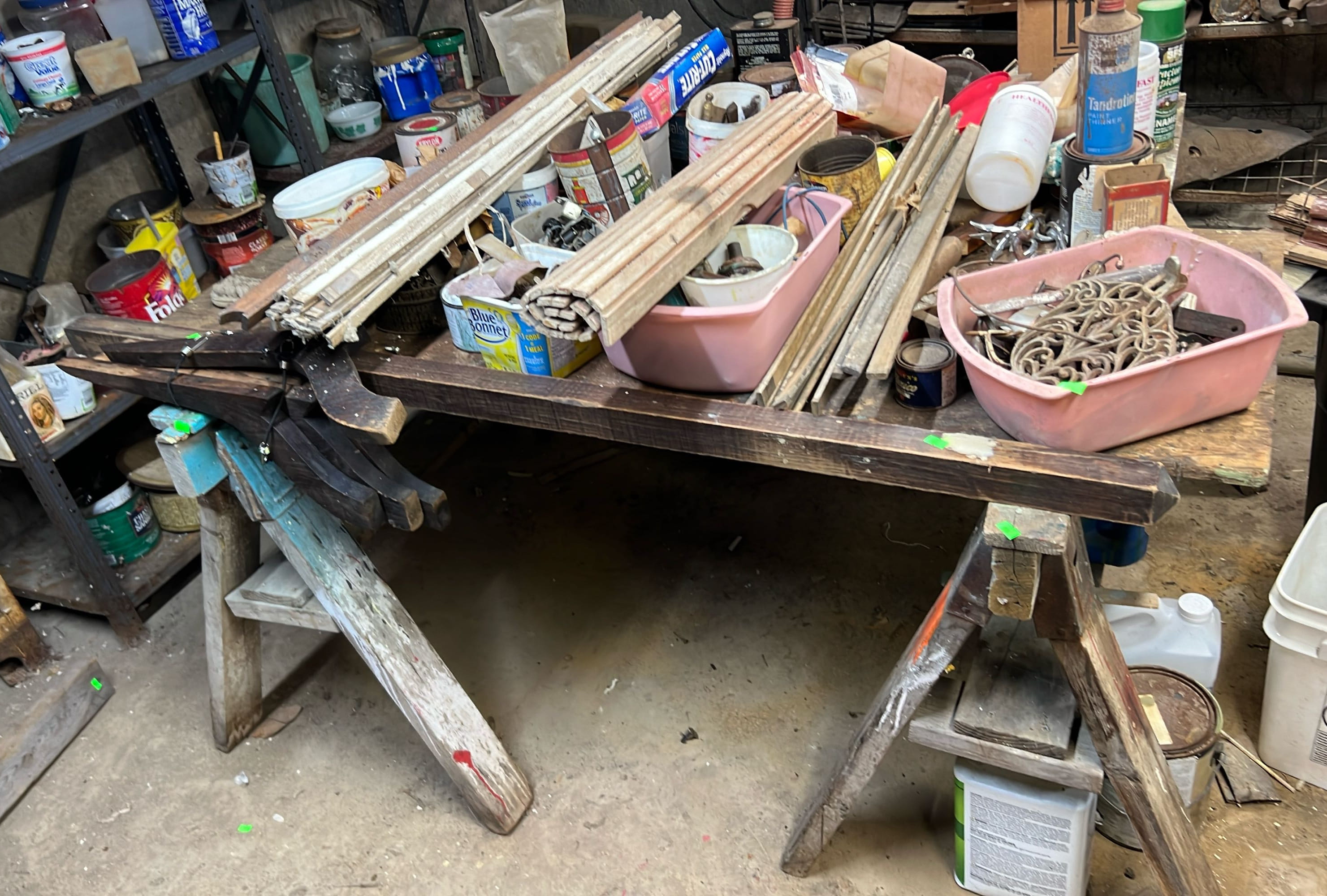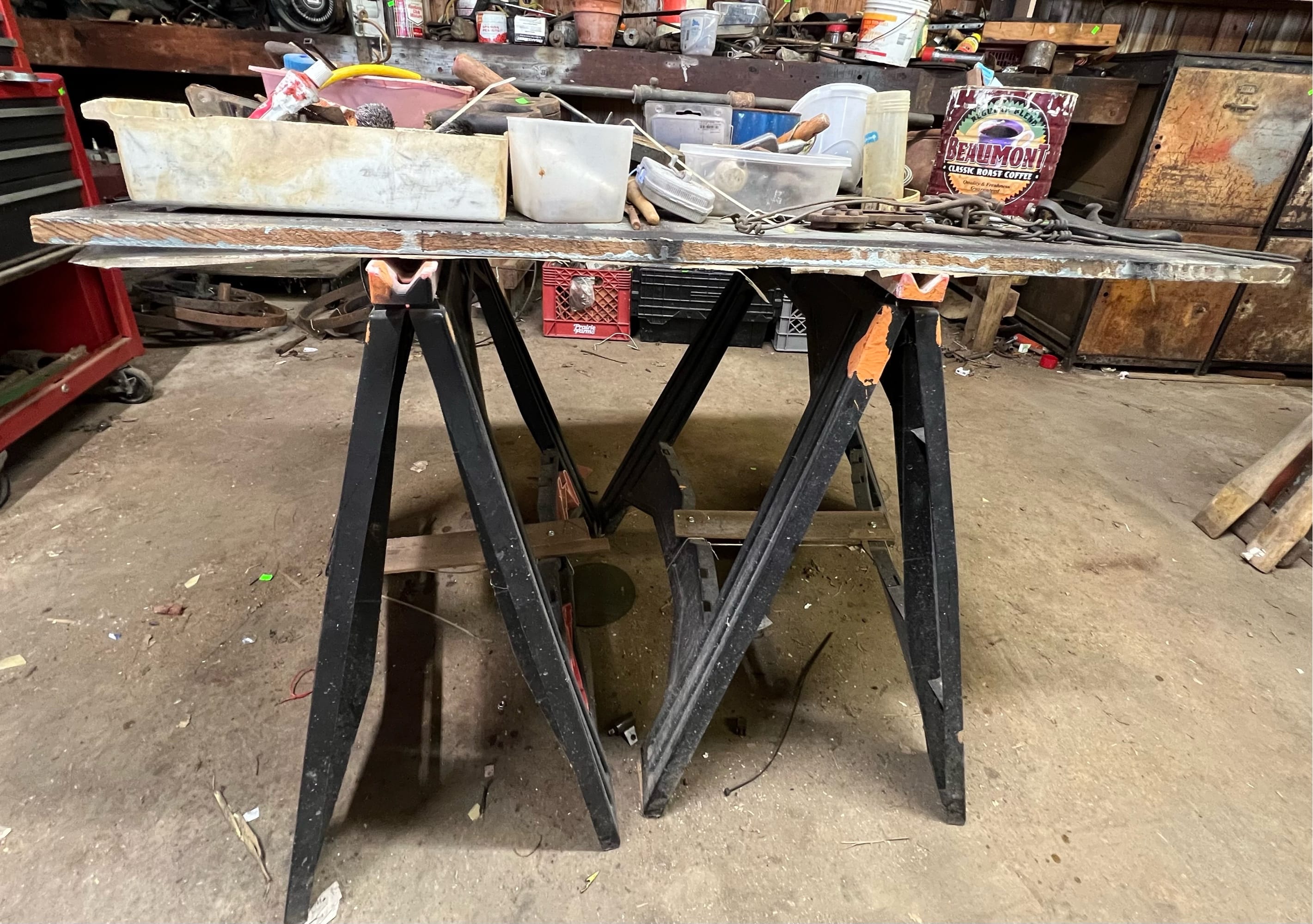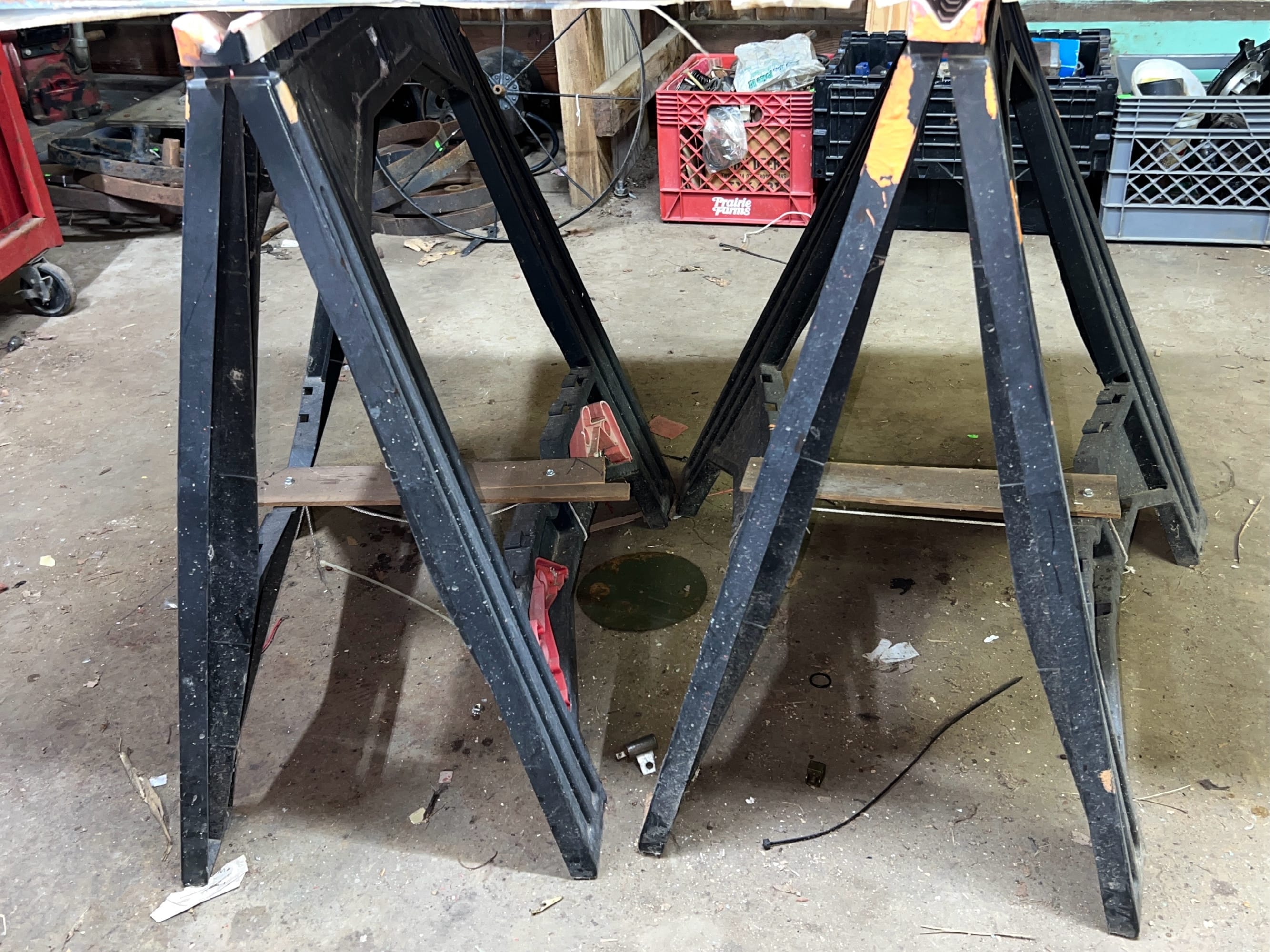 1098 Two Plastic Foldable Saw Horses with Wood top & contents - Barrel Oump • Cotter & Hitch Pins • Valley Instrument Wiality Gauge • Saw Handle assortment • Gas Gauge • misc