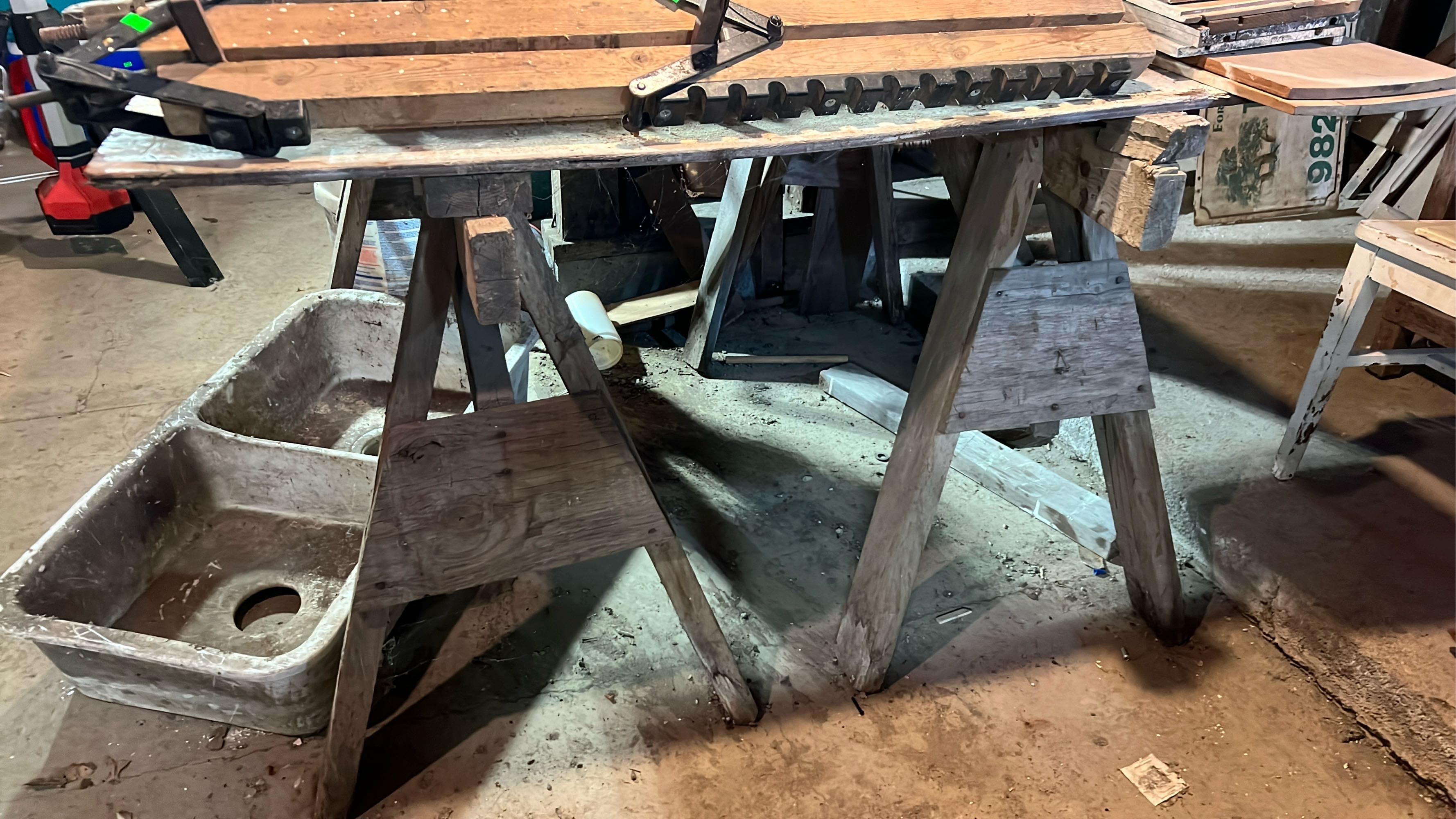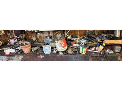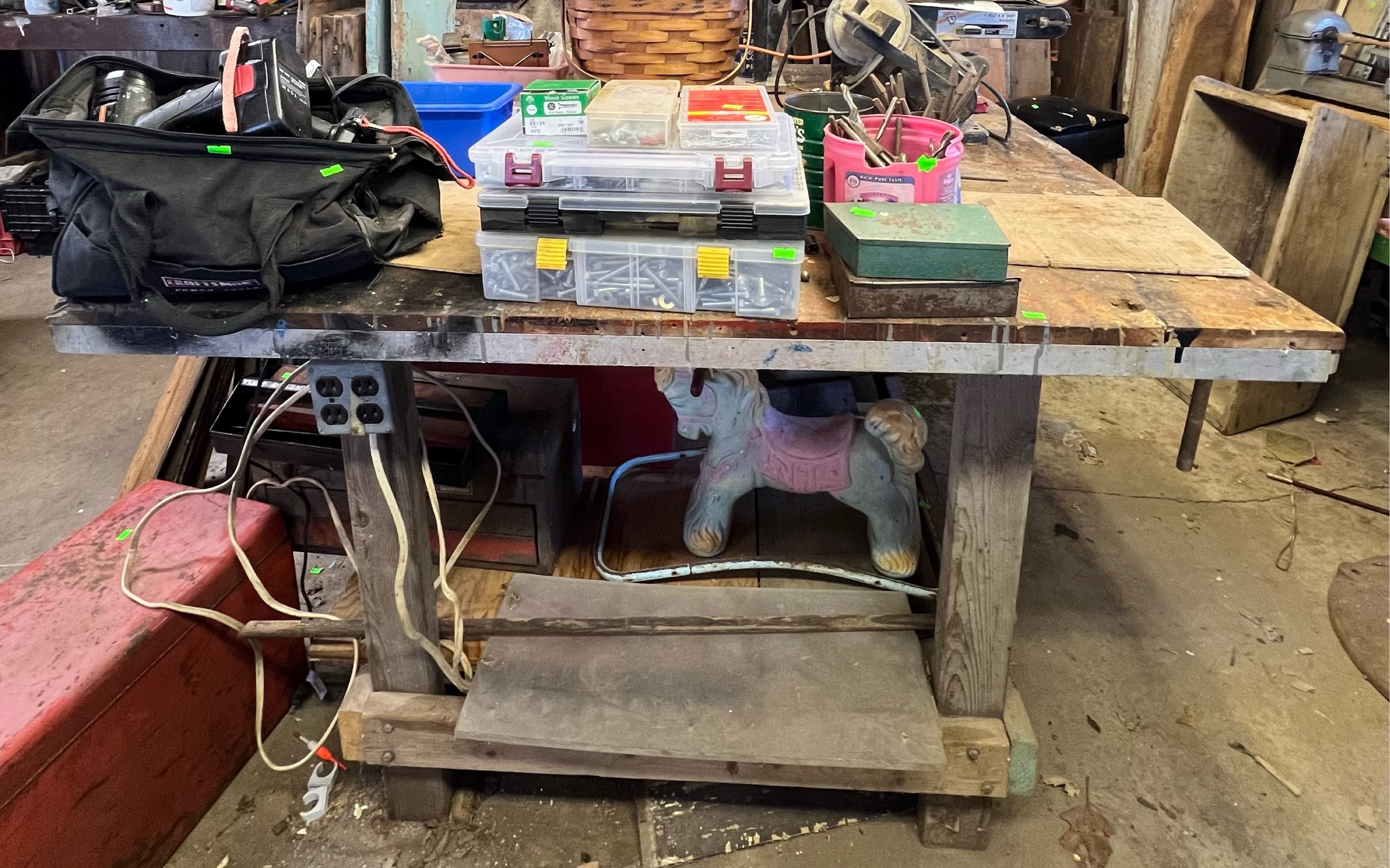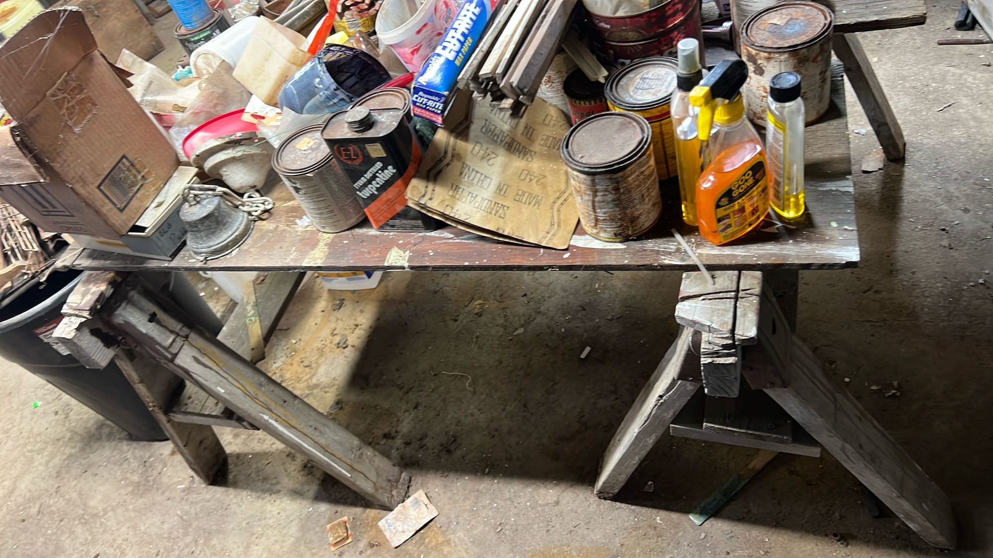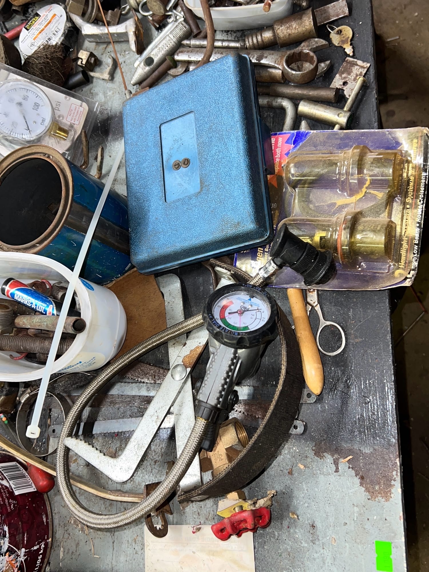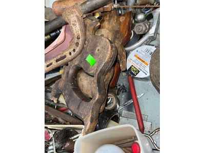 1098 Two Plastic Foldable Saw Horses with Wood top & contents - Barrel Oump • Cotter & Hitch Pins • Valley Instrument Wiality Gauge • Saw Handle assortment • Gas Gauge • misc