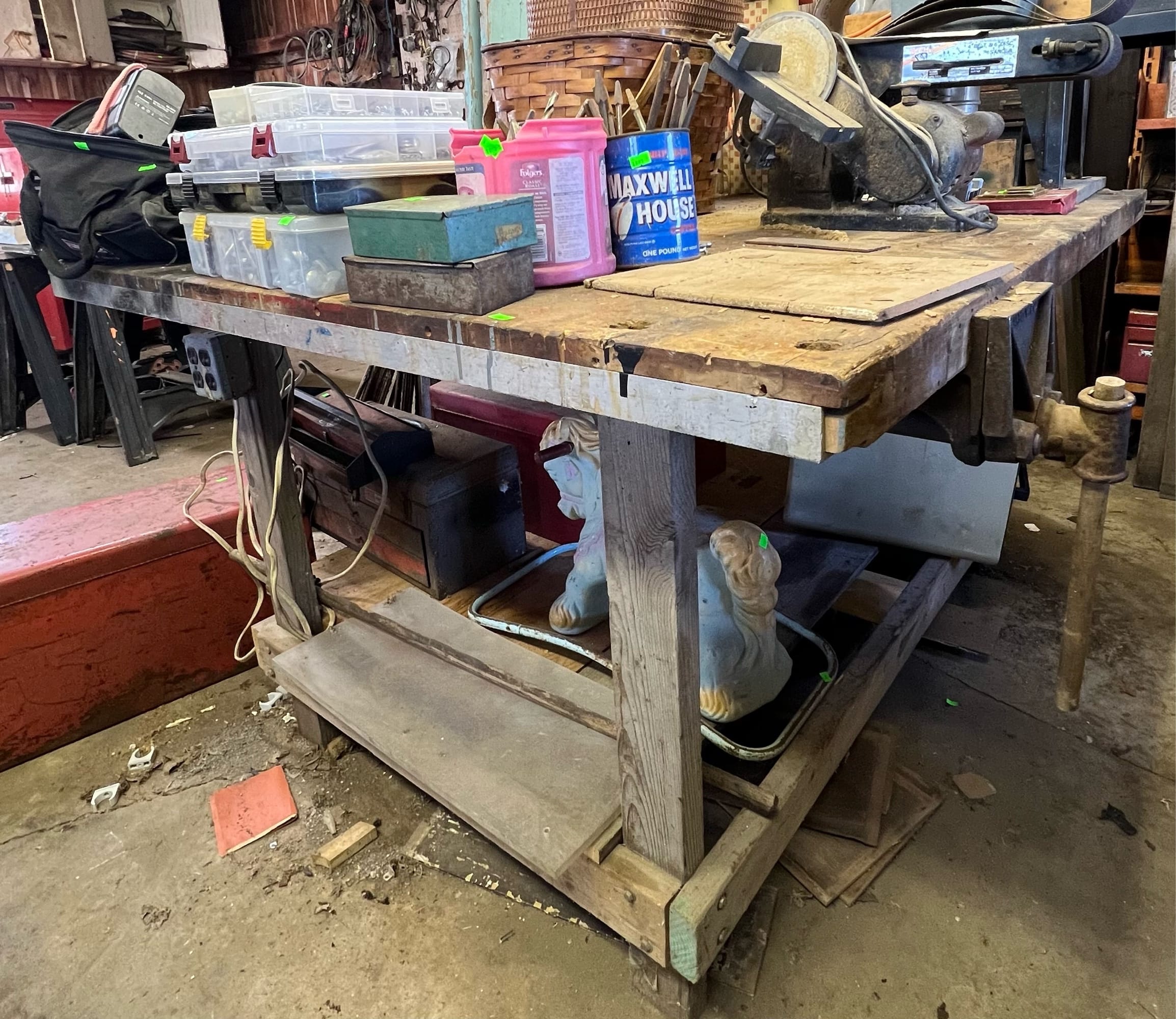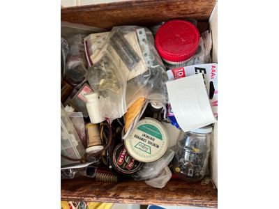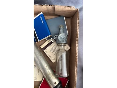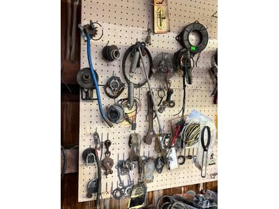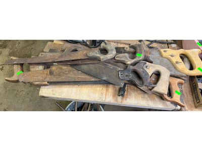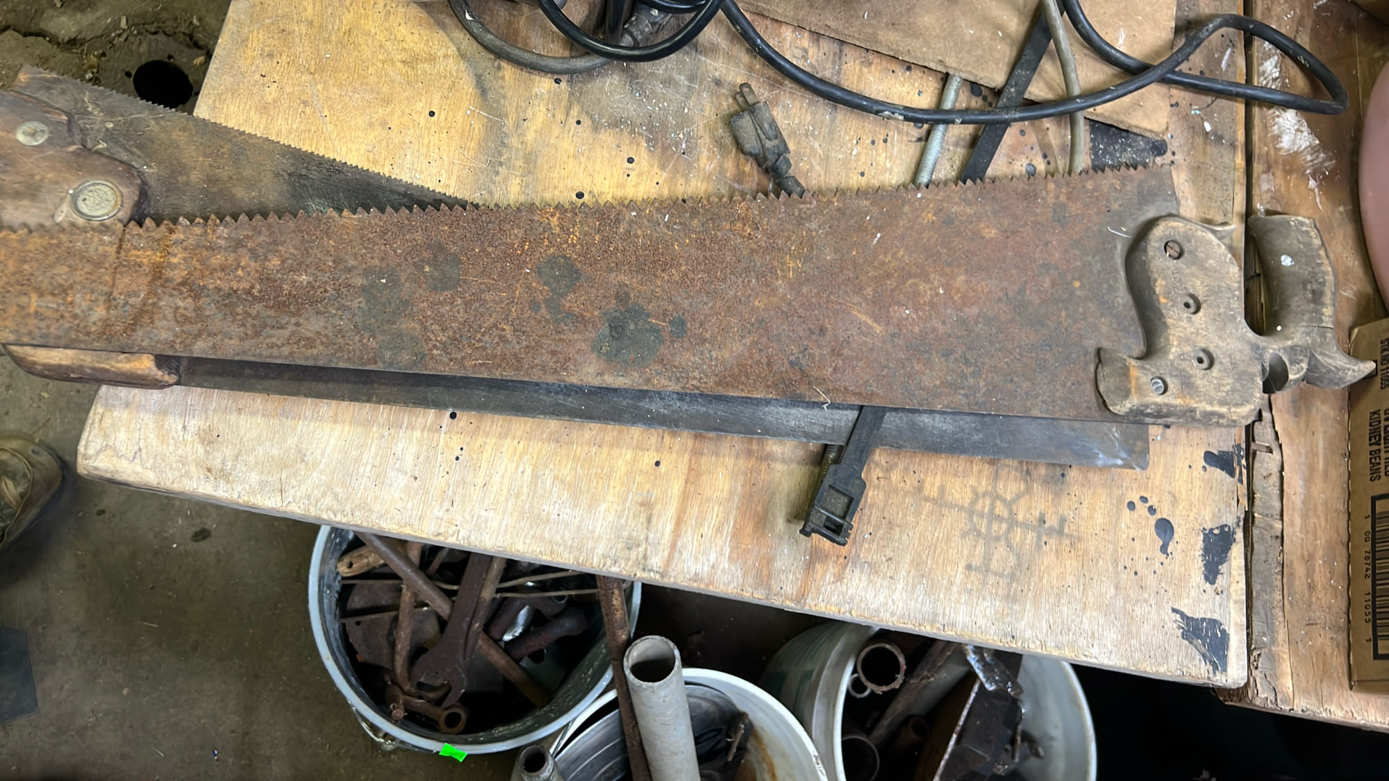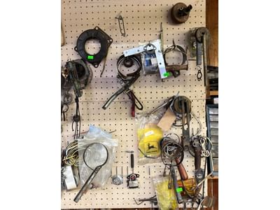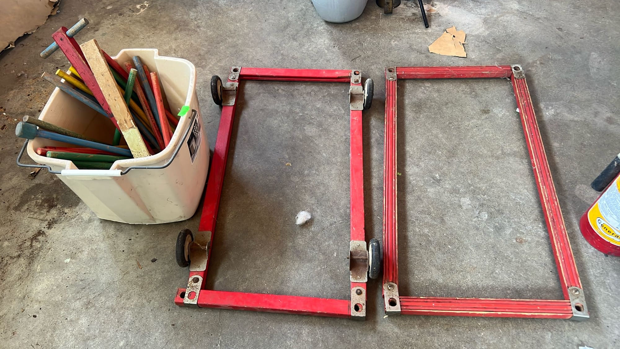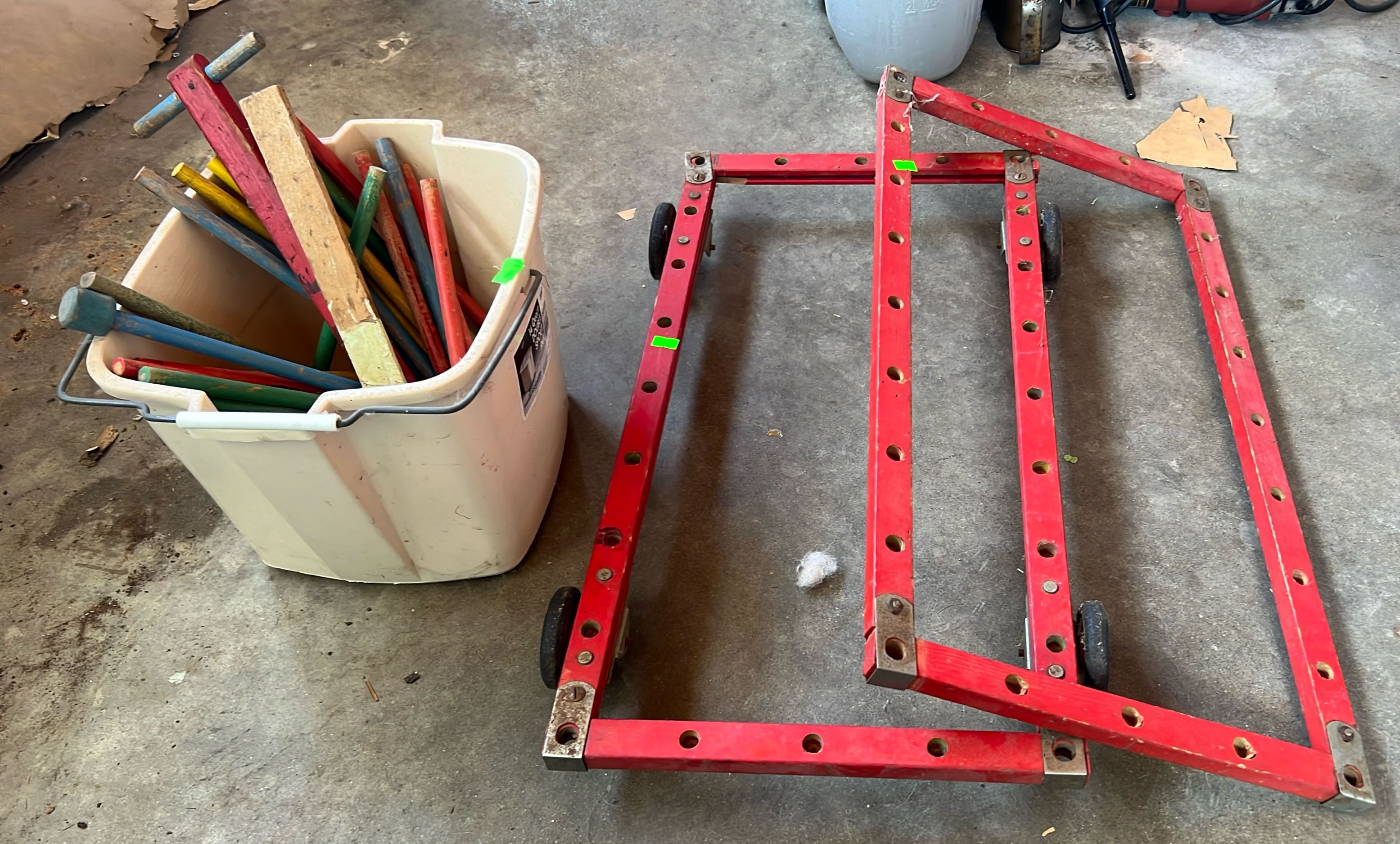 1098 Two Plastic Foldable Saw Horses with Wood top & contents - Barrel Oump • Cotter & Hitch Pins • Valley Instrument Wiality Gauge • Saw Handle assortment • Gas Gauge • misc