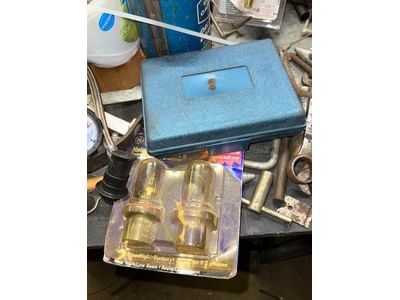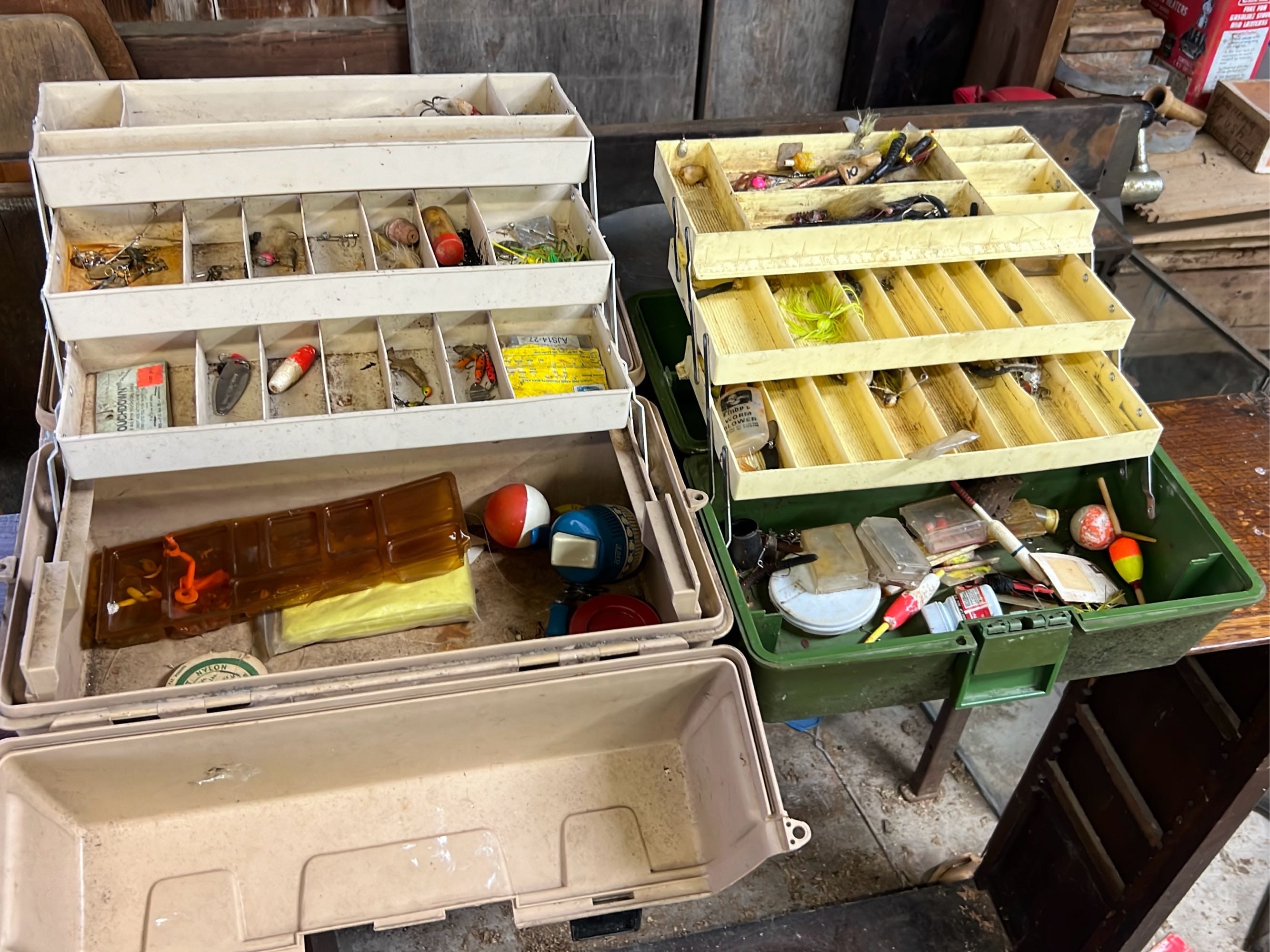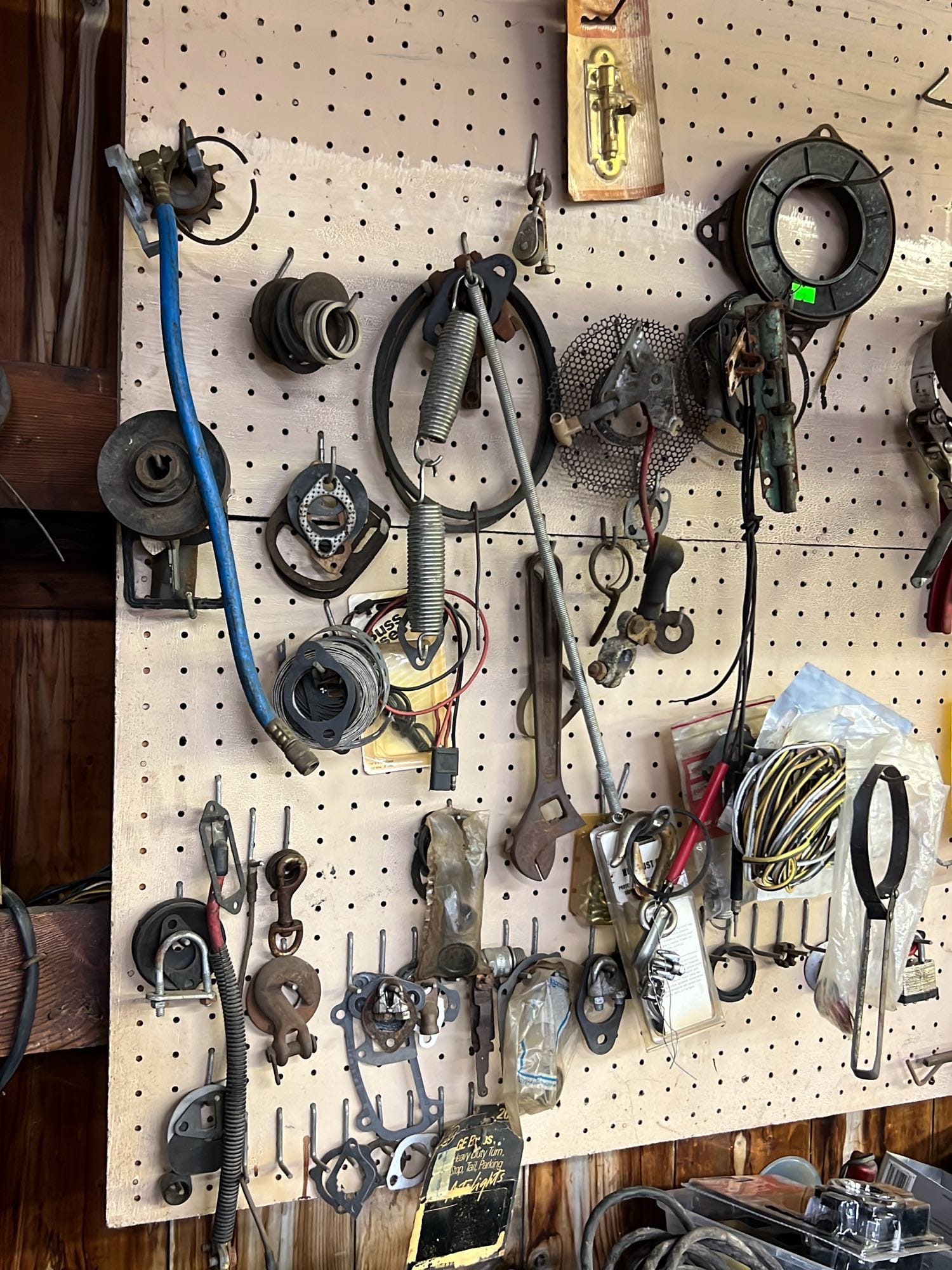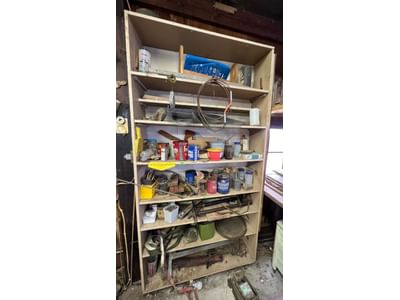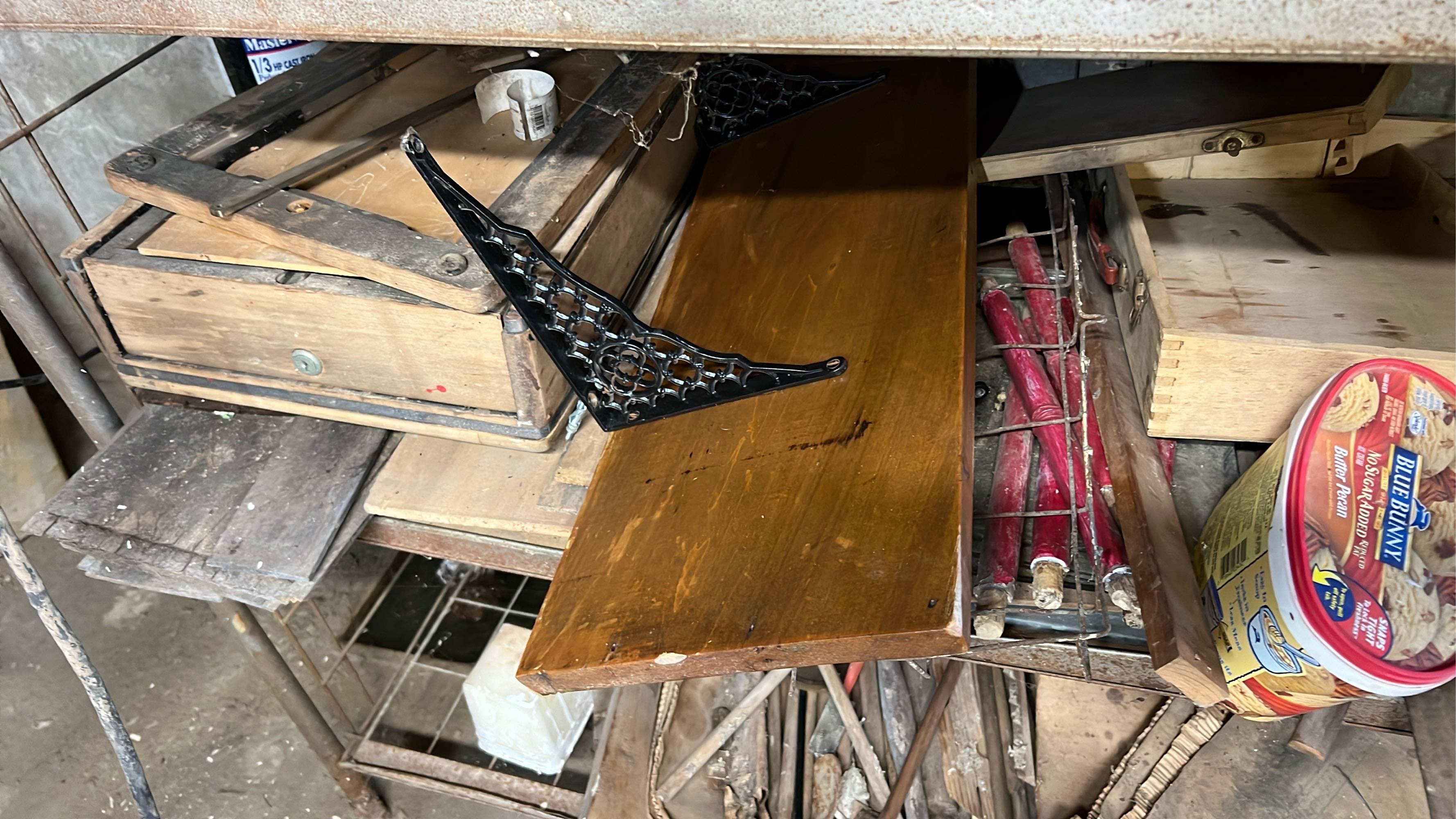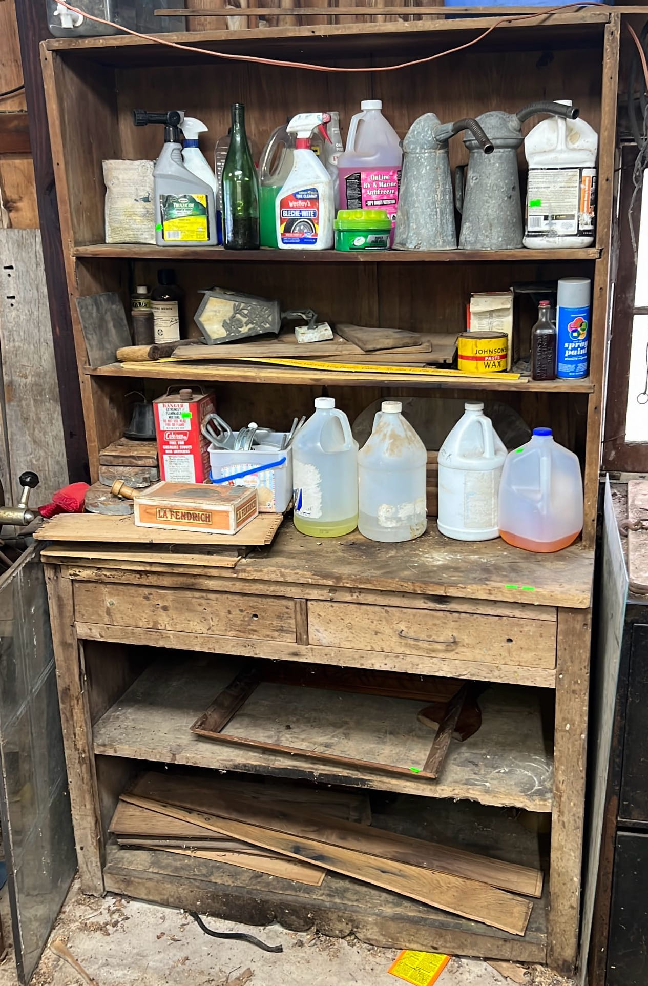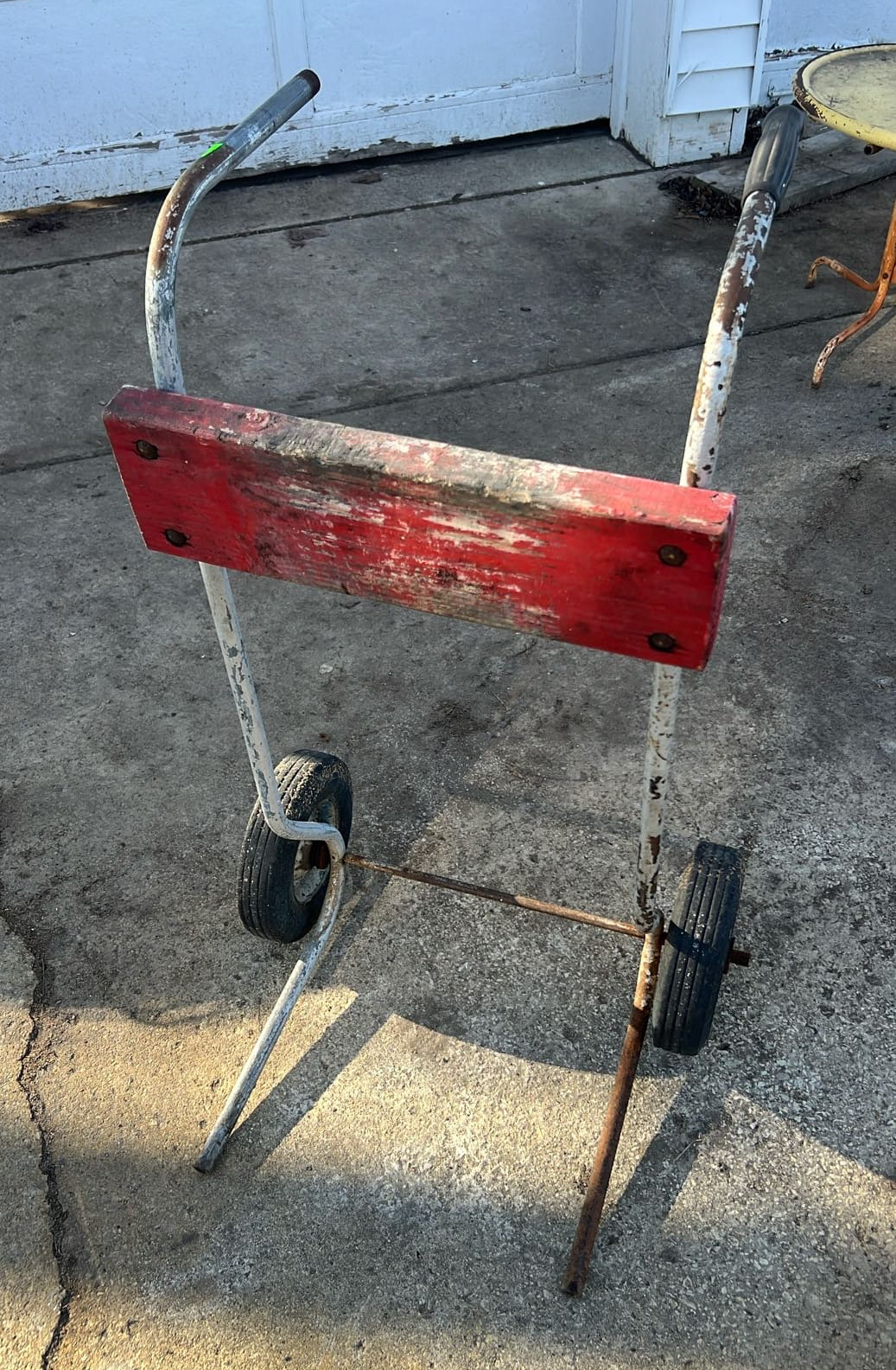 1098 Two Plastic Foldable Saw Horses with Wood top & contents - Barrel Oump • Cotter & Hitch Pins • Valley Instrument Wiality Gauge • Saw Handle assortment • Gas Gauge • misc