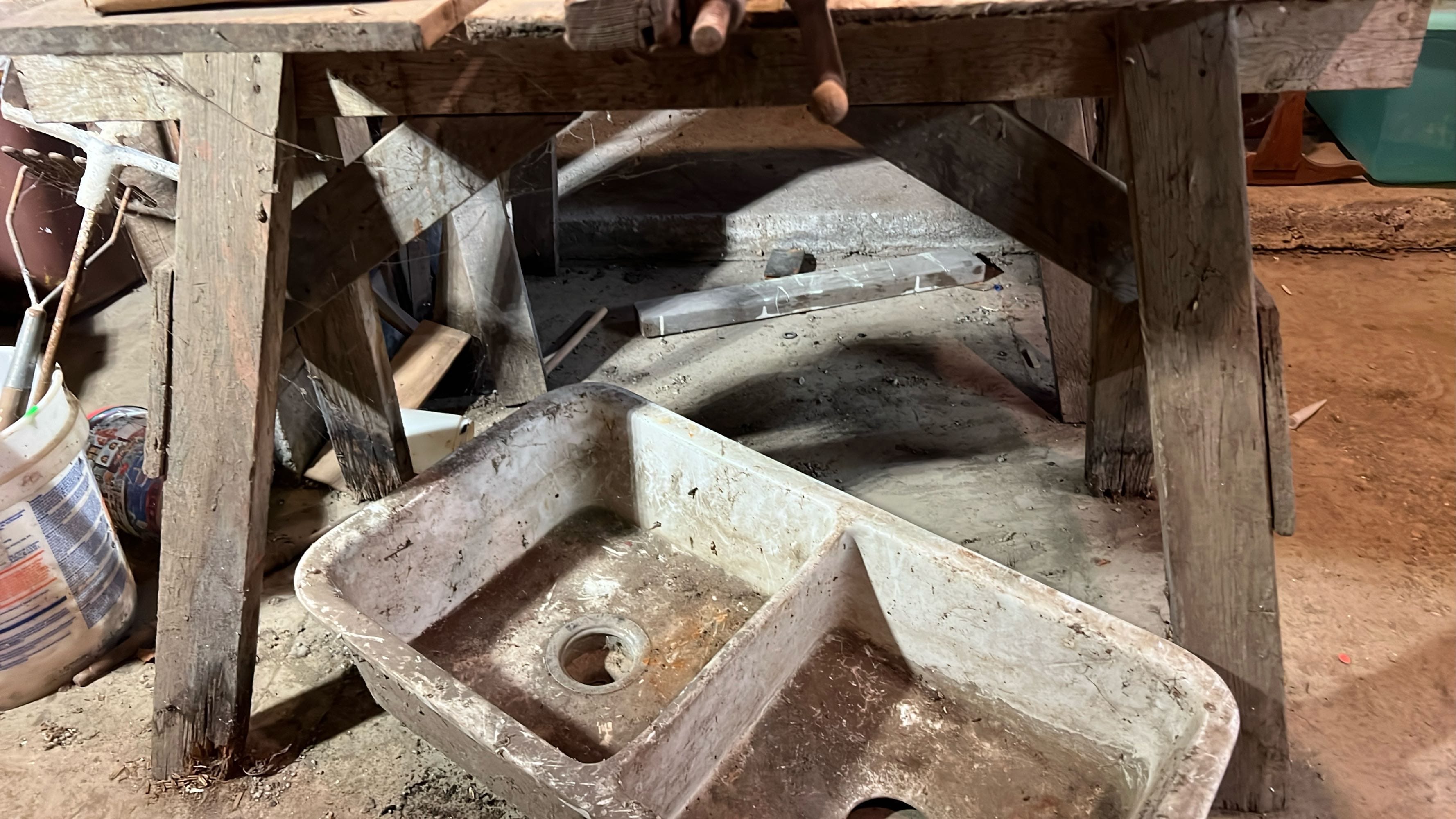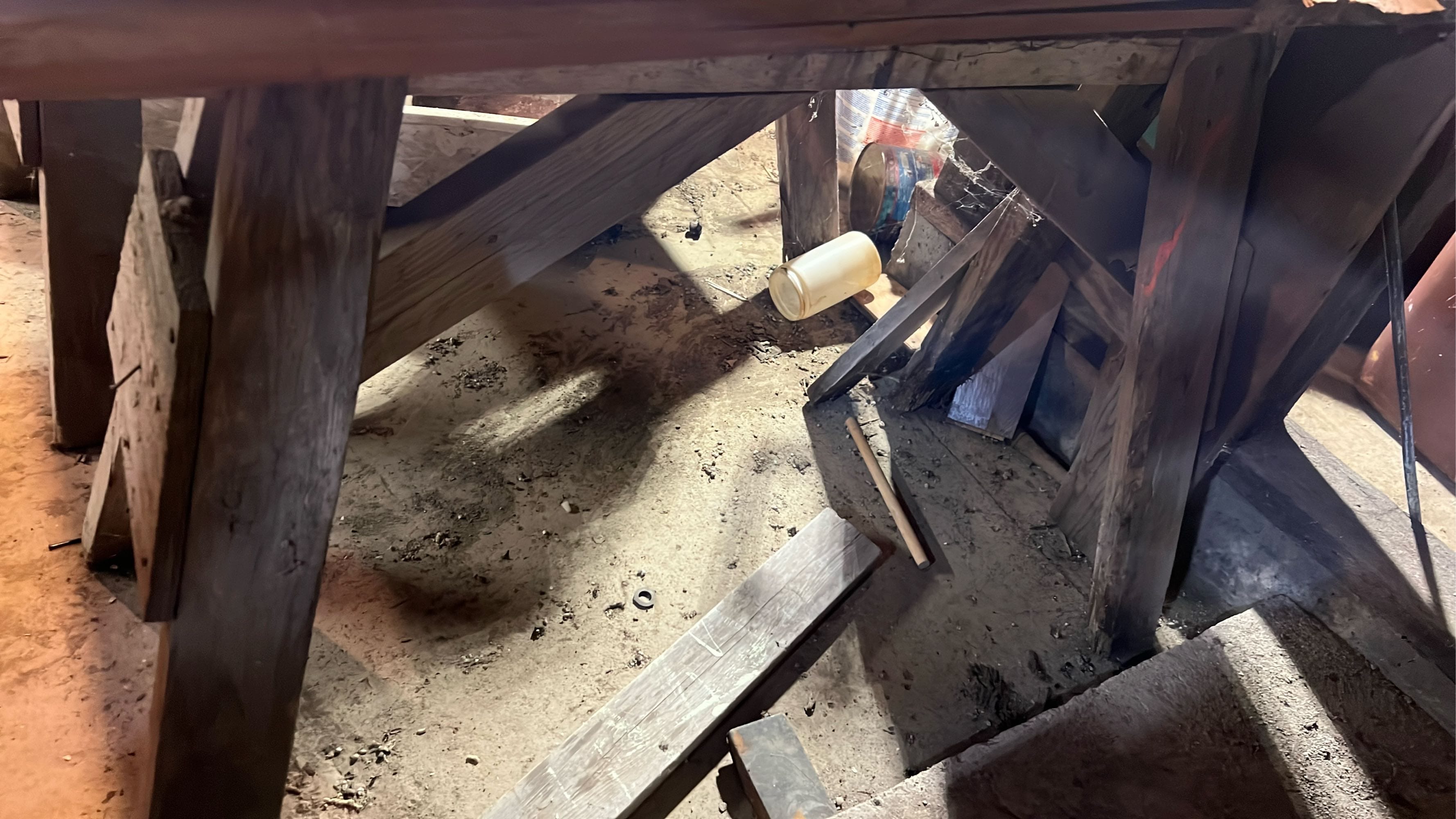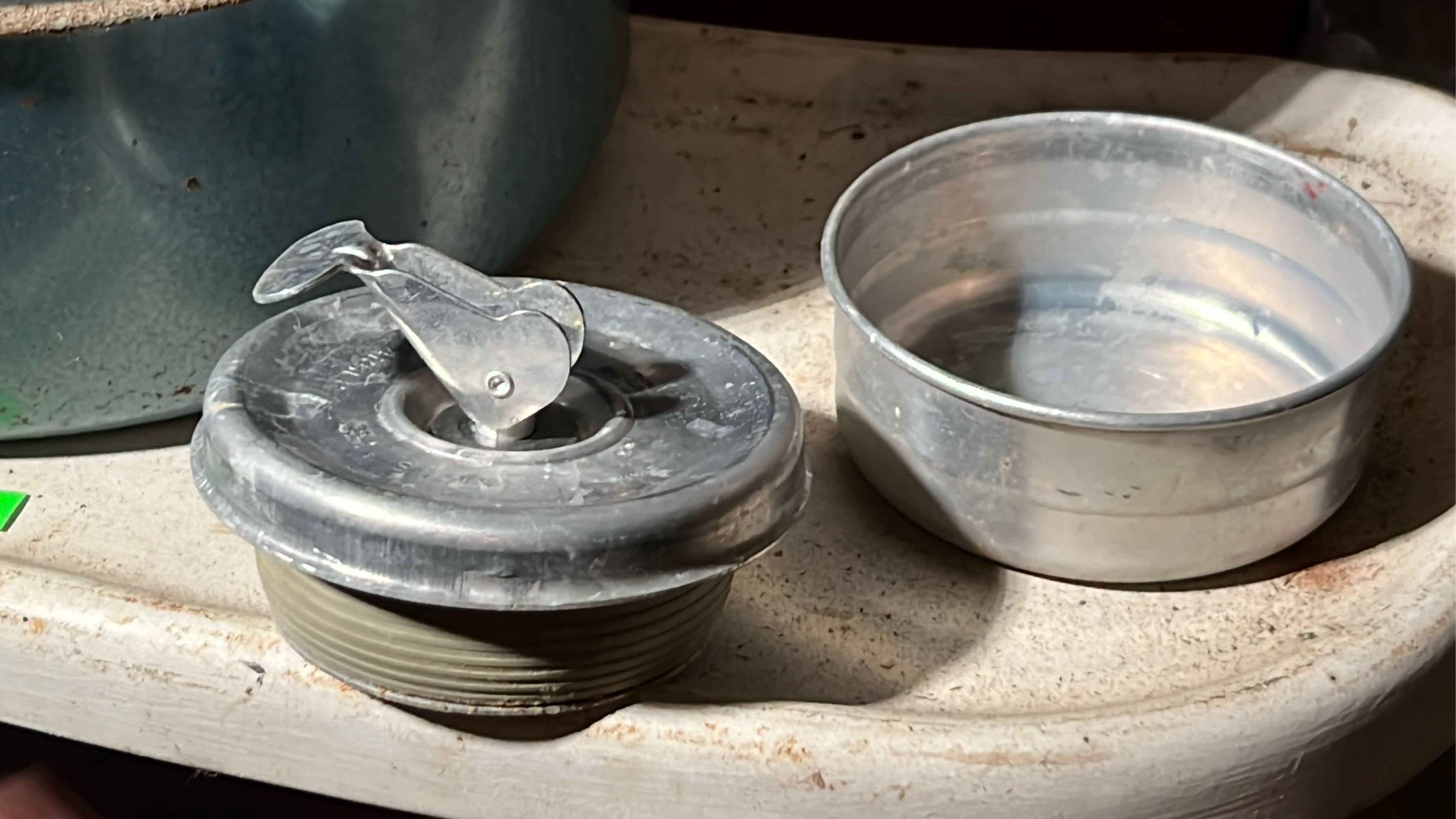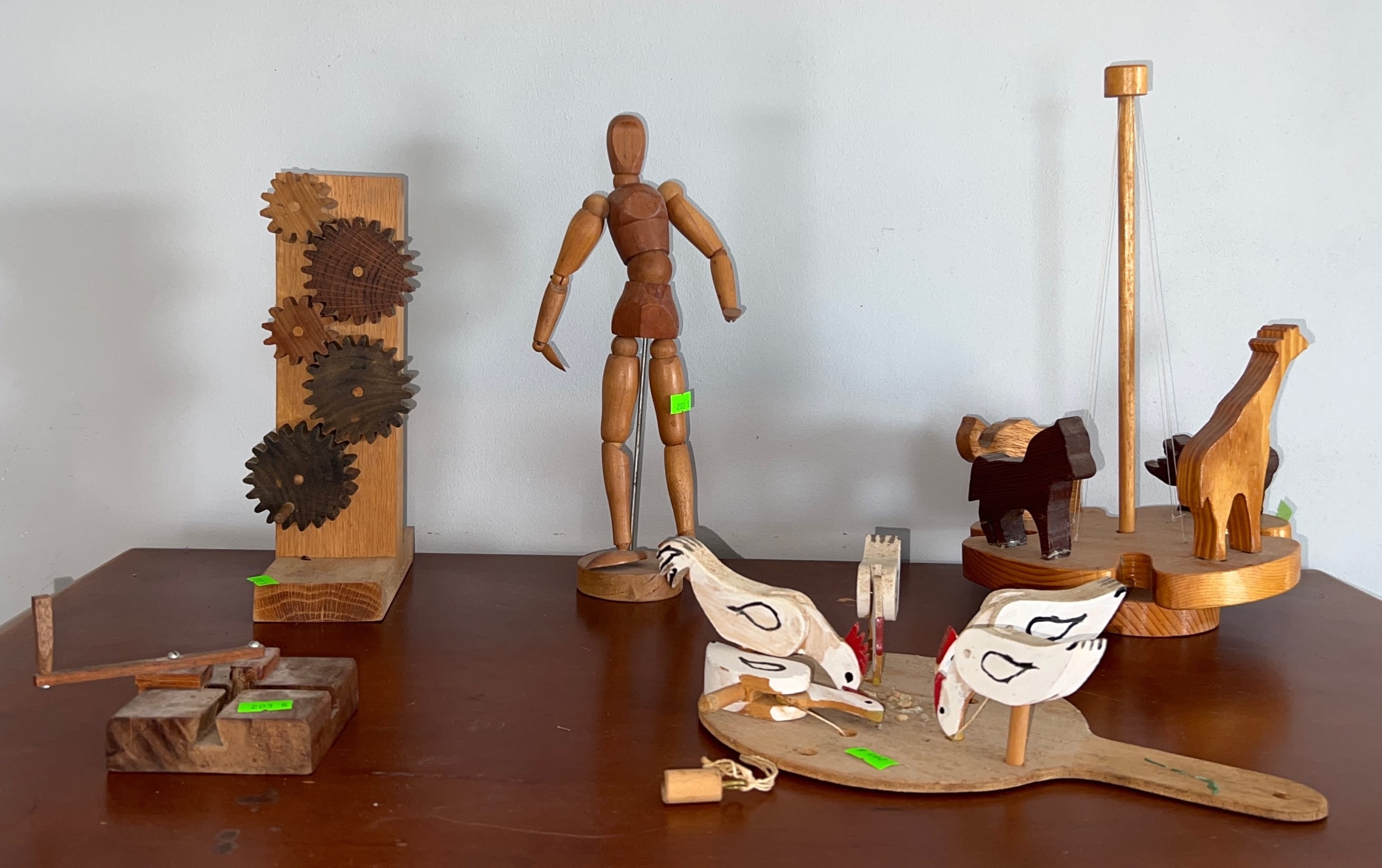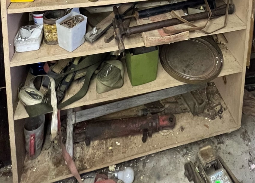 1098 Two Plastic Foldable Saw Horses with Wood top & contents - Barrel Oump • Cotter & Hitch Pins • Valley Instrument Wiality Gauge • Saw Handle assortment • Gas Gauge • misc