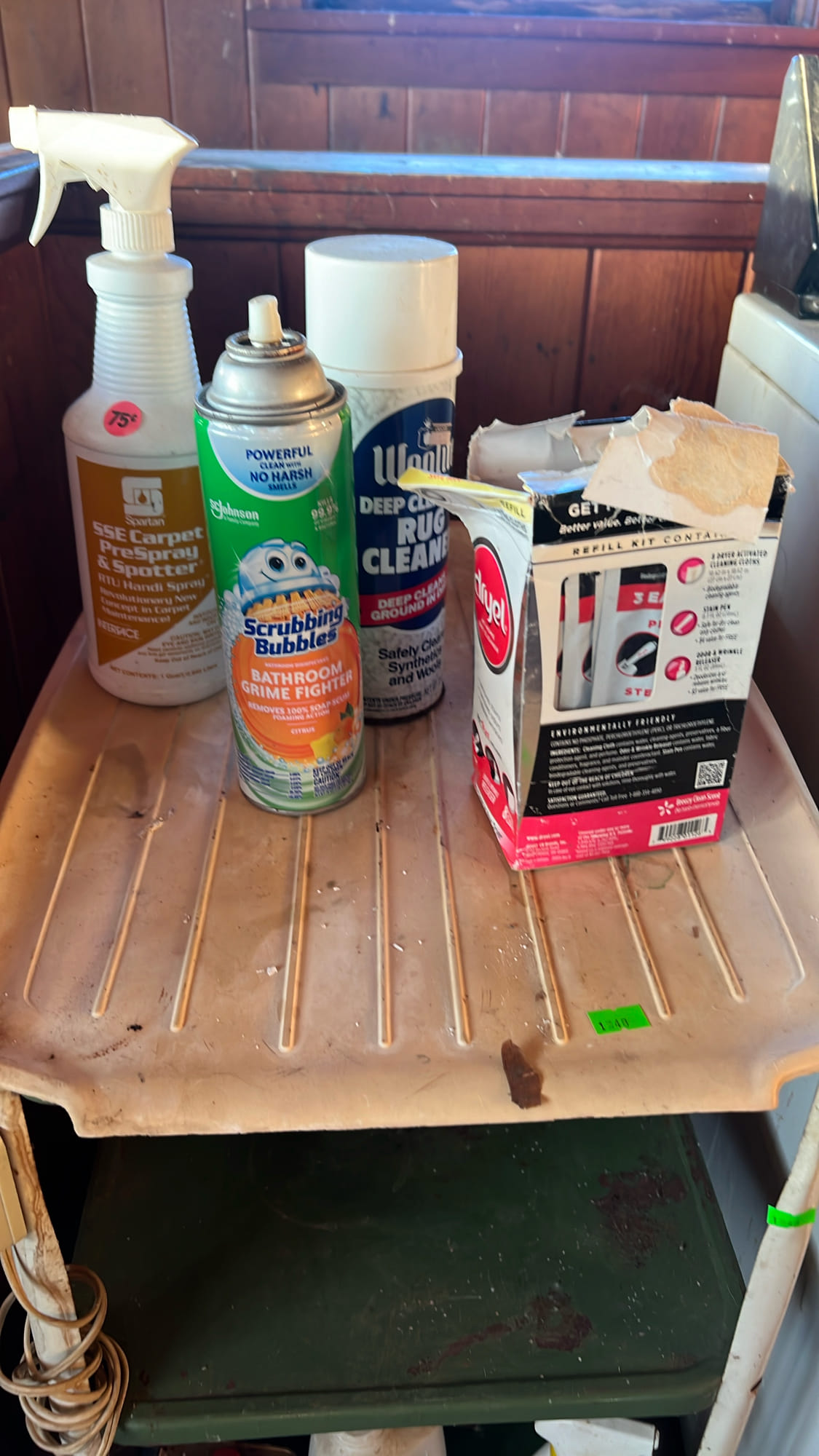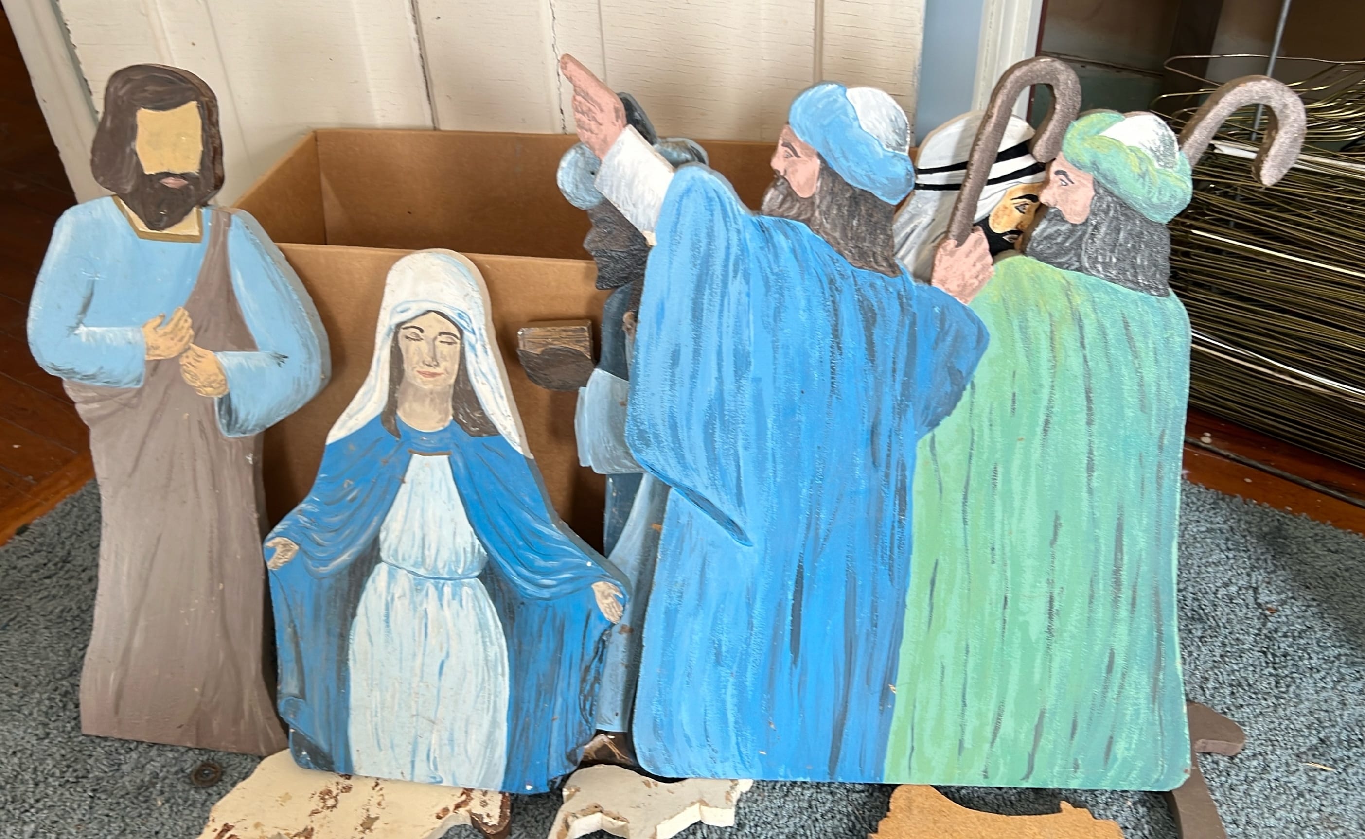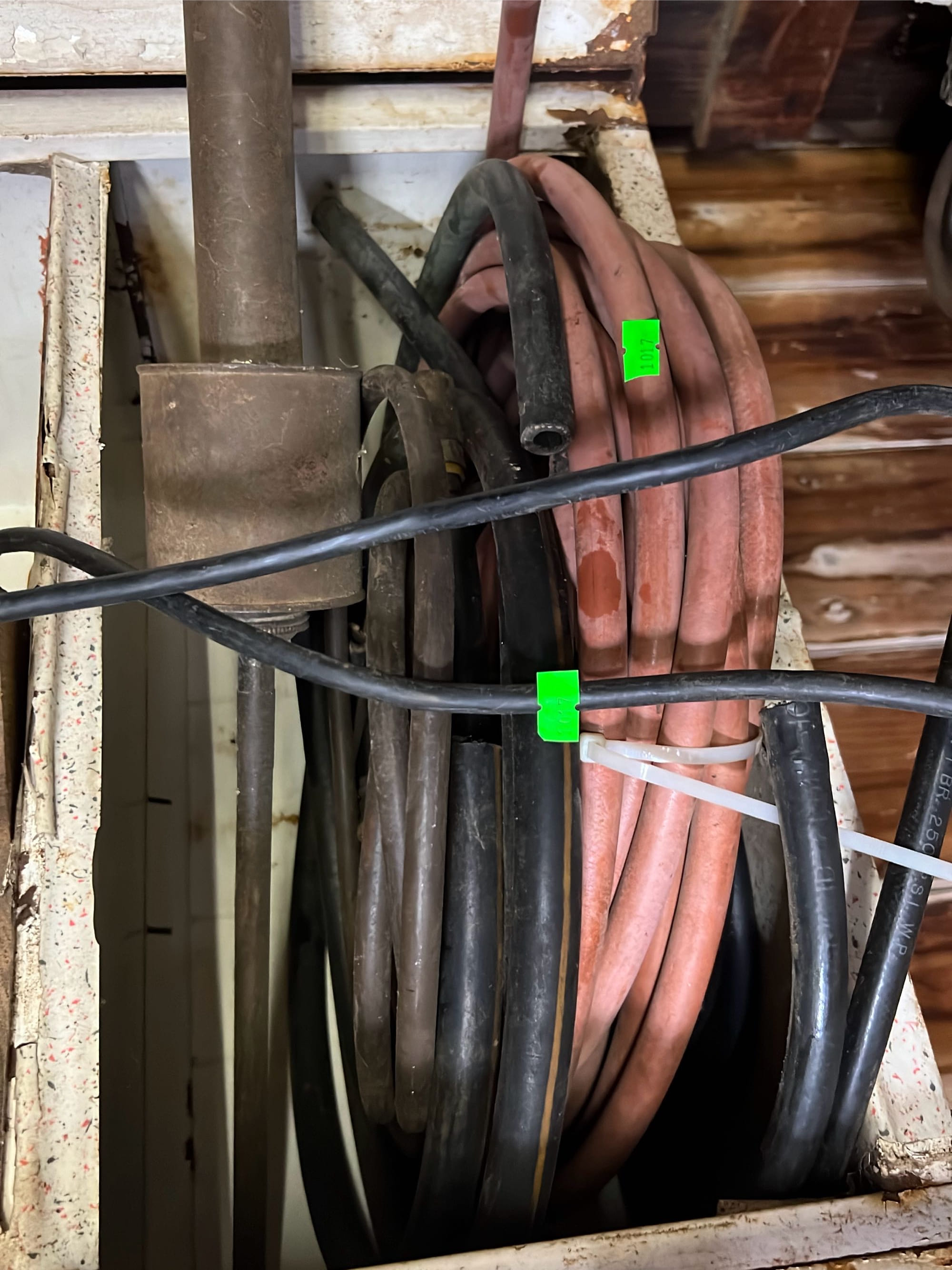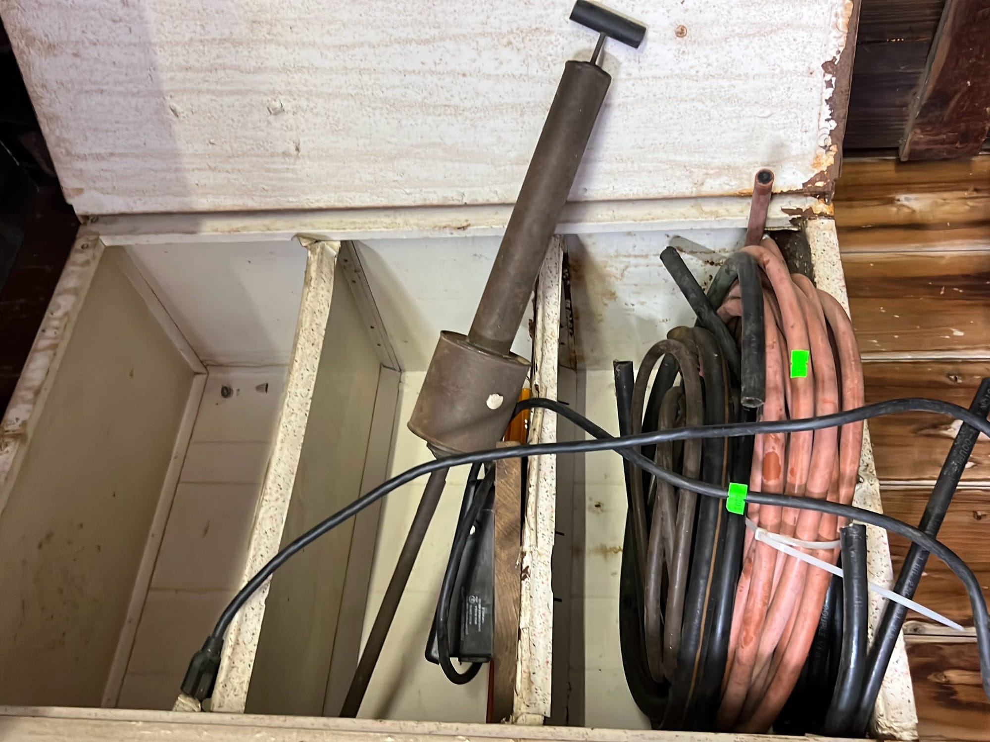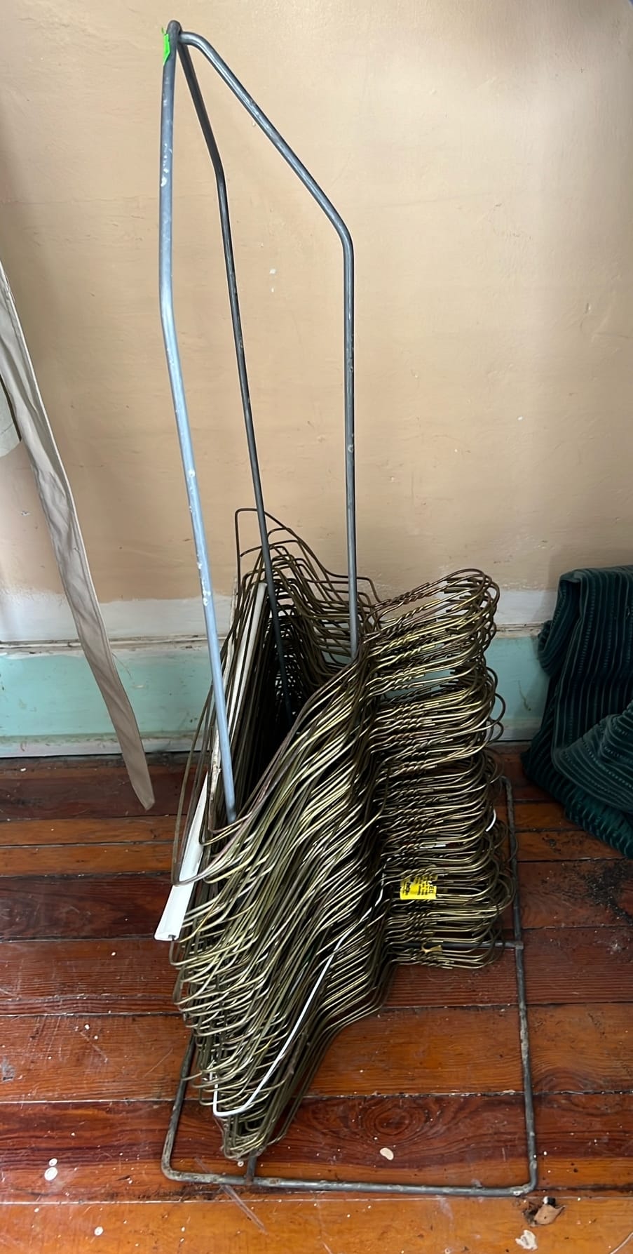 1098 Two Plastic Foldable Saw Horses with Wood top & contents - Barrel Oump • Cotter & Hitch Pins • Valley Instrument Wiality Gauge • Saw Handle assortment • Gas Gauge • misc