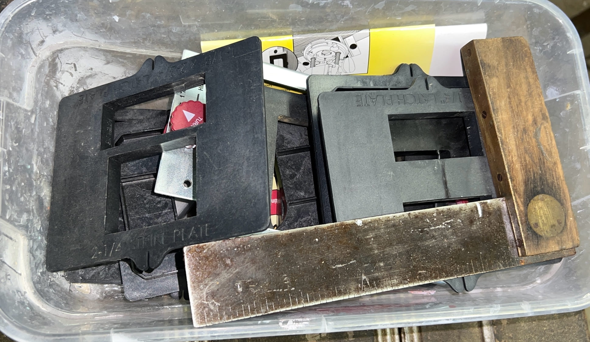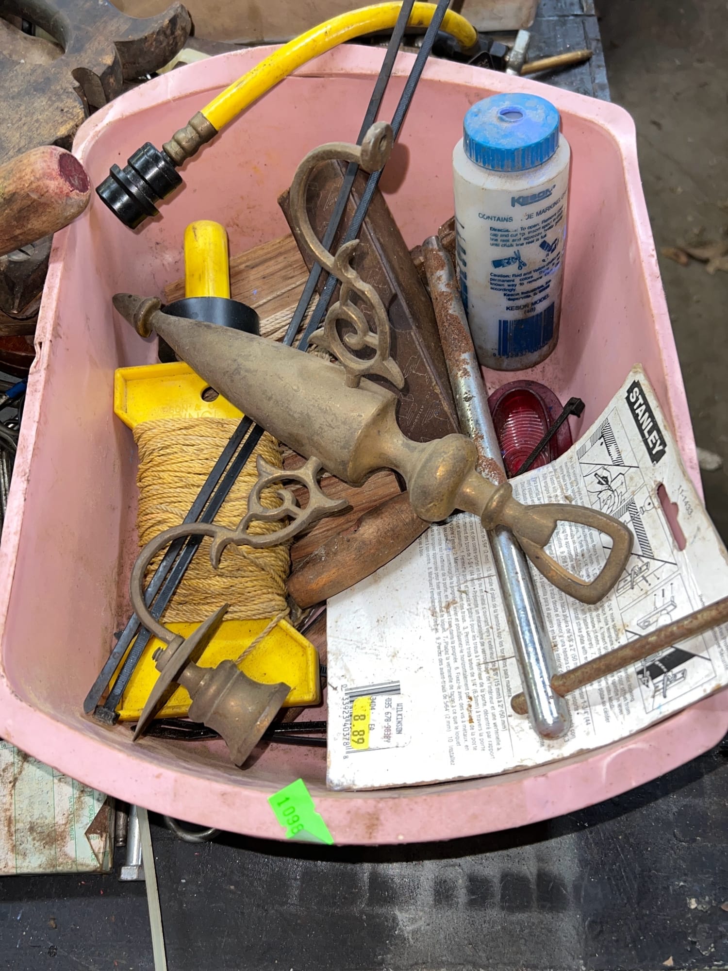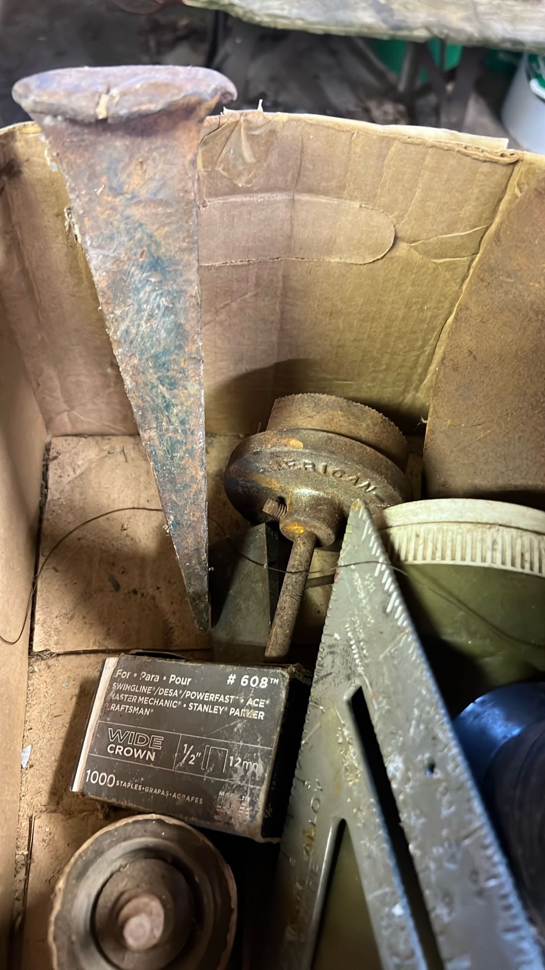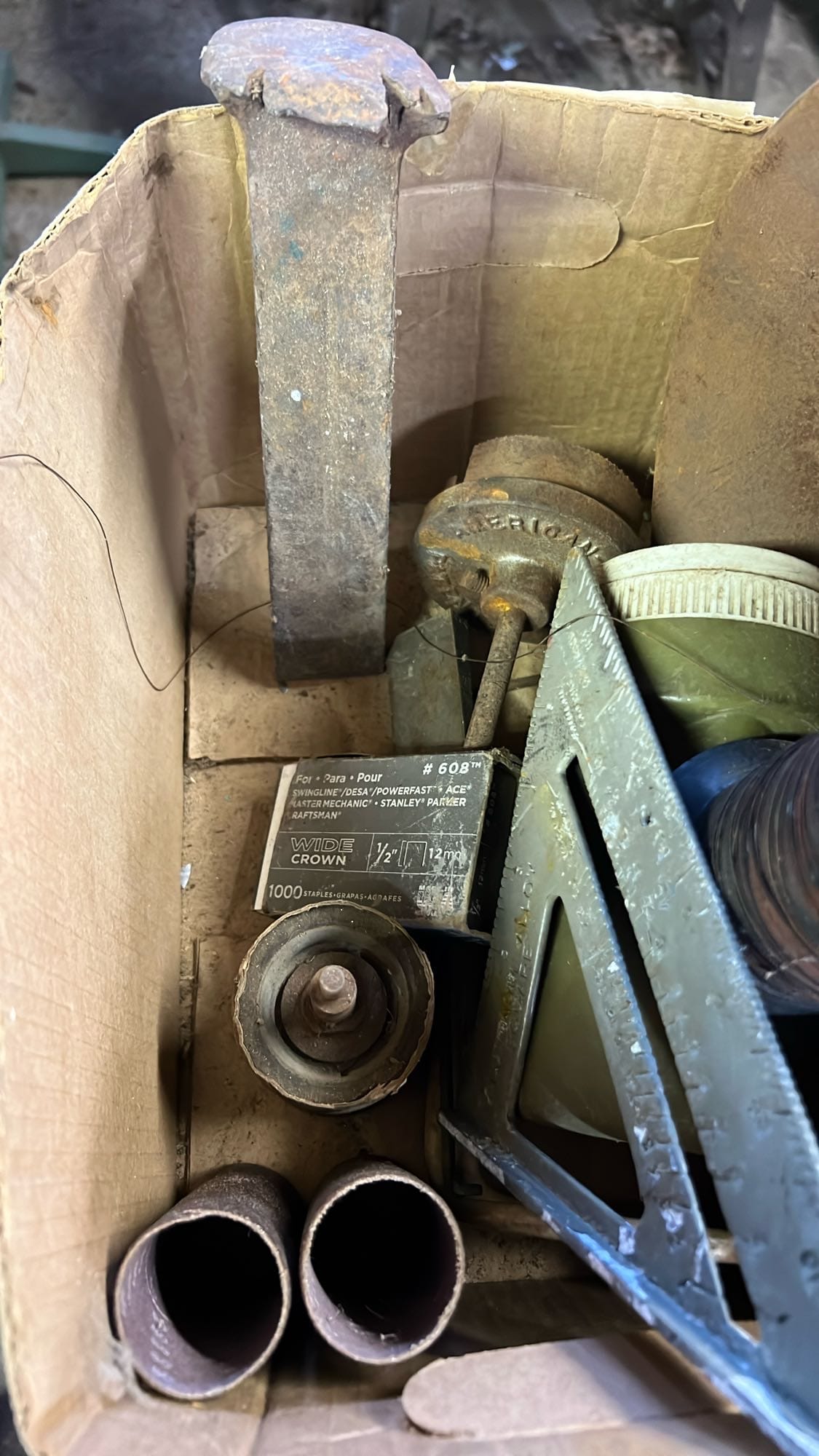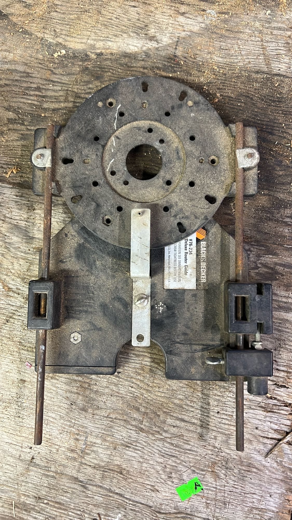 1107 Black & Decker #76-234 Deluxe Router Guide • Caster assortment (Rusty) • Gold Mining Pan 11” • Arrow 1/2” Staples • Aluminium Alloy Square • Splitting Wedge • misc