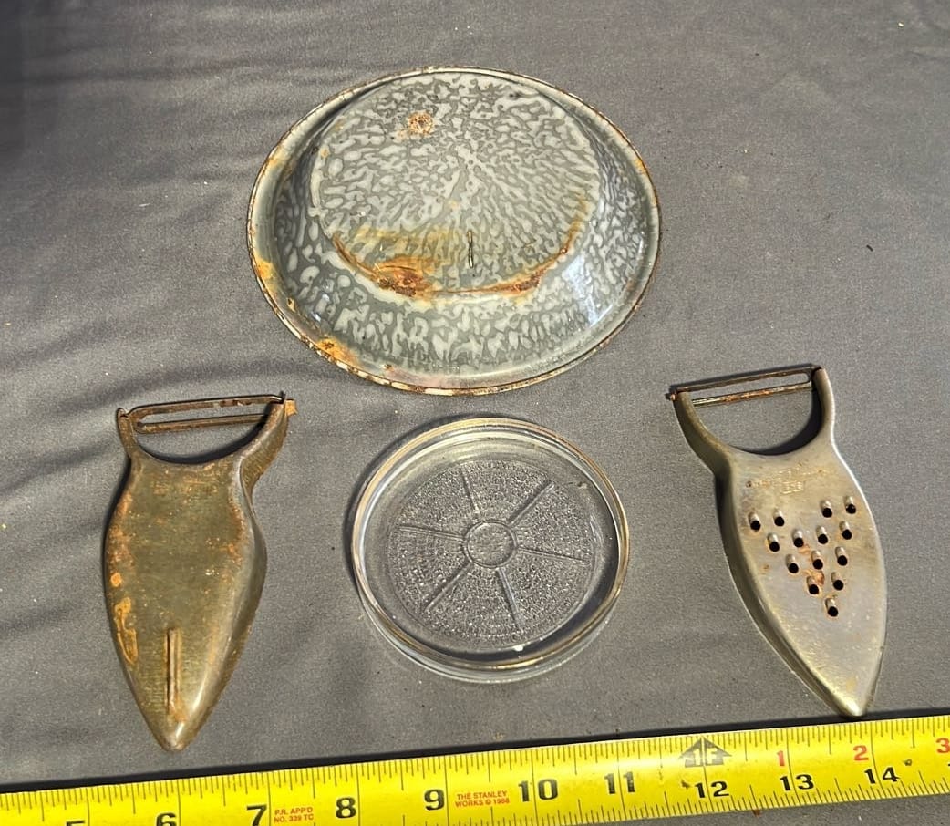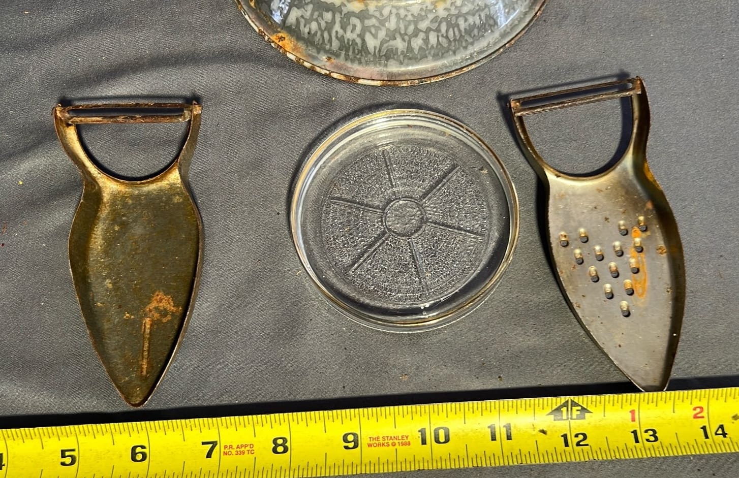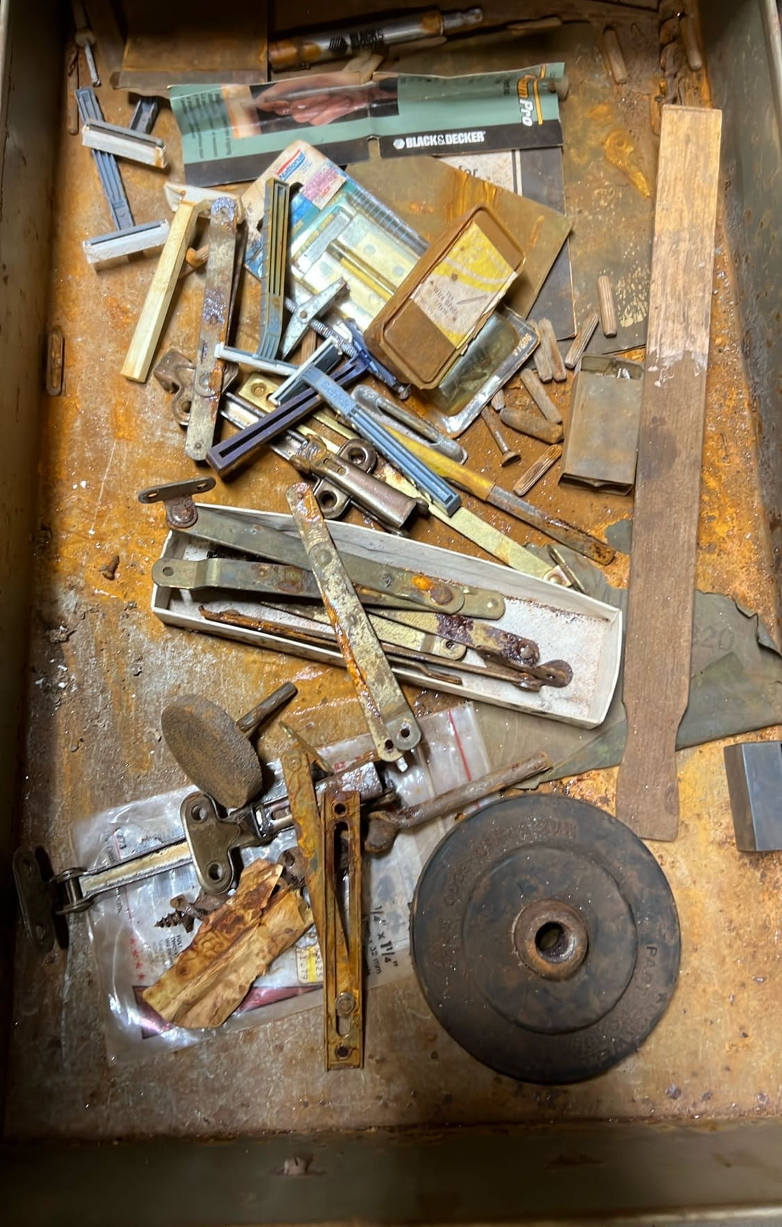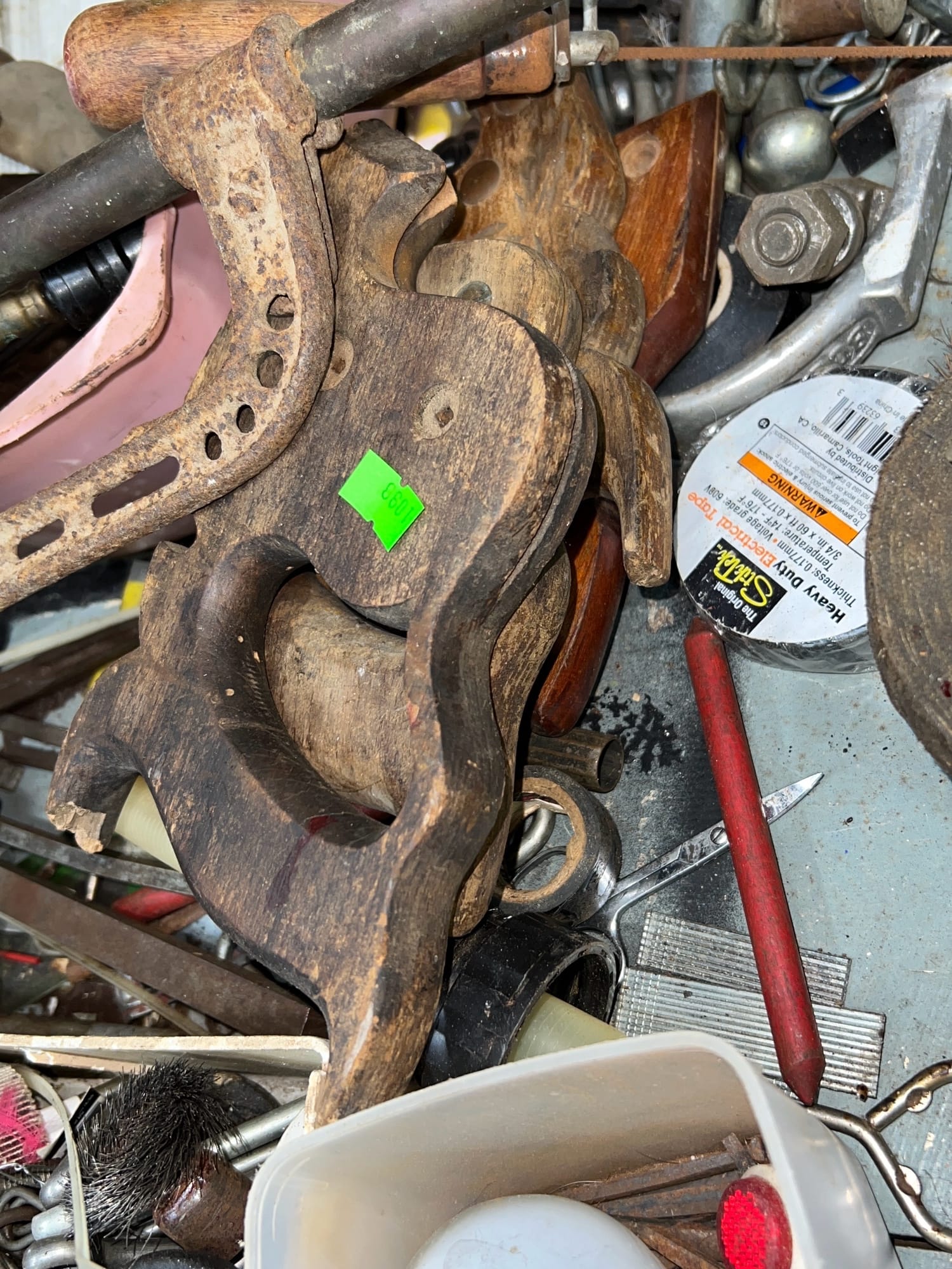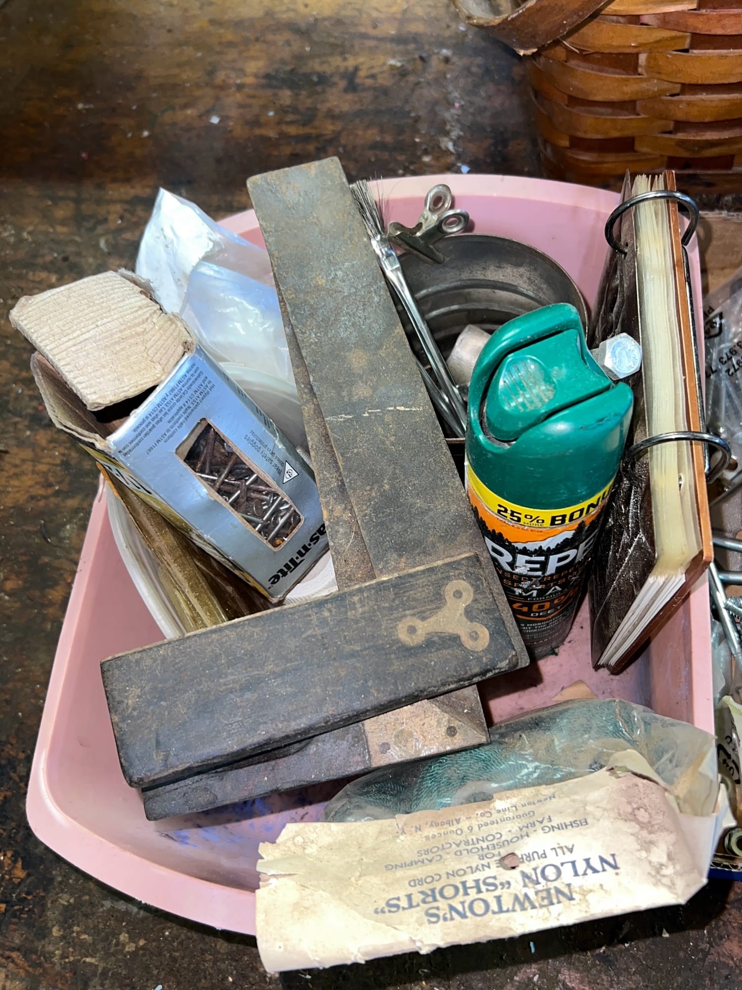 1107 Black & Decker #76-234 Deluxe Router Guide • Caster assortment (Rusty) • Gold Mining Pan 11” • Arrow 1/2” Staples • Aluminium Alloy Square • Splitting Wedge • misc