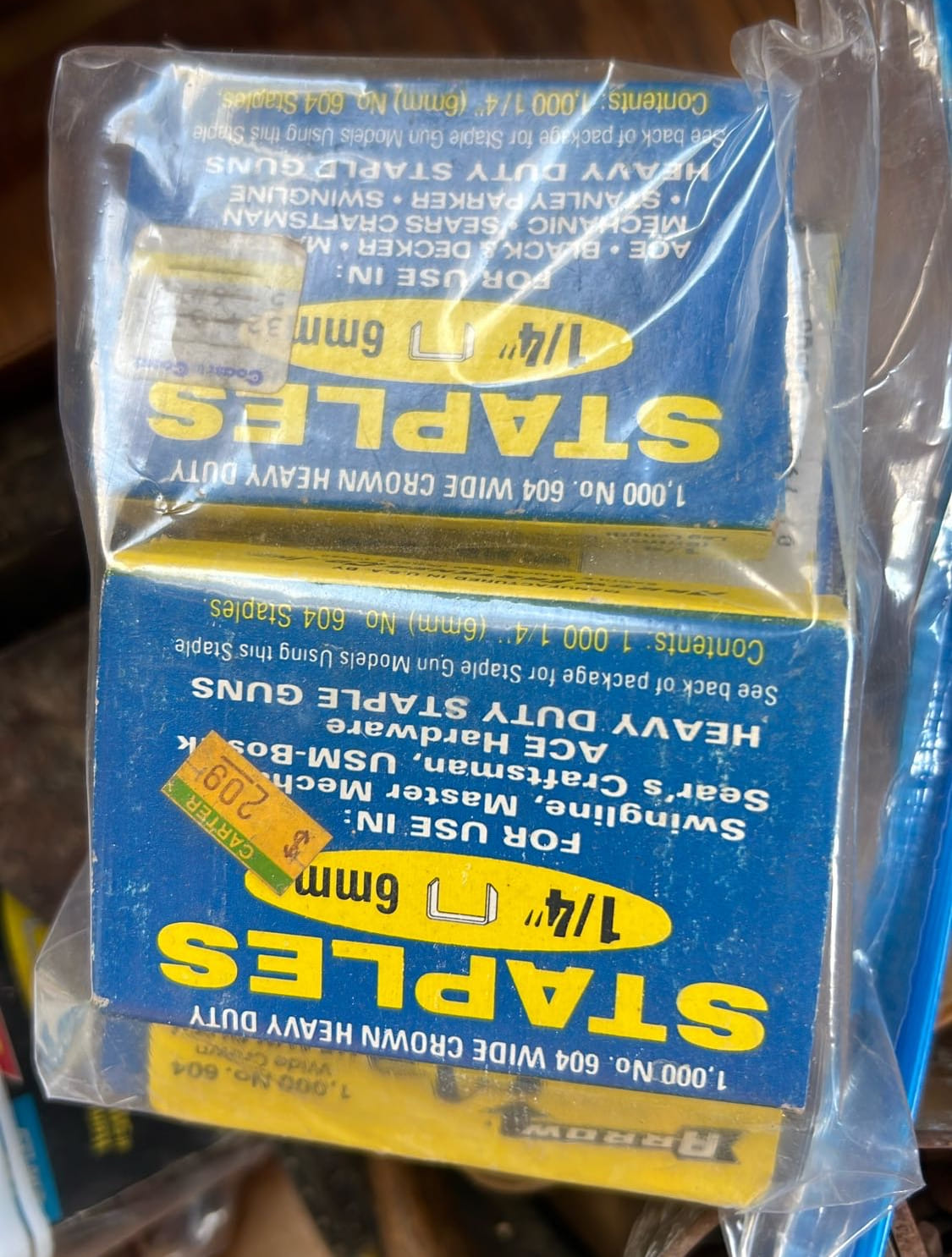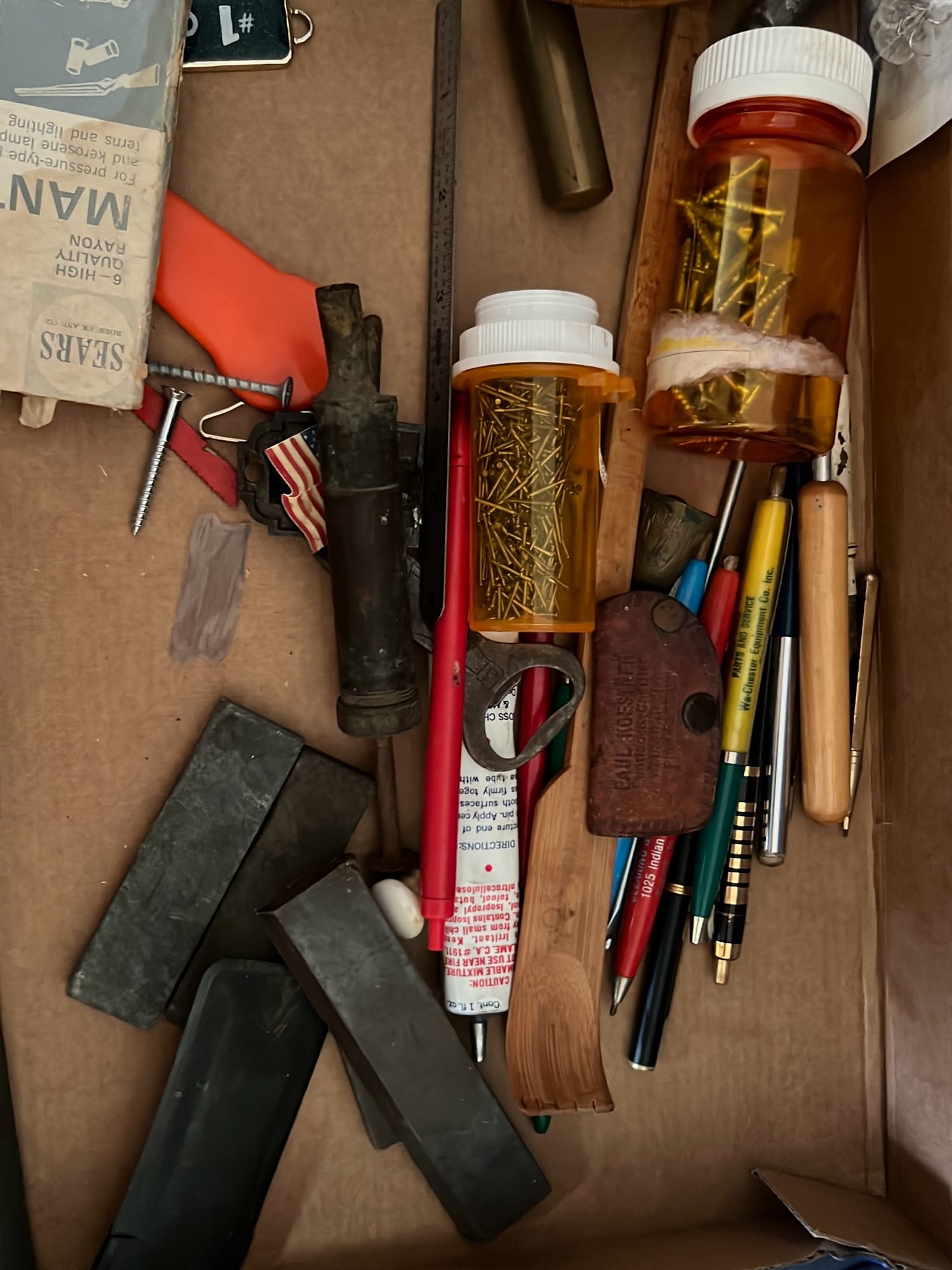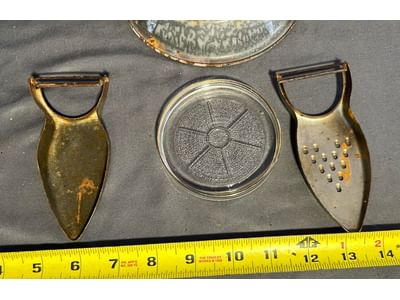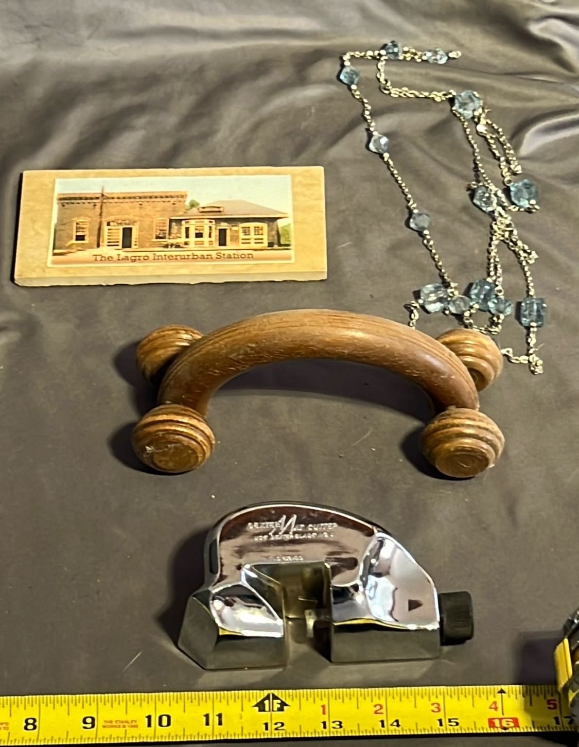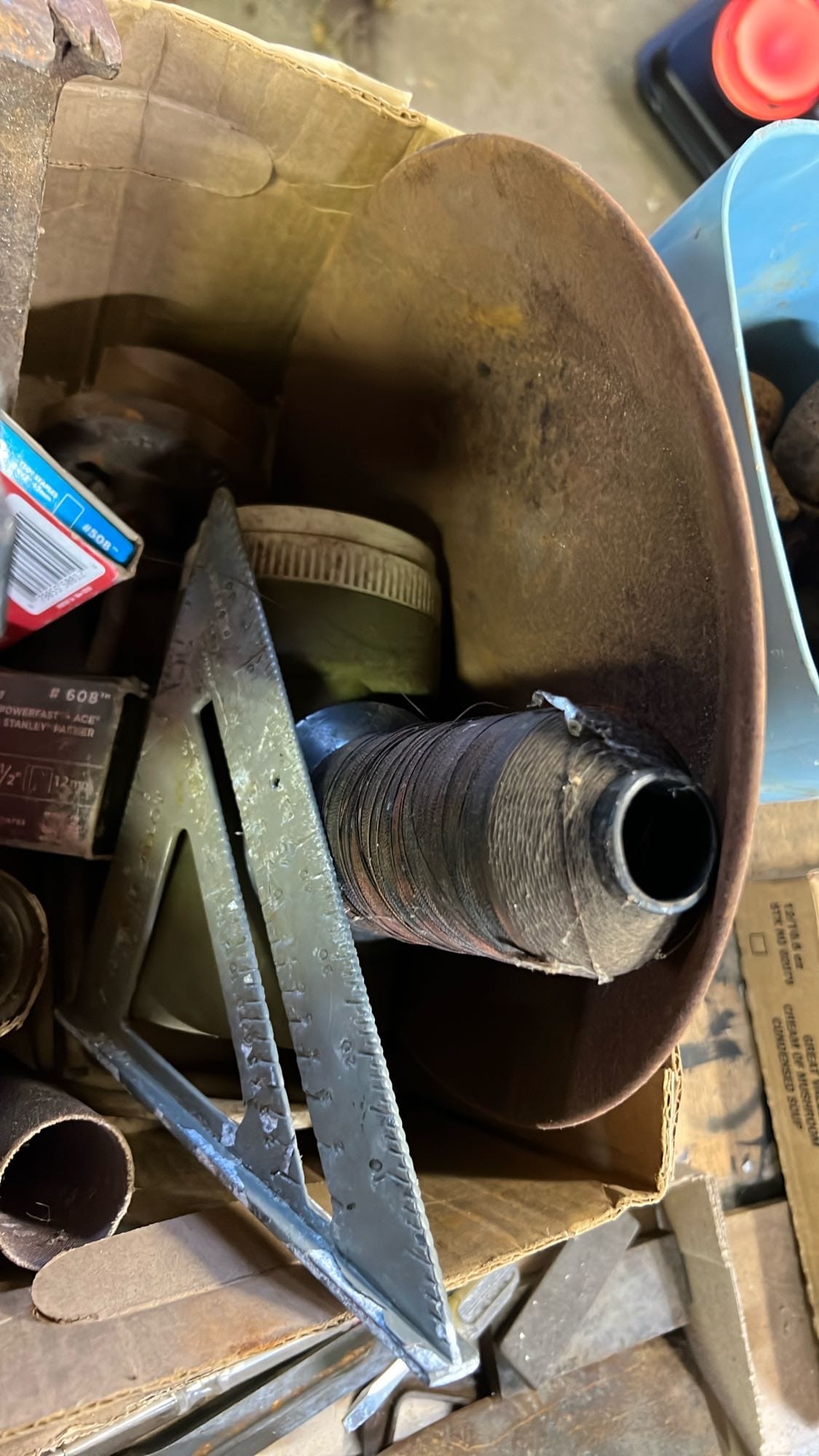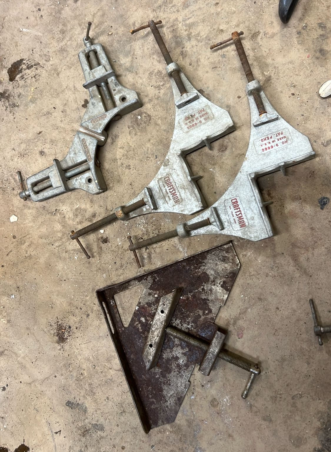 1107 Black & Decker #76-234 Deluxe Router Guide • Caster assortment (Rusty) • Gold Mining Pan 11” • Arrow 1/2” Staples • Aluminium Alloy Square • Splitting Wedge • misc