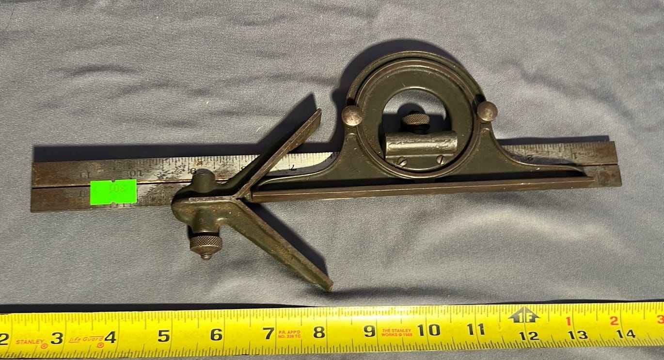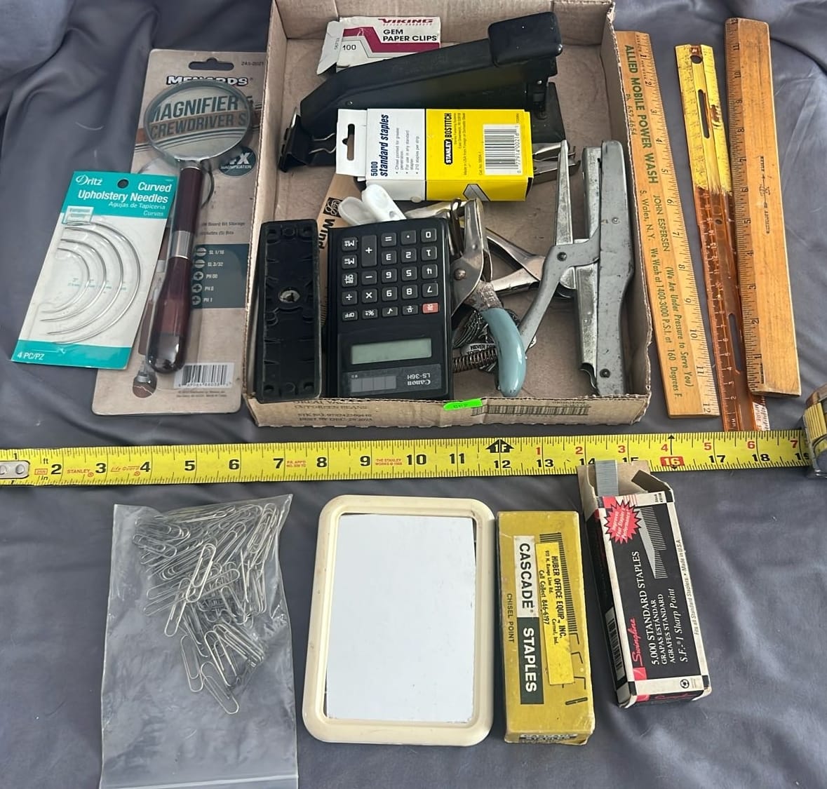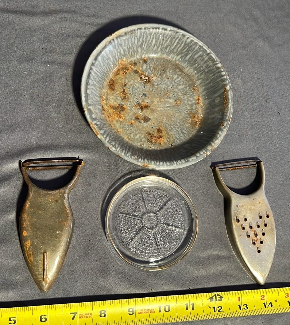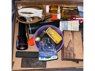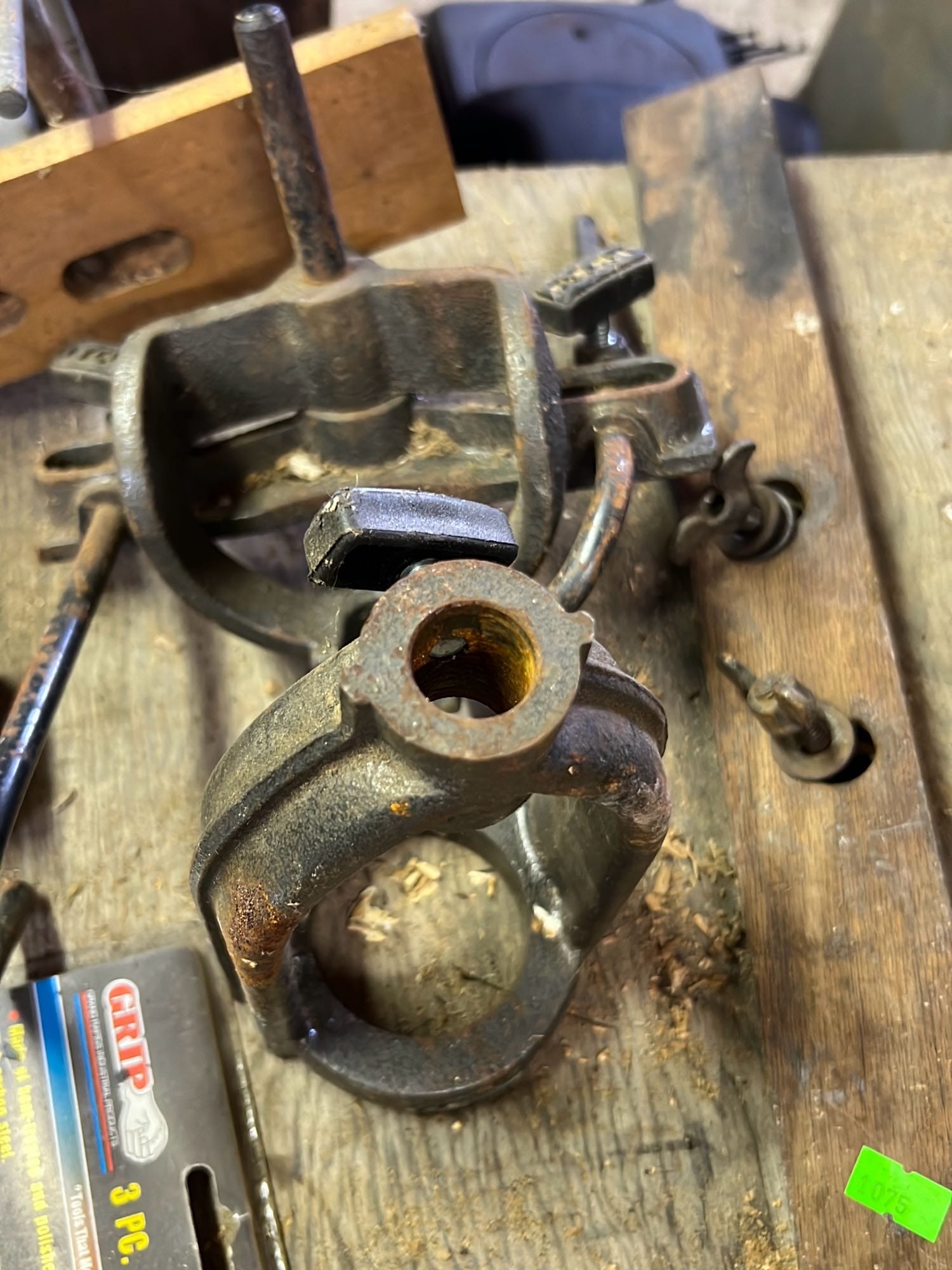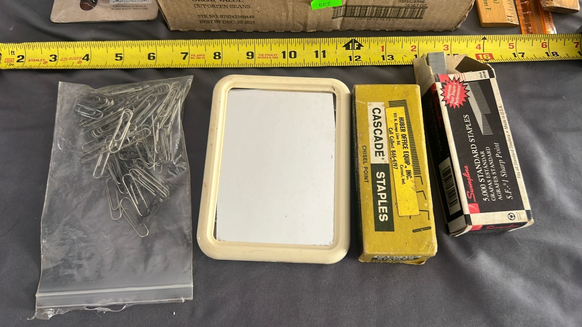 1107 Black & Decker #76-234 Deluxe Router Guide • Caster assortment (Rusty) • Gold Mining Pan 11” • Arrow 1/2” Staples • Aluminium Alloy Square • Splitting Wedge • misc