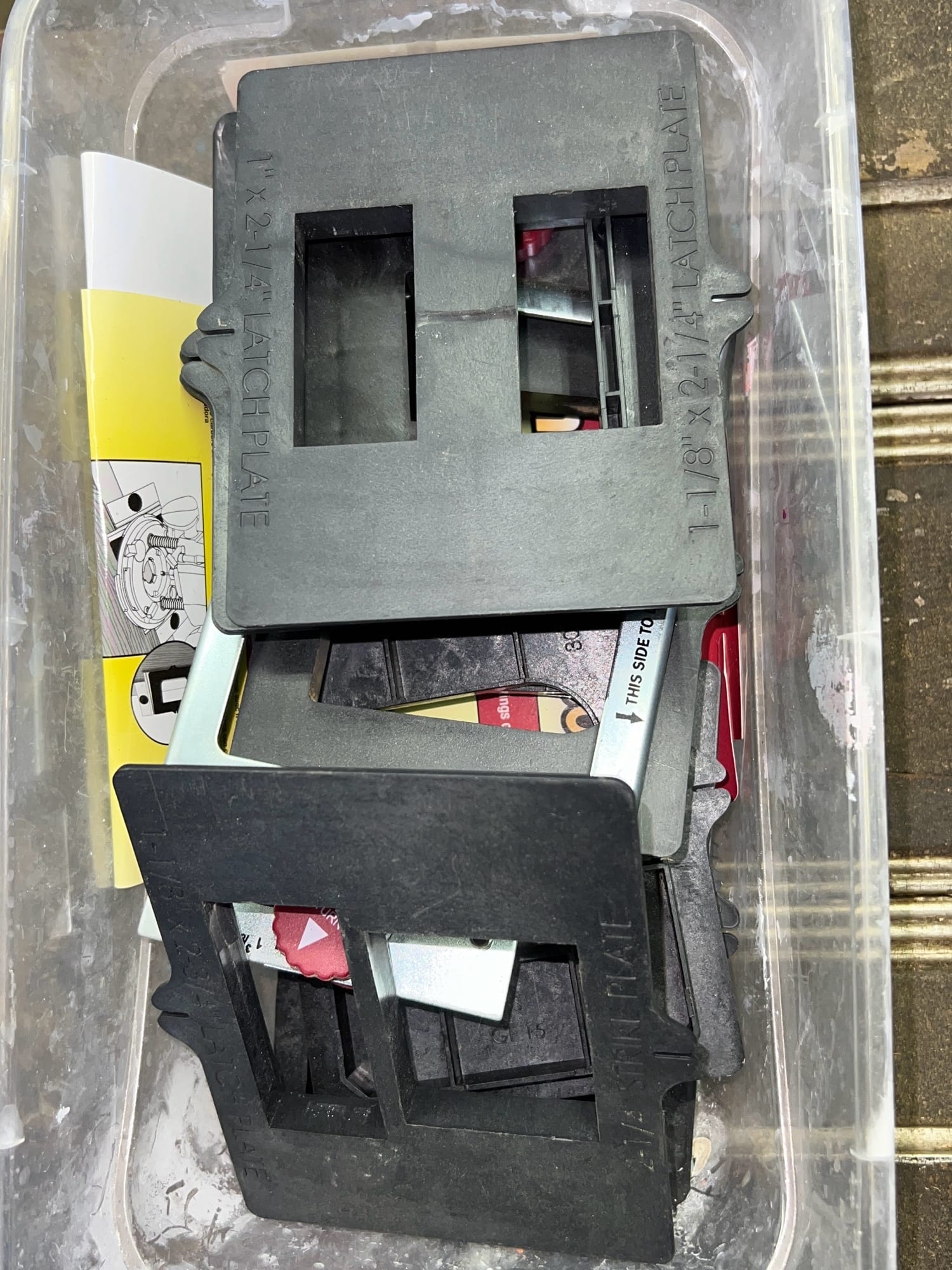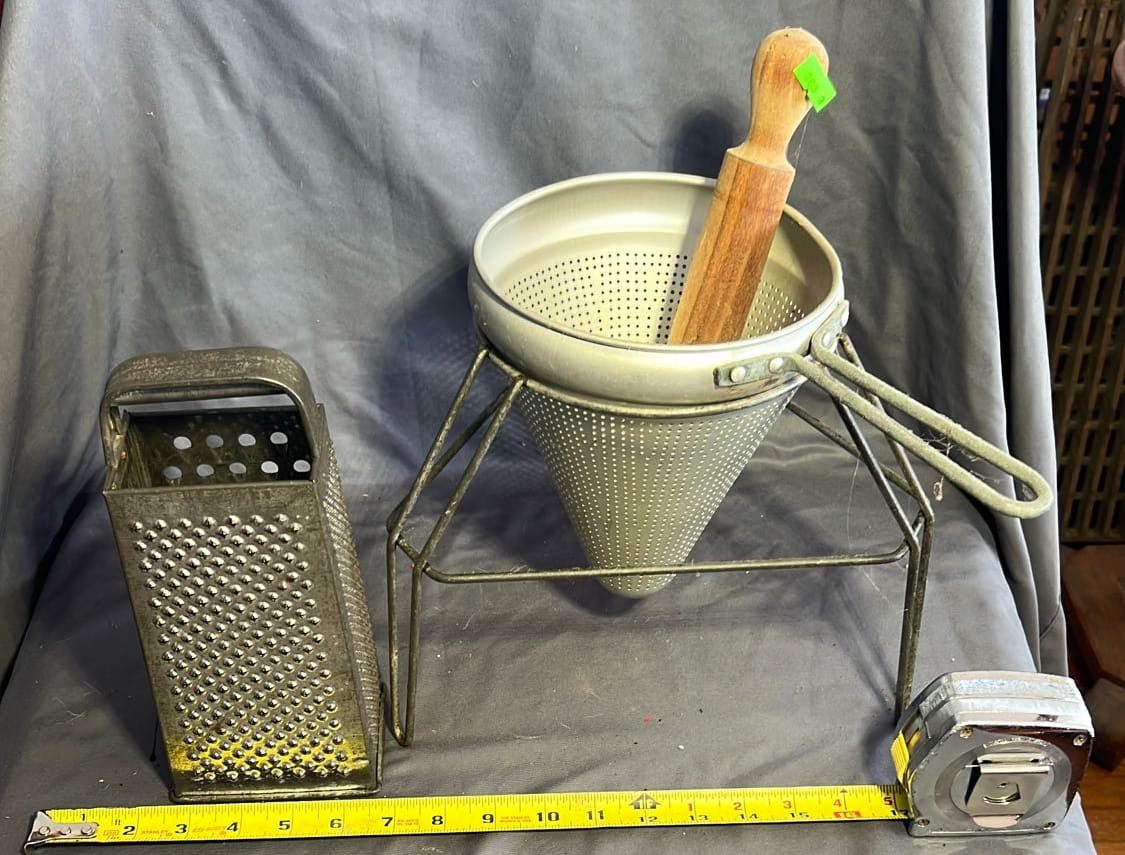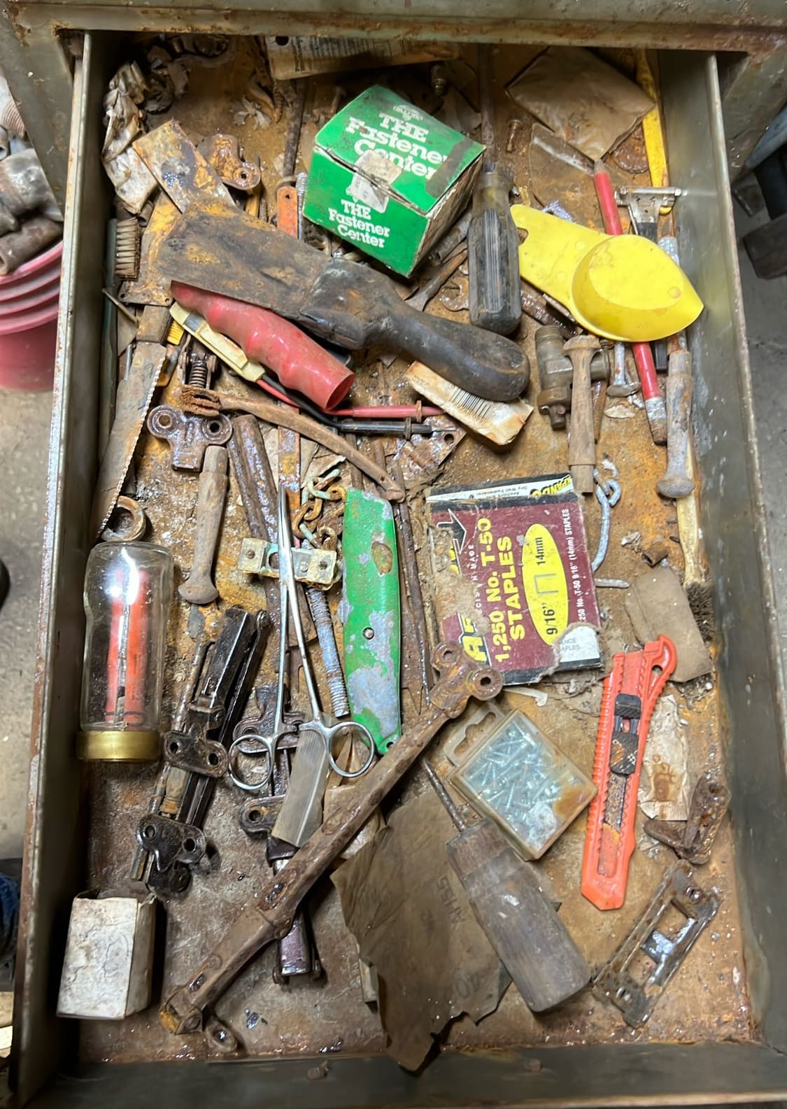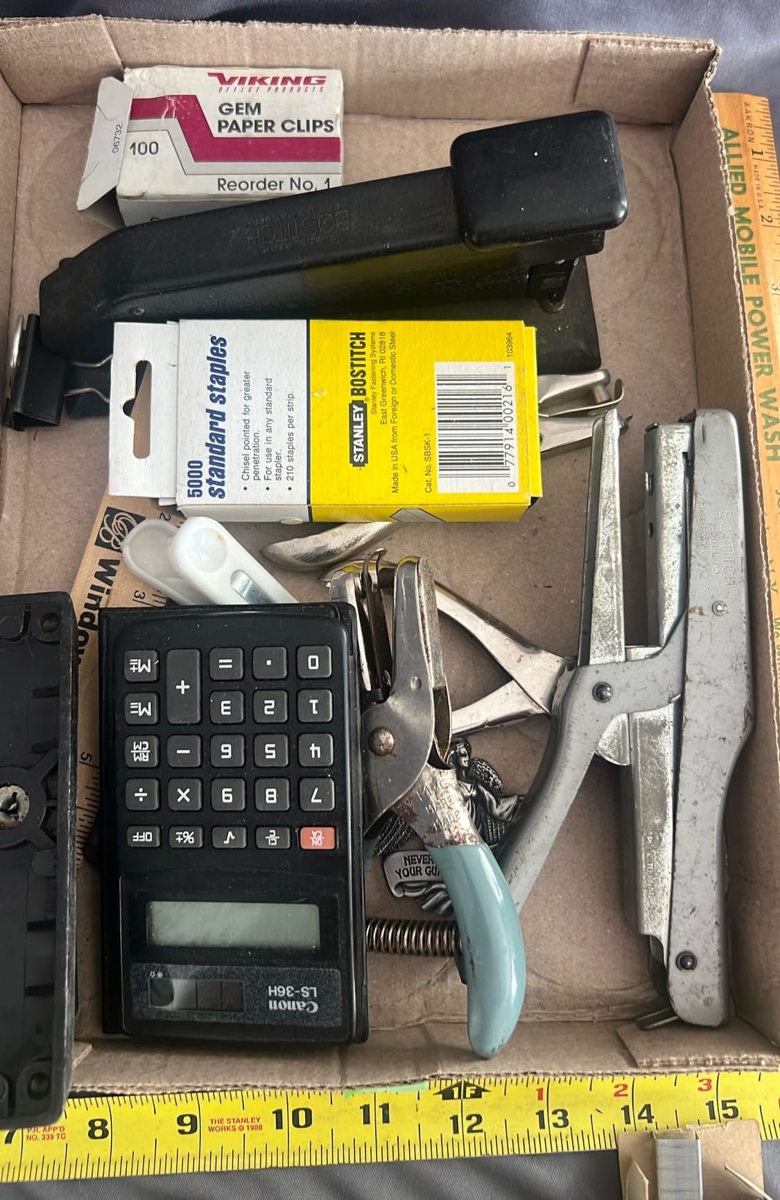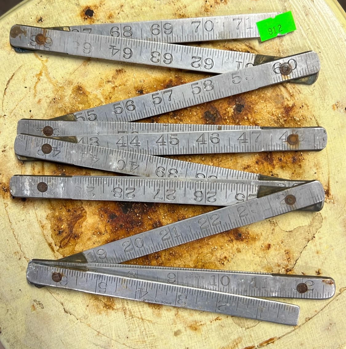 1107 Black & Decker #76-234 Deluxe Router Guide • Caster assortment (Rusty) • Gold Mining Pan 11” • Arrow 1/2” Staples • Aluminium Alloy Square • Splitting Wedge • misc