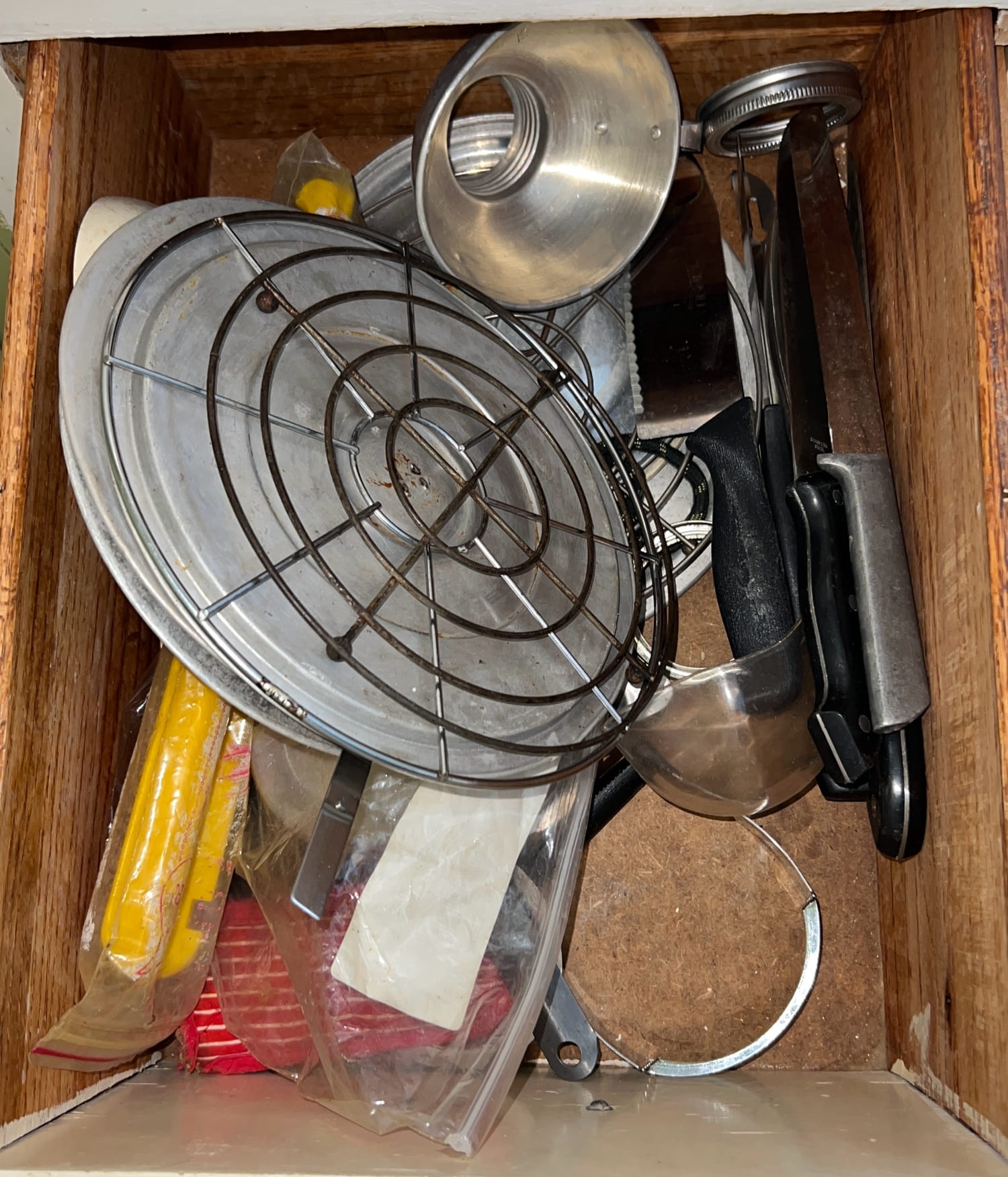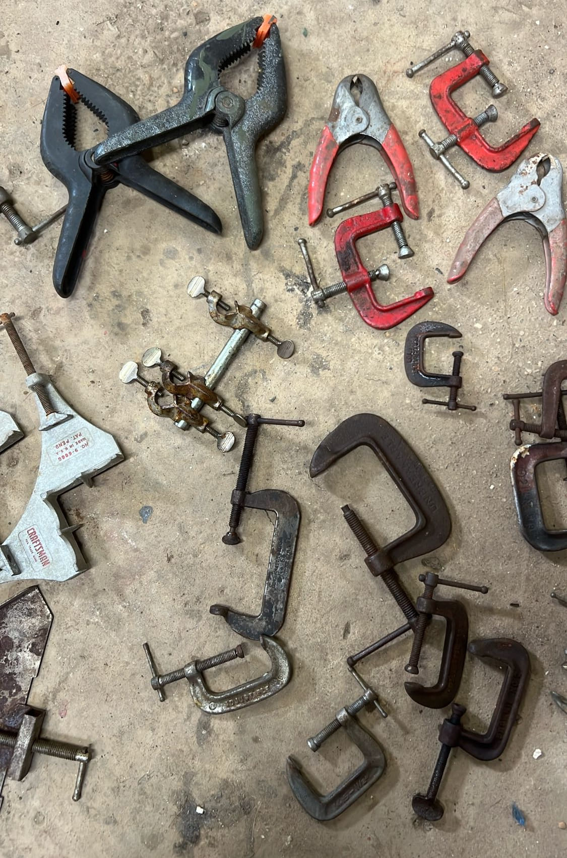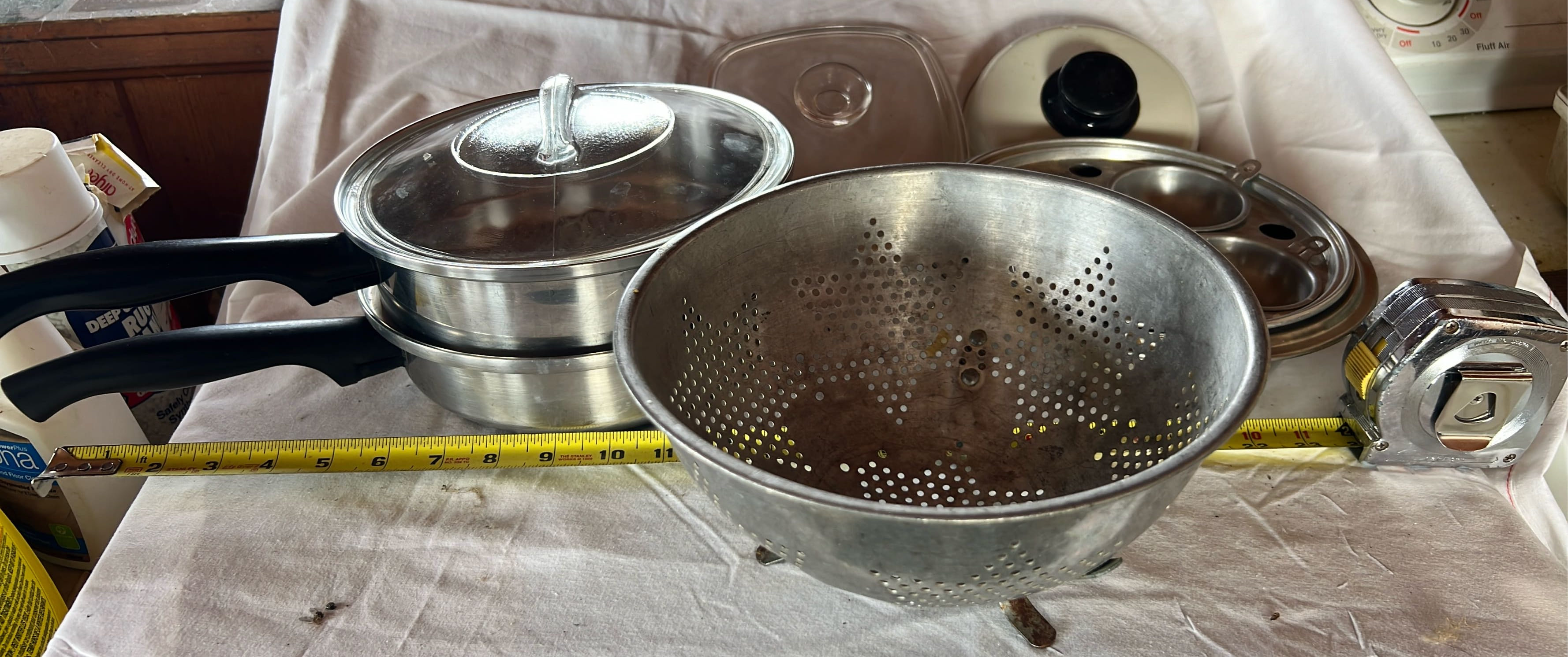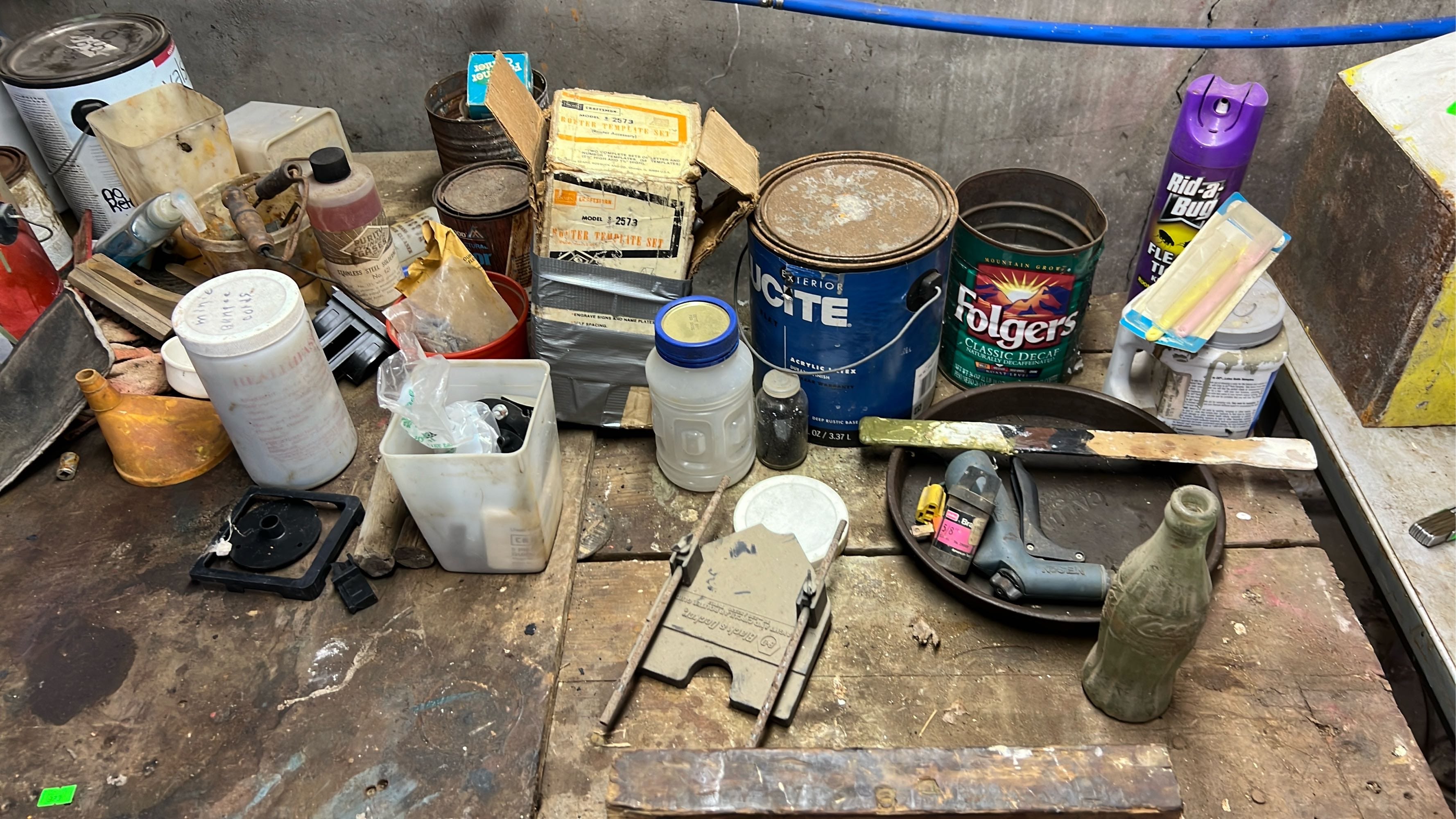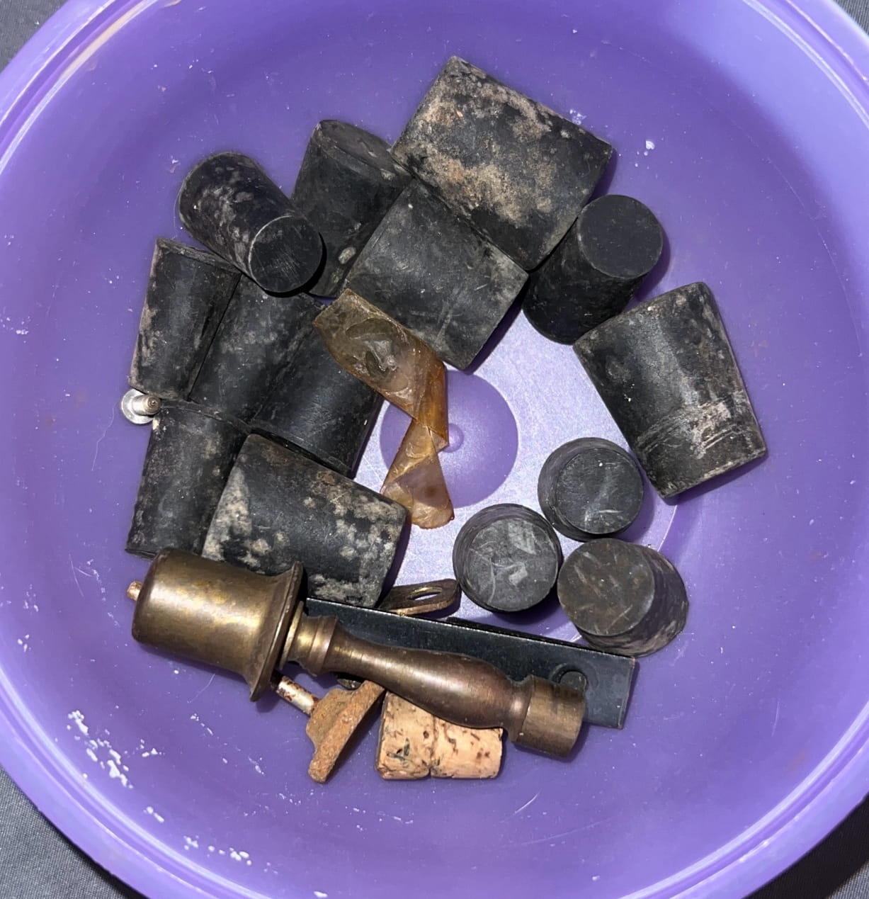 1107 Black & Decker #76-234 Deluxe Router Guide • Caster assortment (Rusty) • Gold Mining Pan 11” • Arrow 1/2” Staples • Aluminium Alloy Square • Splitting Wedge • misc