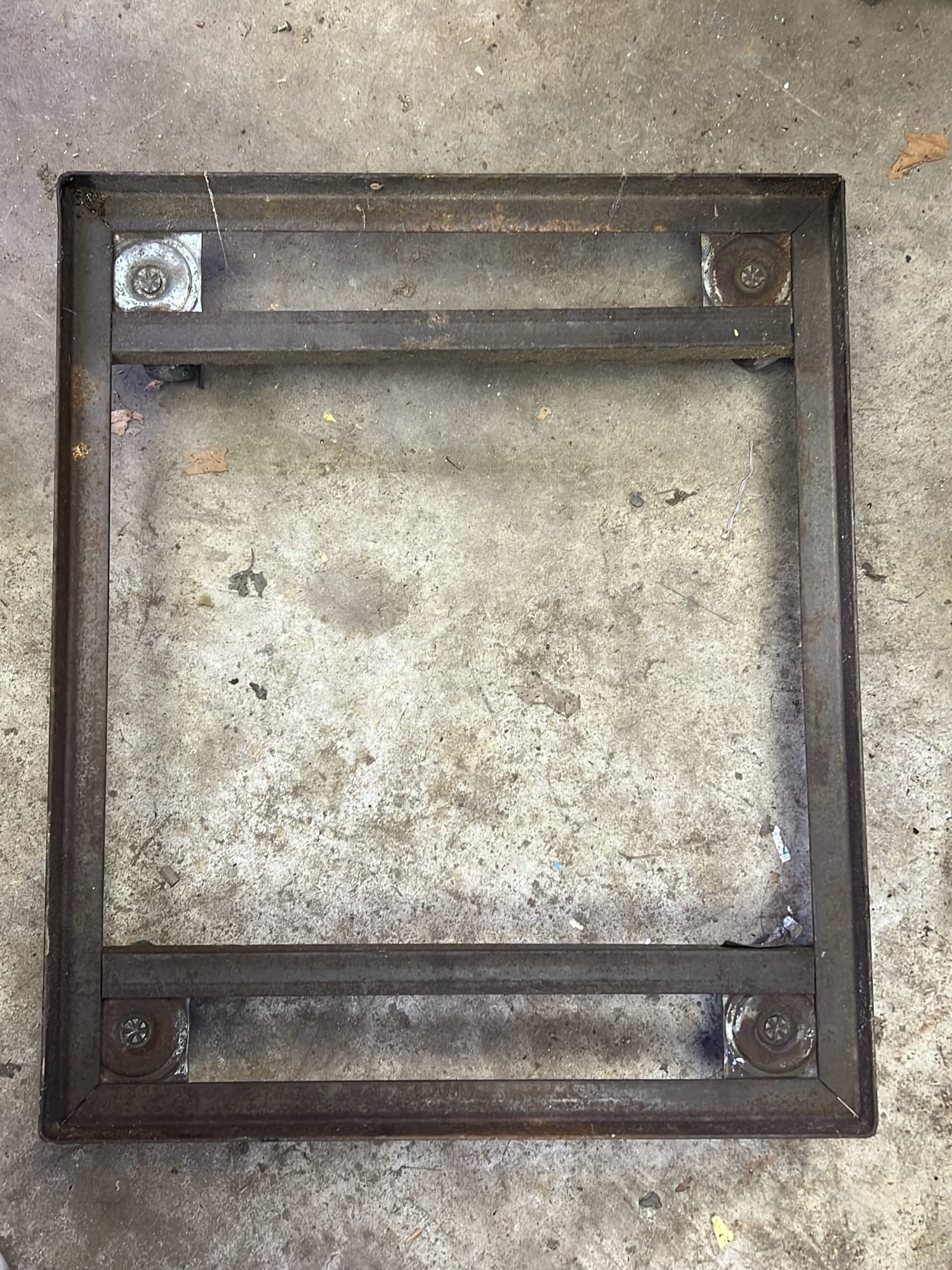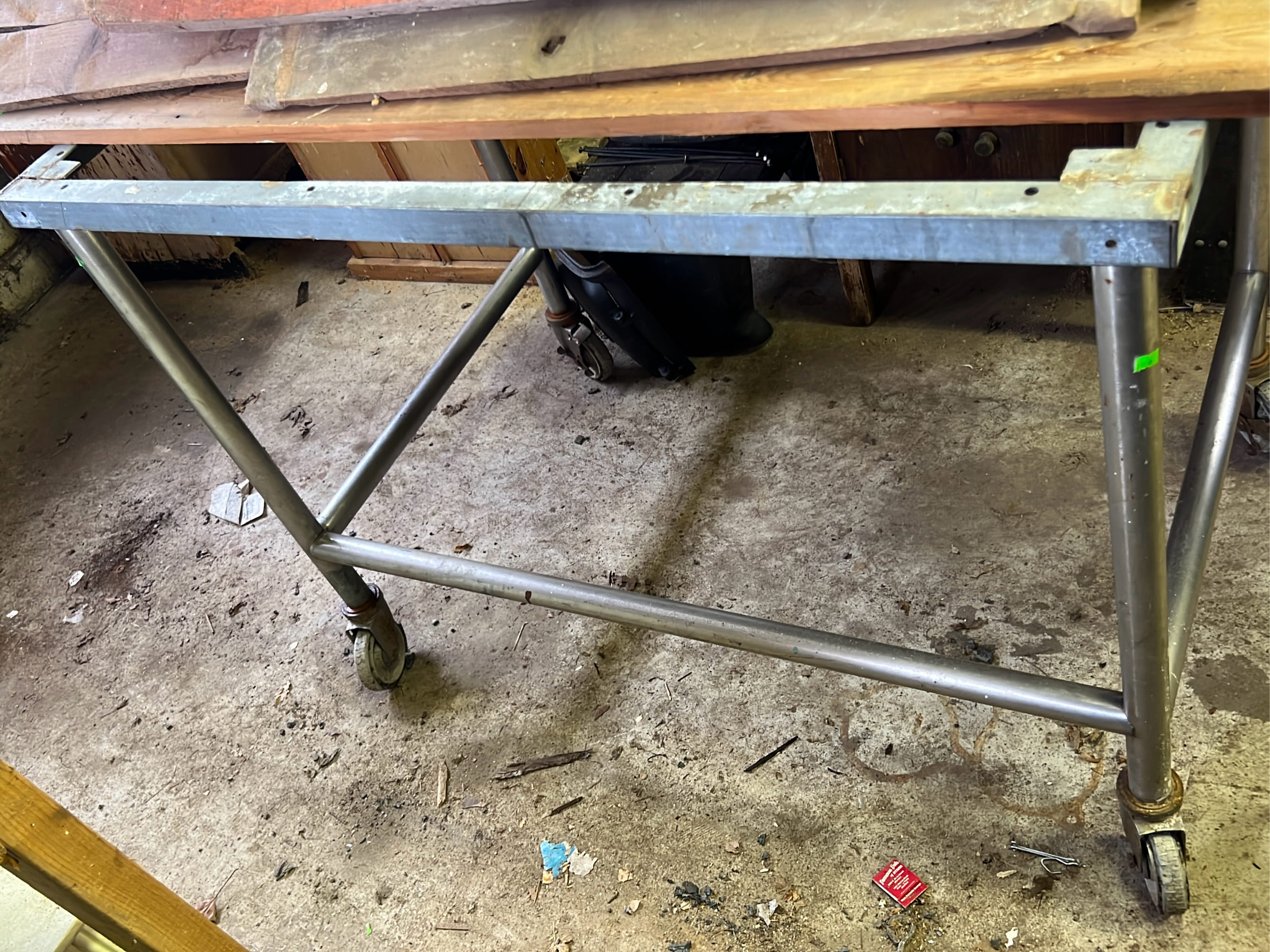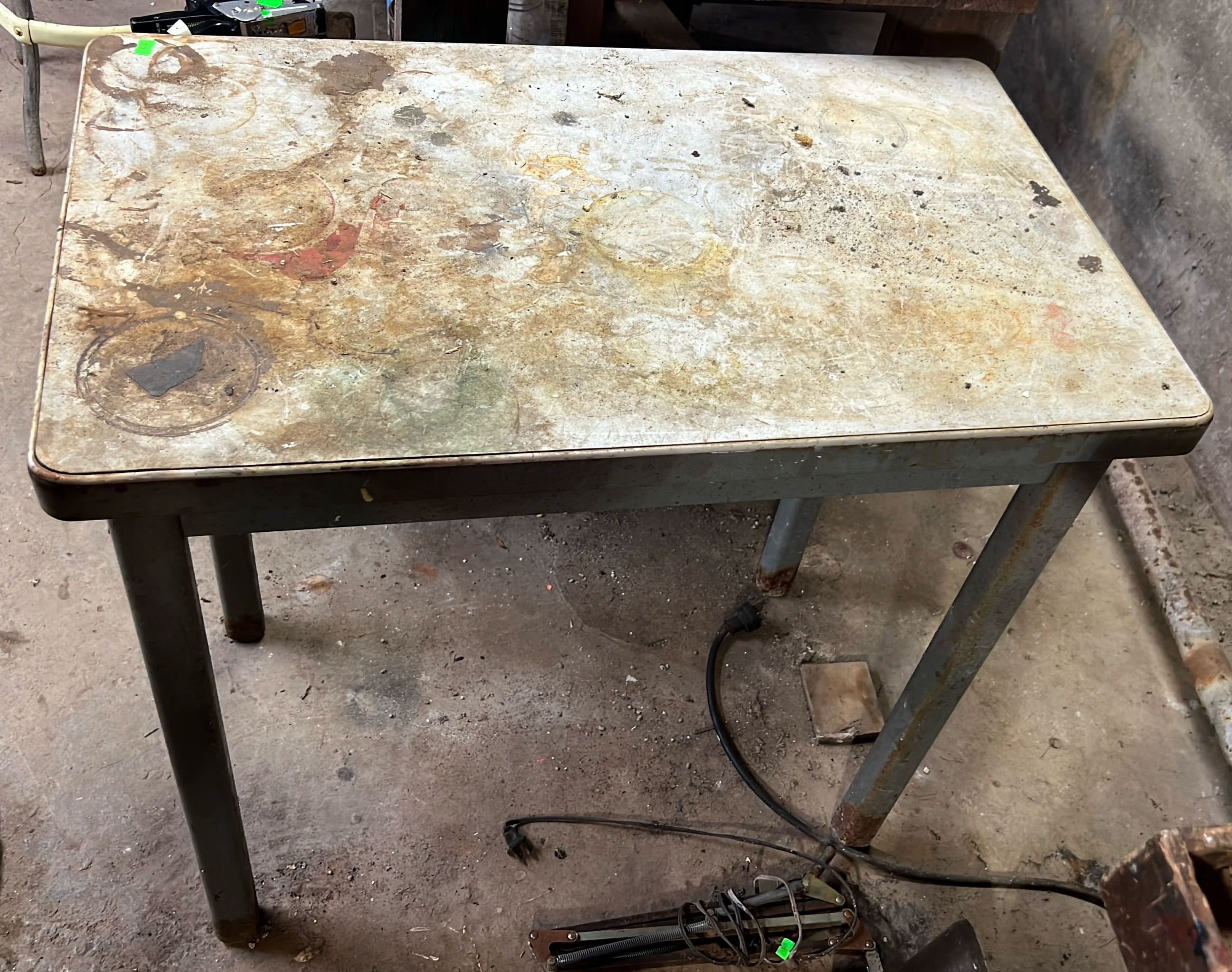 1137 Metal framed table with plywood top 34”x32”x 22”, contents not included