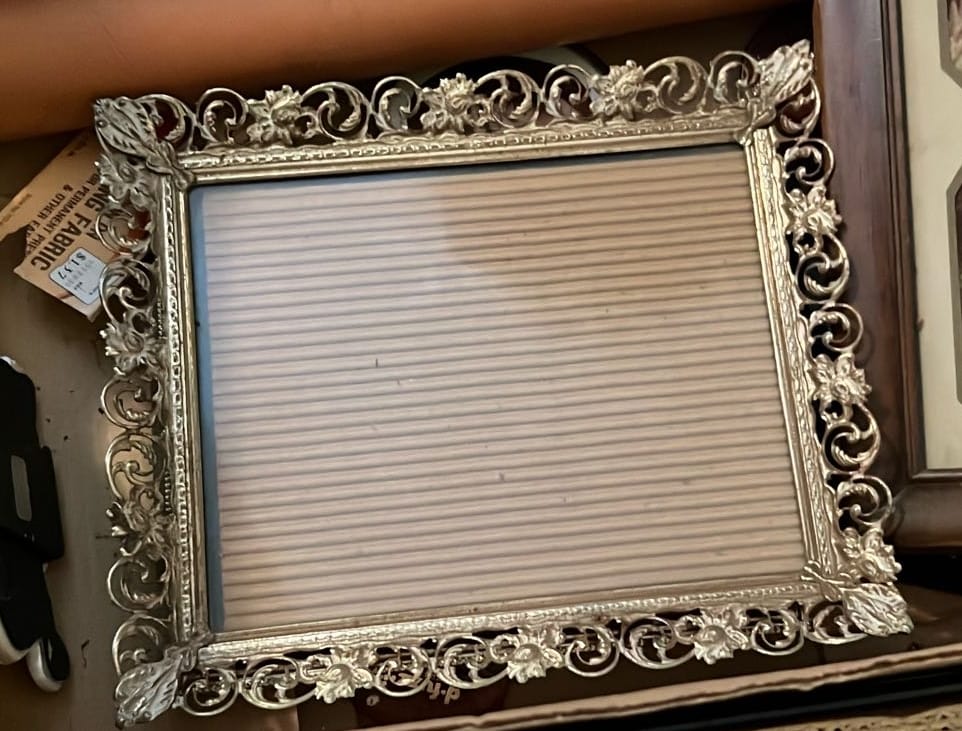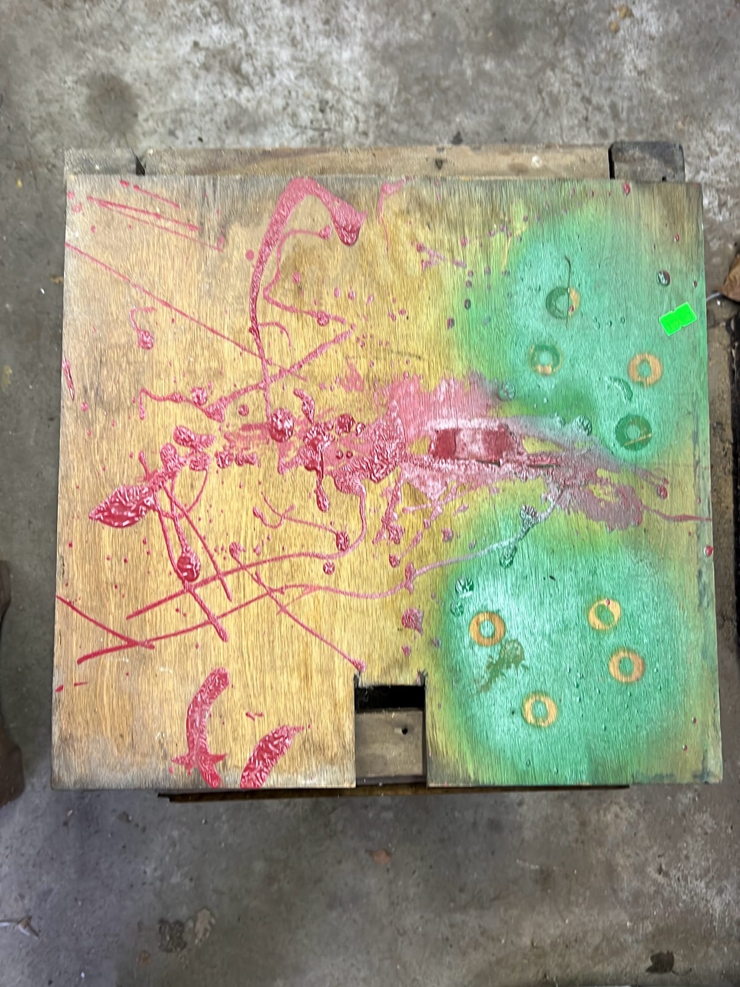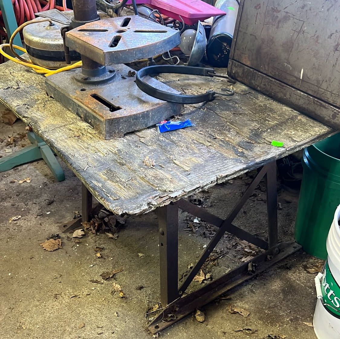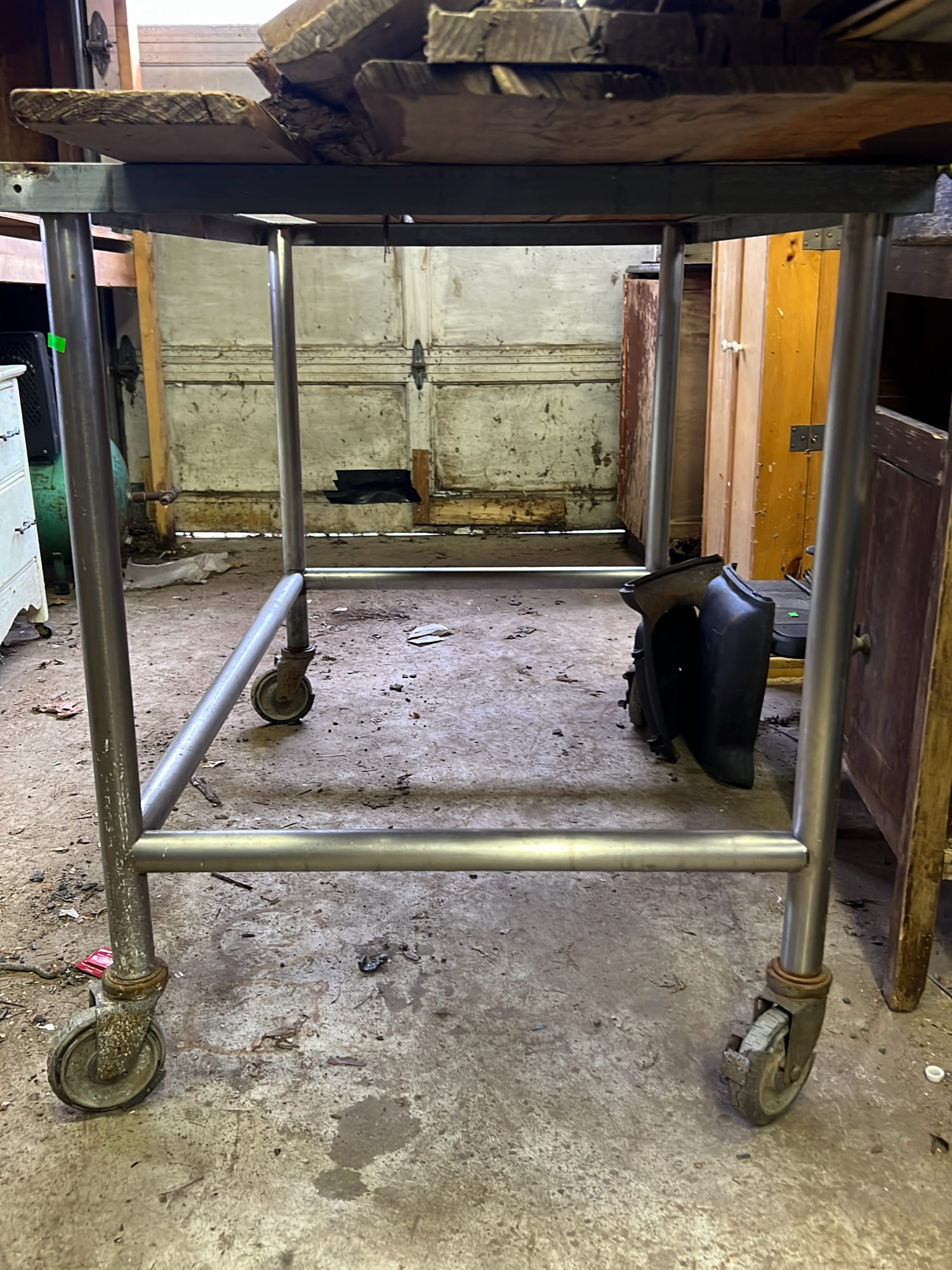 1137 Metal framed table with plywood top 34”x32”x 22”, contents not included