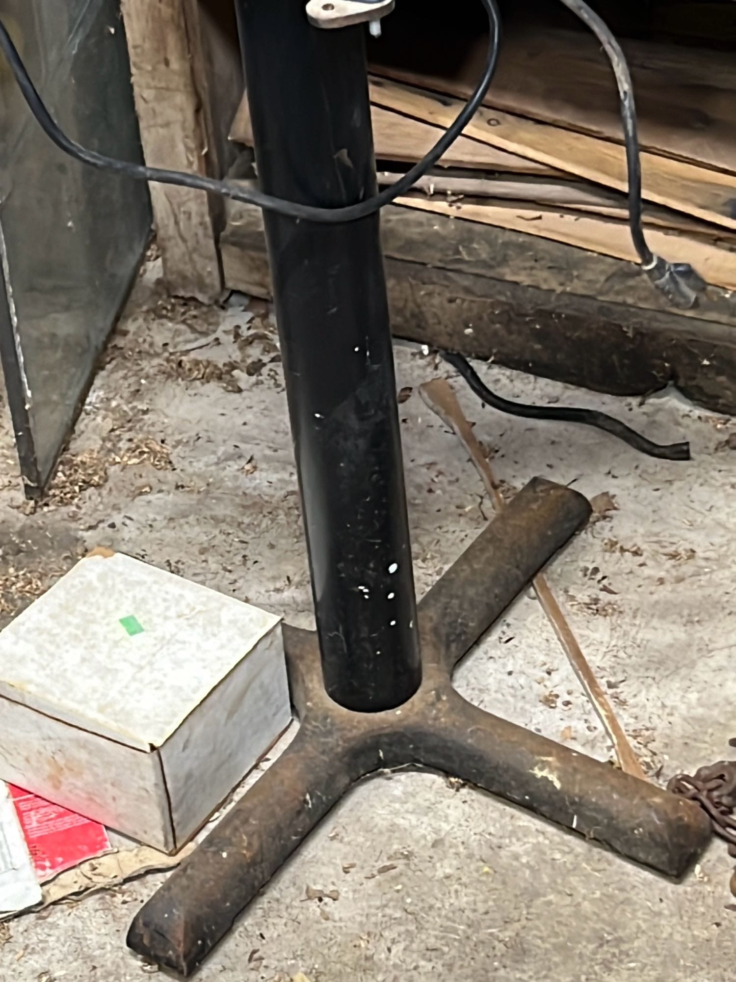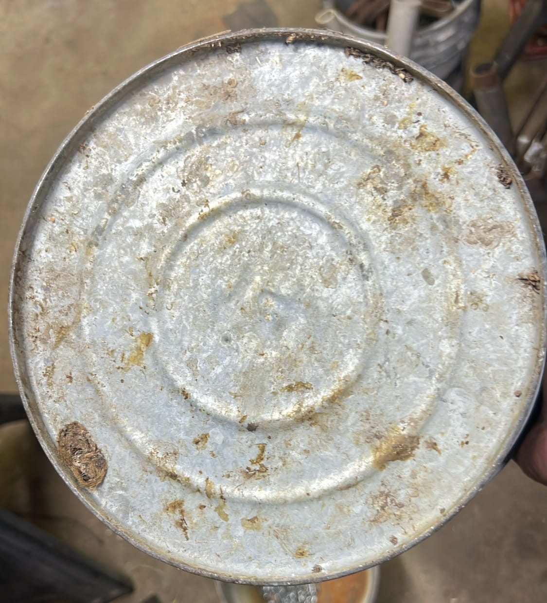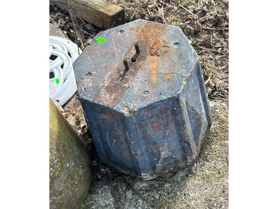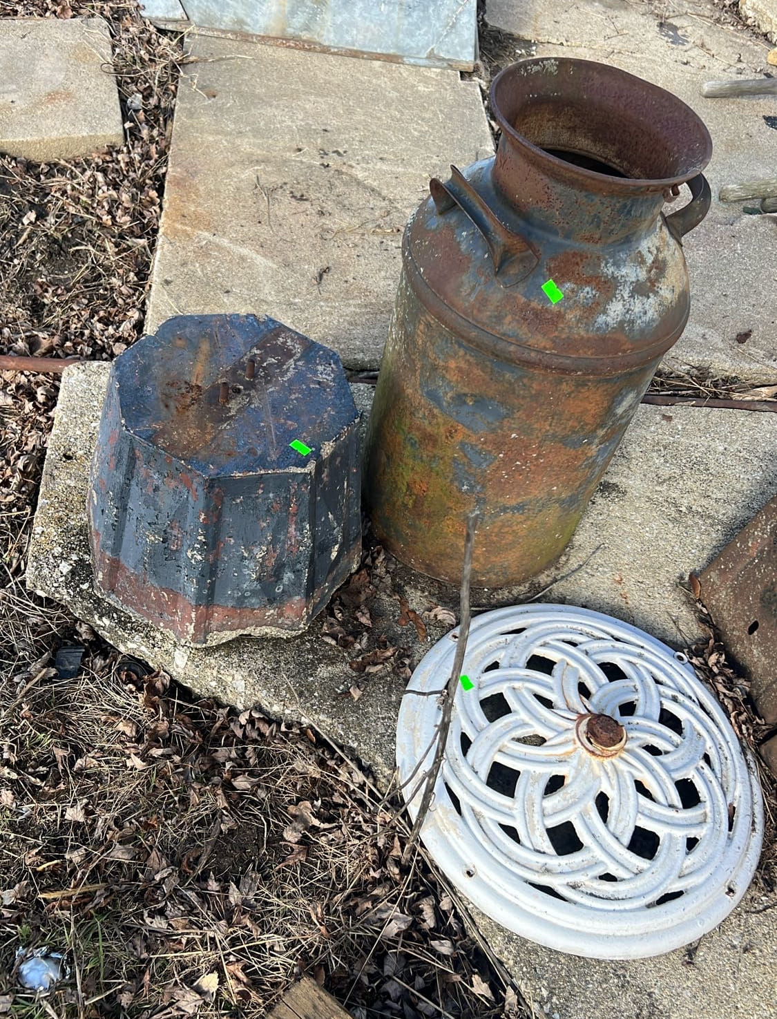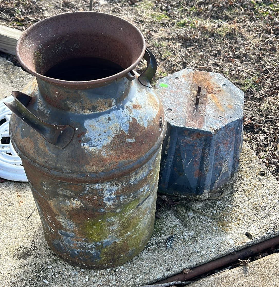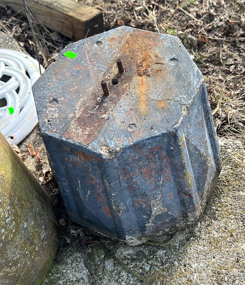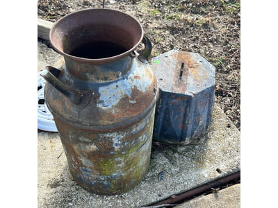 1173 Milk can half full of cement 24”, mail box base, metal umbrella base 18”
