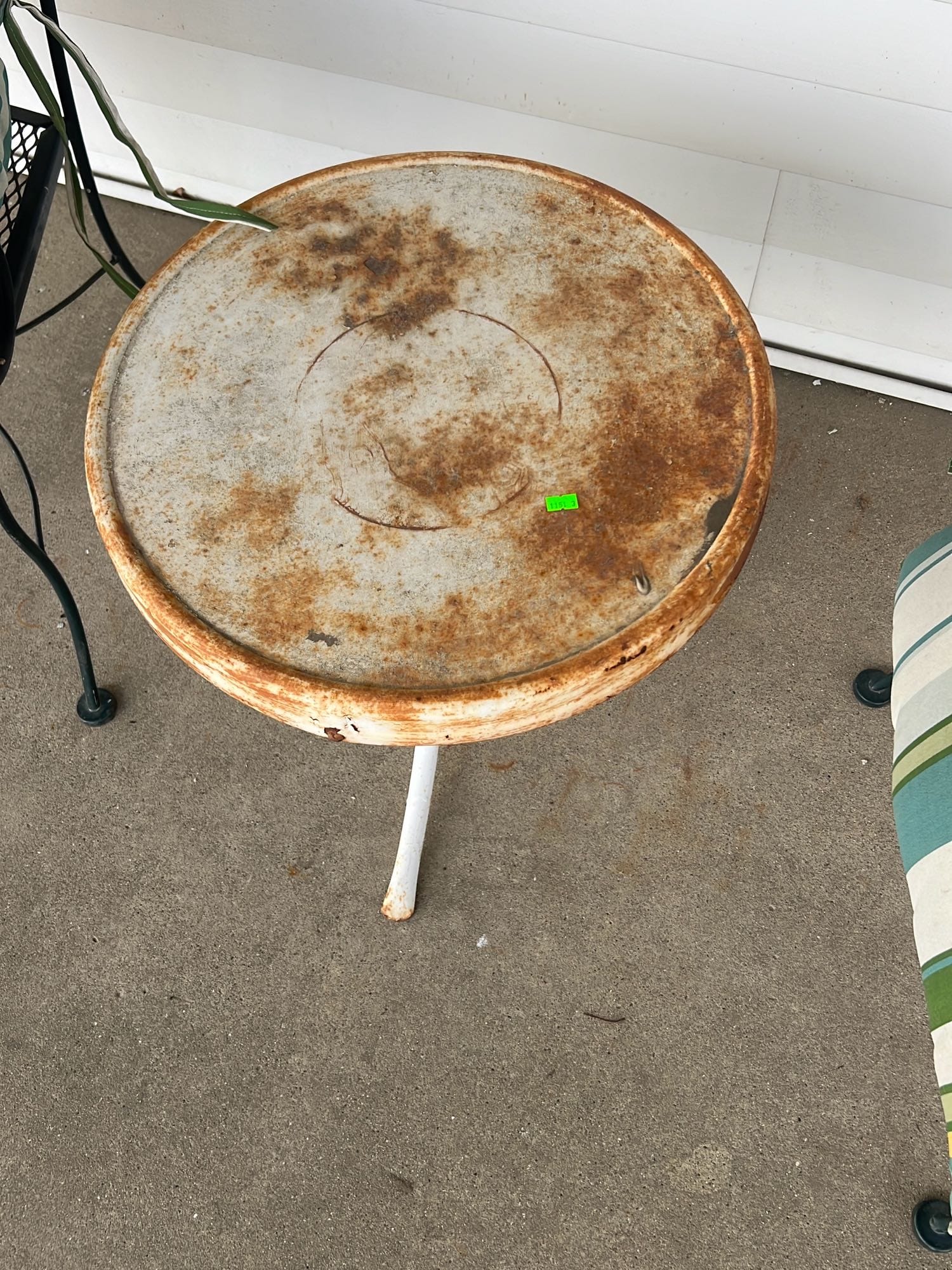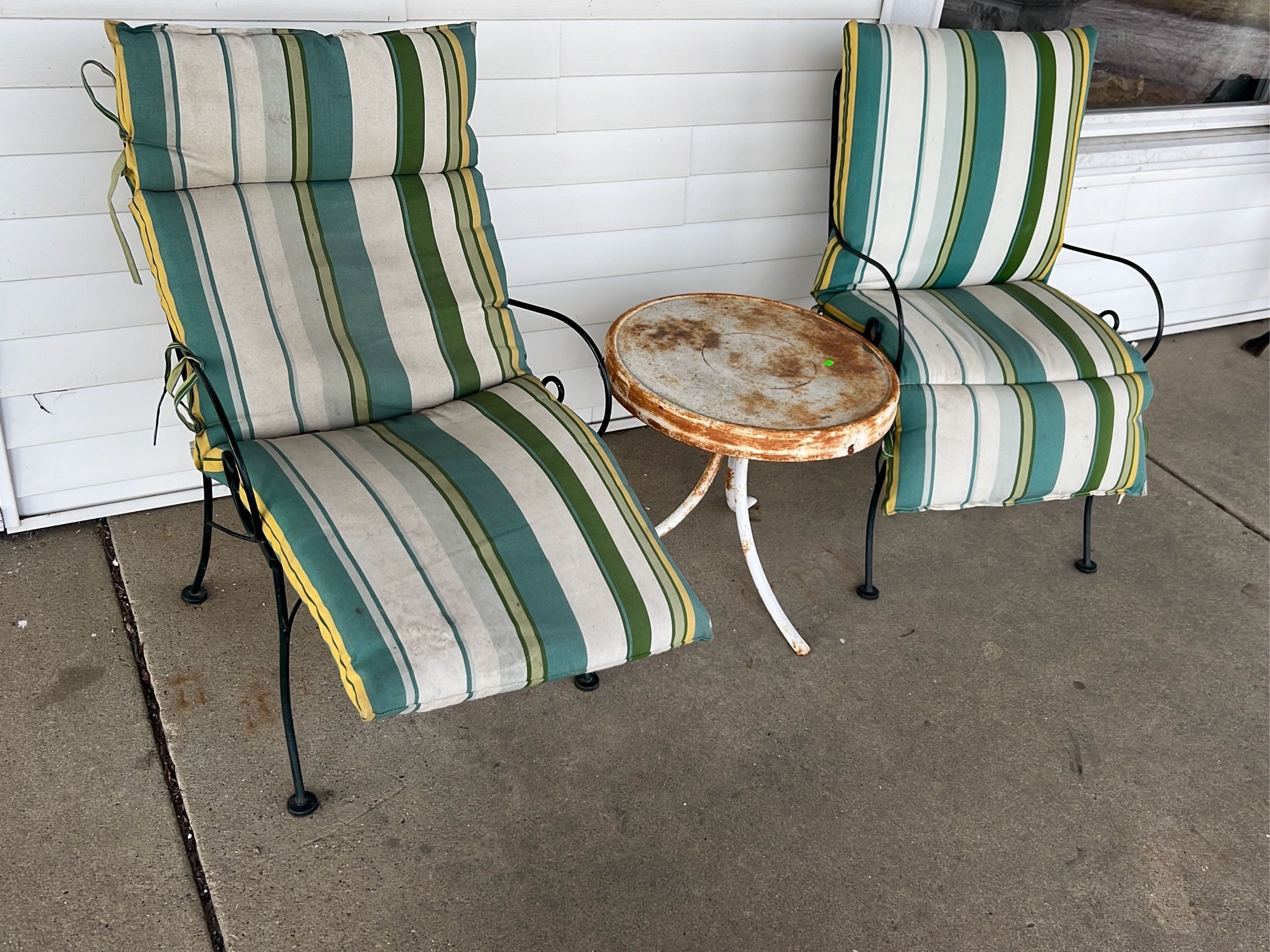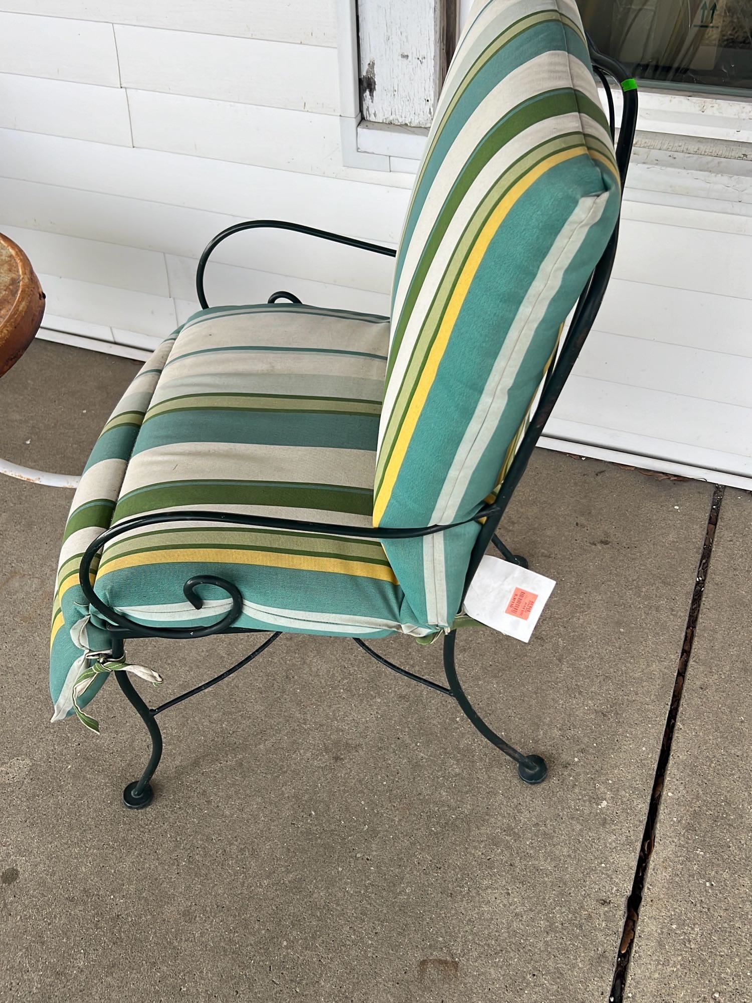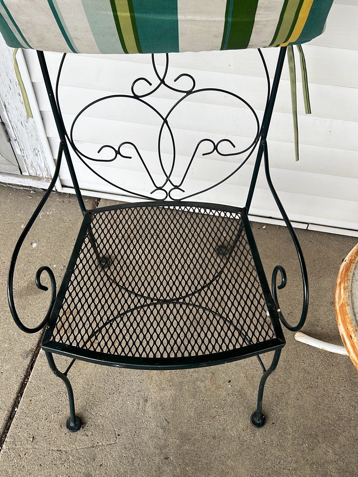1151 2 Metal Patio chairs with cushions & patio table 20.5”x18.5”