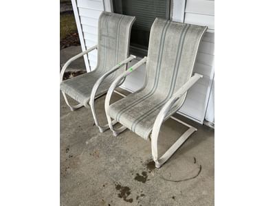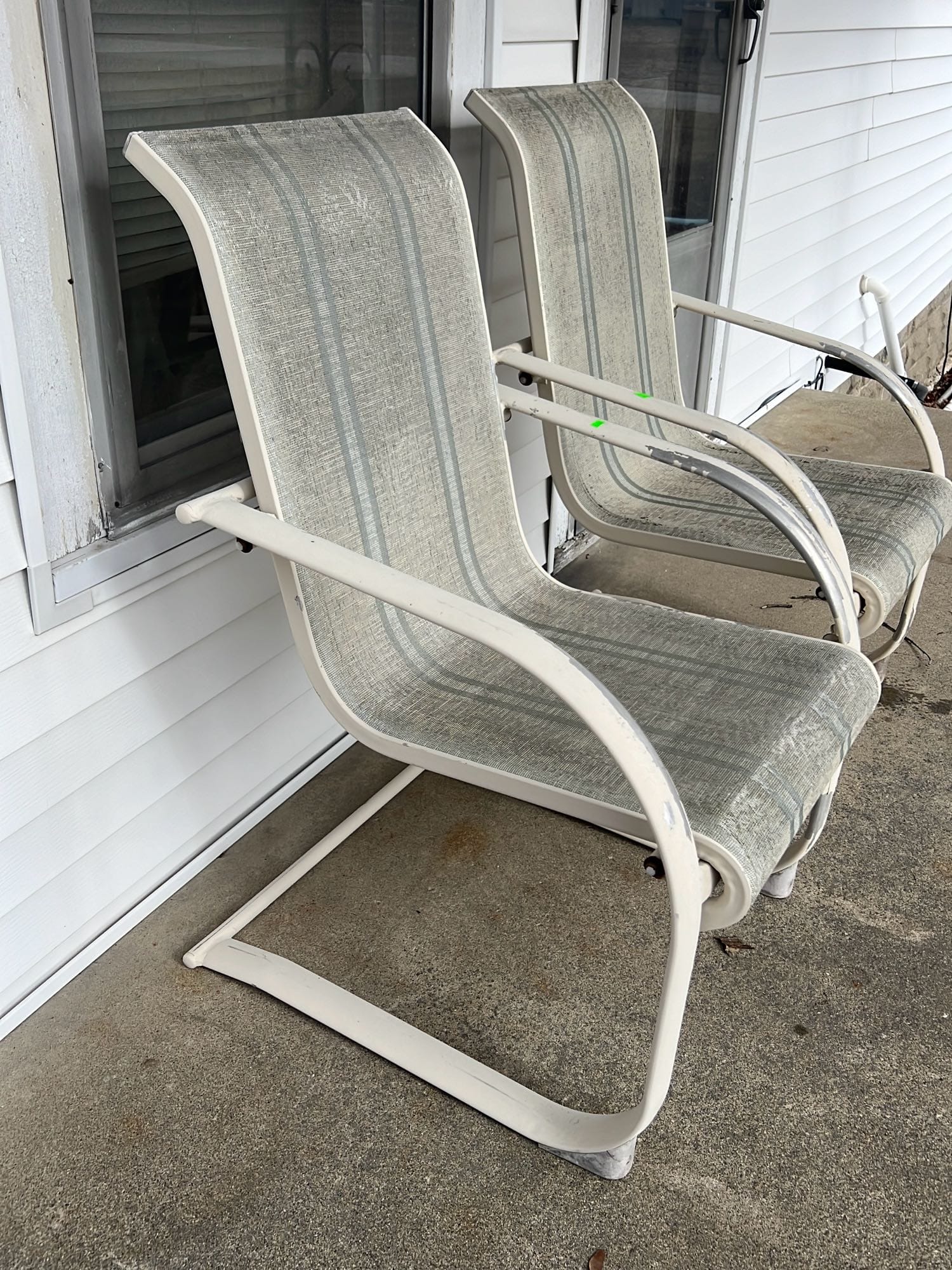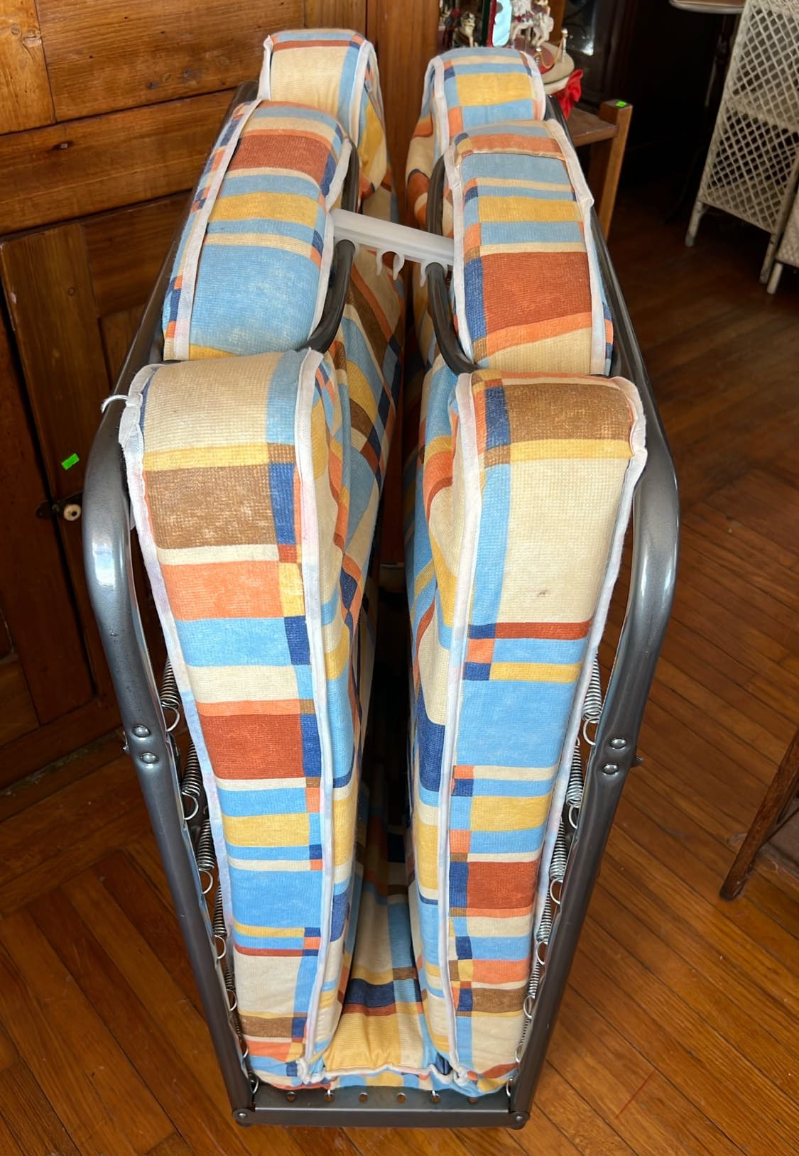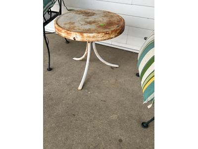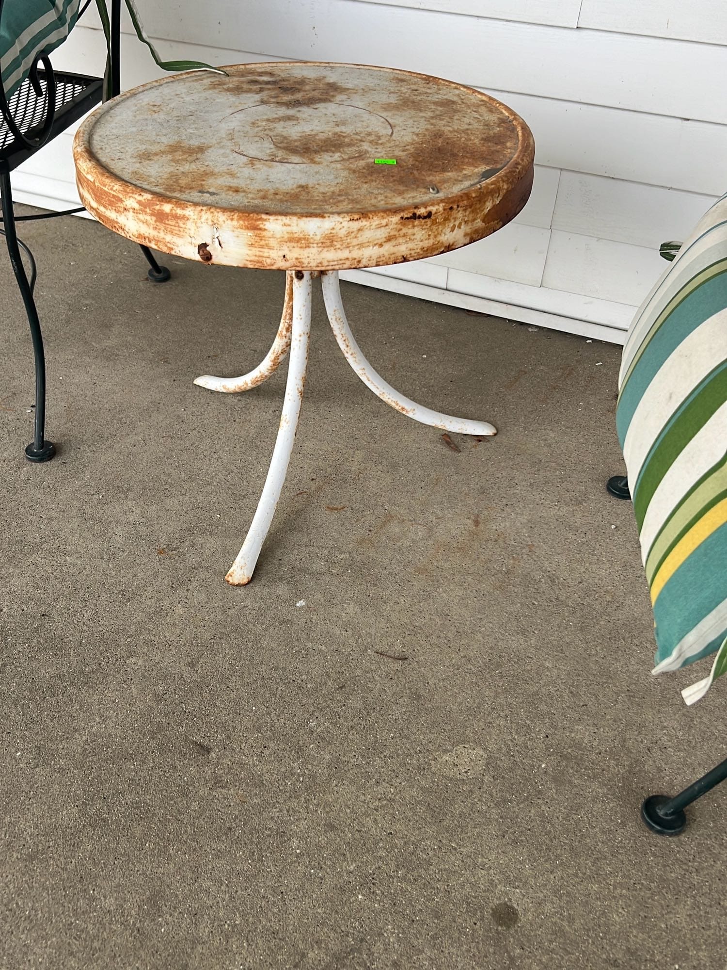 1151 2 Metal Patio chairs with cushions & patio table 20.5”x18.5”