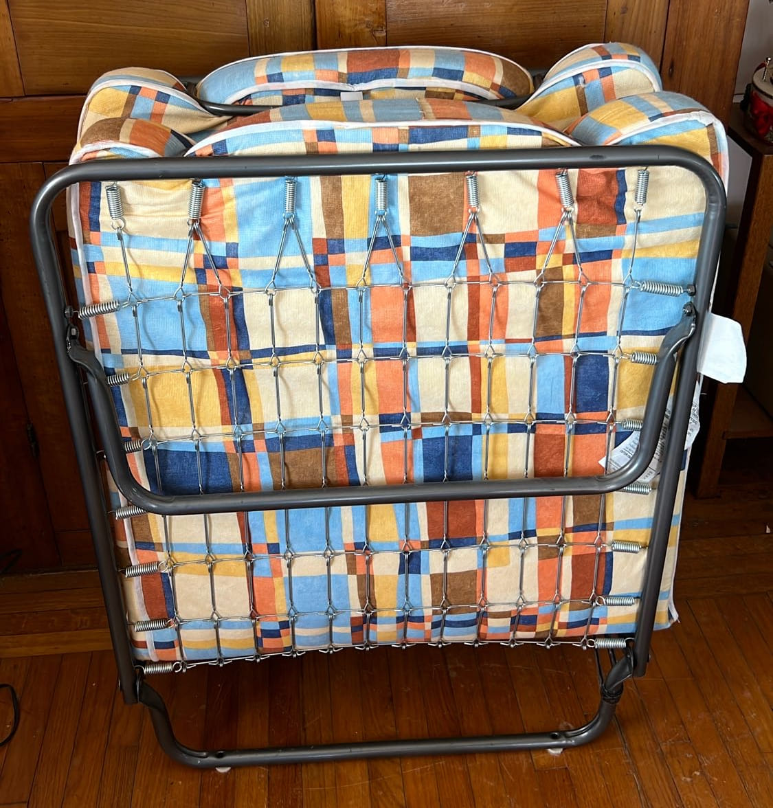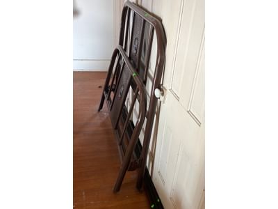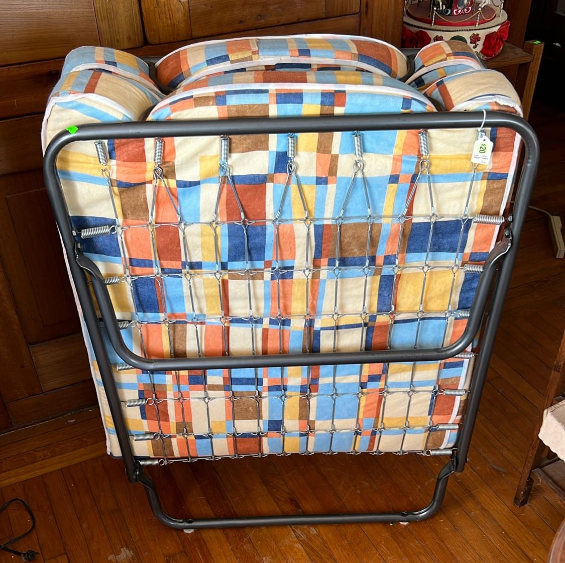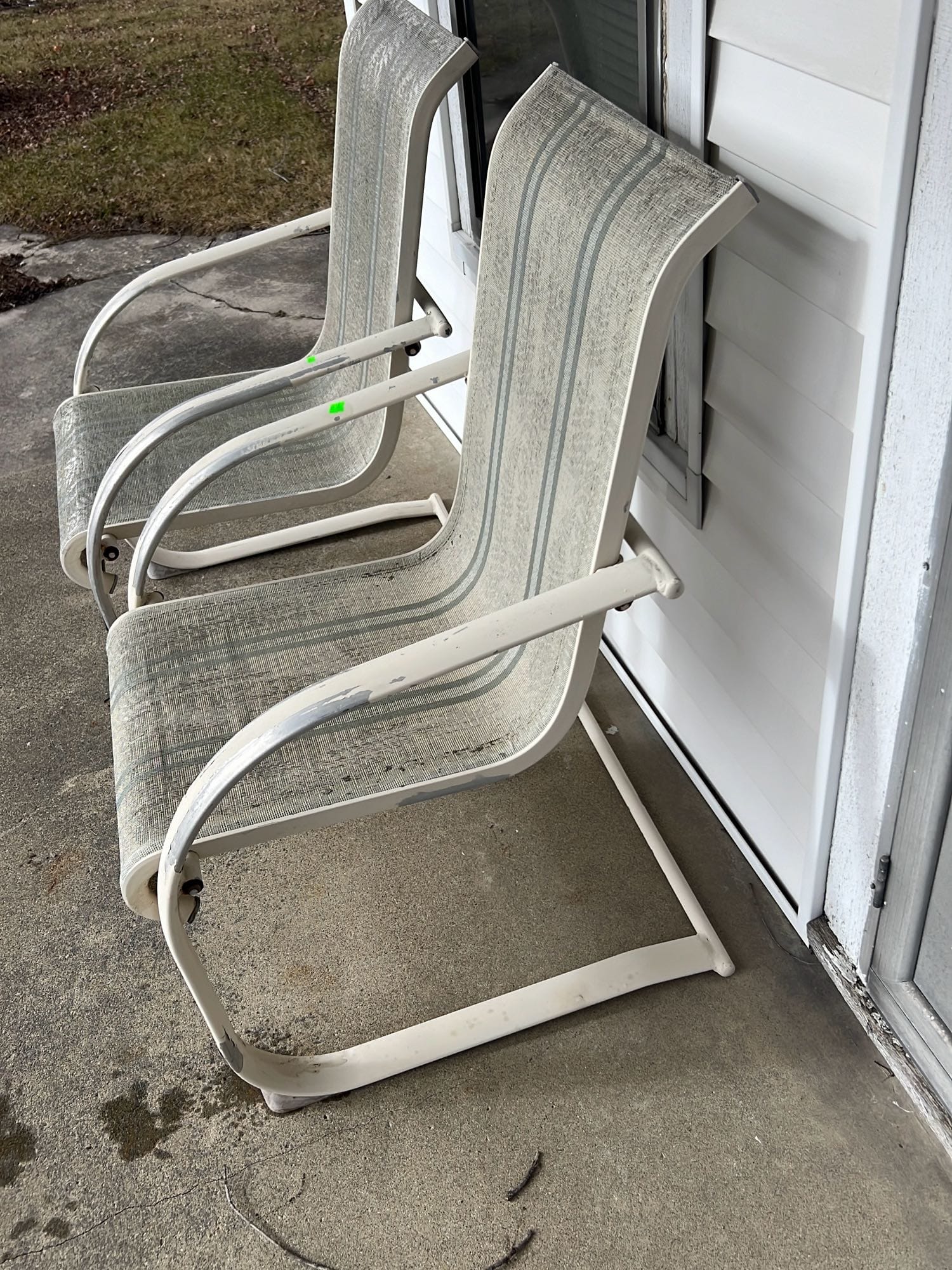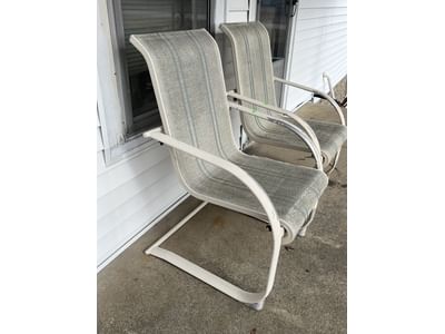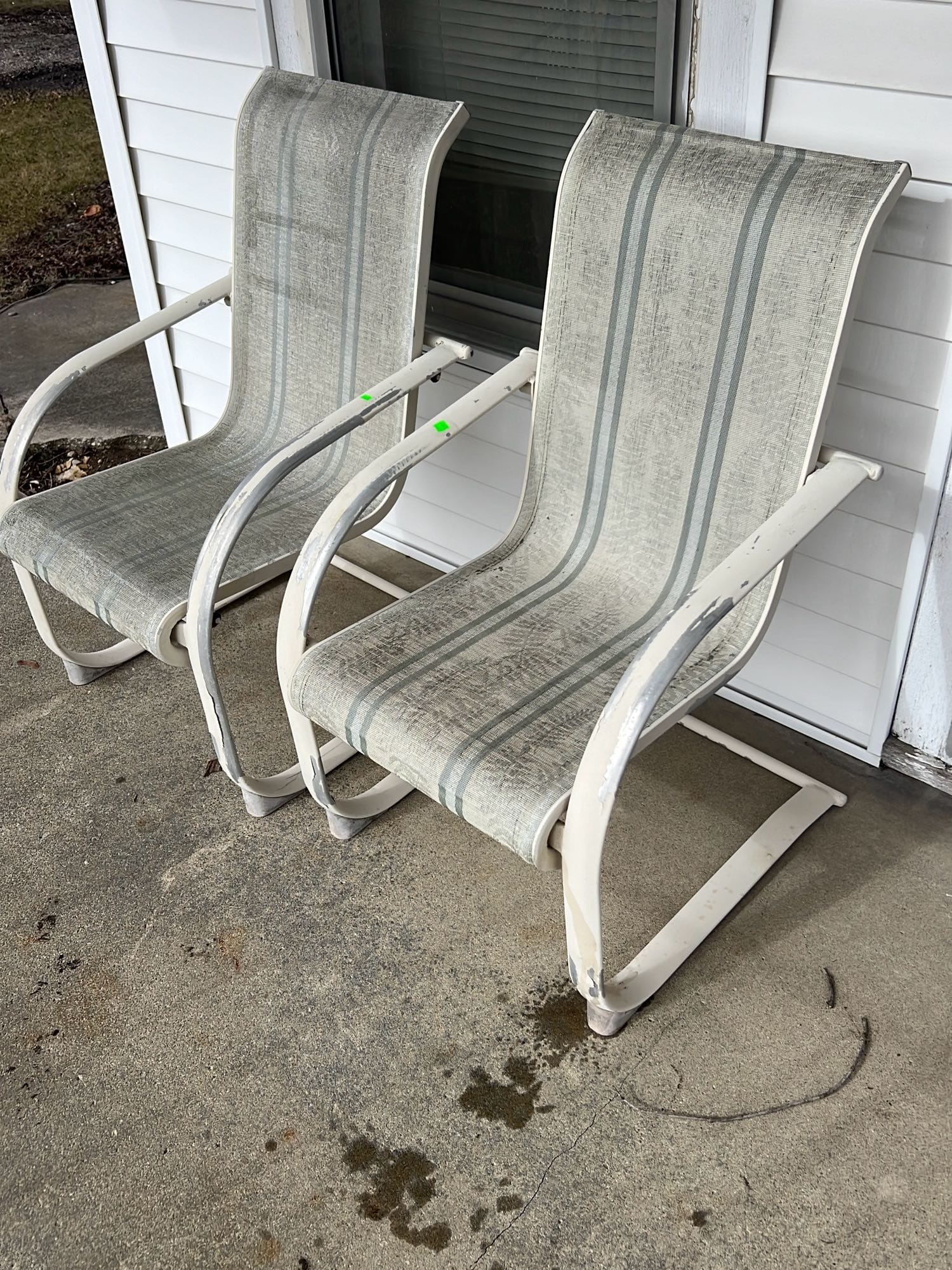 1151 2 Metal Patio chairs with cushions & patio table 20.5”x18.5”
