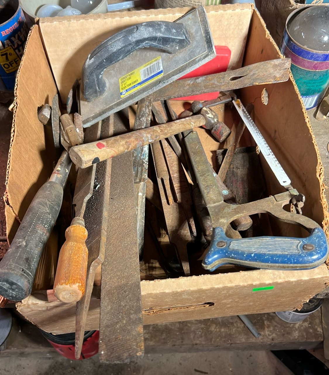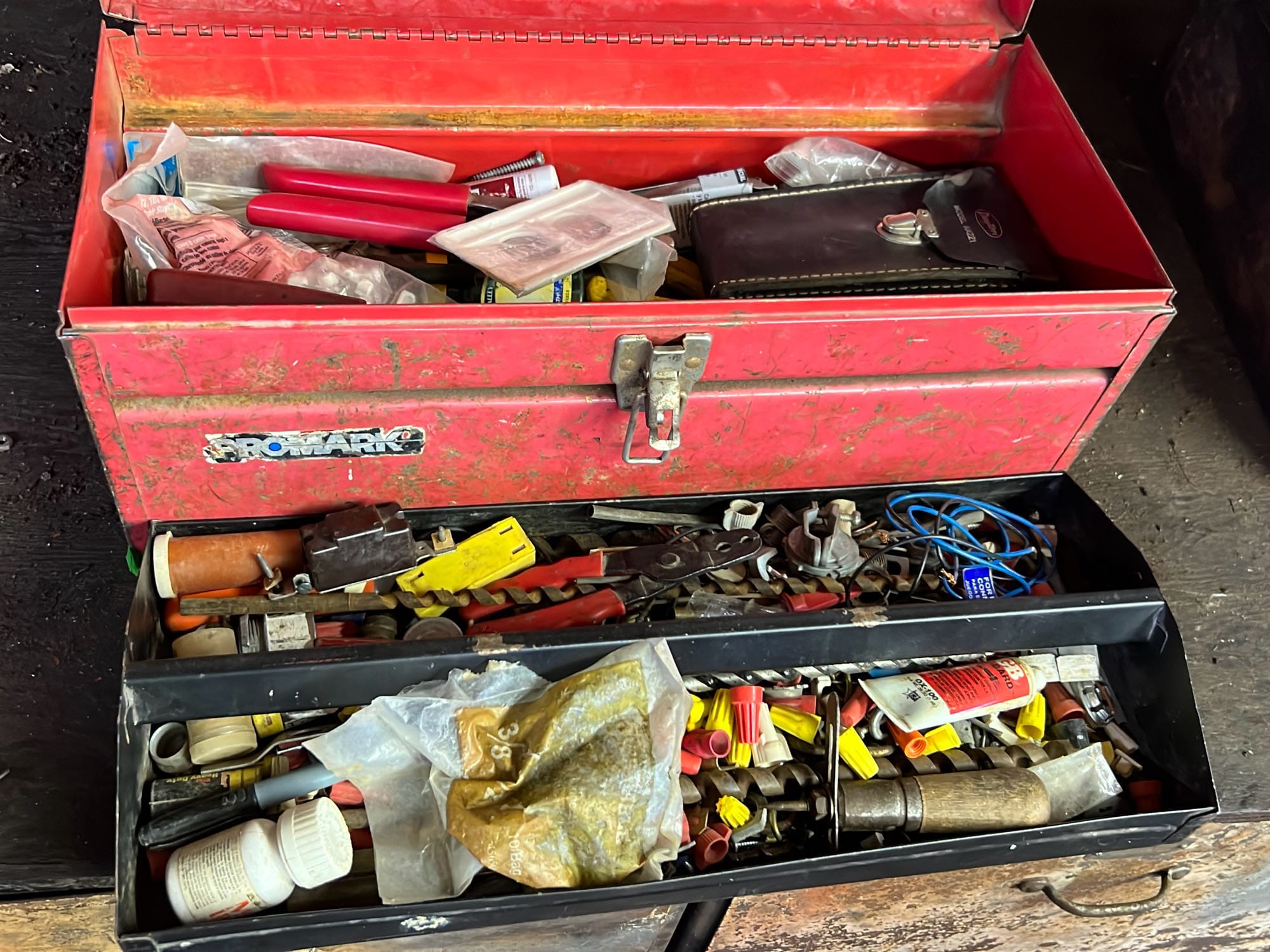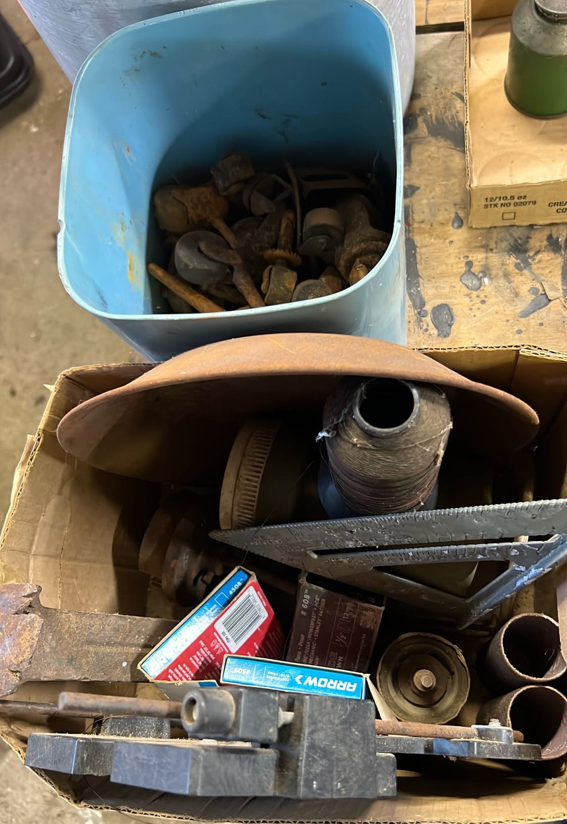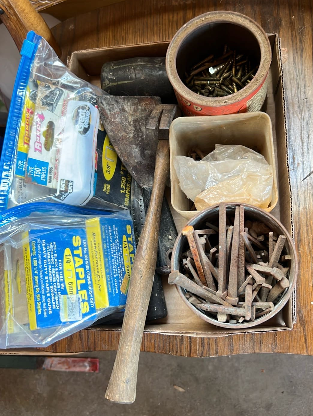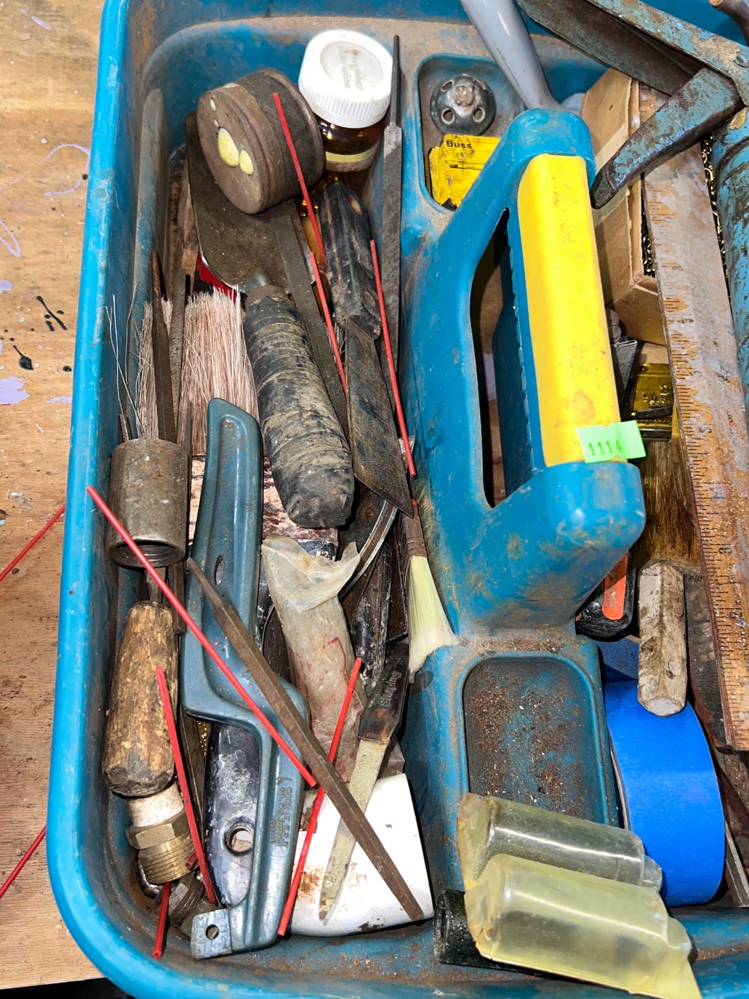1114 Horseshoe Nail assortment • Chain • Files • Caulk Gun • Tote 17.5” • misc