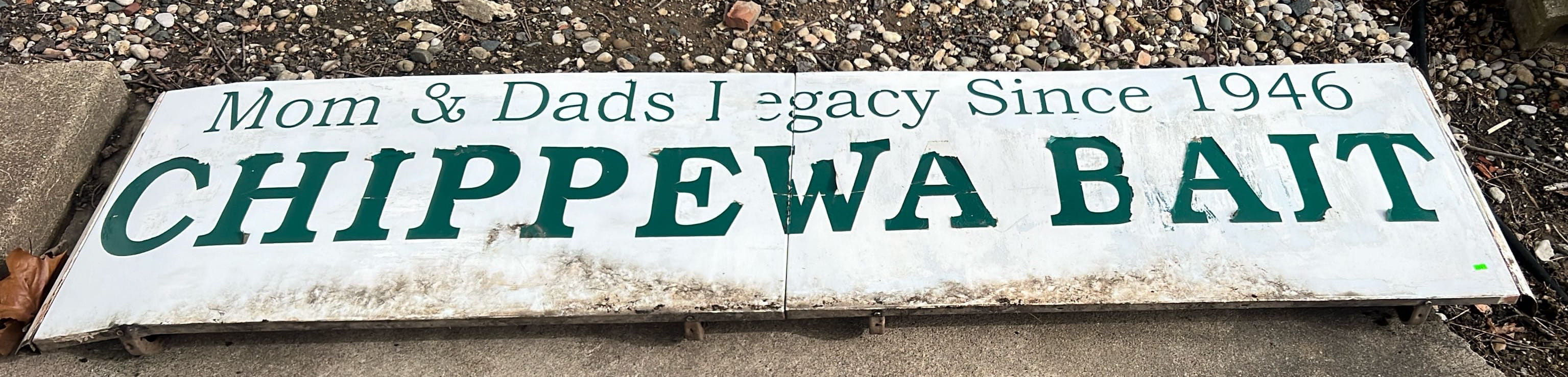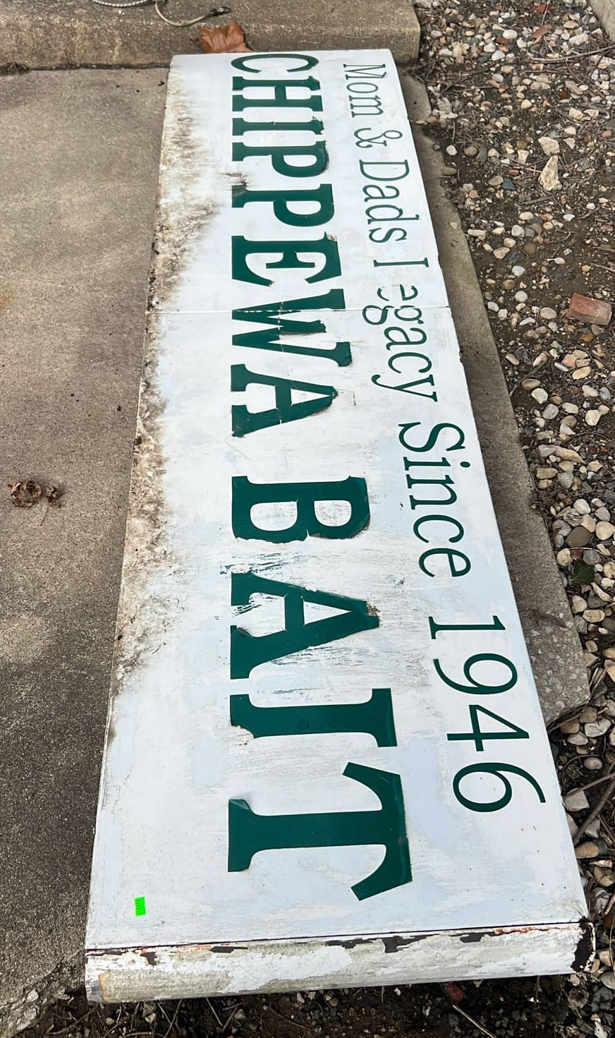 1153 Metal Sign with stick on letterring "Mom & Dads Legacy since 1946: Chippewa Bait" 24”x98”