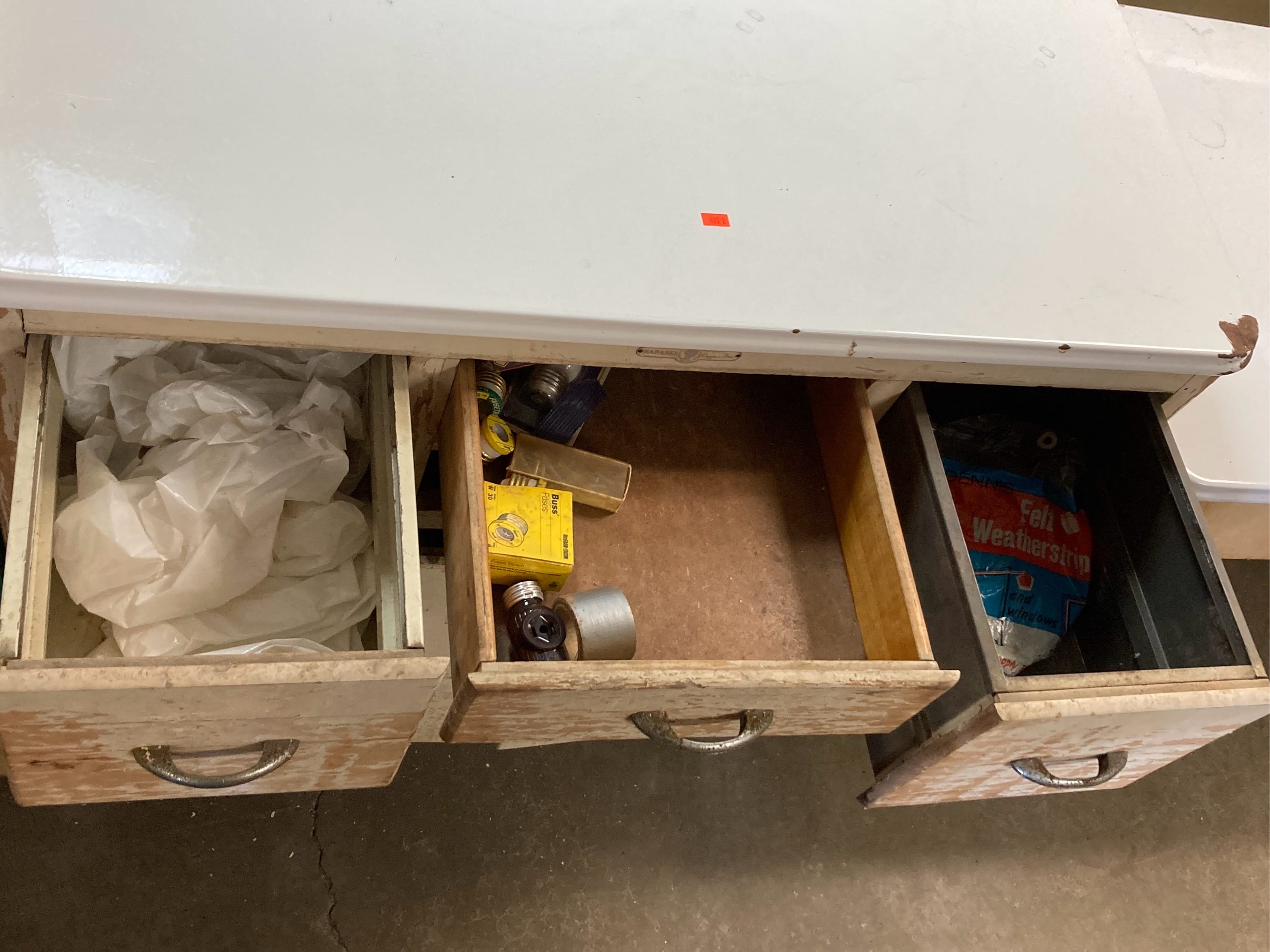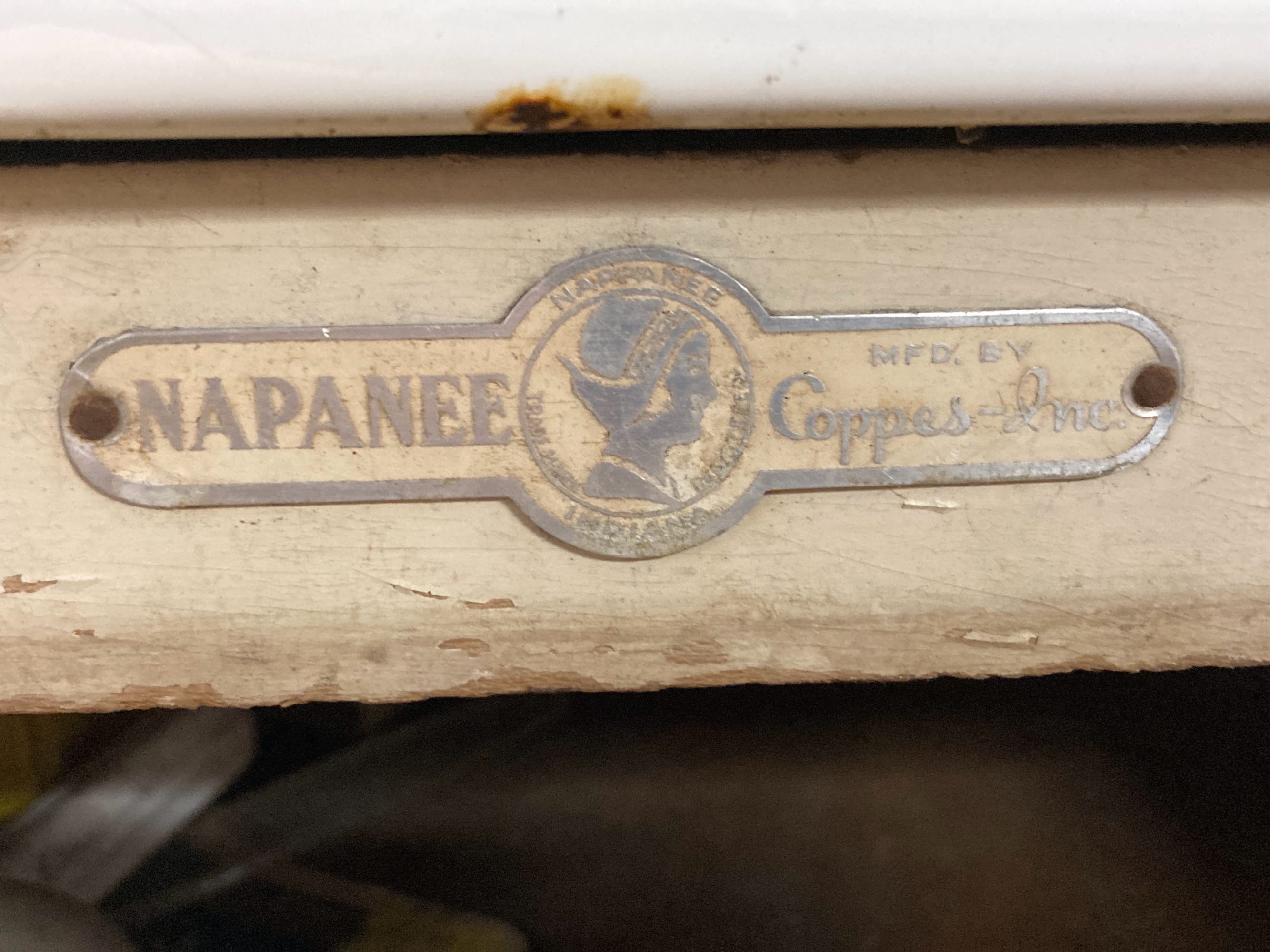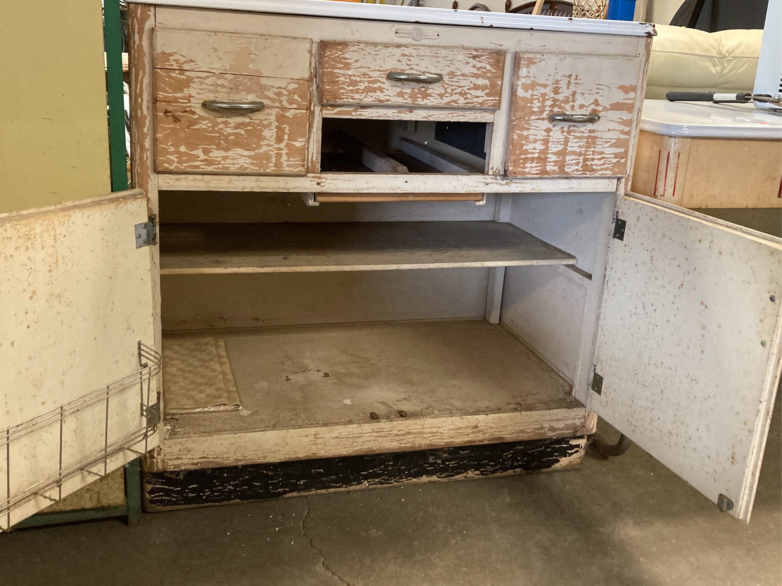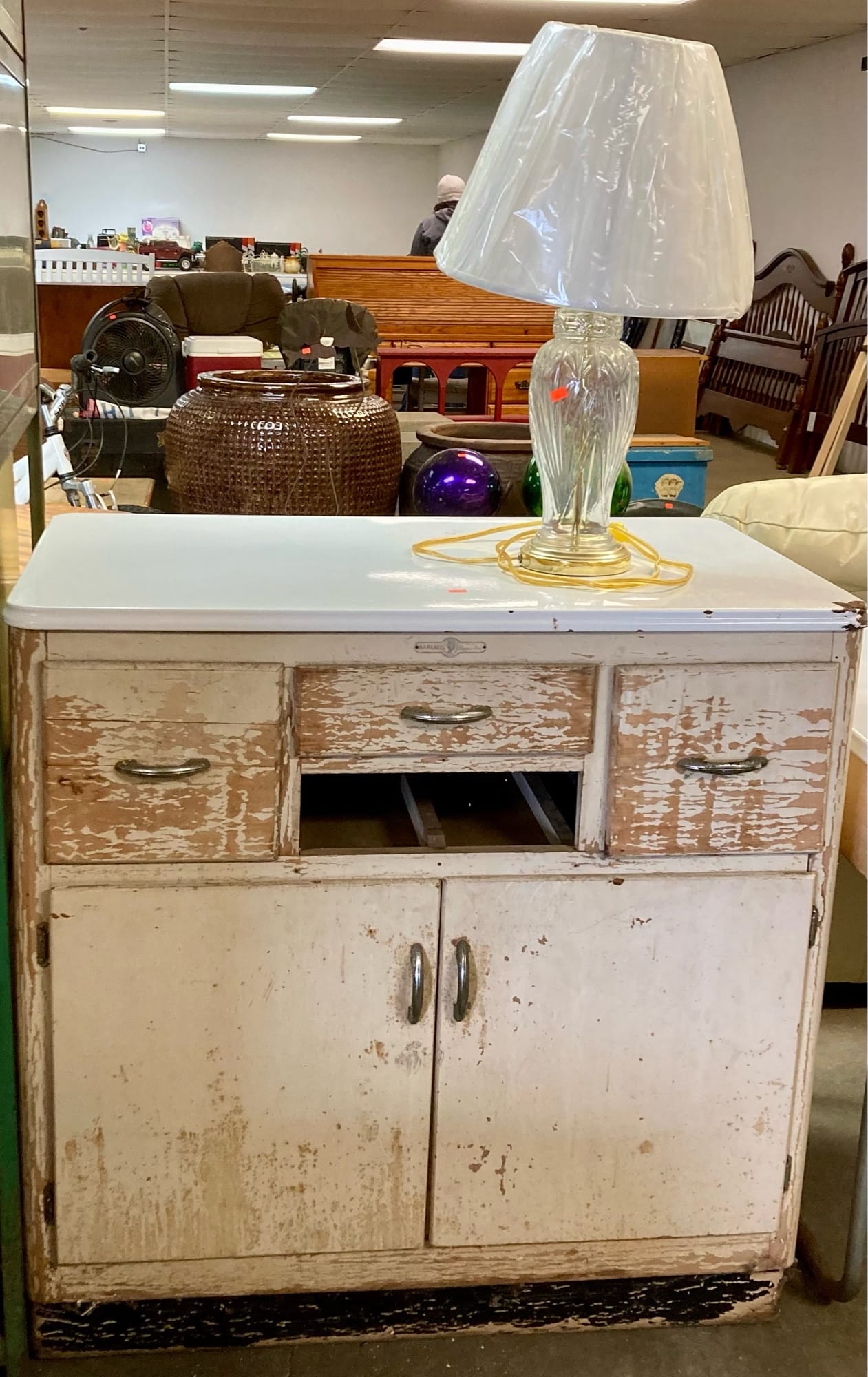 603 Nappanee Coppes Inc. Kitchen Cabinet with metal top-missing drawer-36”Wx22”Dx3’H & Lamp 24”T