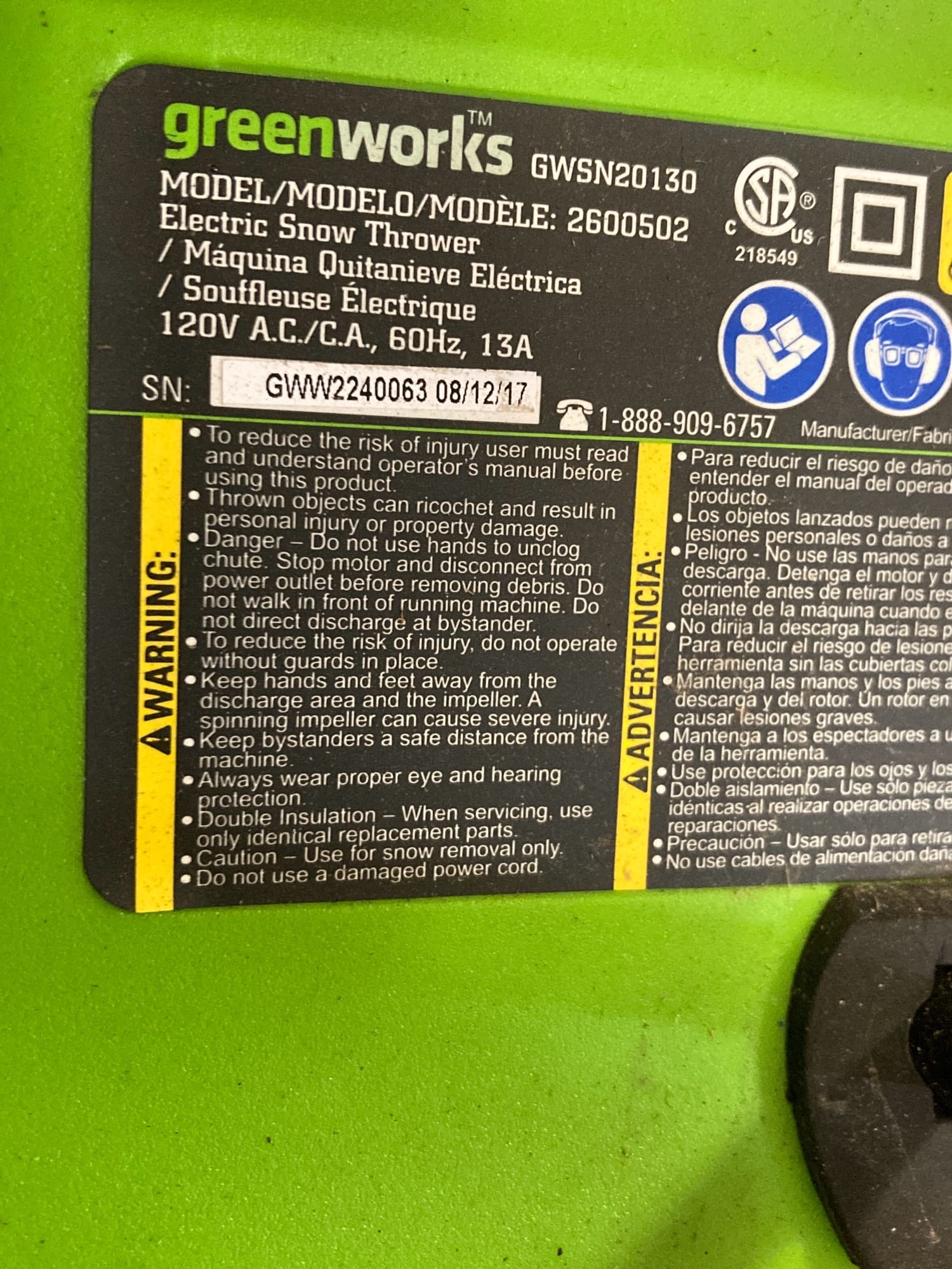505 Greenworks electric snow thrower-120volt 13 Amp