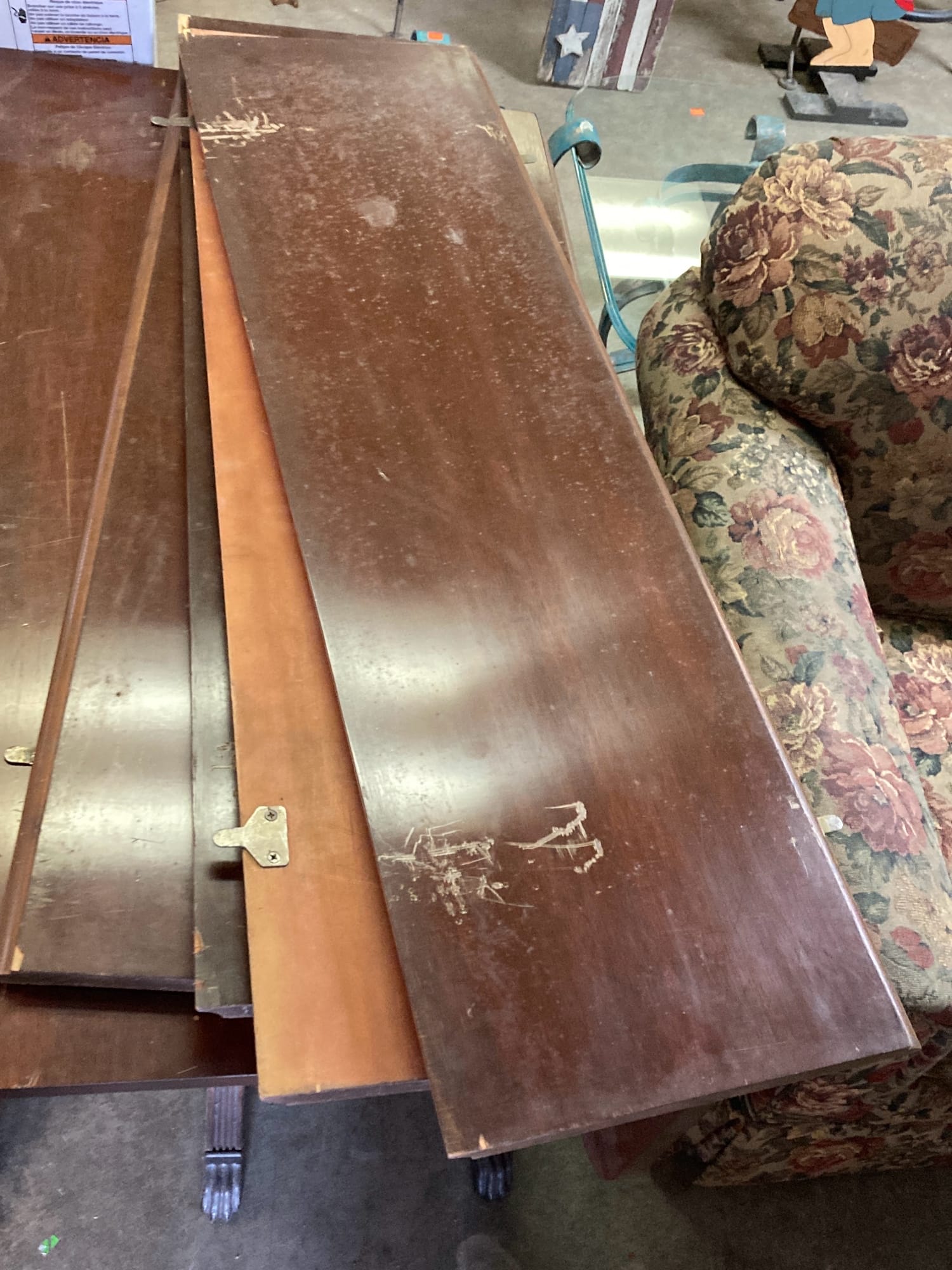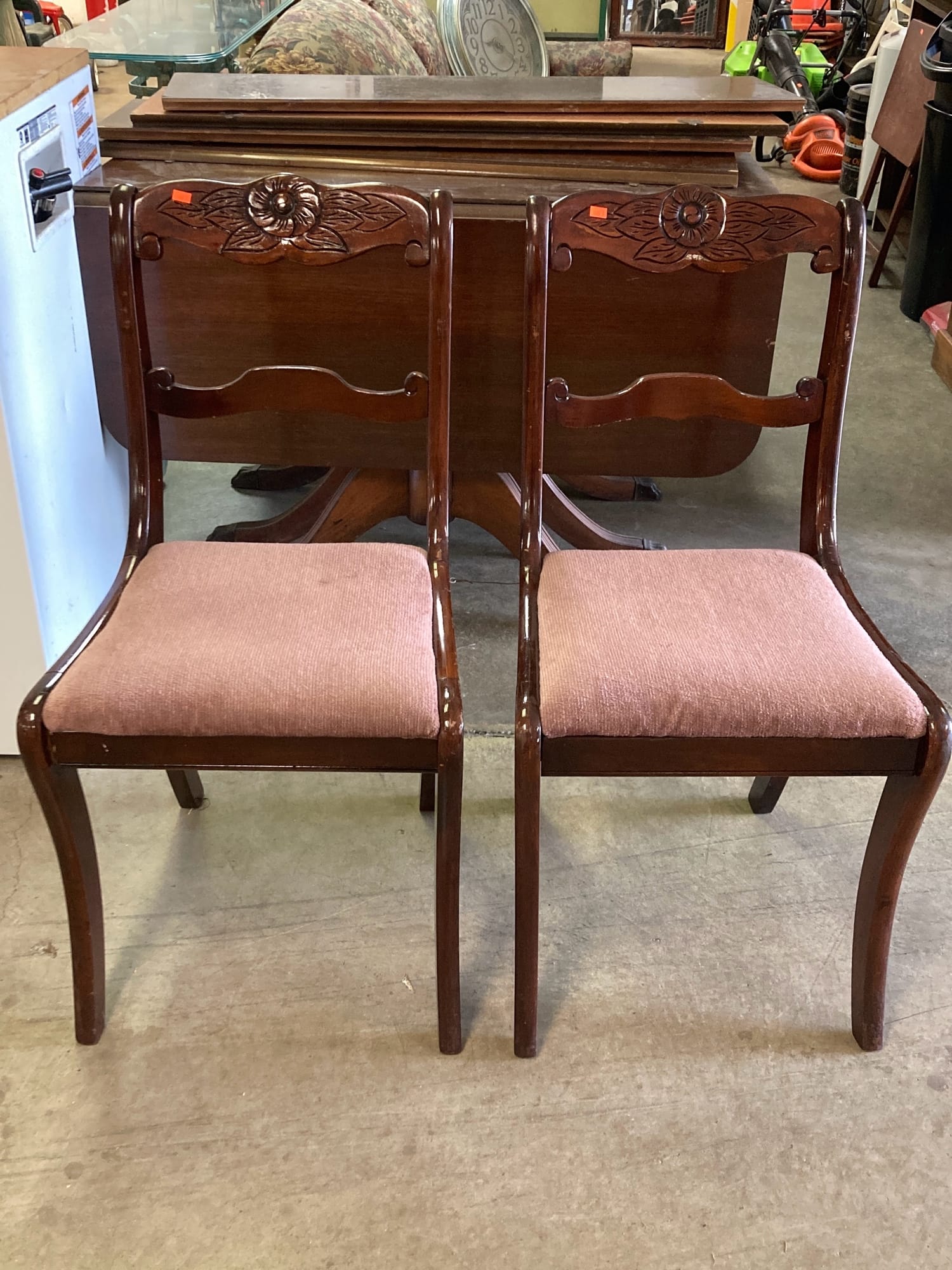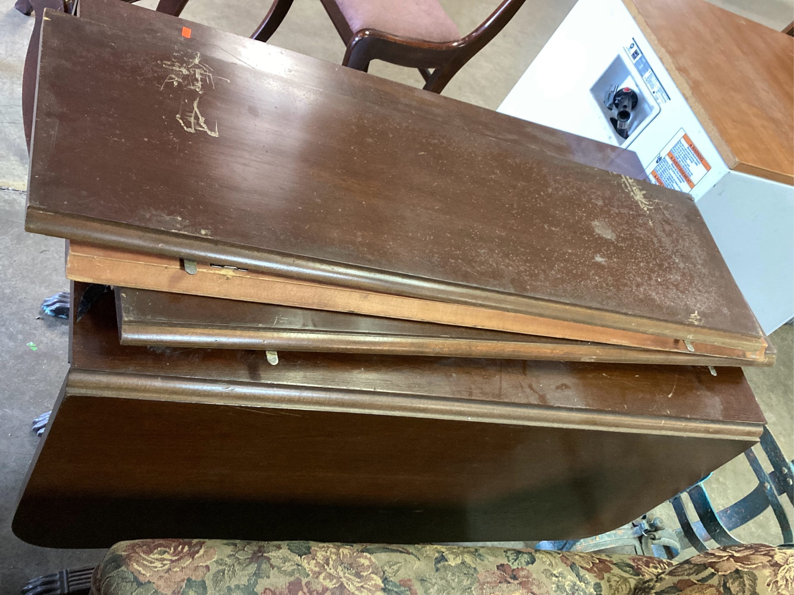 600 Drop Leaf Table 42”Wx58”W with four leaves, each is 42”x12” & 2 Chairs 17”x17” seat -Table & leaves have scuffs and scratches on wood