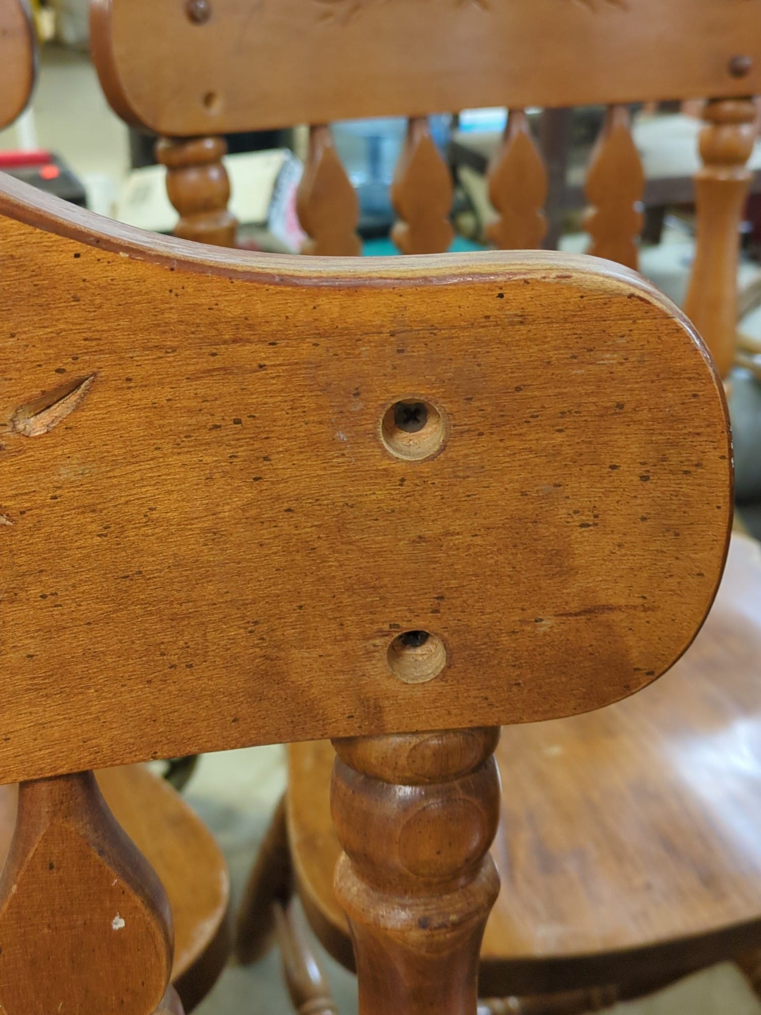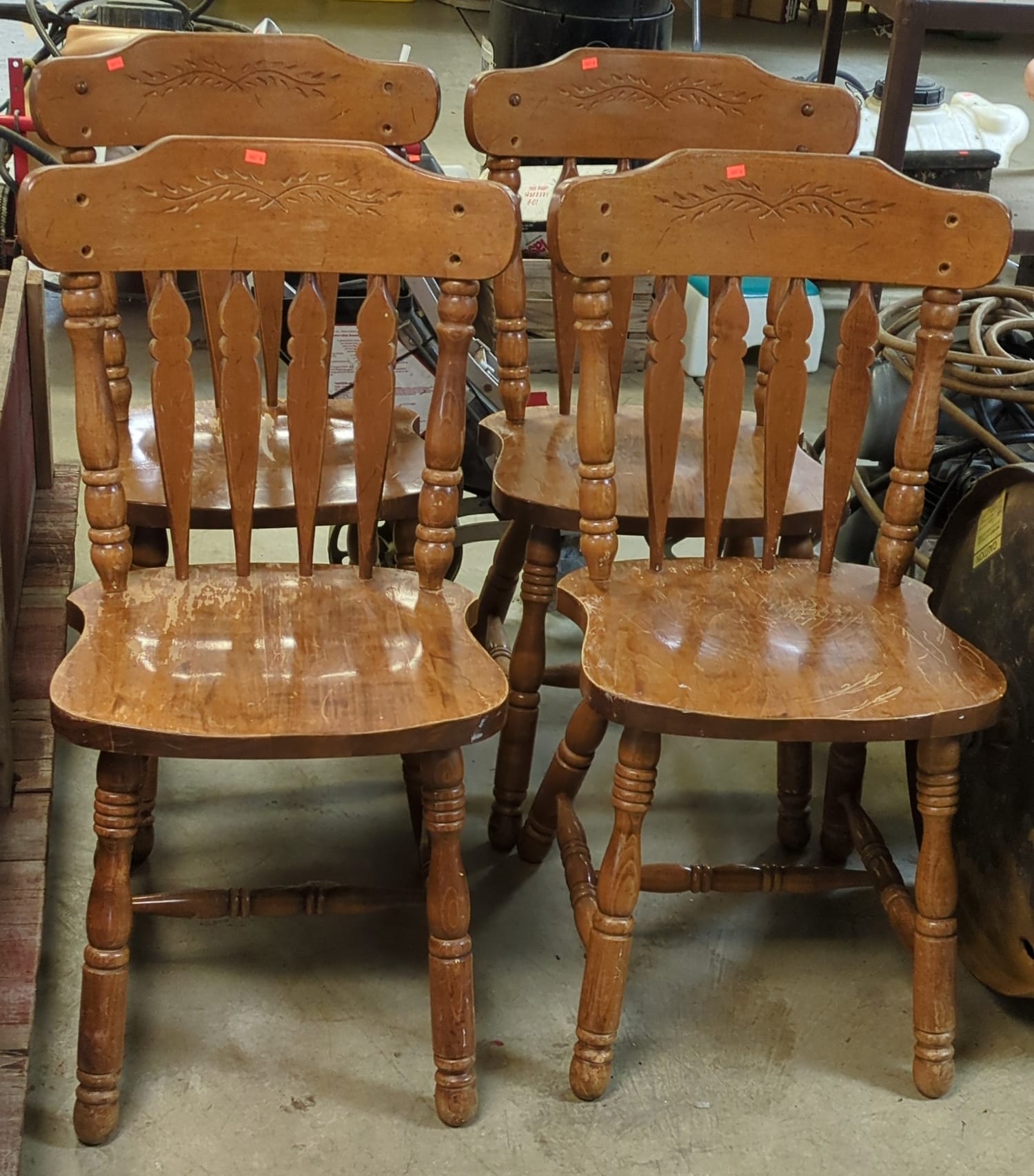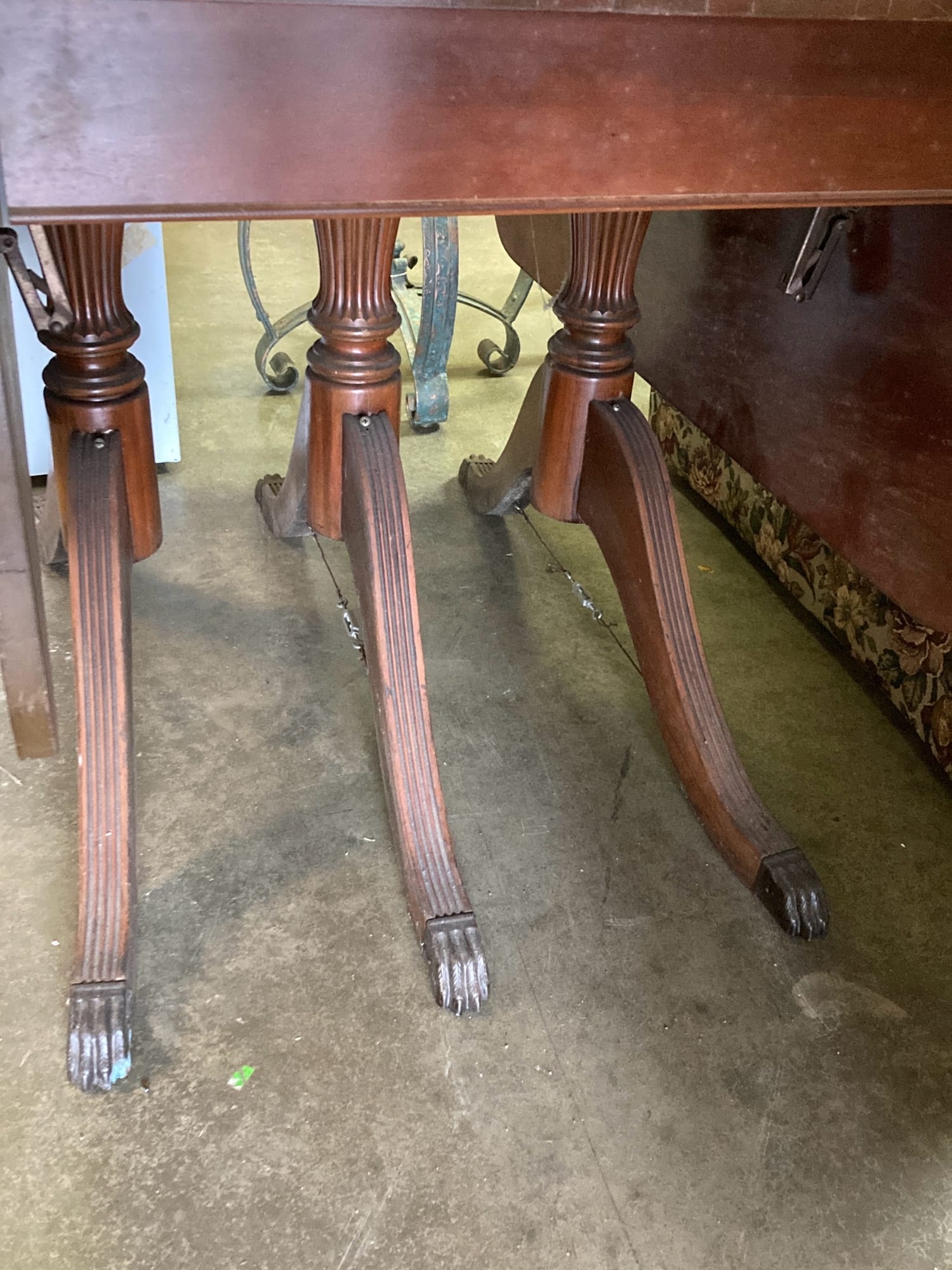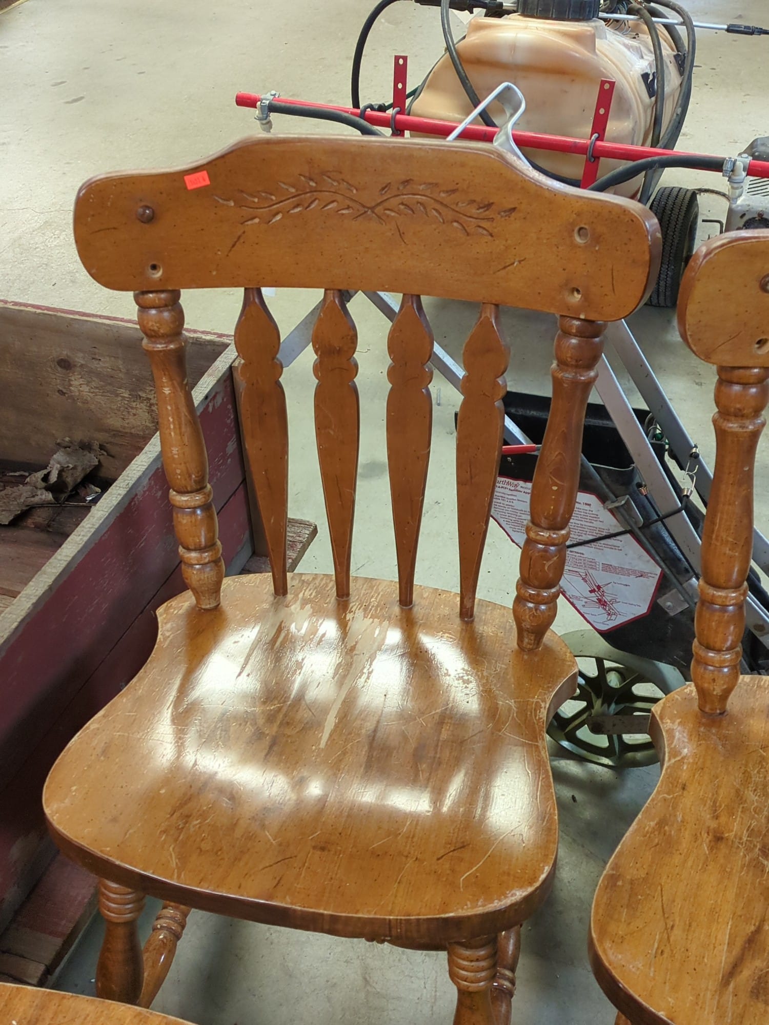 600 Drop Leaf Table 42”Wx58”W with four leaves, each is 42”x12” & 2 Chairs 17”x17” seat -Table & leaves have scuffs and scratches on wood