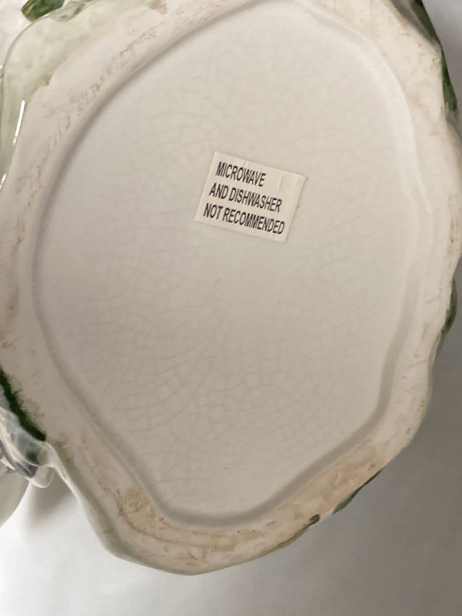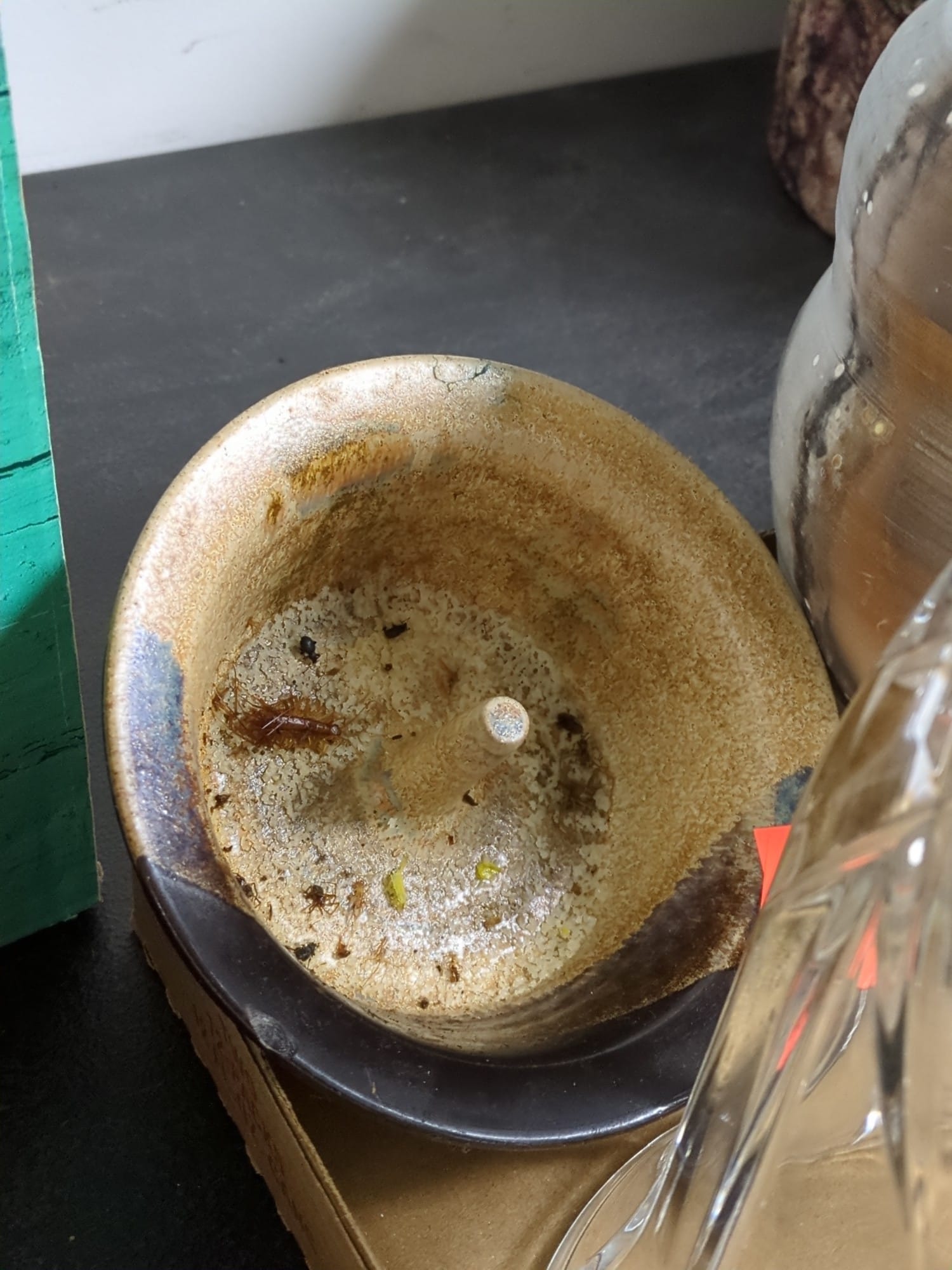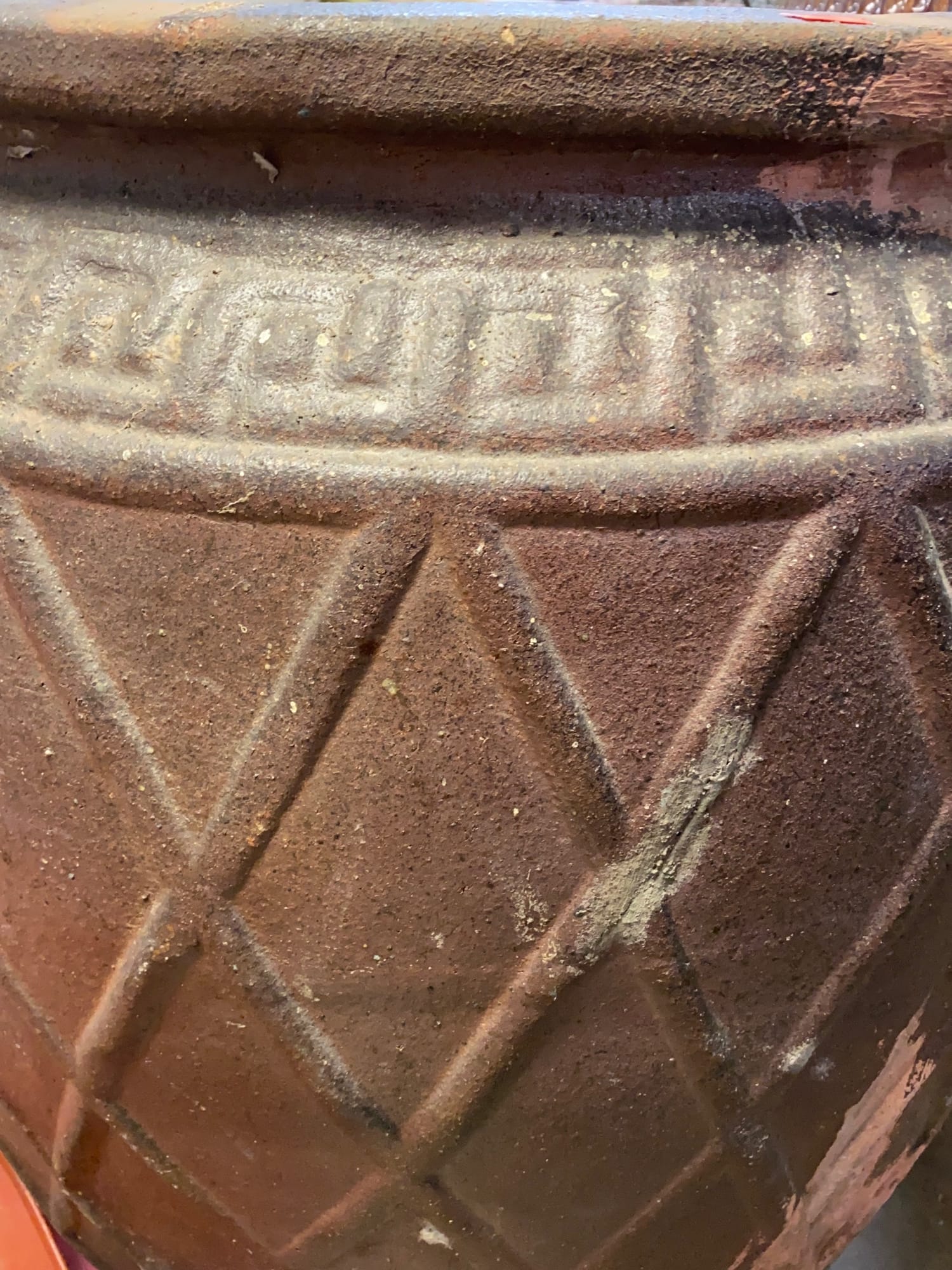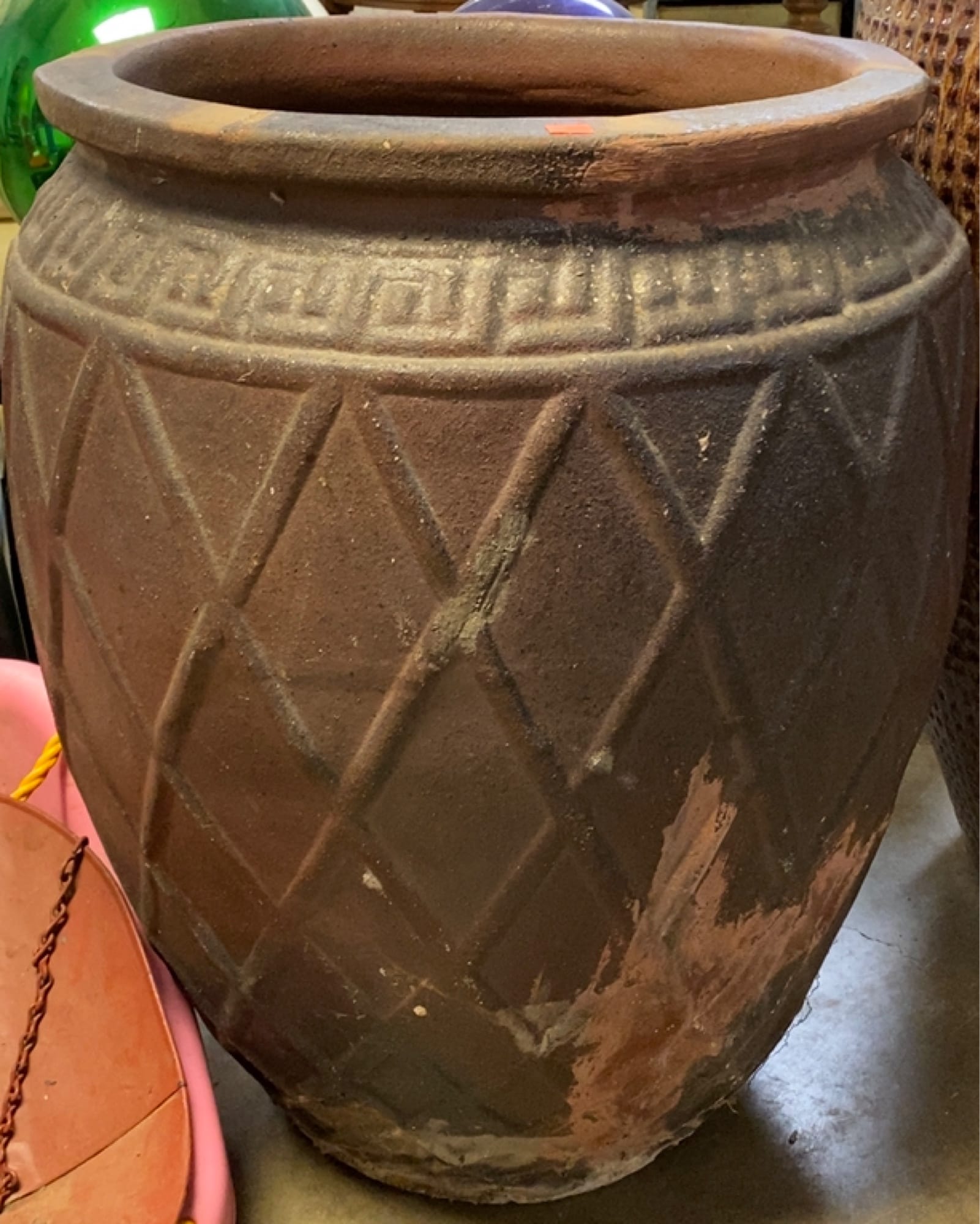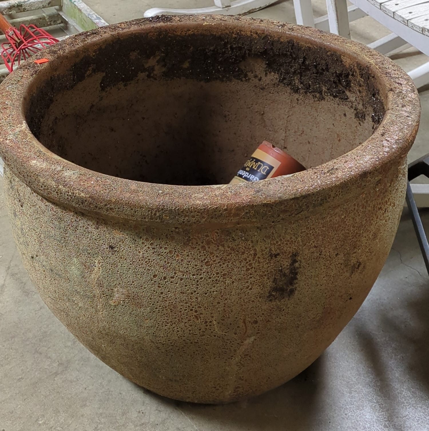 2329 Art Pottery Jardiniere, Drip Glaze Majolica Planter - has chip & crazing - 7" tallx9" Width